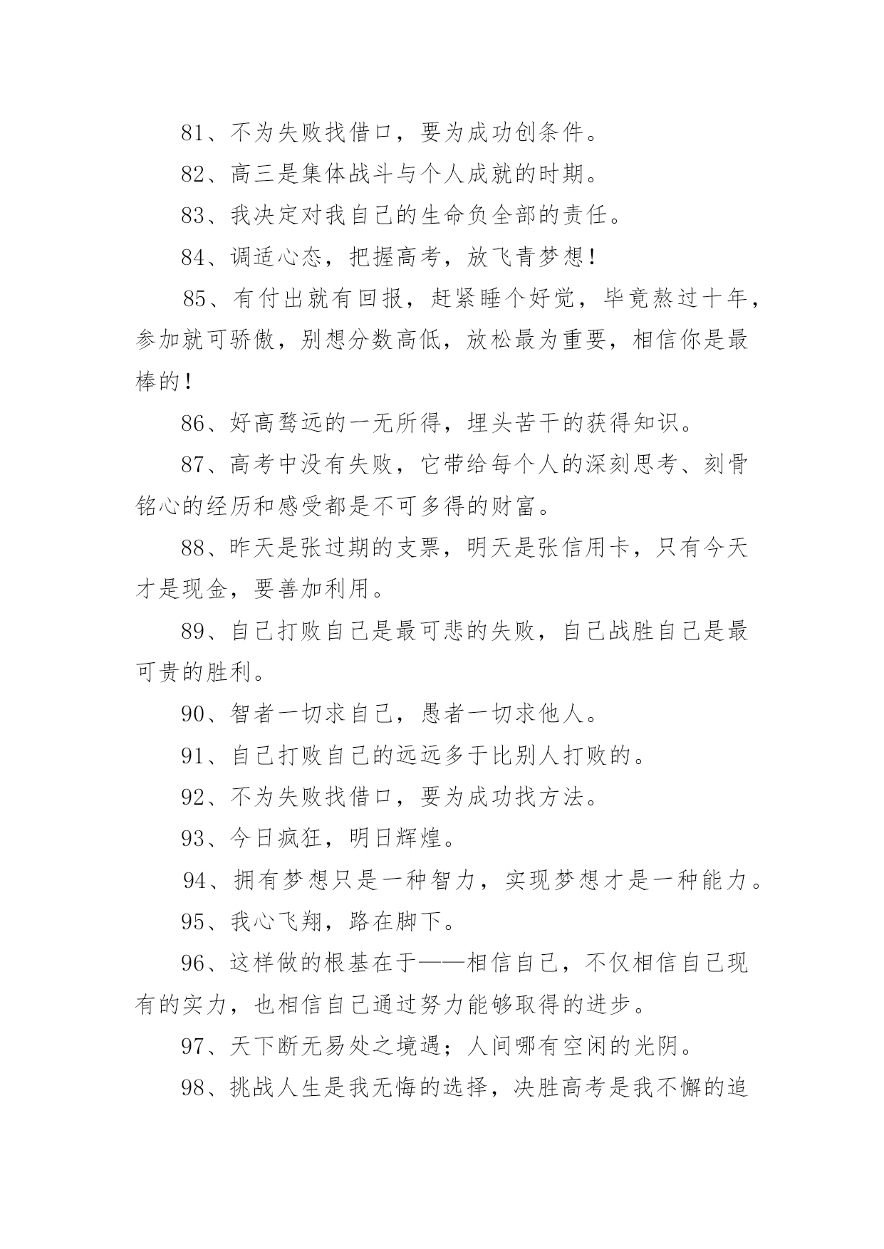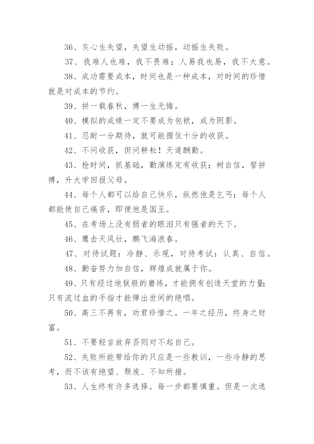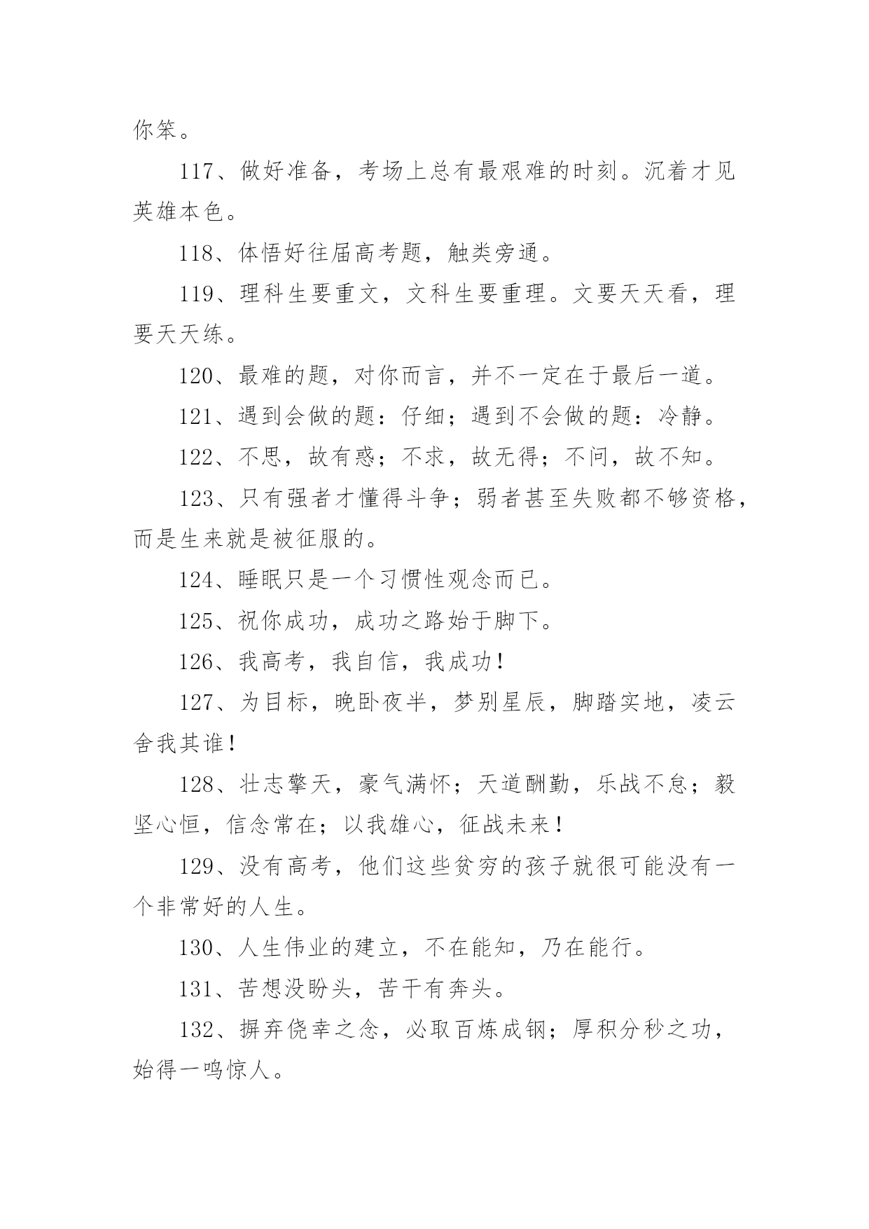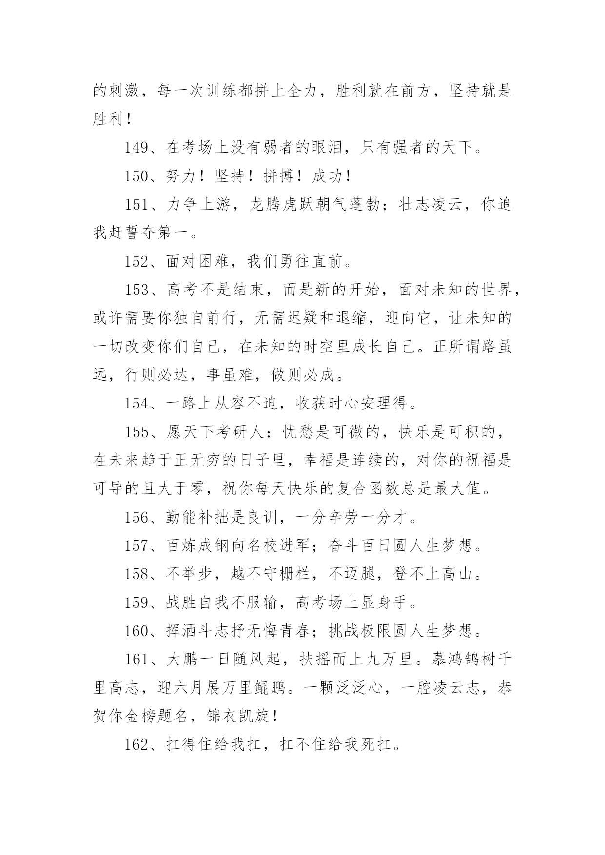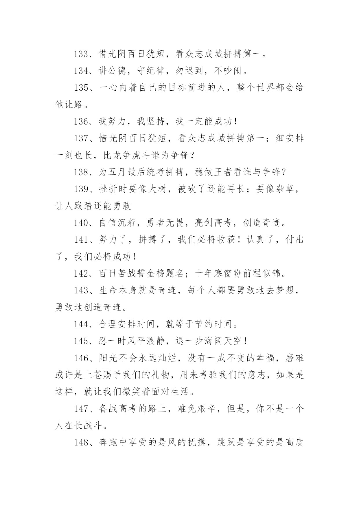 高考备考励志金句2023年高考备考励志金句200句在学习、工作、生活中,大家都收藏过令自己印象深刻的句子吧,从表达的角度说,句子是最基本的表述单位。句子的类型多样,你所见过的句子是什么样的呢?以下是小编为大家收集的2023年高考备考励志金句,仅供参考,希望能够帮助到大家。1、曾经的苦,现在的痛,都是将来的笑颜。2、进更理想大学,铸更辉煌人生。3、十年寒窗磨一剑,是非成败在今朝。4、聚精会神搞学习,一心一意迎高考。5、人之所以能,是相信能。6、为了将来不后悔,现在必须努力努力再努力。再苦再累也值得。7、立足基础,脚踏实地搏击高考。8、争分夺秒巧复习,勤学苦练创佳绩。9、更快更高更强。就是金牌。10、拼搏每一天,充实每一天,快乐每一天。11、对于世界,我微不足道,但对于我自己,我就是全部。12、精神成人,知识成才,态度成全。13、学习与坐禅相似,须有一颗恒心。14、辛苦一年,收益一生。15、从绝望中寻找希望,人生终将辉煌。16、吃苦受累,视死如归。17、微笑备考,成功在望。18、意志能使生命继续,奋斗能使人生辉煌。19、天下大事,必作于细;天下难事,必作于易。20、欲望以提升热忱,毅力以磨平高山。21、高考是汇百万人参加的一次练习。22、人生没有彩排,每一天都是现场直播。23、人生能有几回搏,今日不搏何时搏。24、真正的强者,不是不流泪的人,而是含泪奔跑的人。25、平凡的脚步也可以走完伟大的行程。26、一个能从别人的观念来看事情,能了解别人心灵活动的人,永远不必为自己的前途担心。27、成功的人是跟别人学习经验,失败的人只跟自己学习经验。28、一生之苦今日吃,三年之乐来日享。29、静以求学,净以求美;敬以求谐,竞以求进。30、今天多一份拼搏、明天多几份欢笑。31、天助自助者,你要你就能。32、不经三思不求教,不动笔墨不读书。33、总想赢者必输,不怕输者必赢。34、天行健,君子以自强不息!35、作业考试化,考试高考化,将平时考试当高考,高考考试当平时。36、灰心生失望,失望生动摇,动摇生失败。37、我难人也难,我不畏难;人易我也易,我不大意。38、成功需要成本,时间也是一种成本,对时间的珍惜就是对成本的节约。39、拼一载春秋,搏一生无悔。40、模拟的成绩一定不要成为包袱,成为阴影。41、忍耐一分期待,就可能握住十分的收获。42、不问收获,但问耕耘!天道酬勤。43、抢时间,抓基础,勤演练定有收获;树自信,誓拼搏,升大学回报父母。44、每个人都可以给自己快乐,纵然他是乞丐;每个人都能使自己痛苦,即便他是国王。45、在考场上没有弱者的眼泪只有强者的天下。46、鹰击天风壮,鹏飞海浪春。47、对待试题:冷静、乐观,对待考试:认真、自信。48、勤奋努力加自信,辉煌成就属于你。49、只有经过地狱般的磨练,才能拥有创造天堂的力量;只有流过血的手指才能弹出世间的绝唱。50、高三不再有,劝君珍惜之。一年之经历,终身之财富。51、不要轻言放弃否则对不起自己。52、失败所能带给你的只应是一些教训,一些冷静的思考,而不该有绝望、颓废、不知所措。53、人生终有许多选择。每一步都要慎重。但是一次选择不能决定一切。不要犹豫,作出选择就不要后悔。只要我们能不屈不挠地奋斗,胜利就在前方。54、我们为理想而奋进的过程,其意义远大于未知的结果。55、试试就能行,争争就能赢。56、保持平常心,营造好环境,扬起常笑脸,轻松迎高考。57、花开花落腊梅傲雪盼新春,春去春来长风破浪迎高考。58、高考是比知识、比能力、比心理、比信心、比体力的一场综合考试。59、良辰美景惜时如金敢与金鸡争晨晖,书山学海甘之若饴誓同峨眉共比高。60、我自信,故我成功”、“我行,我一定能行”。61、高考试卷是一把刻度不均匀的尺子:对于你自己来说,难题的分值不一定高。62、立志高远,脚踏实地;刻苦钻研,勤学苦思;稳定心态,不馁不弃;全力以赴,夺取胜利。63、百尺高梧,撑得起一轮月色;数椽矮屋,锁不住五夜书声。64、拼搏高考,今生无悔;爬过高三,追求卓越!张扬乐学乐思的个性,坚守不骄不躁的心态。65、不向前不知道路远,不学习不明白真理。66、乐观的人能重整旗鼓东山再起,悲观的人因缺乏自信,往往一败涂地。67、学习从来无捷径,循序渐进登高峰。68、不求与人相比,但求超越自己,要哭就哭出激动的泪水,要笑就笑出成长的性格!69、只有流过血的手指,才能弹出世间的绝唱。70、心思澄澈,安定有力,摒除诱惑,才可成就大事业。71、哪怕是最没有希望的事情,只要有一个勇敢者去坚持做,到最后就会拥有希望。72、孩子们,别紧张,高考并不是唯一的路,也不是全为了考试,而是让你的青春更有意义。73、坚持数年,苦读多年,只为今朝,保平常心,扬起笑脸,迎接挑战,决战高考,改变命运,创造佳绩,夺取胜利!祝你高考成功!74、眼泪的存在,是为