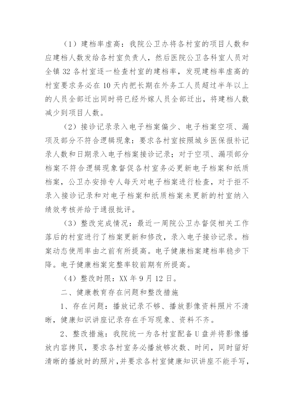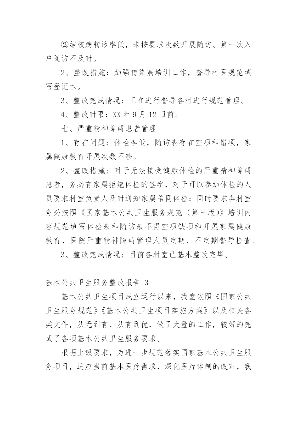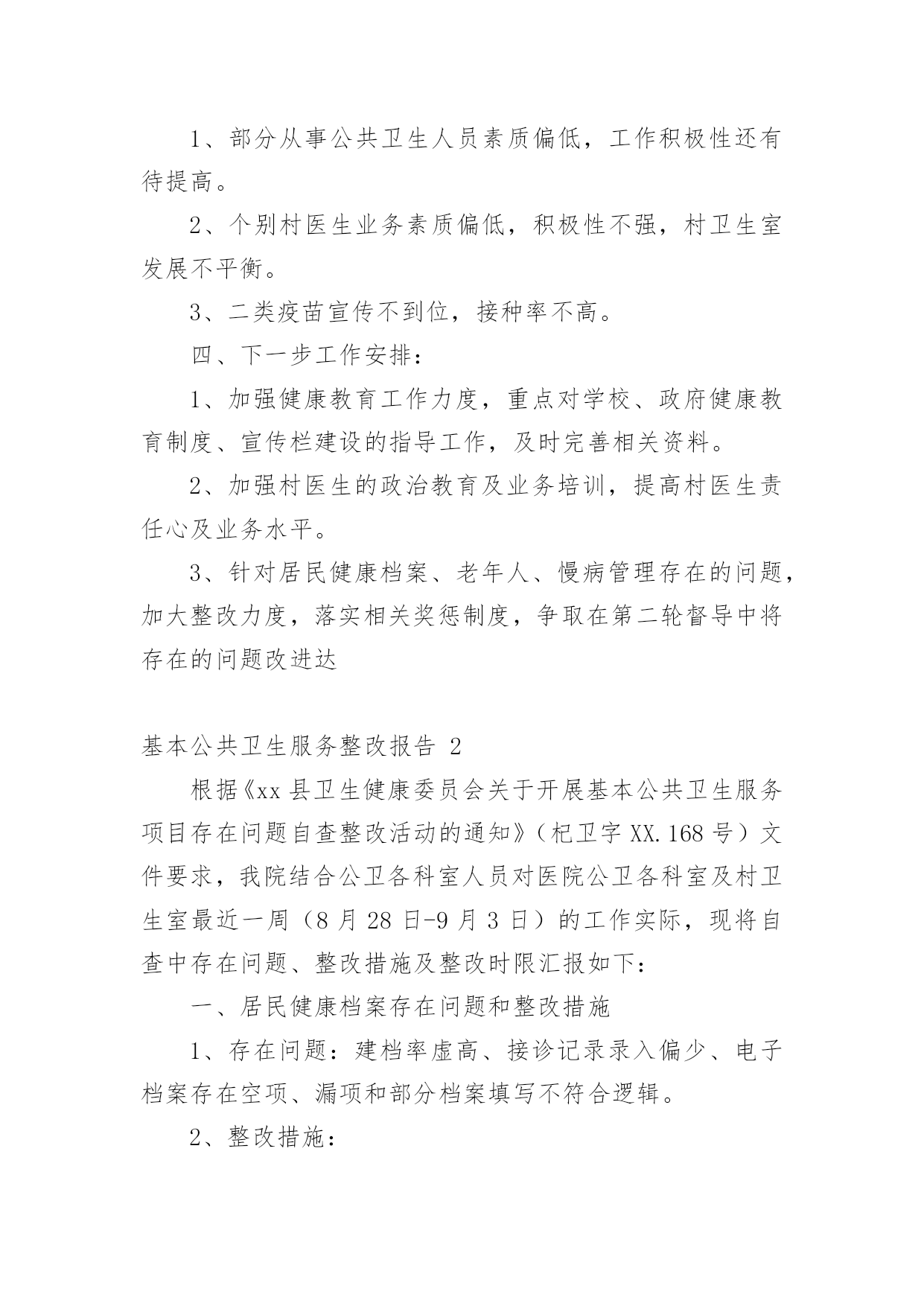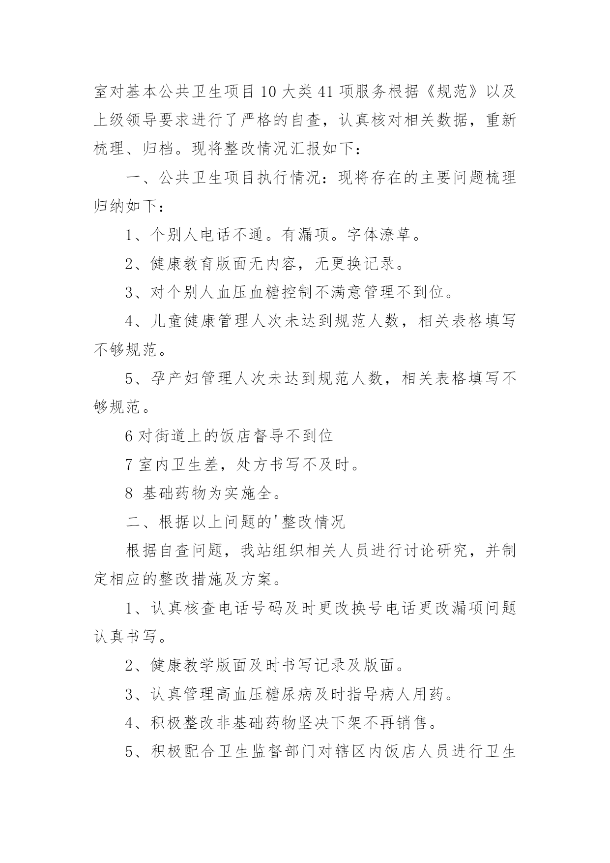 基本公共卫生服务整改报告(优)基本公共卫生服务整改报告15篇在现在社会,接触并使用报告的人越来越多,报告根据用途的不同也有着不同的类型。一起来参考报告是怎么写的吧,下面是小编精心整理的基本公共卫生服务整改报告,供大家参考借鉴,希望可以帮助到有需要的朋友。基本公共卫生服务整改报告1根据县公共卫生专业机构对我单位基本公共卫生服务工作督导中存在的问题,卫生院高度重视及时召开公共卫生科、村卫生站工作会议,研究整改方案和下一步工作安排,现将整改情况汇报如下:一、制定整改方案:1、公共卫生科负责涂家辖区全面基本公共卫生服务指导、管理工作。各村卫生站配合公共卫生科开展好服务工作,确保指标任务的完成。2、对县公共卫生专业机构指出的问题限期整改落实到位,公共卫生科负责落实对辖区存在问题督促整改落实到位。3、村卫生站必须按照公共卫生科安排的公共卫生工作落实到位,确保村级公共卫生目标任务的完成。4、加大指导考核力度,定期汇报工作进展情况到公共卫生科。二、整改后的阶段性成效:1、加强了组织领导,制定相关文件及考核制度,完善组织管理。2、加大了居民健康档案电子录入工作,规范内页资料的填写齐全,确保档案资料和电子档案资料的合格率,确保了指标任务的完成。3、制定了详细完整的健康教育工作计划和制度,认真开展了对政府和学校健康教育工作指导,按时每月开展健康教育知识讲座并积极指导村卫生站开展健康教育宣传活动。4、按时分村每月开展好预防接种工作,未出现预防接种事故和暴发流行,规范使用信息化建设并完成了每月信息化录入工作,提高了疫苗接种率,做到了表、卡、证、网四一致。5、建立健全各项传染病管理各项工作制度,及时准确上报传染病报告卡,严格了自查工作,加大了艾滋病随访、管理工作,规范了结核病奖惩制度的落实,确保了目标转诊任务的'完成。6、规范了妇幼报表的填写和资料分类管理,建立了例会制度,做好了特殊检测登记工作,加大叶酸发放,规范了出生医学证明的调查、管理、发放等工作。7、各村将主要存在的问题进行集中学习及时限期整改,整改后各项工作取得有效改进,老年人、慢病管理及相关资料,电子档案完成较好,但居民健康档案改进稍差,一些相关信息及数据仍然缺乏真实性完整性。三、存在的问题:1、部分从事公共卫生人员素质偏低,工作积极性还有待提高。2、个别村医生业务素质偏低,积极性不强,村卫生室发展不平衡。3、二类疫苗宣传不到位,接种率不高。四、下一步工作安排:1、加强健康教育工作力度,重点对学校、政府健康教育制度、宣传栏建设的指导工作,及时完善相关资料。2、加强村医生的政治教育及业务培训,提高村医生责任心及业务水平。3、针对居民健康档案、老年人、慢病管理存在的问题,加大整改力度,落实相关奖惩制度,争取在第二轮督导中将存在的问题改进达基本公共卫生服务整改报告2根据《xx县卫生健康委员会关于开展基本公共卫生服务项目存在问题自查整改活动的通知》(杞卫字XX.168号)文件要求,我院结合公卫各科室人员对医院公卫各科室及村卫生室最近一周(8月28日-9月3日)的工作实际,现将自查中存在问题、整改措施及整改时限汇报如下:一、居民健康档案存在问题和整改措施1、存在问题:建档率虚高、接诊记录录入偏少、电子档案存在空项、漏项和部分档案填写不符合逻辑。2、整改措施:(1)建档率虚高:我院公卫办将各村室的项目人数和应建档人数发给各村室负责人,然后医院公卫各科室人员对全镇32各村室逐一检查村室的建档率,发现建档率虚高的村室要求务必在10天内把长期在外务工人员超过半年以上的人员全部迁出同时将已经外嫁人员全部迁出,将建档人数减少到项目人数。(2)接诊记录录入电子档案偏少、电子档案空项、漏项及部分不符合逻辑现象:要求各村室按照城乡医保报补记录人数和日期录入电子档案接诊记录;对于空项、漏项部分档案不符合逻辑现象督促各村室务必更新电子档案和纸质档案,公卫办安排专人每天对电子档案进行检查,对于拒不录入接诊记录和对电子档案和纸质档案未更新的村室纳入绩效考核并给于通报批评。(3)整改完成情况:最近一周院公卫办督促相关工作落后的村室进行了档案更新和修改,录入电子接诊记录。档案动态使用率由之前有所提高。电子健康档案建档率稳步下降。电子健康档案完整率较前期有所提高。(4)整改时限:XX年9月12日。二、健康教育存在问题和整改措施1、存在问题:播放记录不够、播放影像资料照片不清晰,健康知识讲座记录存在手写现象、资料不齐。2、整改措施:我院统一为各村室配备U盘并将影像播放内容拷贝,要求各村室务必播放够次数、时间,同时留好清晰的播放时的照片,并要求各村室健康知识讲座不能手写,医院健康教育管理人员教会各村室健康教育管理员。3、整改时限:已整改完毕。三、老年人管理存在问题和整改措施1、存在问题:老年人管理人数不够,体检人数偏少、健康评价存在错