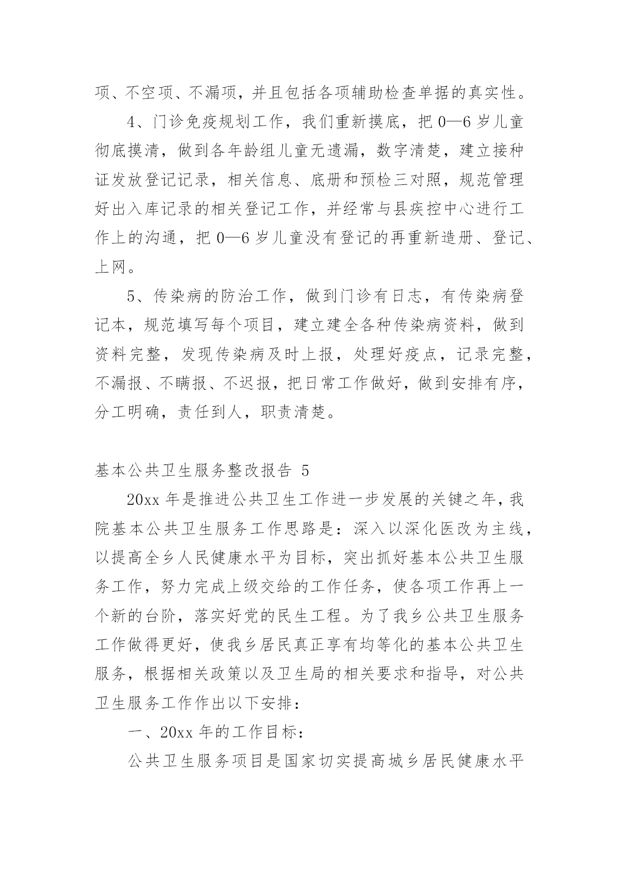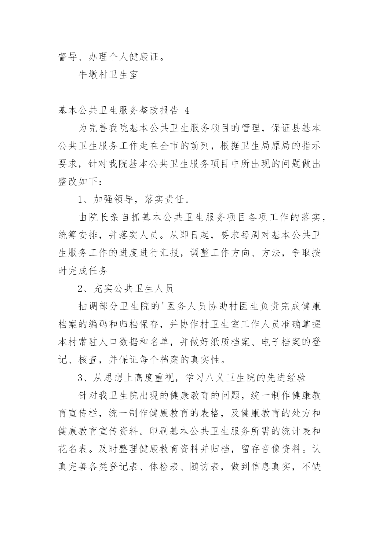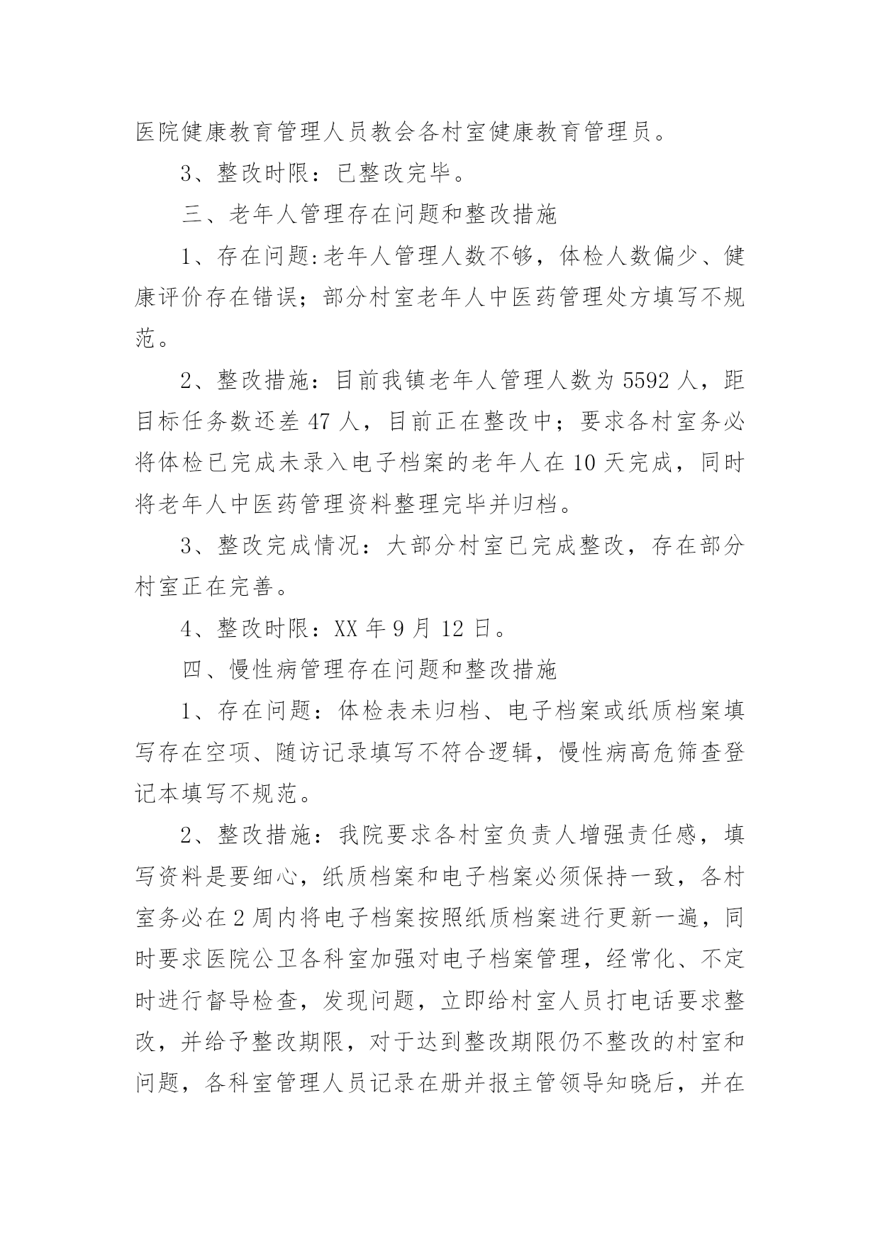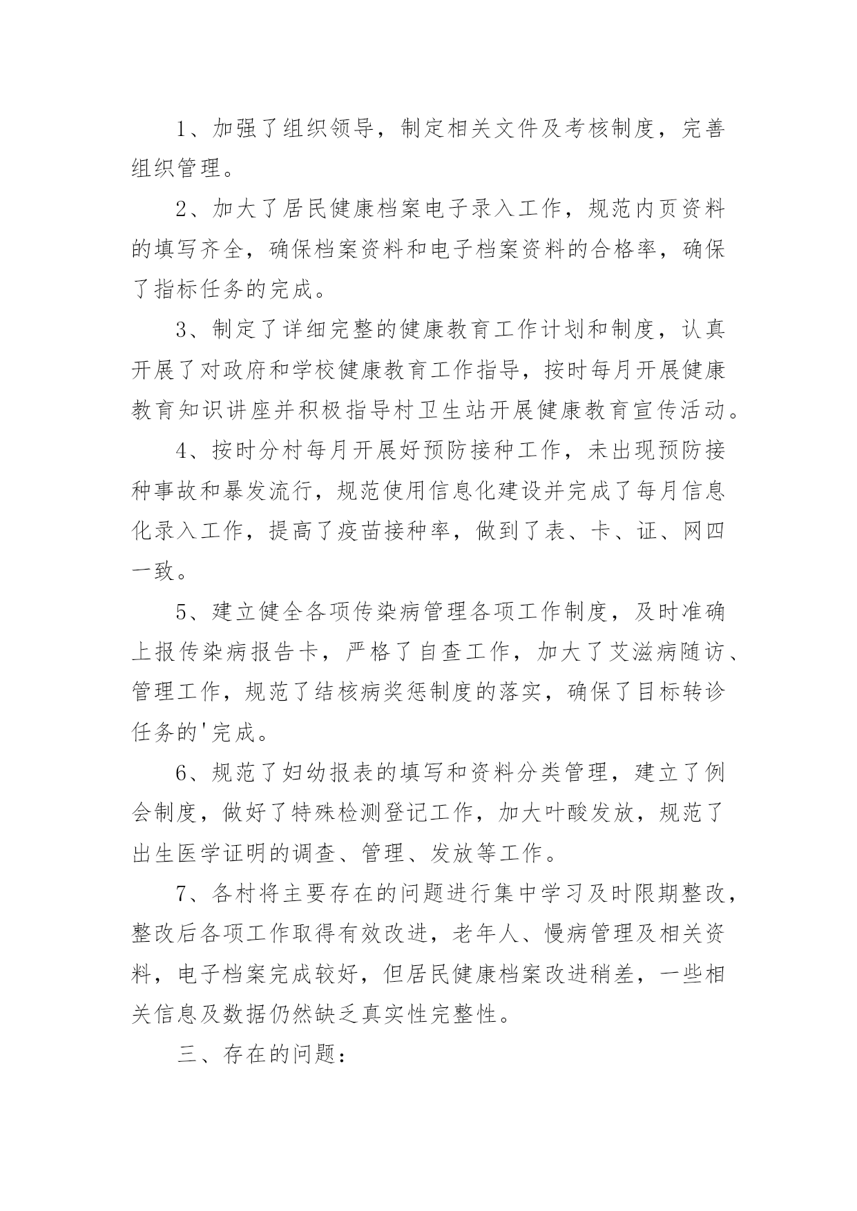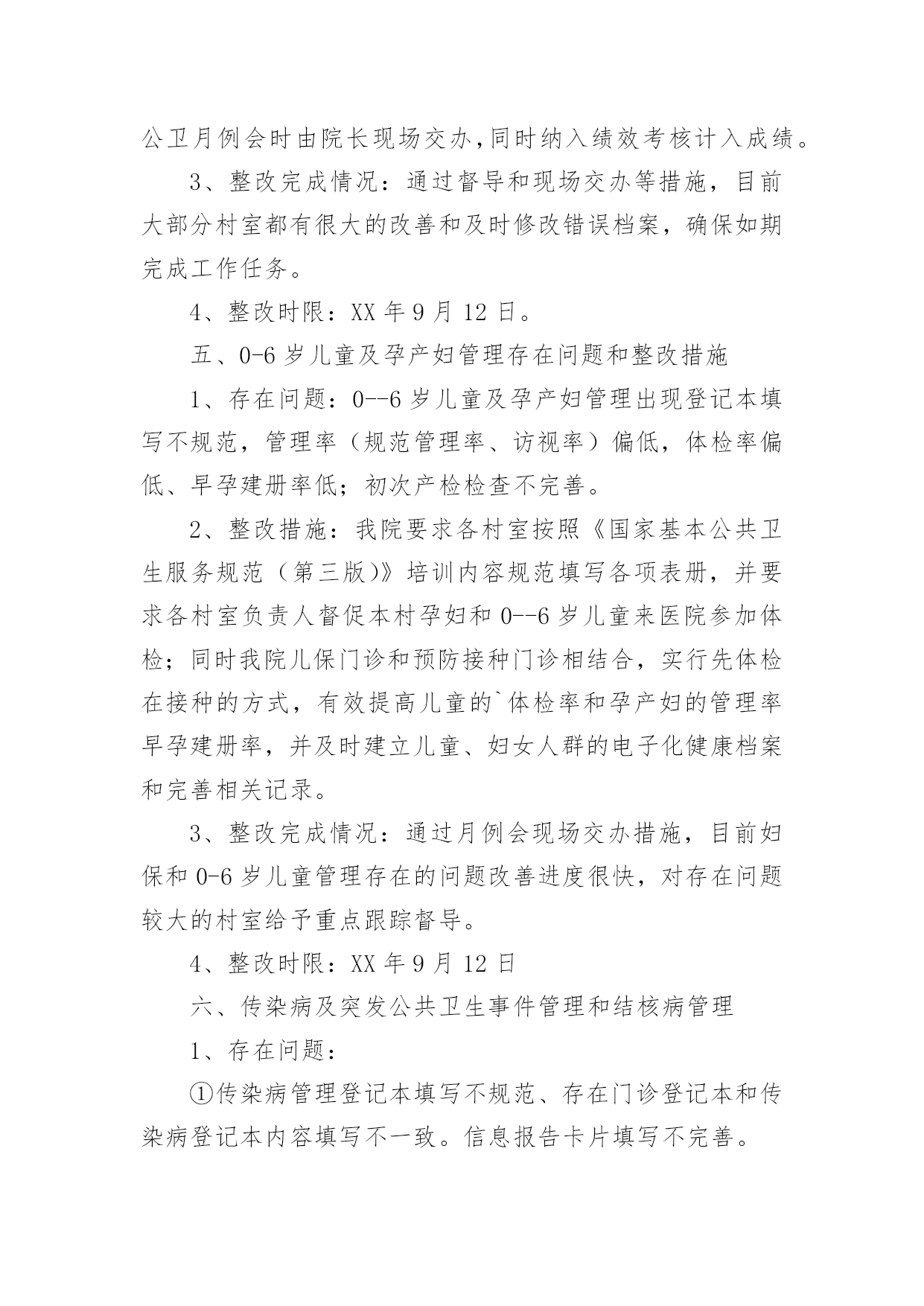 基本公共卫生服务整改报告(优)基本公共卫生服务整改报告15篇在现在社会,接触并使用报告的人越来越多,报告根据用途的不同也有着不同的类型。一起来参考报告是怎么写的吧,下面是小编精心整理的基本公共卫生服务整改报告,供大家参考借鉴,希望可以帮助到有需要的朋友。基本公共卫生服务整改报告1根据县公共卫生专业机构对我单位基本公共卫生服务工作督导中存在的问题,卫生院高度重视及时召开公共卫生科、村卫生站工作会议,研究整改方案和下一步工作安排,现将整改情况汇报如下:一、制定整改方案:1、公共卫生科负责涂家辖区全面基本公共卫生服务指导、管理工作。各村卫生站配合公共卫生科开展好服务工作,确保指标任务的完成。2、对县公共卫生专业机构指出的问题限期整改落实到位,公共卫生科负责落实对辖区存在问题督促整改落实到位。3、村卫生站必须按照公共卫生科安排的公共卫生工作落实到位,确保村级公共卫生目标任务的完成。4、加大指导考核力度,定期汇报工作进展情况到公共卫生科。二、整改后的阶段性成效:1、加强了组织领导,制定相关文件及考核制度,完善组织管理。2、加大了居民健康档案电子录入工作,规范内页资料的填写齐全,确保档案资料和电子档案资料的合格率,确保了指标任务的完成。3、制定了详细完整的健康教育工作计划和制度,认真开展了对政府和学校健康教育工作指导,按时每月开展健康教育知识讲座并积极指导村卫生站开展健康教育宣传活动。4、按时分村每月开展好预防接种工作,未出现预防接种事故和暴发流行,规范使用信息化建设并完成了每月信息化录入工作,提高了疫苗接种率,做到了表、卡、证、网四一致。5、建立健全各项传染病管理各项工作制度,及时准确上报传染病报告卡,严格了自查工作,加大了艾滋病随访、管理工作,规范了结核病奖惩制度的落实,确保了目标转诊任务的'完成。6、规范了妇幼报表的填写和资料分类管理,建立了例会制度,做好了特殊检测登记工作,加大叶酸发放,规范了出生医学证明的调查、管理、发放等工作。7、各村将主要存在的问题进行集中学习及时限期整改,整改后各项工作取得有效改进,老年人、慢病管理及相关资料,电子档案完成较好,但居民健康档案改进稍差,一些相关信息及数据仍然缺乏真实性完整性。三、存在的问题:1、部分从事公共卫生人员素质偏低,工作积极性还有待提高。2、个别村医生业务素质偏低,积极性不强,村卫生室发展不平衡。3、二类疫苗宣传不到位,接种率不高。四、下一步工作安排:1、加强健康教育工作力度,重点对学校、政府健康教育制度、宣传栏建设的指导工作,及时完善相关资料。2、加强村医生的政治教育及业务培训,提高村医生责任心及业务水平。3、针对居民健康档案、老年人、慢病管理存在的问题,加大整改力度,落实相关奖惩制度,争取在第二轮督导中将存在的问题改进达基本公共卫生服务整改报告2根据《xx县卫生健康委员会关于开展基本公共卫生服务项目存在问题自查整改活动的通知》(杞卫字XX.168号)文件要求,我院结合公卫各科室人员对医院公卫各科室及村卫生室最近一周(8月28日-9月3日)的工作实际,现将自查中存在问题、整改措施及整改时限汇报如下:一、居民健康档案存在问题和整改措施1、存在问题:建档率虚高、接诊记录录入偏少、电子档案存在空项、漏项和部分档案填写不符合逻辑。2、整改措施:(1)建档率虚高:我院公卫办将各村室的项目人数和应建档人数发给各村室负责人,然后医院公卫各科室人员对全镇32各村室逐一检查村室的建档率,发现建档率虚高的村室要求务必在10天内把长期在外务工人员超过半年以上的人员全部迁出同时将已经外嫁人员全部迁出,将建档人数减少到项目人数。(2)接诊记录录入电子档案偏少、电子档案空项、漏项及部分不符合逻辑现象:要求各村室按照城乡医保报补记录人数和日期录入电子档案接诊记录;对于空项、漏项部分档案不符合逻辑现象督促各村室务必更新电子档案和纸质档案,公卫办安排专人每天对电子档案进行检查,对于拒不录入接诊记录和对电子档案和纸质档案未更新的村室纳入绩效考核并给于通报批评。(3)整改完成情况:最近一周院公卫办督促相关工作落后的村室进行了档案更新和修改,录入电子接诊记录。档案动态使用率由之前有所提高。电子健康档案建档率稳步下降。电子健康档案完整率较前期有所提高。(4)整改时限:XX年9月12日。二、健康教育存在问题和整改措施1、存在问题:播放记录不够、播放影像资料照片不清晰,健康知识讲座记录存在手写现象、资料不齐。2、整改措施:我院统一为各村室配备U盘并将影像播放内容拷贝,要求各村室务必播放够次数、时间,同时留好清晰的播放时的照片,并要求各村室健康知识讲座不能手写,医院健康教育管理人员教会各村室健康教育管理员。3、整改时限:已整改完毕。三、老年人管理存在问题和整改措施1、存在问题:老年人管理人数不够,体检人数偏少、健康评价存在错