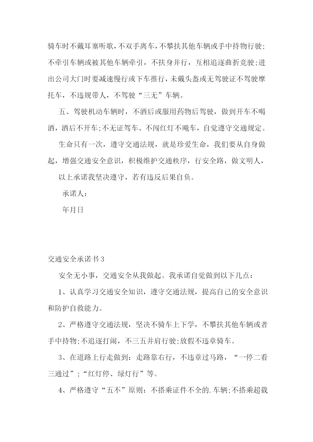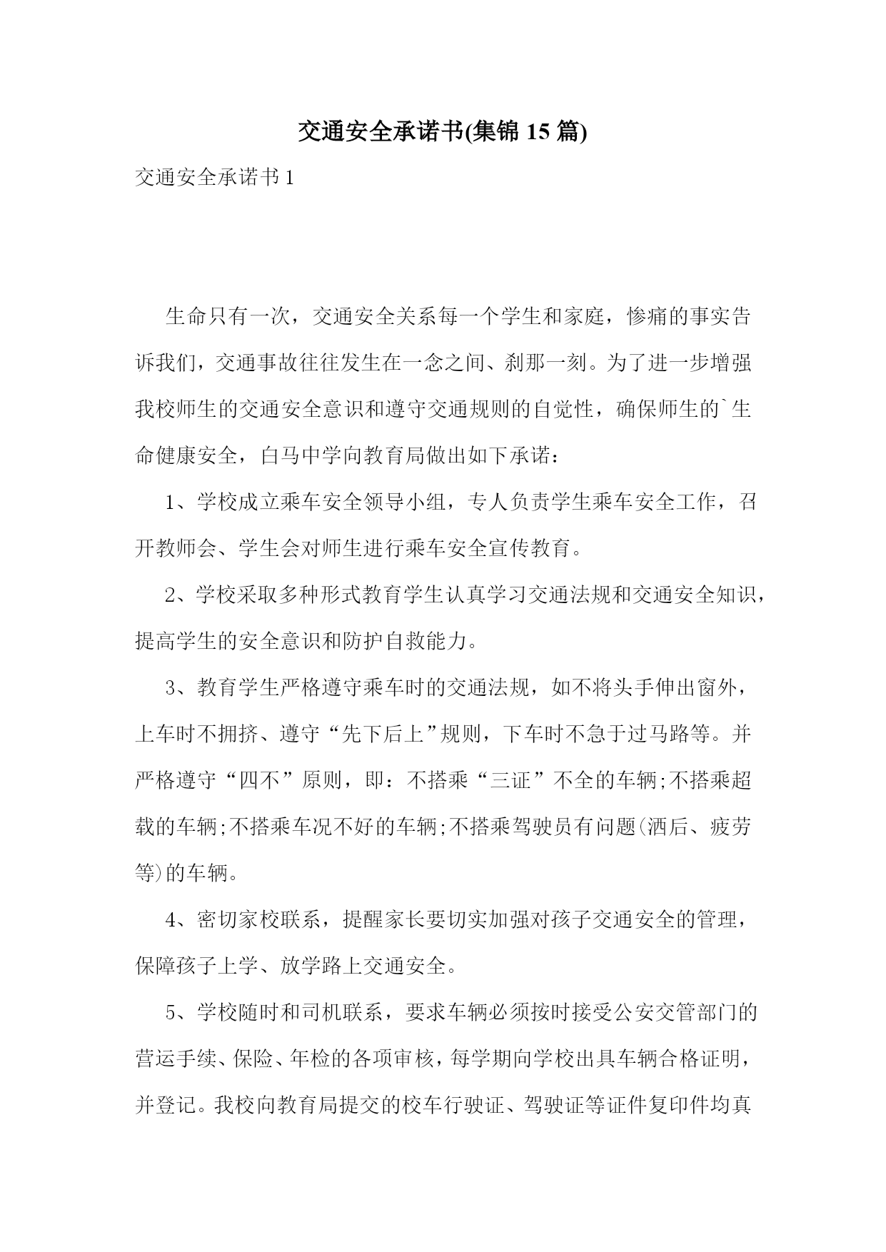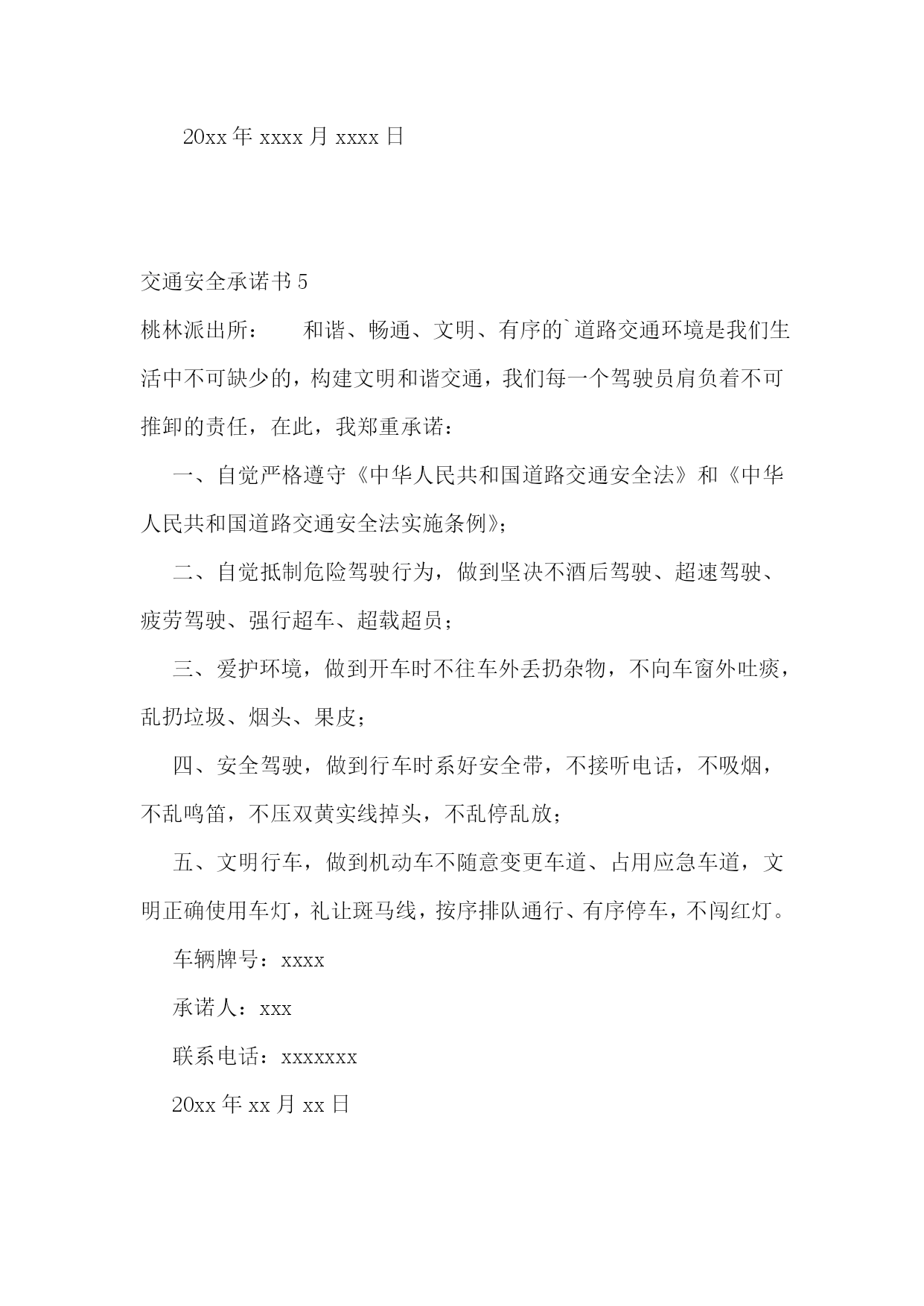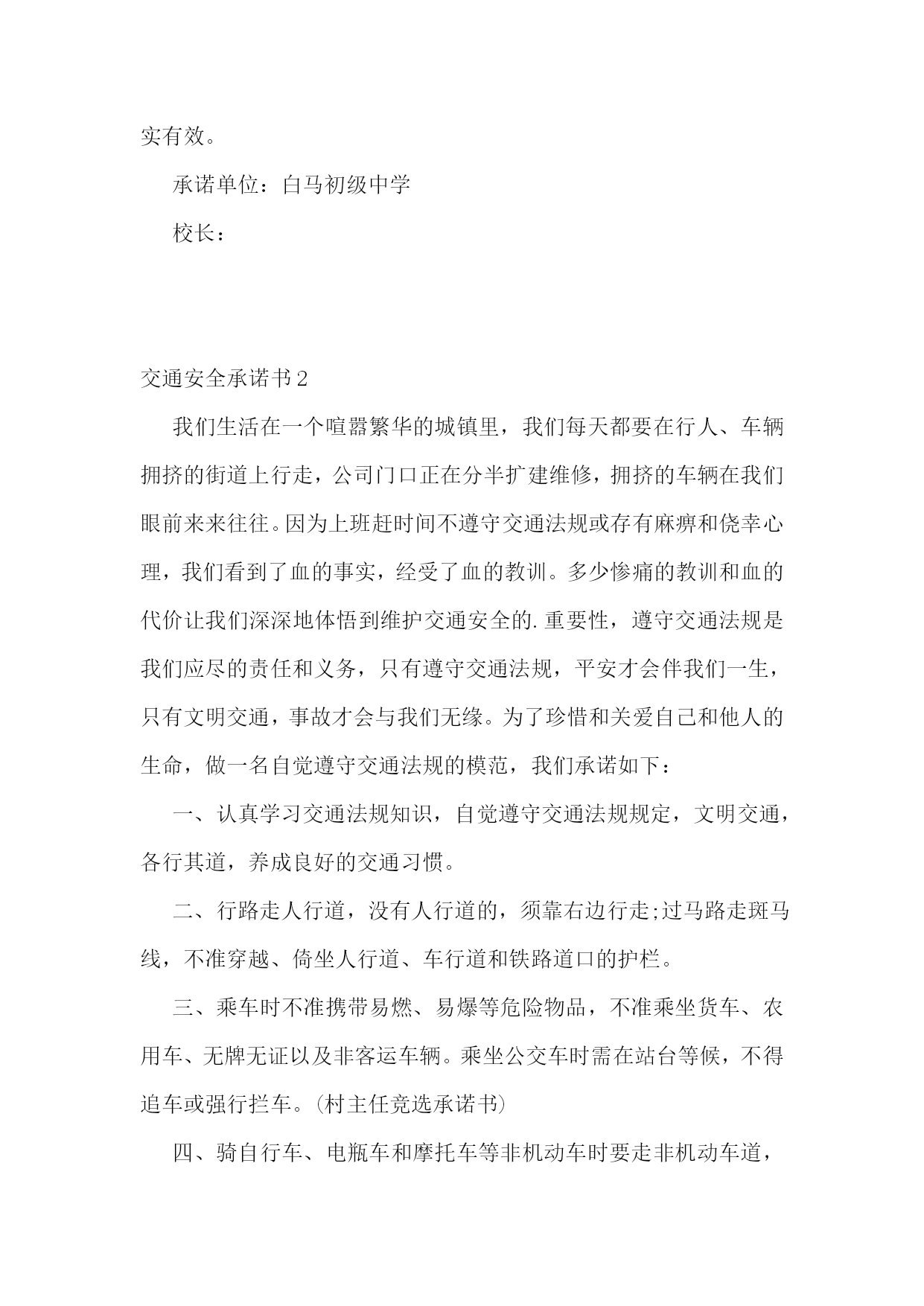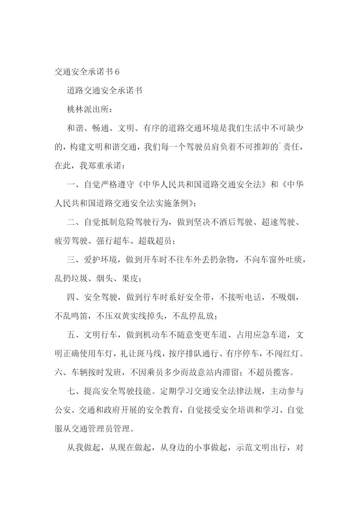 交通安全承诺书(集锦15篇)交通安全承诺书1生命只有一次,交通安全关系每一个学生和家庭,惨痛的事实告诉我们,交通事故往往发生在一念之间、刹那一刻。为了进一步增强我校师生的交通安全意识和遵守交通规则的自觉性,确保师生的`生命健康安全,白马中学向教育局做出如下承诺:1、学校成立乘车安全领导小组,专人负责学生乘车安全工作,召开教师会、学生会对师生进行乘车安全宣传教育。2、学校采取多种形式教育学生认真学习交通法规和交通安全知识,提高学生的安全意识和防护自救能力。3、教育学生严格遵守乘车时的交通法规,如不将头手伸出窗外,上车时不拥挤、遵守“先下后上”规则,下车时不急于过马路等。并严格遵守“四不”原则,即:不搭乘“三证”不全的车辆;不搭乘超载的车辆;不搭乘车况不好的车辆;不搭乘驾驶员有问题(洒后、疲劳等)的车辆。4、密切家校联系,提醒家长要切实加强对孩子交通安全的管理,保障孩子上学、放学路上交通安全。5、学校随时和司机联系,要求车辆必须按时接受公安交管部门的营运手续、保险、年检的各项审核,每学期向学校出具车辆合格证明,并登记。我校向教育局提交的校车行驶证、驾驶证等证件复印件均真实有效。承诺单位:白马初级中学校长:交通安全承诺书2我们生活在一个喧嚣繁华的城镇里,我们每天都要在行人、车辆拥挤的街道上行走,公司门口正在分半扩建维修,拥挤的车辆在我们眼前来来往往。因为上班赶时间不遵守交通法规或存有麻痹和侥幸心理,我们看到了血的事实,经受了血的教训。多少惨痛的教训和血的代价让我们深深地体悟到维护交通安全的.重要性,遵守交通法规是我们应尽的责任和义务,只有遵守交通法规,平安才会伴我们一生,只有文明交通,事故才会与我们无缘。为了珍惜和关爱自己和他人的生命,做一名自觉遵守交通法规的模范,我们承诺如下:一、认真学习交通法规知识,自觉遵守交通法规规定,文明交通,各行其道,养成良好的交通习惯。二、行路走人行道,没有人行道的,须靠右边行走;过马路走斑马线,不准穿越、倚坐人行道、车行道和铁路道口的护栏。三、乘车时不准携带易燃、易爆等危险物品,不准乘坐货车、农用车、无牌无证以及非客运车辆。乘坐公交车时需在站台等候,不得追车或强行拦车。(村主任竞选承诺书)四、骑自行车、电瓶车和摩托车等非机动车时要走非机动车道,骑车时不戴耳塞听歌,不双手离车,不攀扶其他车辆或手中持物行驶;不牵引车辆或被其他车辆牵引,不扶身并行,互相追逐曲折竞驶;进出公司大门时要减速慢行或下车推行,未戴头盔或无驾驶证不驾驶摩托车,不违规带人,不驾驶“三无”车辆。五、驾驶机动车辆时,不酒后或服用药物后驾驶,做到开车不喝酒,酒后不开车;不无证驾车、不闯红灯不飚车,自觉遵守交通规定。生命只有一次,遵守交通法规,就是珍爱生命,我们要从自身做起,增强交通安全意识,积极维护交通秩序,行安全路,做文明人,以上承诺我坚决遵守,若有违反后果自负。承诺人:年月日交通安全承诺书3安全无小事,交通安全从我做起。我承诺自觉做到以下几点:1、认真学习交通安全知识,遵守交通法规,提高自己的安全意识和防护自救能力。2、严格遵守交通法规,坚决不骑车上下学,不攀扶其他车辆或者手中持物;不追逐打闹,不三五并肩行驶;放假不违章骑车。3、在道路上行走做到:走路靠右行,不违章过马路,“一停二看三通过”;“红灯停、绿灯行”等。4、严格遵守“五不”原则:不搭乘证件不全的.车辆;不搭乘超载的车辆;不搭乘非客运车辆;不搭乘司机酒后、疲劳等的车辆;不搭乘危险驾驶的车辆。5、严格执行学校、家长的交通安全教育。承诺人(签名):xxxxxx班级班主任(签名):xxxx年xx月xx日交通安全承诺书4“遵章守法,从每一步做起。”为维护道路交通安全秩序,预防和减少道路交通事故,确保自身、家庭以及社会公众的平安、幸福,作为一名交通参与者,我承诺做到:一、自觉遵守《中华人民共和国道路交通安全法》、《xxxx省道路交通安全条例》及其相关法律、法规,时刻谨记交通安全。二、驾安全车,切实做到不酒后驾车,不无证驾车,不闯红灯,不超载超速,不开英雄车、斗气车。三、停文明车,切实做到路口不越线停车,不在网格线内停车,不在路口、公交停靠站点停车,不违法占道乱停乱放。四、珍爱生命、遵章守法、文明驾驶、礼让行车、恪守承诺。本人自愿遵守以上守则,对本人行为负责,做文明守法公民。本人愿与全社会一起,共建安全、畅通、文明和谐的.交通环境。xxxxxx20xx年xxxx月xxxx日交通安全承诺书5桃林派出所:和谐、畅通、文明、有序的`道路交通环境是我们生活中不可缺少的,构建文明和谐交通,我们每一个驾驶员肩负着不可推卸的责任,在此,我郑重承诺:一、自觉严格遵守《中华人民共和国道路交通安全法》和《中