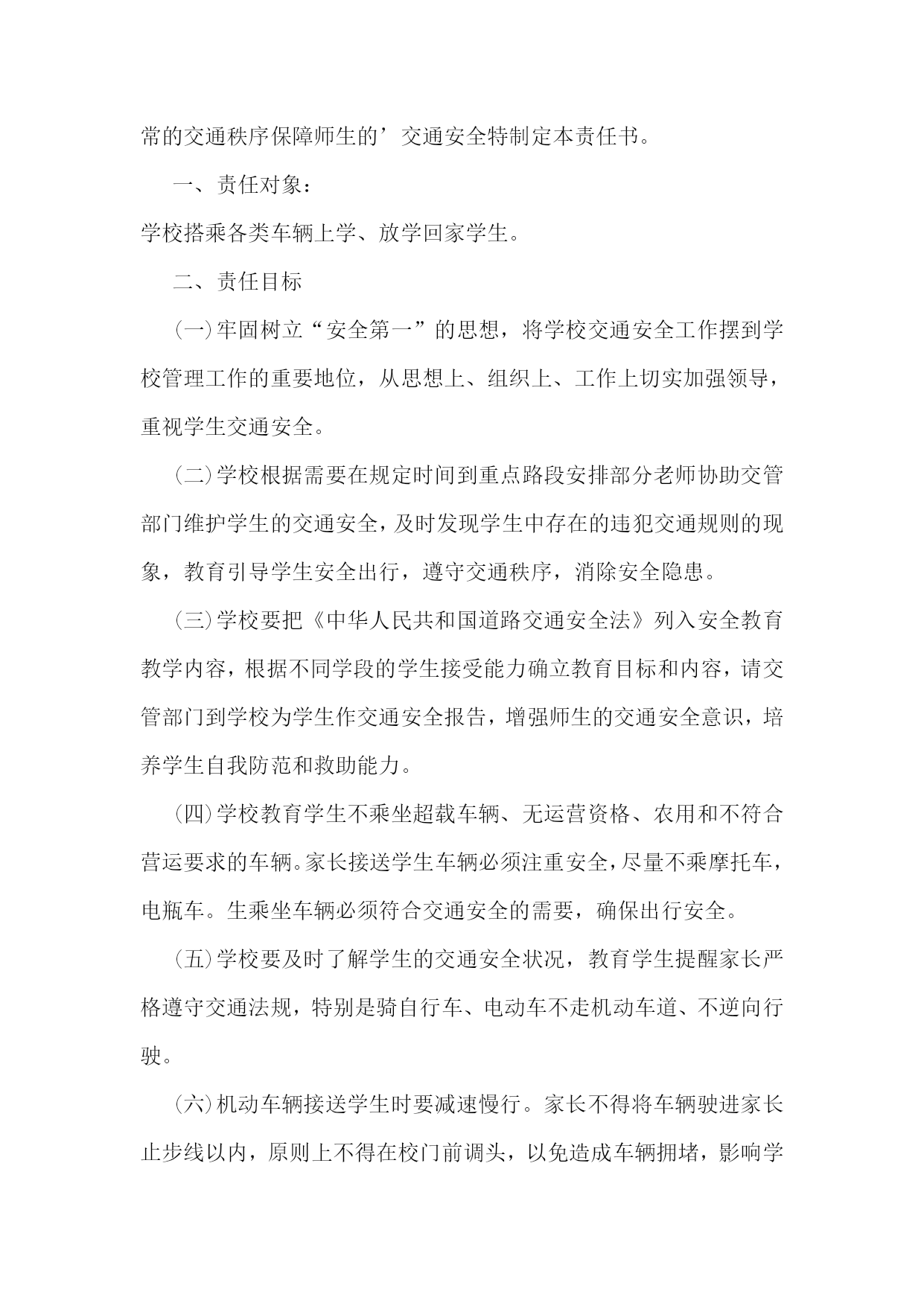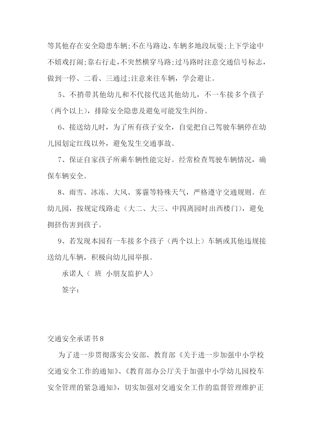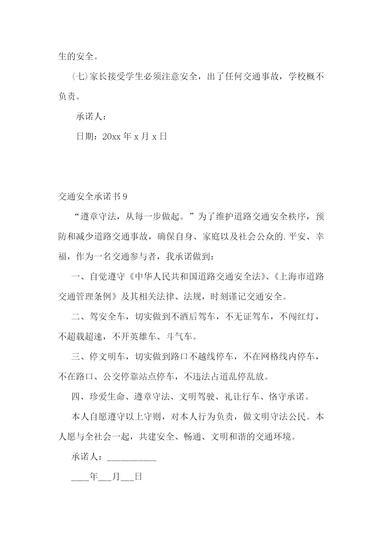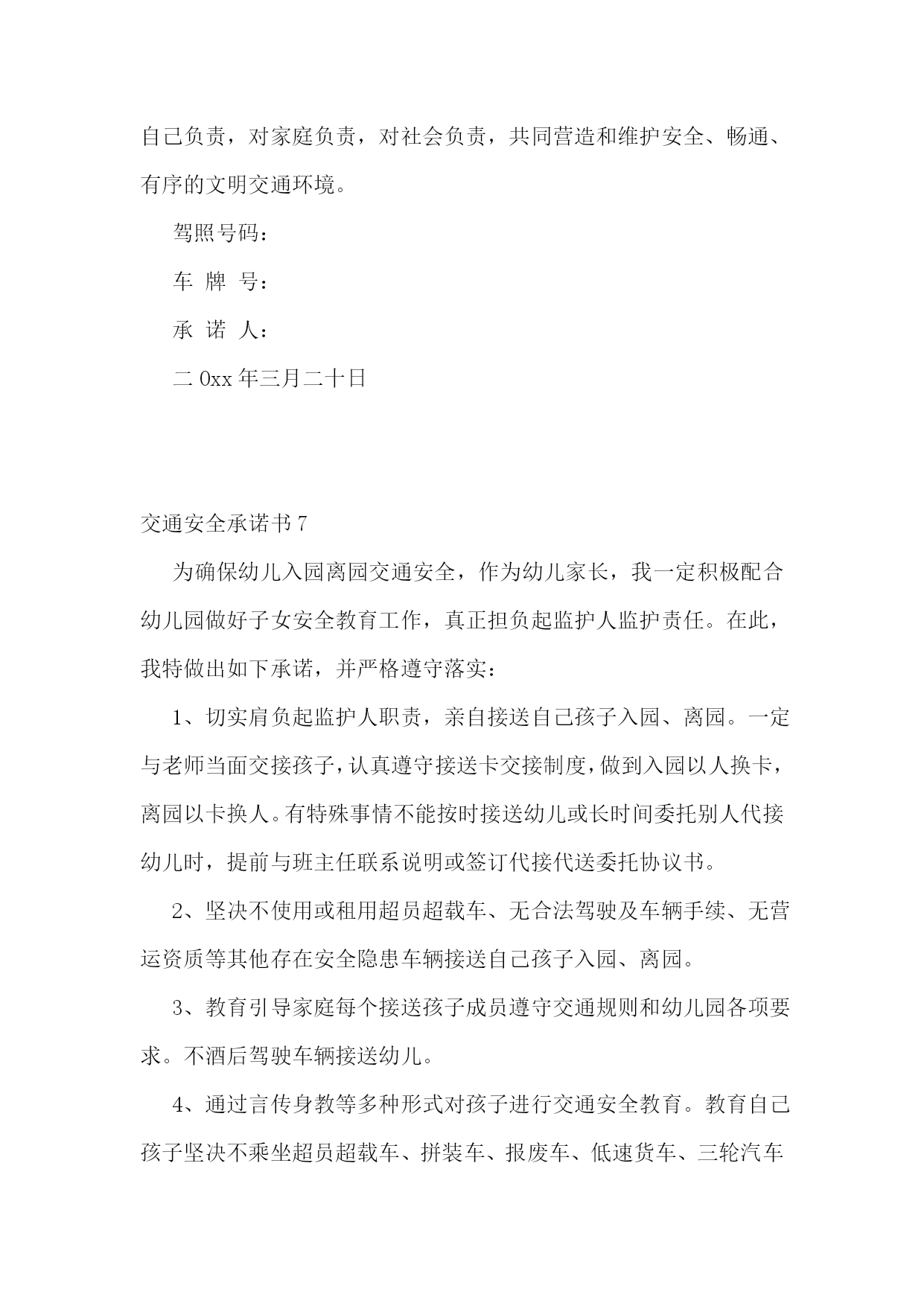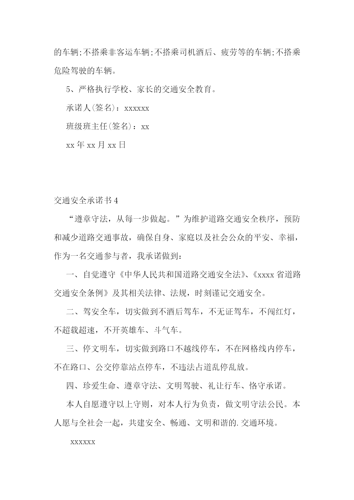 交通安全承诺书(集锦15篇)交通安全承诺书1生命只有一次,交通安全关系每一个学生和家庭,惨痛的事实告诉我们,交通事故往往发生在一念之间、刹那一刻。为了进一步增强我校师生的交通安全意识和遵守交通规则的自觉性,确保师生的`生命健康安全,白马中学向教育局做出如下承诺:1、学校成立乘车安全领导小组,专人负责学生乘车安全工作,召开教师会、学生会对师生进行乘车安全宣传教育。2、学校采取多种形式教育学生认真学习交通法规和交通安全知识,提高学生的安全意识和防护自救能力。3、教育学生严格遵守乘车时的交通法规,如不将头手伸出窗外,上车时不拥挤、遵守“先下后上”规则,下车时不急于过马路等。并严格遵守“四不”原则,即:不搭乘“三证”不全的车辆;不搭乘超载的车辆;不搭乘车况不好的车辆;不搭乘驾驶员有问题(洒后、疲劳等)的车辆。4、密切家校联系,提醒家长要切实加强对孩子交通安全的管理,保障孩子上学、放学路上交通安全。5、学校随时和司机联系,要求车辆必须按时接受公安交管部门的营运手续、保险、年检的各项审核,每学期向学校出具车辆合格证明,并登记。我校向教育局提交的校车行驶证、驾驶证等证件复印件均真实有效。承诺单位:白马初级中学校长:交通安全承诺书2我们生活在一个喧嚣繁华的城镇里,我们每天都要在行人、车辆拥挤的街道上行走,公司门口正在分半扩建维修,拥挤的车辆在我们眼前来来往往。因为上班赶时间不遵守交通法规或存有麻痹和侥幸心理,我们看到了血的事实,经受了血的教训。多少惨痛的教训和血的代价让我们深深地体悟到维护交通安全的.重要性,遵守交通法规是我们应尽的责任和义务,只有遵守交通法规,平安才会伴我们一生,只有文明交通,事故才会与我们无缘。为了珍惜和关爱自己和他人的生命,做一名自觉遵守交通法规的模范,我们承诺如下:一、认真学习交通法规知识,自觉遵守交通法规规定,文明交通,各行其道,养成良好的交通习惯。二、行路走人行道,没有人行道的,须靠右边行走;过马路走斑马线,不准穿越、倚坐人行道、车行道和铁路道口的护栏。三、乘车时不准携带易燃、易爆等危险物品,不准乘坐货车、农用车、无牌无证以及非客运车辆。乘坐公交车时需在站台等候,不得追车或强行拦车。(村主任竞选承诺书)四、骑自行车、电瓶车和摩托车等非机动车时要走非机动车道,骑车时不戴耳塞听歌,不双手离车,不攀扶其他车辆或手中持物行驶;不牵引车辆或被其他车辆牵引,不扶身并行,互相追逐曲折竞驶;进出公司大门时要减速慢行或下车推行,未戴头盔或无驾驶证不驾驶摩托车,不违规带人,不驾驶“三无”车辆。五、驾驶机动车辆时,不酒后或服用药物后驾驶,做到开车不喝酒,酒后不开车;不无证驾车、不闯红灯不飚车,自觉遵守交通规定。生命只有一次,遵守交通法规,就是珍爱生命,我们要从自身做起,增强交通安全意识,积极维护交通秩序,行安全路,做文明人,以上承诺我坚决遵守,若有违反后果自负。承诺人:年月日交通安全承诺书3安全无小事,交通安全从我做起。我承诺自觉做到以下几点:1、认真学习交通安全知识,遵守交通法规,提高自己的安全意识和防护自救能力。2、严格遵守交通法规,坚决不骑车上下学,不攀扶其他车辆或者手中持物;不追逐打闹,不三五并肩行驶;放假不违章骑车。3、在道路上行走做到:走路靠右行,不违章过马路,“一停二看三通过”;“红灯停、绿灯行”等。4、严格遵守“五不”原则:不搭乘证件不全的.车辆;不搭乘超载的车辆;不搭乘非客运车辆;不搭乘司机酒后、疲劳等的车辆;不搭乘危险驾驶的车辆。5、严格执行学校、家长的交通安全教育。承诺人(签名):xxxxxx班级班主任(签名):xxxx年xx月xx日交通安全承诺书4“遵章守法,从每一步做起。”为维护道路交通安全秩序,预防和减少道路交通事故,确保自身、家庭以及社会公众的平安、幸福,作为一名交通参与者,我承诺做到:一、自觉遵守《中华人民共和国道路交通安全法》、《xxxx省道路交通安全条例》及其相关法律、法规,时刻谨记交通安全。二、驾安全车,切实做到不酒后驾车,不无证驾车,不闯红灯,不超载超速,不开英雄车、斗气车。三、停文明车,切实做到路口不越线停车,不在网格线内停车,不在路口、公交停靠站点停车,不违法占道乱停乱放。四、珍爱生命、遵章守法、文明驾驶、礼让行车、恪守承诺。本人自愿遵守以上守则,对本人行为负责,做文明守法公民。本人愿与全社会一起,共建安全、畅通、文明和谐的.交通环境。xxxxxx20xx年xxxx月xxxx日交通安全承诺书5桃林派出所:和谐、畅通、文明、有序的`道路交通环境是我们生活中不可缺少的,构建文明和谐交通,我们每一个驾驶员肩负着不可推卸的责任,在此,我郑重承诺:一、自觉严格遵守《中华人民共和国道路交通安全法》和《中