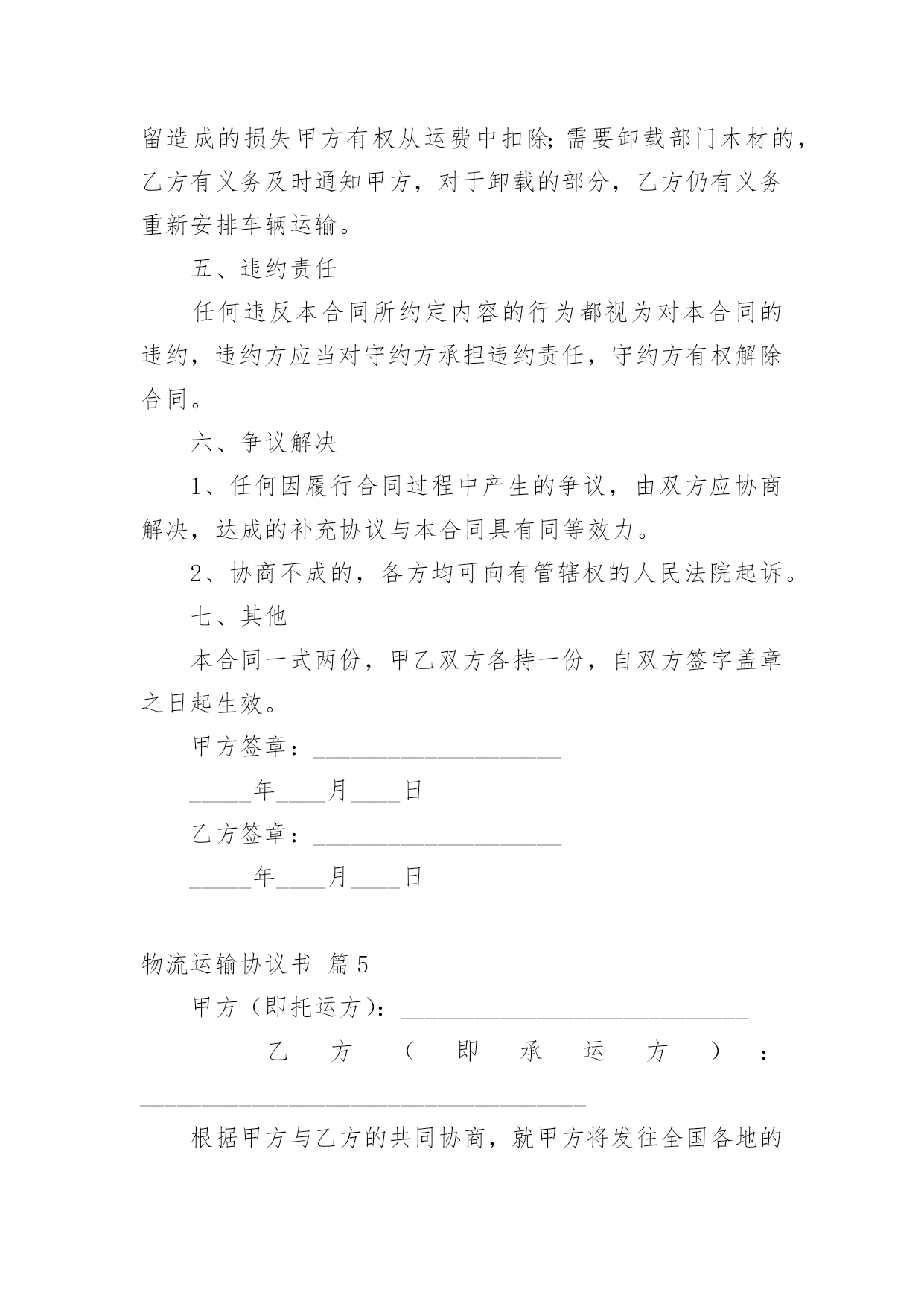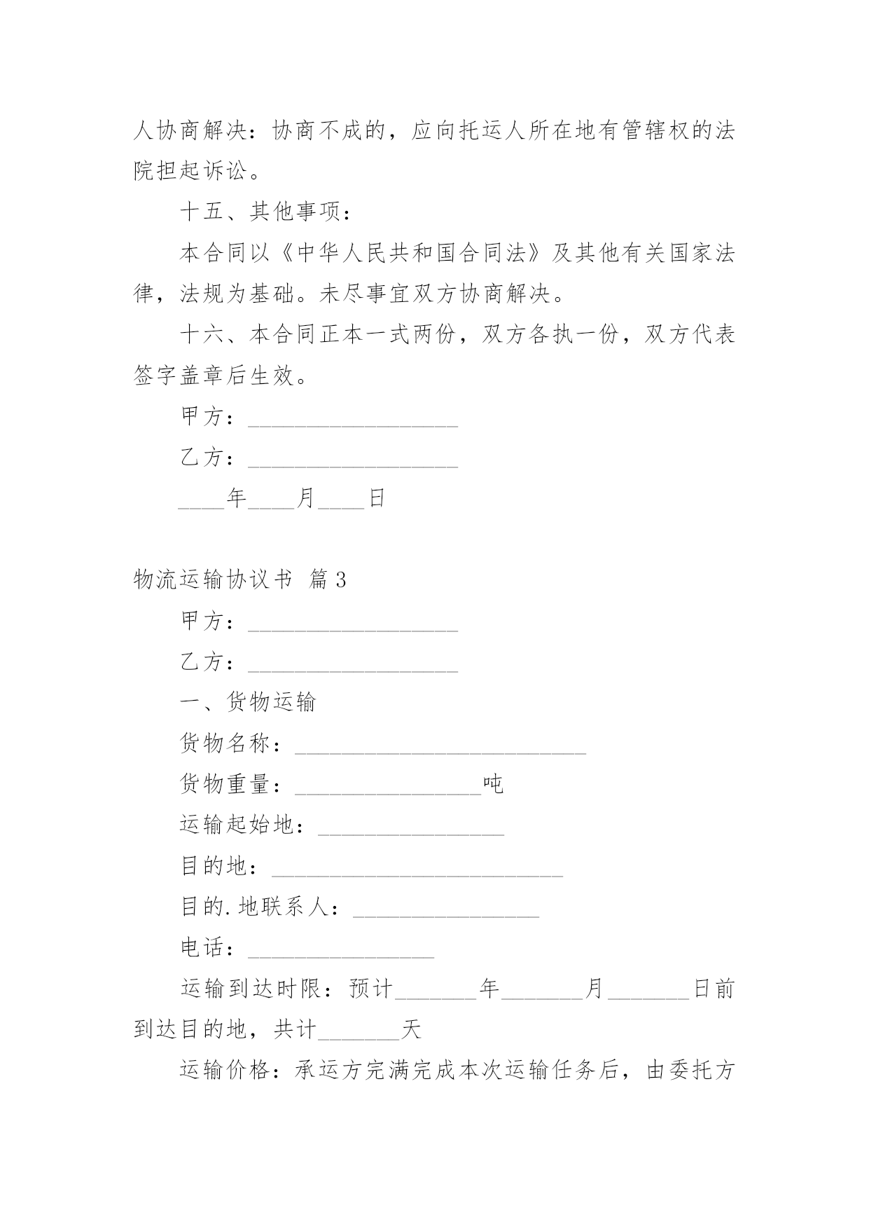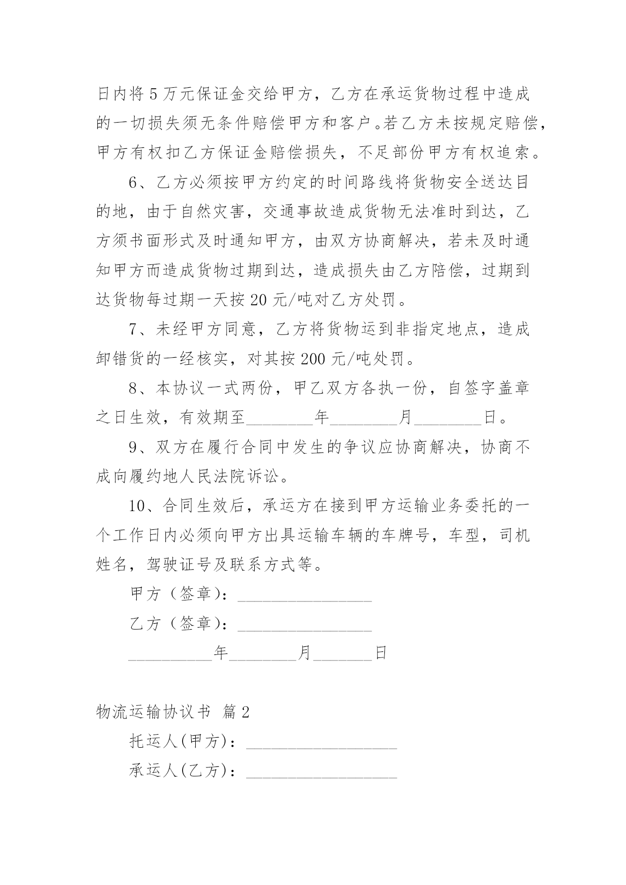 物流运输协议书物流运输协议书(热门)在现在社会,大家逐渐认识到协议的重要性,签订协议是解决纠纷的保障。那么什么样的协议才是有效的呢?以下是小编帮大家整理的物流运输协议书,欢迎阅读与收藏。物流运输协议书篇1委托方(甲方):________________承运方(乙方):________________经甲乙双方协商依据《合同法》及《汽车货物运输规则》等有关法律法规,在平等自愿的原则下,为明确双方关系,甲方委托乙方运输钢卷板事宜,达成以下协议,甲乙双方共同遵照执行。1、甲方委托乙方运输货物,乙方在承运过程中对货物丢失,短缺,损坏,雨淋,生锈等原因造成损失的,由乙方全部承担赔偿。2、甲方委托乙方于________年________月________日起,开始运输如下地区的`货物。3、运费结算方式:按月现金结算,如需开具发票双方协商决定。4、乙方作为甲方指定的汽运物流公司,须具备国家认可运输资格,并提供有关证明文件。5、为保证发出货物的安全,乙方须在本协议生效后7日内将5万元保证金交给甲方,乙方在承运货物过程中造成的一切损失须无条件赔偿甲方和客户。若乙方未按规定赔偿,甲方有权扣乙方保证金赔偿损失,不足部份甲方有权追索。6、乙方必须按甲方约定的时间路线将货物安全送达目的地,由于自然灾害,交通事故造成货物无法准时到达,乙方须书面形式及时通知甲方,由双方协商解决,若未及时通知甲方而造成货物过期到达,造成损失由乙方陪偿,过期到达货物每过期一天按20元/吨对乙方处罚。7、未经甲方同意,乙方将货物运到非指定地点,造成卸错货的一经核实,对其按200元/吨处罚。8、本协议一式两份,甲乙双方各执一份,自签字盖章之日生效,有效期至________年________月________日。9、双方在履行合同中发生的争议应协商解决,协商不成向履约地人民法院诉讼。10、合同生效后,承运方在接到甲方运输业务委托的一个工作日内必须向甲方出具运输车辆的车牌号,车型,司机姓名,驾驶证号及联系方式等。甲方(签章):________________乙方(签章):__________________________年________月_______日物流运输协议书篇2托运人(甲方):__________________承运人(乙方):__________________甲、乙双方本着自愿平等、互惠互利的原则,经友好协商,签订本合同。一、乙方自行组织船只,从事国内运输业务。三、装船期及载货量:采取分批承(发)运,甲方每月5日前下达下月发货计划,乙方于每月10日前确认承运计划。四、发货人、收货人及运费率见附件,乙方不承担货物装卸费用。五、数据与交接:货物数量以发货人发货单据为准。乙方必须加强现场监装、监卸工作,确保货物的交货数量。六、乙方确保船舶处于适运状态,适于收受、载运和保管货物,若装货前发现船舶不符合装卸要求,甲方有权不装货,乙方所派船舶到甲方,甲方必须安排五小时内装货。七、运达期限:在正常的情况下,乙方必须保证货物装船完毕后,在合理期限内及时将货物保质、保量运达收货人指定地点。八、结算与付款:按发货人发货单结算运费,如由于非不可抗力因素导致甲方货物受损或灭失或掺杂等影响货物品质的情况,乙方应承担全部赔偿责任并由甲方扣除相应运费。每月上旬,乙方提供收货人货物交接清单,凭运输发票结算或当地税务机关代开的发票,每月25日前结算。甲方按乙方提供的账户汇款,如因账户性质及其他原因不能收到运费,所产生的法律纠纷由乙方承担或现金结算。九、保险:乙方负责办理船舶保险。十、税收及费用:涉及货物的税、费由甲方承担,涉及船舶及运费的.税、费由乙方承担。十一、违约责任:1、在货物的装卸、运输过程中,如由于非不可抗力因素导致甲方货物受损2、乙方因超载或故障等原因,要求减载或转载才能交货的发生的过载、转运等费用和货物亏吨由乙方承担。3、乙方船舶发生计少包,由乙方赔偿少包损失并承担亏吨运费。十二、特约事项:乙方船舶必须具备良好的盖船设施,货物装妥后及时盖船,并确保货物在运输过程中处于密封状态。乙方必须提供船舶保险单,营运证,船舶所有权证书,航行证书等复印件,并加盖公章,保证内容真实、清晰。乙方必须服从甲方因生产、销售需要而对船只进行的调度安排,不得违反仓库安全生产管理规定。乙方船舶如违反上述条款及本合同“第十二条”规定,造成损失或不良影响,乙方除赔偿损失外,甲方有权解除合同。十三、合同有效期:合同有效期自____年____月____日至____年____月____日止。十四、争议解决:本合同项下发生的争议,由双方当事人协商解决:协商不成的,应向托运人所在地有管辖权的法院担起诉讼。十五、其他事项:本合同以《中华人民共和国合同法》及其他有关国家法律,法规为基础。未尽事宜双方协商解决。十六、本合同正本一