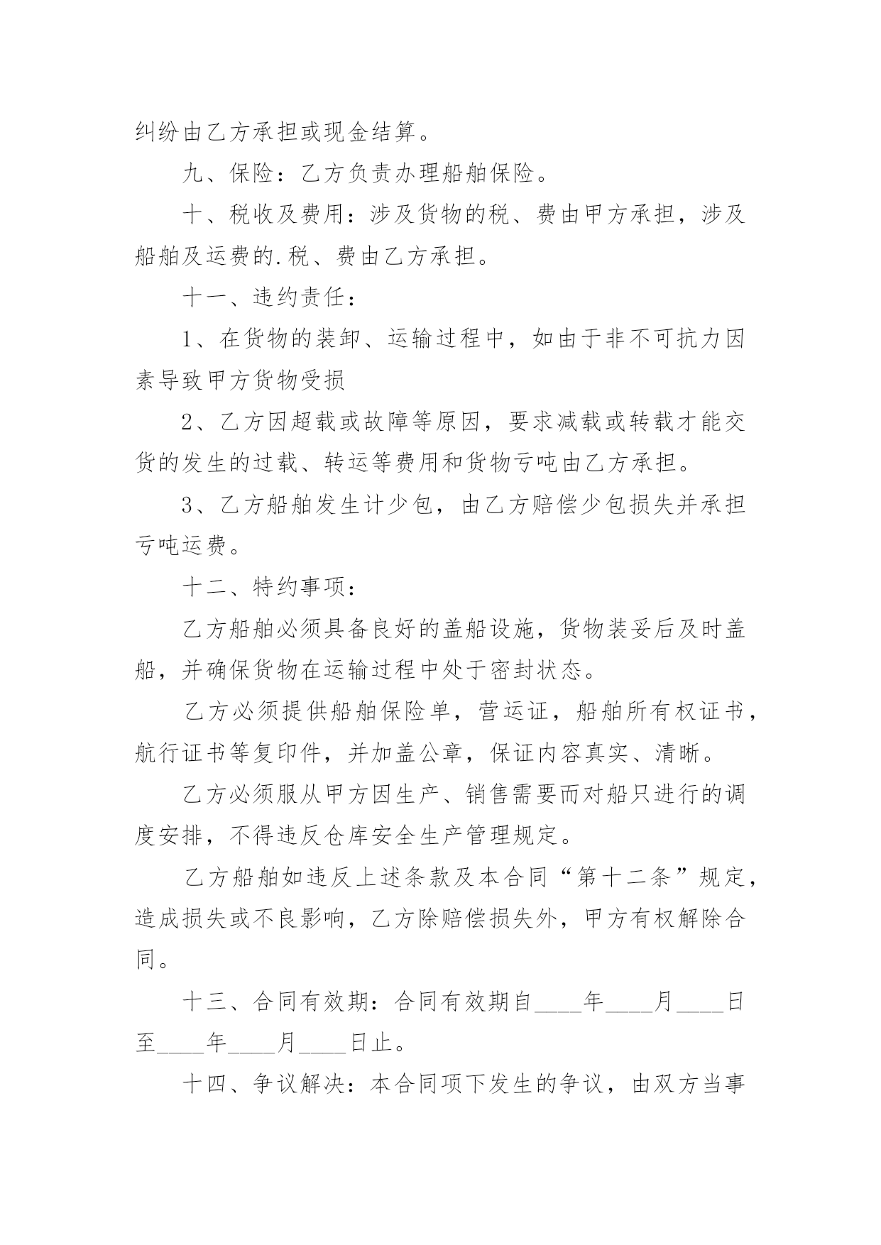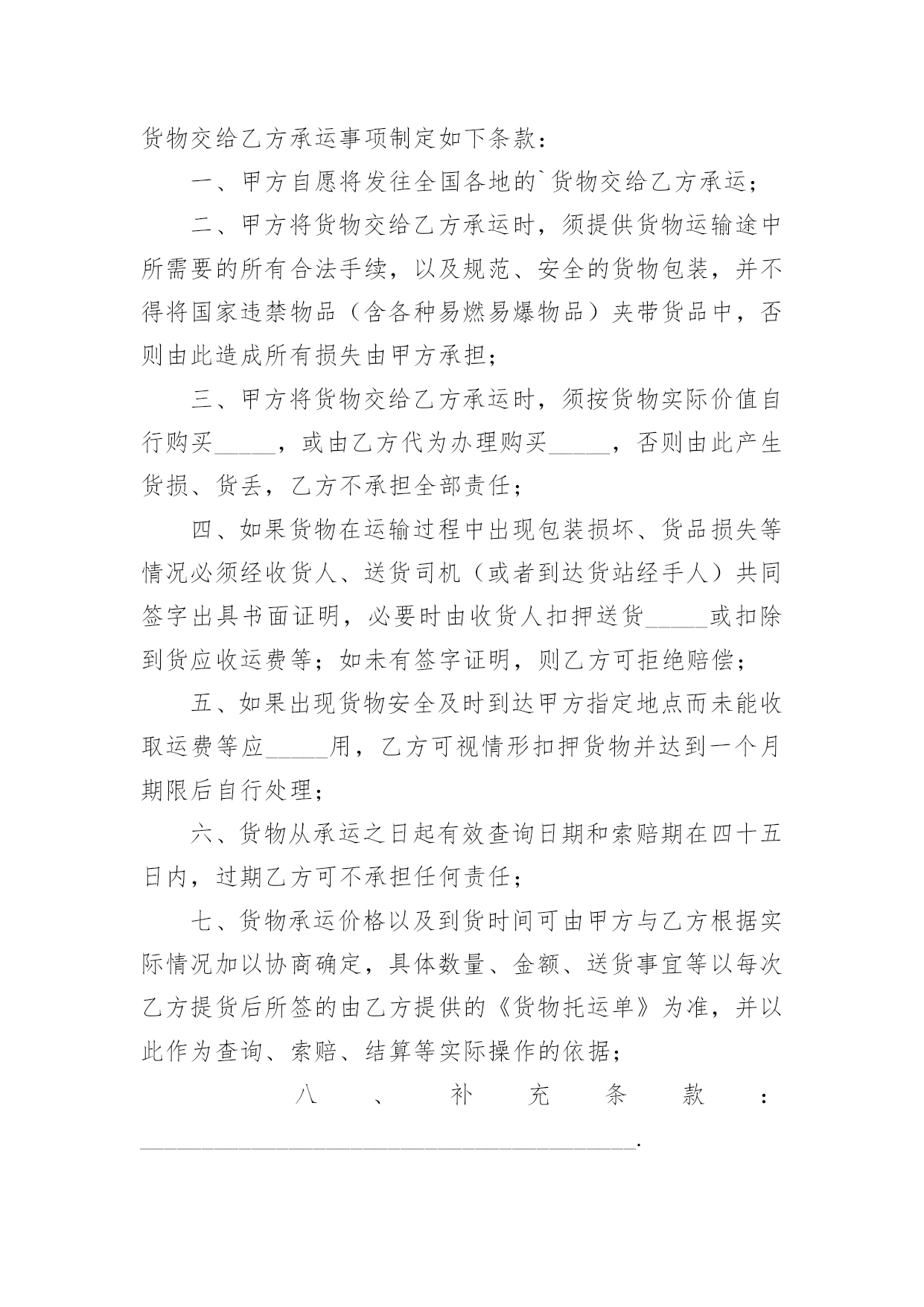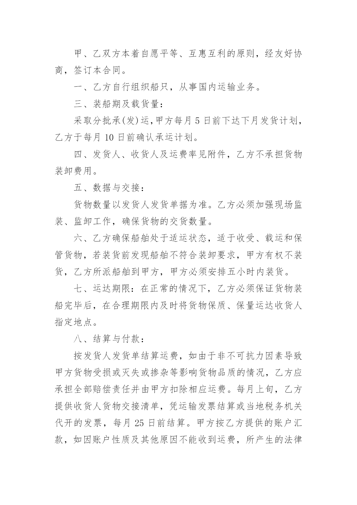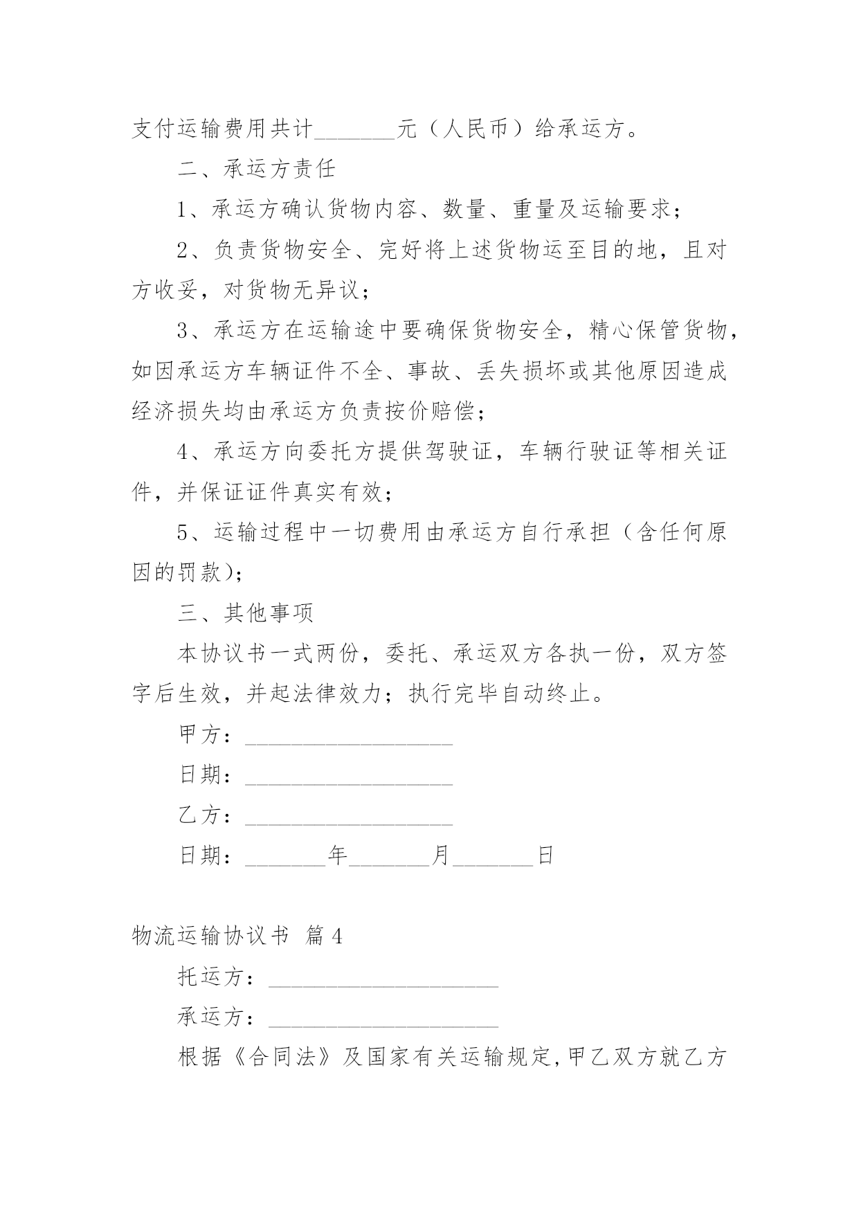 物流运输协议书物流运输协议书(热门)在现在社会,大家逐渐认识到协议的重要性,签订协议是解决纠纷的保障。那么什么样的协议才是有效的呢?以下是小编帮大家整理的物流运输协议书,欢迎阅读与收藏。物流运输协议书篇1委托方(甲方):________________承运方(乙方):________________经甲乙双方协商依据《合同法》及《汽车货物运输规则》等有关法律法规,在平等自愿的原则下,为明确双方关系,甲方委托乙方运输钢卷板事宜,达成以下协议,甲乙双方共同遵照执行。1、甲方委托乙方运输货物,乙方在承运过程中对货物丢失,短缺,损坏,雨淋,生锈等原因造成损失的,由乙方全部承担赔偿。2、甲方委托乙方于________年________月________日起,开始运输如下地区的`货物。3、运费结算方式:按月现金结算,如需开具发票双方协商决定。4、乙方作为甲方指定的汽运物流公司,须具备国家认可运输资格,并提供有关证明文件。5、为保证发出货物的安全,乙方须在本协议生效后7日内将5万元保证金交给甲方,乙方在承运货物过程中造成的一切损失须无条件赔偿甲方和客户。若乙方未按规定赔偿,甲方有权扣乙方保证金赔偿损失,不足部份甲方有权追索。6、乙方必须按甲方约定的时间路线将货物安全送达目的地,由于自然灾害,交通事故造成货物无法准时到达,乙方须书面形式及时通知甲方,由双方协商解决,若未及时通知甲方而造成货物过期到达,造成损失由乙方陪偿,过期到达货物每过期一天按20元/吨对乙方处罚。7、未经甲方同意,乙方将货物运到非指定地点,造成卸错货的一经核实,对其按200元/吨处罚。8、本协议一式两份,甲乙双方各执一份,自签字盖章之日生效,有效期至________年________月________日。9、双方在履行合同中发生的争议应协商解决,协商不成向履约地人民法院诉讼。10、合同生效后,承运方在接到甲方运输业务委托的一个工作日内必须向甲方出具运输车辆的车牌号,车型,司机姓名,驾驶证号及联系方式等。甲方(签章):________________乙方(签章):__________________________年________月_______日物流运输协议书篇2托运人(甲方):__________________承运人(乙方):__________________甲、乙双方本着自愿平等、互惠互利的原则,经友好协商,签订本合同。一、乙方自行组织船只,从事国内运输业务。三、装船期及载货量:采取分批承(发)运,甲方每月5日前下达下月发货计划,乙方于每月10日前确认承运计划。四、发货人、收货人及运费率见附件,乙方不承担货物装卸费用。五、数据与交接:货物数量以发货人发货单据为准。乙方必须加强现场监装、监卸工作,确保货物的交货数量。六、乙方确保船舶处于适运状态,适于收受、载运和保管货物,若装货前发现船舶不符合装卸要求,甲方有权不装货,乙方所派船舶到甲方,甲方必须安排五小时内装货。七、运达期限:在正常的情况下,乙方必须保证货物装船完毕后,在合理期限内及时将货物保质、保量运达收货人指定地点。八、结算与付款:按发货人发货单结算运费,如由于非不可抗力因素导致甲方货物受损或灭失或掺杂等影响货物品质的情况,乙方应承担全部赔偿责任并由甲方扣除相应运费。每月上旬,乙方提供收货人货物交接清单,凭运输发票结算或当地税务机关代开的发票,每月25日前结算。甲方按乙方提供的账户汇款,如因账户性质及其他原因不能收到运费,所产生的法律纠纷由乙方承担或现金结算。九、保险:乙方负责办理船舶保险。十、税收及费用:涉及货物的税、费由甲方承担,涉及船舶及运费的.税、费由乙方承担。十一、违约责任:1、在货物的装卸、运输过程中,如由于非不可抗力因素导致甲方货物受损2、乙方因超载或故障等原因,要求减载或转载才能交货的发生的过载、转运等费用和货物亏吨由乙方承担。3、乙方船舶发生计少包,由乙方赔偿少包损失并承担亏吨运费。十二、特约事项:乙方船舶必须具备良好的盖船设施,货物装妥后及时盖船,并确保货物在运输过程中处于密封状态。乙方必须提供船舶保险单,营运证,船舶所有权证书,航行证书等复印件,并加盖公章,保证内容真实、清晰。乙方必须服从甲方因生产、销售需要而对船只进行的调度安排,不得违反仓库安全生产管理规定。乙方船舶如违反上述条款及本合同“第十二条”规定,造成损失或不良影响,乙方除赔偿损失外,甲方有权解除合同。十三、合同有效期:合同有效期自____年____月____日至____年____月____日止。十四、争议解决:本合同项下发生的争议,由双方当事人协商解决:协商不成的,应向托运人所在地有管辖权的法院担起诉讼。十五、其他事项:本合同以《中华人民共和国合同法》及其他有关国家法律,法规为基础。未尽事宜双方协商解决。十六、本合同正本一