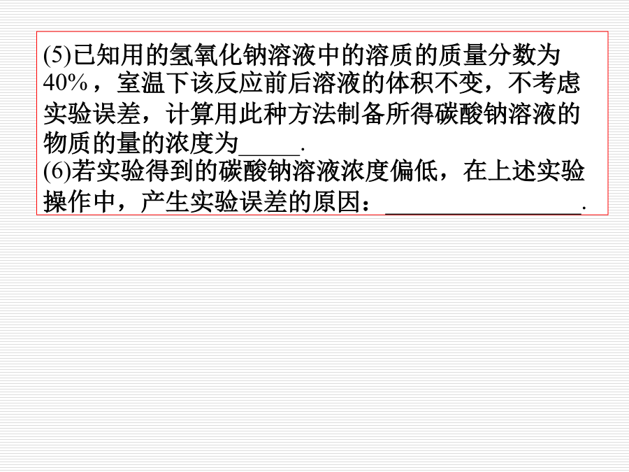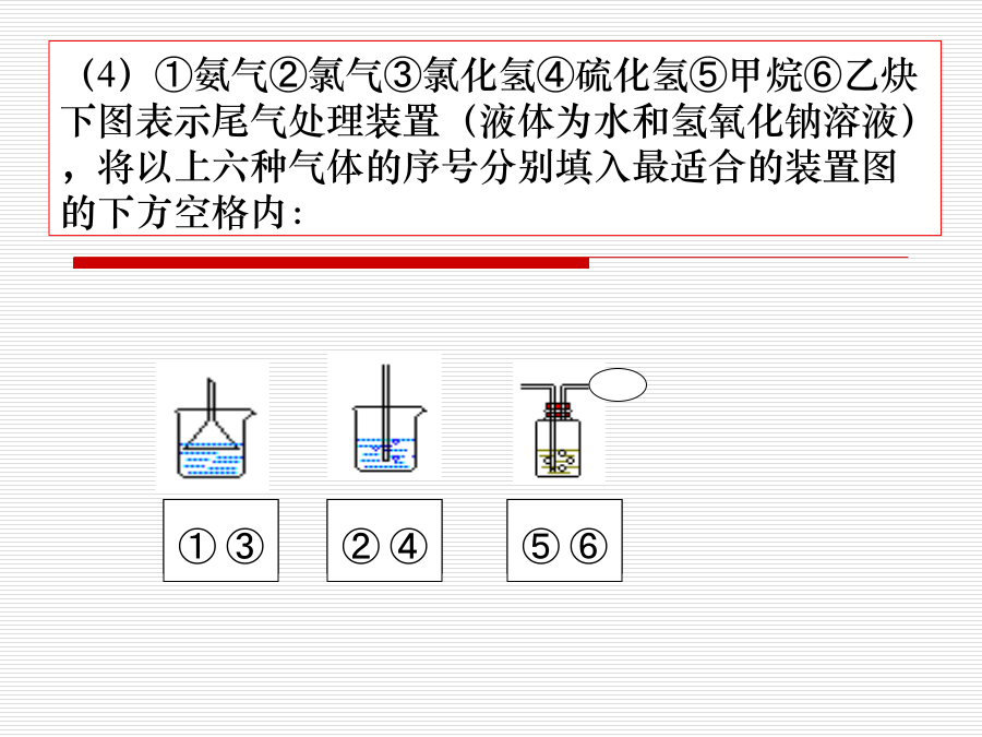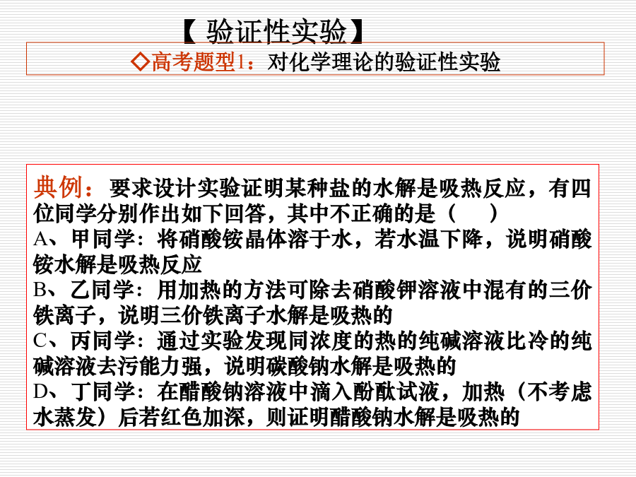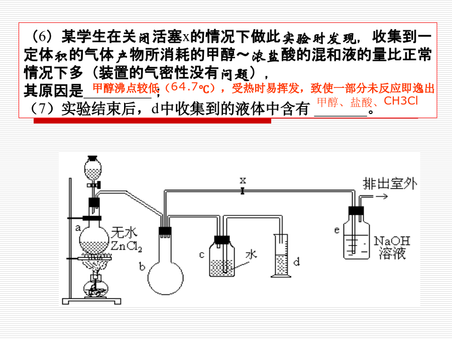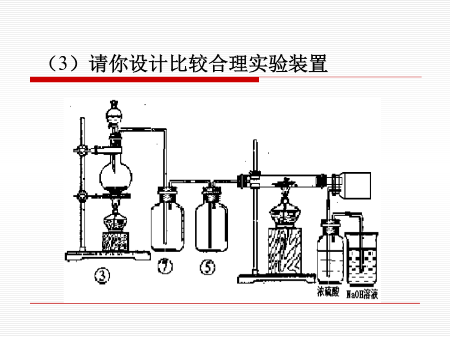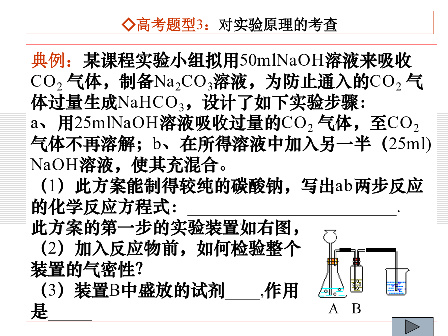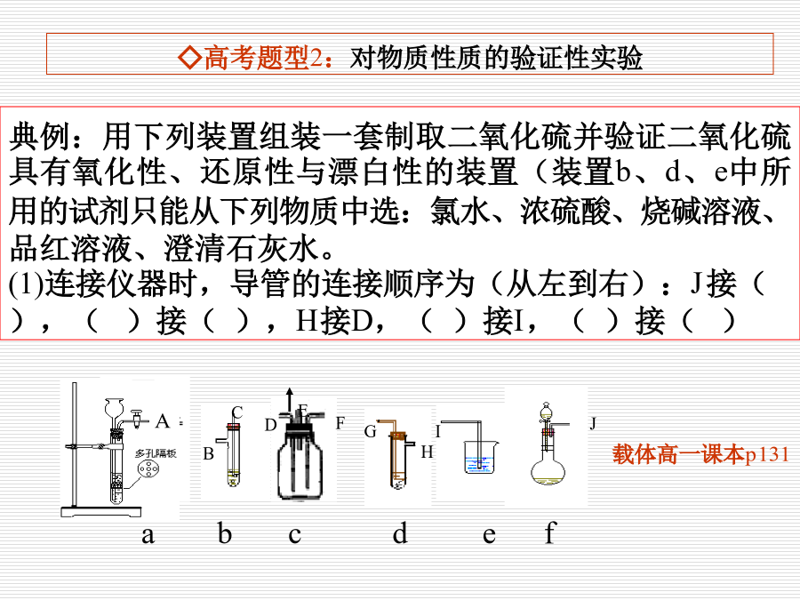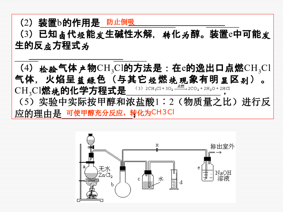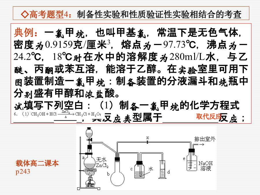 2008高考实验猜想(3)请你设计比较合理实验装置◇高考题型3:对实验原理的考查(4)①氨气②氯气③氯化氢④硫化氢⑤甲烷⑥乙炔下图表示尾气处理装置(液体为水和氢氧化钠溶液),将以上六种气体的序号分别填入最适合的装置图的下方空格内:(5)已知用的氢氧化钠溶液中的溶质的质量分数为40%,室温下该反应前后溶液的体积不变,不考虑实验误差,计算用此种方法制备所得碳酸钠溶液的物质的量的浓度为_____.(6)若实验得到的碳酸钠溶液浓度偏低,在上述实验操作中,产生实验误差的原因:________________.典例:一氯甲烷,也叫甲基氯,常温下是无色气体,密度为0.9159克/厘米3,熔点为-97.73℃,沸点为-24.2℃,18℃时在水中的溶解度为280ml/L水,与乙醚、丙酮或苯互溶,能溶于乙醇。在实验室里可用下图装置制造一氯甲烷:制备装置的分液漏斗和烧瓶中分别盛有甲醇和浓盐酸。试填写下列空白:(1)制备一氯甲烷的化学方程式_________,其反应类型属于___________反应;(2)装置b的作用是_______________________(3)已知卤代烃能发生碱性水解,转化为醇。装置e中可能发生的反应方程式为____________(4)检验气体产物CH3Cl的方法是:在e的逸出口点燃CH3Cl气体,火焰呈蓝绿色(与其它烃燃烧现象有明显区别)。CH3Cl燃烧的化学方程式是____________________;(5)实验中实际按甲醇和浓盐酸1︰2(物质量之比)进行反应的理由是_______________;(6)某学生在关闭活塞x的情况下做此实验时发现,收集到一定体积的气体产物所消耗的甲醇~浓盐酸的混和液的量比正常情况下多(装置的气密性没有问题),其原因是_________;(7)实验结束后,d中收集到的液体中含有_______。【验证性实验】◇高考题型2:对物质性质的验证性实验J◇高考题型3:对反应结果的验证性实验(3)若A为浓盐酸,B为KMnO4,C中盛有KI淀粉溶液,旋开E后,C中的现象是;继续通气体于C中,足够长的时间后,发现C中溶液的颜色消失,这是因为在溶液中I2能被Cl2氧化为HIO3,写出该反应的化学方程式。(4)若A为浓氨水,B为生石灰,C中盛有AlCl3溶液,旋开E,足够长的时间后,C中的现象是,C中发生反应的方程式为。(5)该题图示装置有多种用途,请举一例(除题中之外)填空:A为,B为;C中盛,其目的为。◇高考题型3:模拟化工生产的验证性实验(1)如何检查用塞子(插有导管和仪器d)塞紧的e(未与瓷管连接)的气密性。(2)如果导入装置里的CO2没有干燥,就会发生副反应,该反应的化学方程式。(3)瓷管两端的塞子,适宜于选用作材料最佳,其理由是。A.橡皮B.石棉C.玻璃D.软木△(4)反应过程中,不断通入CO2主要起了两个作用:①是;②是。(5)根据反应方程式:2Fe+3Br2====2FeBr32FeBr3====2FeBr2+Br2↑求得这次实验中FeBr2的产率是。(6)为了防止污染空气,在装置最后应1)关闭d的活塞,夹紧C,D间的胶管,将F的出口导管插入水中,用手捂住D,F的导管处有气泡冒出,松开手后水在导管中形成一段水柱,则证明D的气密性良好(即不漏气)(2)3Fe+4H2OFe3O4+4H2↑(3)B处应设置盛有NaHCO3饱和溶液的洗气瓶,C处应设置盛有浓H2SO4的洗气瓶(4)因Br2会腐蚀橡胶塞(5)①将容器中的空气赶净,②将Br2蒸气带入反应器D中(6)37.04%(6)NaOH溶液【应用性实验】合金4.(1)烧杯、漏斗、玻璃棒(2)AlO2-+CO2+2H2O=Al(OH)3↓+HCO3-(3)途径Ⅱ因为滤液A是NaAlO2和NaOH溶液,按途径Ⅰ直接向A中加入盐酸得到的AlCl3溶液中含有大量的NaCl杂质;按途径Ⅱ,通入CO2气体,得Al(OH)3沉淀,将Al(OH)3溶解于盐酸中得到的是纯净的AlCl3溶液。所以途径Ⅱ更合理。(4)蒸发浓缩、冷却结晶(5)Cu+H2O2+H2SO4+3H2O=CuSO4·5H2O或Cu+H2O2+H2SO4=CuSO4+2H2O(6)不合理因为该方案操作步骤多、时间长,消耗试剂量更大。◇高考题型1:对实验装置的设计评价◇高考题型2:对化学实验方案的设计评价.(12分)①具有酸性(1分)用玻璃棒蘸甲酸溶液点在pH试纸上,并与标准比色卡对比;或答:向盛有少量碳酸钠粉末的试管里,加入约3mL甲酸溶液,观察现象(3分)②具有还原性(1分)在试管里加入约2mL新制的浊液,振荡后加入少量甲酸溶液,加热至沸腾,观察现象;或答:在洁净的试管里加入2~3mL的银氨溶液,再滴入几滴甲酸,振荡后把试管放在热水