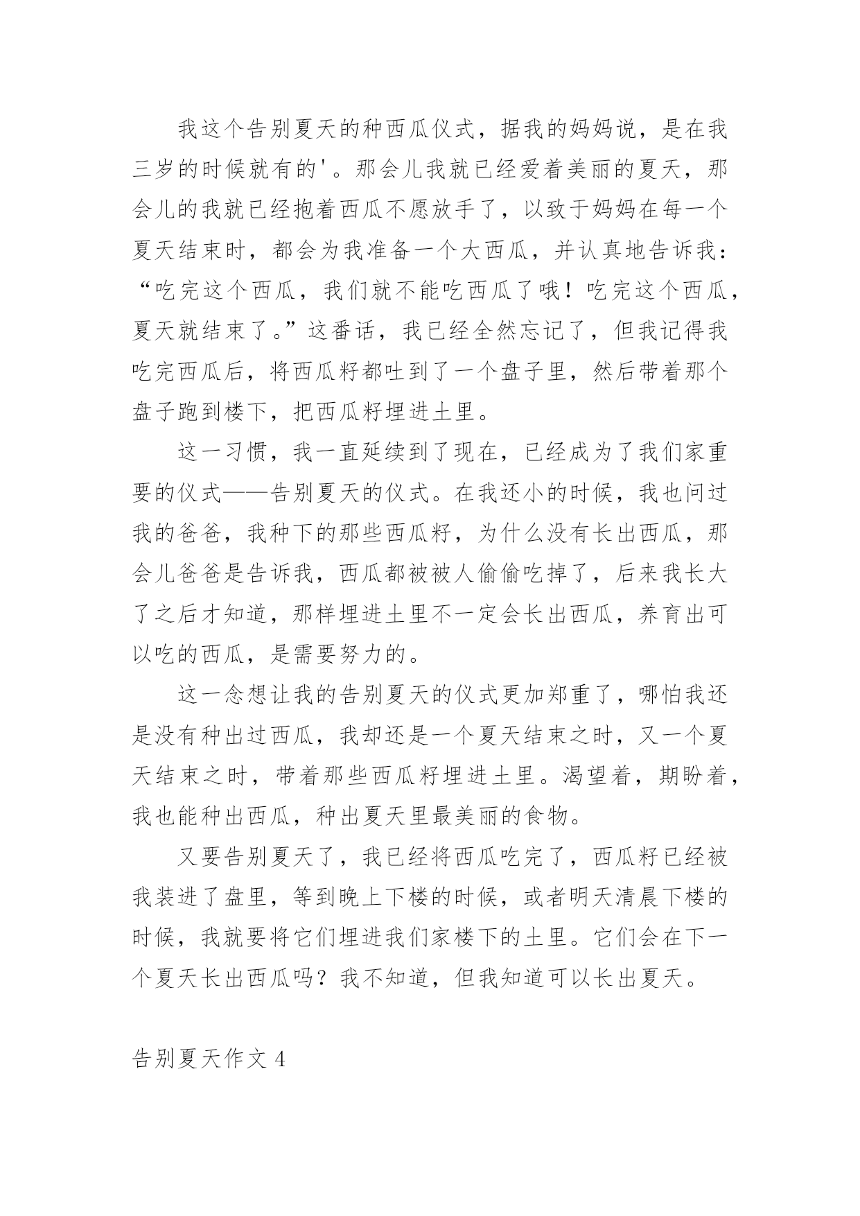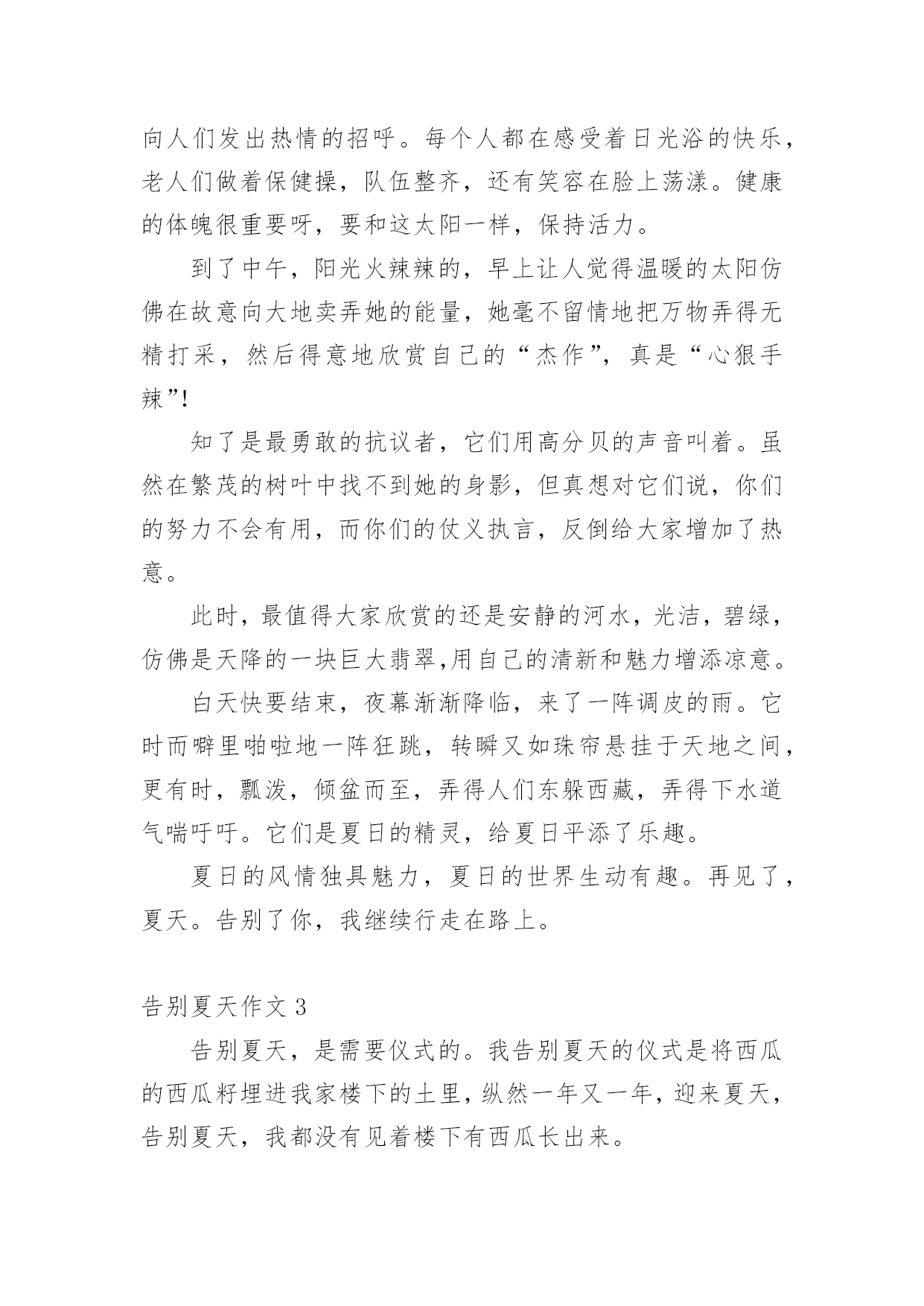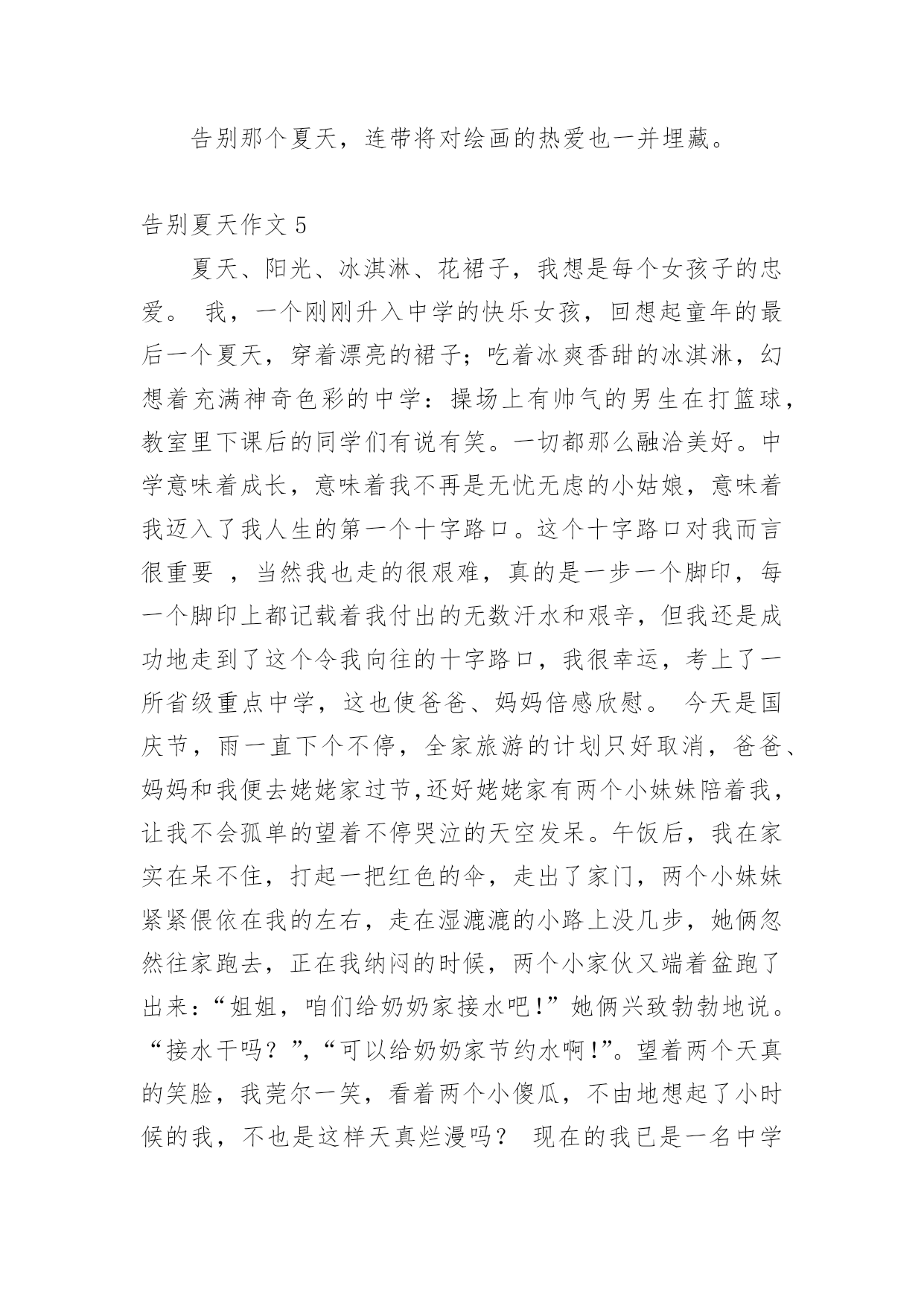 告别夏天作文告别夏天作文集锦5篇在学习、工作或生活中,大家都有写作文的经历,对作文很是熟悉吧,作文一定要做到主题集中,围绕同一主题作深入阐述,切忌东拉西扯,主题涣散甚至无主题。那么你知道一篇好的作文该怎么写吗?以下是小编整理的告别夏天作文,欢迎阅读,希望大家能够喜欢。告别夏天作文1回想起童年的最后一个夏天,穿着漂亮的裙子;吃着冰爽香甜的冰淇淋,幻想着充满神奇色彩的中学:体育场上有帅气的男生在打篮球,教室里下课后的同学们有说有笑。一切都那么融洽美好。六年级意味着成长,意味着我不再是无忧无虑的小姑娘,意味着我迈入了我人生的第一个十字路口。这个十字路口对我而言很重要?,当然我也走的很艰难,真的是一步一个脚印,每一个脚印上都记载着我付出的无数汗水和艰辛,但我还是成功地走到了这个令我向往的十字路口。今天是国庆节,雨一直下个不停,全家旅游的计划只好取消,爸爸、妈妈和我便去姥姥家过节,还好姥姥家有两个小妹妹陪着我,让我不会孤单的望着不停哭泣的天空发呆。午饭后,我在家实在呆不住,打起一把红色的伞,走出了家,两个小妹妹紧紧偎依在我的左右,走在湿漉漉的小路上没几步,她俩忽然往家跑去,正在我纳闷的时候,两个小家伙又端着盆跑了出来:“姐姐,咱们给奶奶家接水吧!”她俩兴致勃勃地说。“接水干吗?”,“可以给奶奶家节约水啊!”。望着两个天真的笑脸,我莞尔一笑,看着两个小傻瓜,不由地想起了小时候的我,不也是这样天真烂漫吗?现在的我已是一名六年级学生了,不会再为一点小事向爸爸、妈妈发脾气,懂得了在餐桌上把好吃的东西先夹给长辈吃,照顾好小妹妹;放学后去同学家玩,先给家里打一个电话,向父母报声平安;领会了父母为我所献出的那份爱是多么无私,我只有倍加努力学习,才能报答他们……一阵冷风袭来,我不禁打了一个寒颤。啊!秋天来了,告别夏天,我长大了。告别夏天作文2走在路上,有时你必须舍弃些什么,才能走得更加轻松,走得更远。为了心中不变的理想,对自己永恒的眷恋说声再见,纵使心中有太多不舍,也都释怀了。再见了,夏天。尽管夏天不是我最钟爱的季节,但对夏天总有那么一点眷恋,对夏天的悄然离去,总有些不舍。夏天是一个好季节。虽然没有春天的生机勃勃,令人萌生希望。没有秋天的硕果累累,使人满怀喜悦。也没有冬天的’银装素裹,催人积蓄能量。但它情趣盎然,叫人充满遐想。夏天有着自己的风格,每一片夏日风情都给人带来无尽的想象,顿觉身心愉悦。夏天的早晨,灿烂的阳光照在每一个人的脸上,身上。向人们发出热情的招呼。每个人都在感受着日光浴的快乐,老人们做着保健操,队伍整齐,还有笑容在脸上荡漾。健康的体魄很重要呀,要和这太阳一样,保持活力。到了中午,阳光火辣辣的,早上让人觉得温暖的太阳仿佛在故意向大地卖弄她的能量,她毫不留情地把万物弄得无精打采,然后得意地欣赏自己的“杰作”,真是“心狠手辣”!知了是最勇敢的抗议者,它们用高分贝的声音叫着。虽然在繁茂的树叶中找不到她的身影,但真想对它们说,你们的努力不会有用,而你们的仗义执言,反倒给大家增加了热意。此时,最值得大家欣赏的还是安静的河水,光洁,碧绿,仿佛是天降的一块巨大翡翠,用自己的清新和魅力增添凉意。白天快要结束,夜幕渐渐降临,来了一阵调皮的雨。它时而噼里啪啦地一阵狂跳,转瞬又如珠帘悬挂于天地之间,更有时,瓢泼,倾盆而至,弄得人们东躲西藏,弄得下水道气喘吁吁。它们是夏日的精灵,给夏日平添了乐趣。夏日的风情独具魅力,夏日的世界生动有趣。再见了,夏天。告别了你,我继续行走在路上。告别夏天作文3告别夏天,是需要仪式的。我告别夏天的仪式是将西瓜的西瓜籽埋进我家楼下的土里,纵然一年又一年,迎来夏天,告别夏天,我都没有见着楼下有西瓜长出来。我这个告别夏天的种西瓜仪式,据我的妈妈说,是在我三岁的时候就有的'。那会儿我就已经爱着美丽的夏天,那会儿的我就已经抱着西瓜不愿放手了,以致于妈妈在每一个夏天结束时,都会为我准备一个大西瓜,并认真地告诉我:“吃完这个西瓜,我们就不能吃西瓜了哦!吃完这个西瓜,夏天就结束了。”这番话,我已经全然忘记了,但我记得我吃完西瓜后,将西瓜籽都吐到了一个盘子里,然后带着那个盘子跑到楼下,把西瓜籽埋进土里。这一习惯,我一直延续到了现在,已经成为了我们家重要的仪式——告别夏天的仪式。在我还小的时候,我也问过我的爸爸,我种下的那些西瓜籽,为什么没有长出西瓜,那会儿爸爸是告诉我,西瓜都被被人偷偷吃掉了,后来我长大了之后才知道,那样埋进土里不一定会长出西瓜,养育出可以吃的西瓜,是需要努力的。这一念想让我的告别夏天的仪式更加郑重了,哪怕我还是没有种出过西瓜,我却还是一个夏天结束之时,又一个夏天结束之时,带着那些西瓜籽埋进土里。渴望着,期盼着,我也能种出西瓜,种出夏天里最美丽的食物。又要告别夏天了,我已经将西瓜吃完了,西瓜籽已经被我装进了盘里,等到晚上下楼的时候
