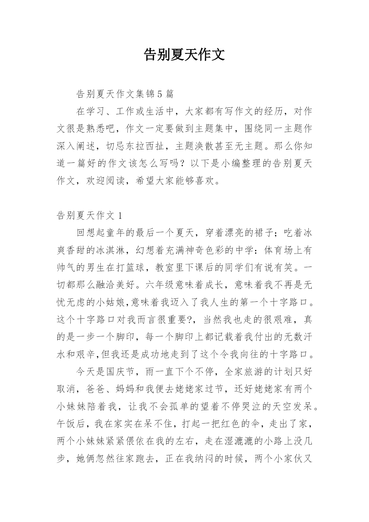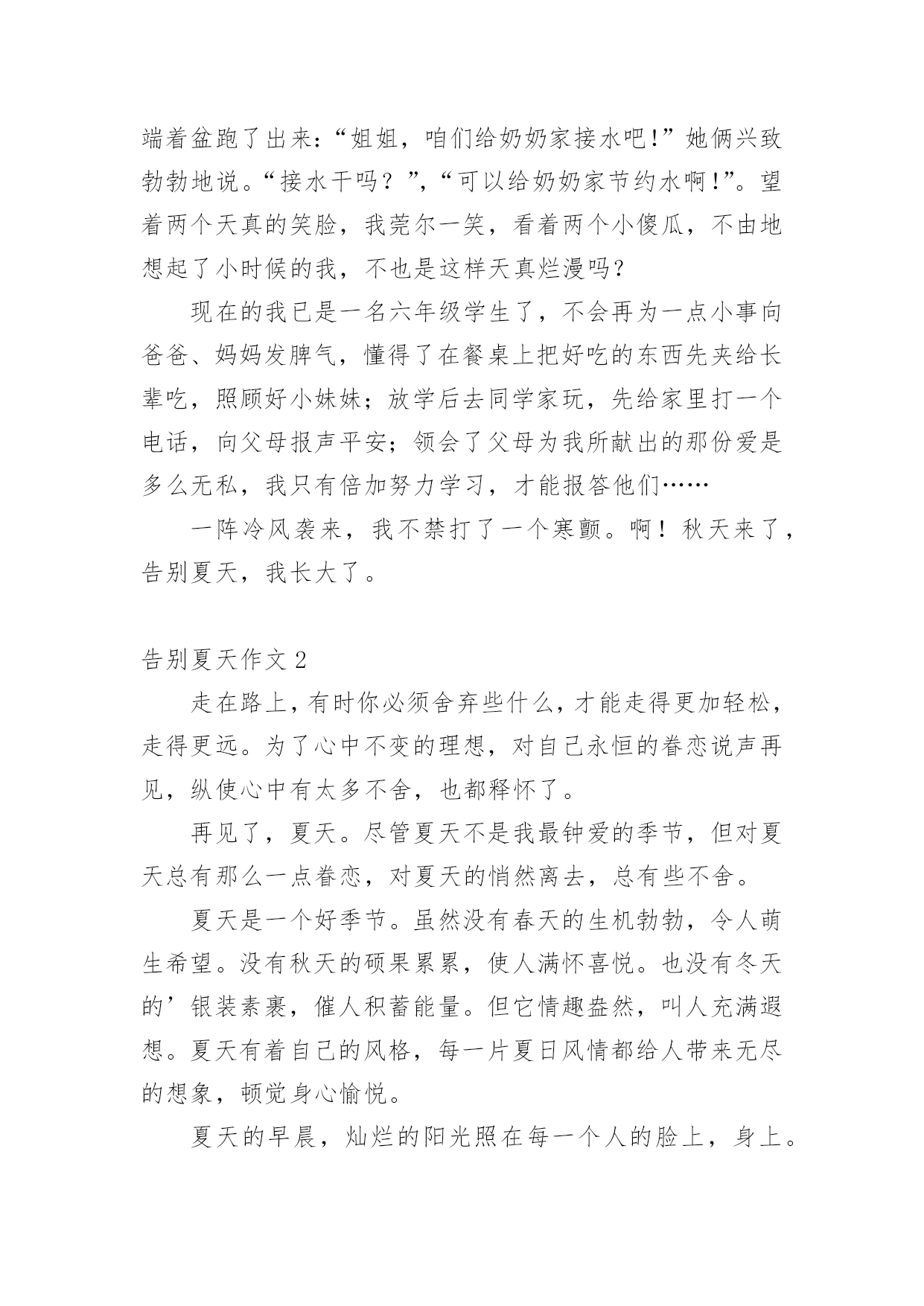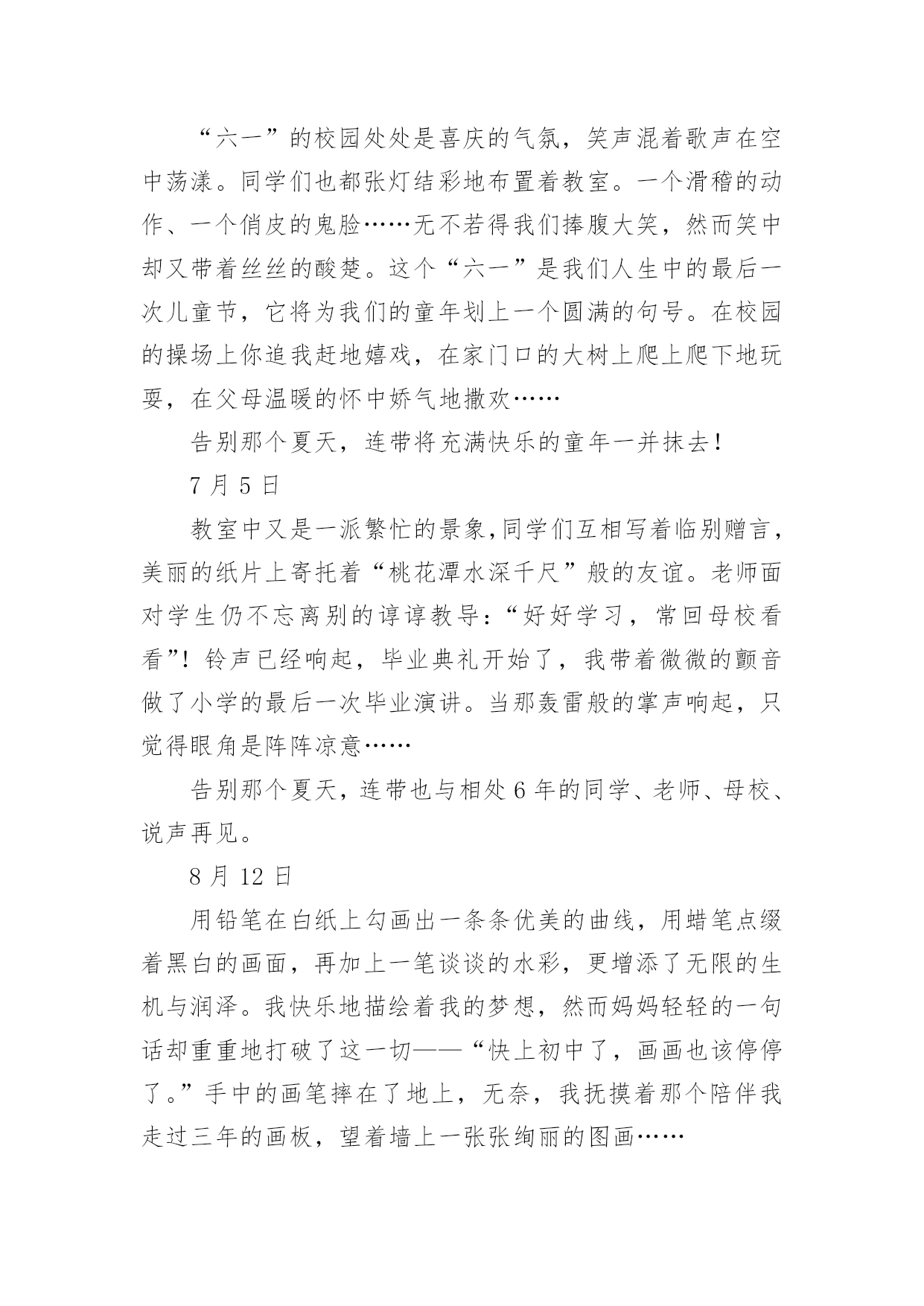 告别夏天作文告别夏天作文集锦5篇在学习、工作或生活中,大家都有写作文的经历,对作文很是熟悉吧,作文一定要做到主题集中,围绕同一主题作深入阐述,切忌东拉西扯,主题涣散甚至无主题。那么你知道一篇好的作文该怎么写吗?以下是小编整理的告别夏天作文,欢迎阅读,希望大家能够喜欢。告别夏天作文1回想起童年的最后一个夏天,穿着漂亮的裙子;吃着冰爽香甜的冰淇淋,幻想着充满神奇色彩的中学:体育场上有帅气的男生在打篮球,教室里下课后的同学们有说有笑。一切都那么融洽美好。六年级意味着成长,意味着我不再是无忧无虑的小姑娘,意味着我迈入了我人生的第一个十字路口。这个十字路口对我而言很重要?,当然我也走的很艰难,真的是一步一个脚印,每一个脚印上都记载着我付出的无数汗水和艰辛,但我还是成功地走到了这个令我向往的十字路口。今天是国庆节,雨一直下个不停,全家旅游的计划只好取消,爸爸、妈妈和我便去姥姥家过节,还好姥姥家有两个小妹妹陪着我,让我不会孤单的望着不停哭泣的天空发呆。午饭后,我在家实在呆不住,打起一把红色的伞,走出了家,两个小妹妹紧紧偎依在我的左右,走在湿漉漉的小路上没几步,她俩忽然往家跑去,正在我纳闷的时候,两个小家伙又端着盆跑了出来:“姐姐,咱们给奶奶家接水吧!”她俩兴致勃勃地说。“接水干吗?”,“可以给奶奶家节约水啊!”。望着两个天真的笑脸,我莞尔一笑,看着两个小傻瓜,不由地想起了小时候的我,不也是这样天真烂漫吗?现在的我已是一名六年级学生了,不会再为一点小事向爸爸、妈妈发脾气,懂得了在餐桌上把好吃的东西先夹给长辈吃,照顾好小妹妹;放学后去同学家玩,先给家里打一个电话,向父母报声平安;领会了父母为我所献出的那份爱是多么无私,我只有倍加努力学习,才能报答他们……一阵冷风袭来,我不禁打了一个寒颤。啊!秋天来了,告别夏天,我长大了。告别夏天作文2走在路上,有时你必须舍弃些什么,才能走得更加轻松,走得更远。为了心中不变的理想,对自己永恒的眷恋说声再见,纵使心中有太多不舍,也都释怀了。再见了,夏天。尽管夏天不是我最钟爱的季节,但对夏天总有那么一点眷恋,对夏天的悄然离去,总有些不舍。夏天是一个好季节。虽然没有春天的生机勃勃,令人萌生希望。没有秋天的硕果累累,使人满怀喜悦。也没有冬天的’银装素裹,催人积蓄能量。但它情趣盎然,叫人充满遐想。夏天有着自己的风格,每一片夏日风情都给人带来无尽的想象,顿觉身心愉悦。夏天的早晨,灿烂的阳光照在每一个人的脸上,身上。向人们发出热情的招呼。每个人都在感受着日光浴的快乐,老人们做着保健操,队伍整齐,还有笑容在脸上荡漾。健康的体魄很重要呀,要和这太阳一样,保持活力。到了中午,阳光火辣辣的,早上让人觉得温暖的太阳仿佛在故意向大地卖弄她的能量,她毫不留情地把万物弄得无精打采,然后得意地欣赏自己的“杰作”,真是“心狠手辣”!知了是最勇敢的抗议者,它们用高分贝的声音叫着。虽然在繁茂的树叶中找不到她的身影,但真想对它们说,你们的努力不会有用,而你们的仗义执言,反倒给大家增加了热意。此时,最值得大家欣赏的还是安静的河水,光洁,碧绿,仿佛是天降的一块巨大翡翠,用自己的清新和魅力增添凉意。白天快要结束,夜幕渐渐降临,来了一阵调皮的雨。它时而噼里啪啦地一阵狂跳,转瞬又如珠帘悬挂于天地之间,更有时,瓢泼,倾盆而至,弄得人们东躲西藏,弄得下水道气喘吁吁。它们是夏日的精灵,给夏日平添了乐趣。夏日的风情独具魅力,夏日的世界生动有趣。再见了,夏天。告别了你,我继续行走在路上。告别夏天作文3告别夏天,是需要仪式的。我告别夏天的仪式是将西瓜的西瓜籽埋进我家楼下的土里,纵然一年又一年,迎来夏天,告别夏天,我都没有见着楼下有西瓜长出来。我这个告别夏天的种西瓜仪式,据我的妈妈说,是在我三岁的时候就有的'。那会儿我就已经爱着美丽的夏天,那会儿的我就已经抱着西瓜不愿放手了,以致于妈妈在每一个夏天结束时,都会为我准备一个大西瓜,并认真地告诉我:“吃完这个西瓜,我们就不能吃西瓜了哦!吃完这个西瓜,夏天就结束了。”这番话,我已经全然忘记了,但我记得我吃完西瓜后,将西瓜籽都吐到了一个盘子里,然后带着那个盘子跑到楼下,把西瓜籽埋进土里。这一习惯,我一直延续到了现在,已经成为了我们家重要的仪式——告别夏天的仪式。在我还小的时候,我也问过我的爸爸,我种下的那些西瓜籽,为什么没有长出西瓜,那会儿爸爸是告诉我,西瓜都被被人偷偷吃掉了,后来我长大了之后才知道,那样埋进土里不一定会长出西瓜,养育出可以吃的西瓜,是需要努力的。这一念想让我的告别夏天的仪式更加郑重了,哪怕我还是没有种出过西瓜,我却还是一个夏天结束之时,又一个夏天结束之时,带着那些西瓜籽埋进土里。渴望着,期盼着,我也能种出西瓜,种出夏天里最美丽的食物。又要告别夏天了,我已经将西瓜吃完了,西瓜籽已经被我装进了盘里,等到晚上下楼的时候