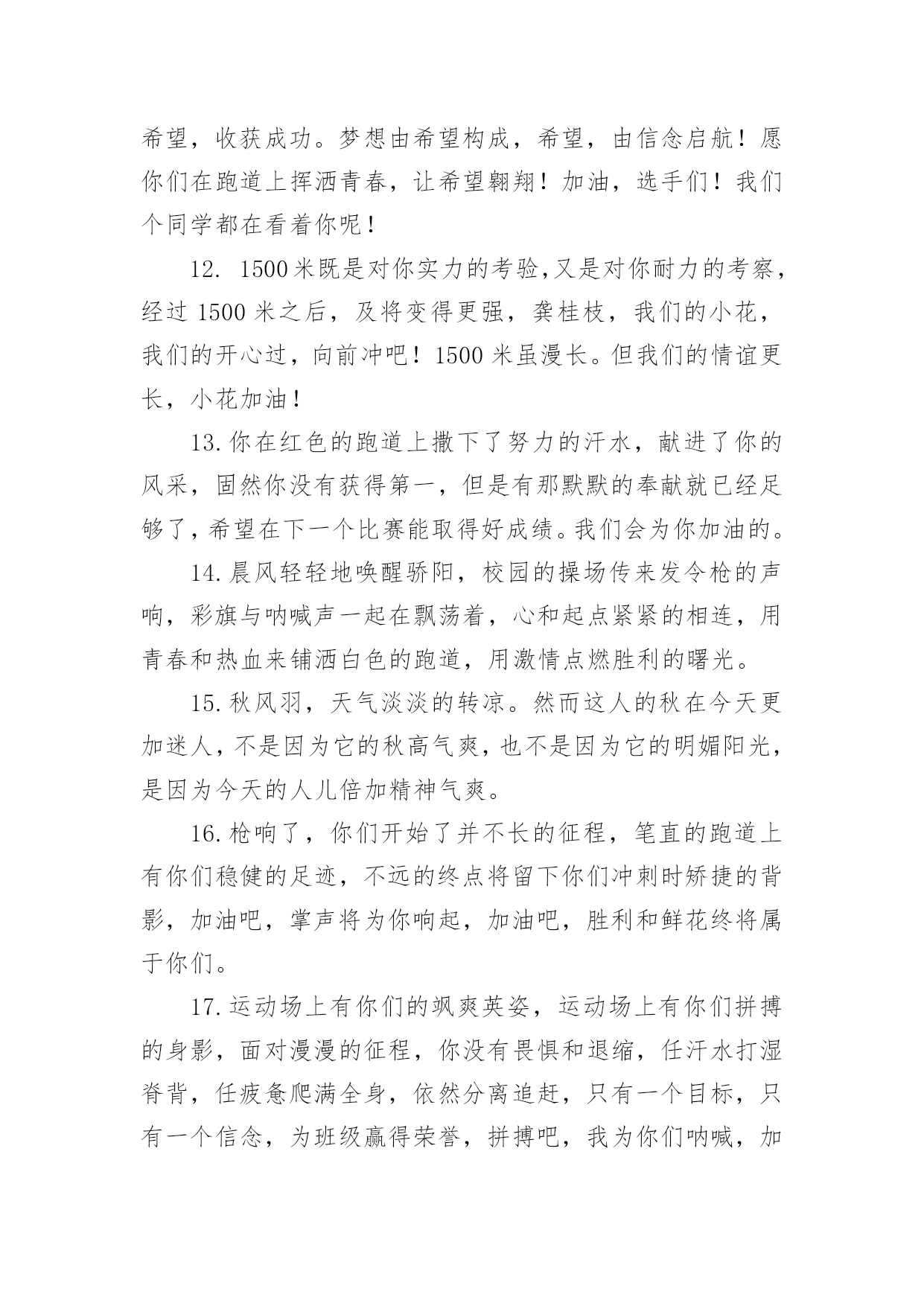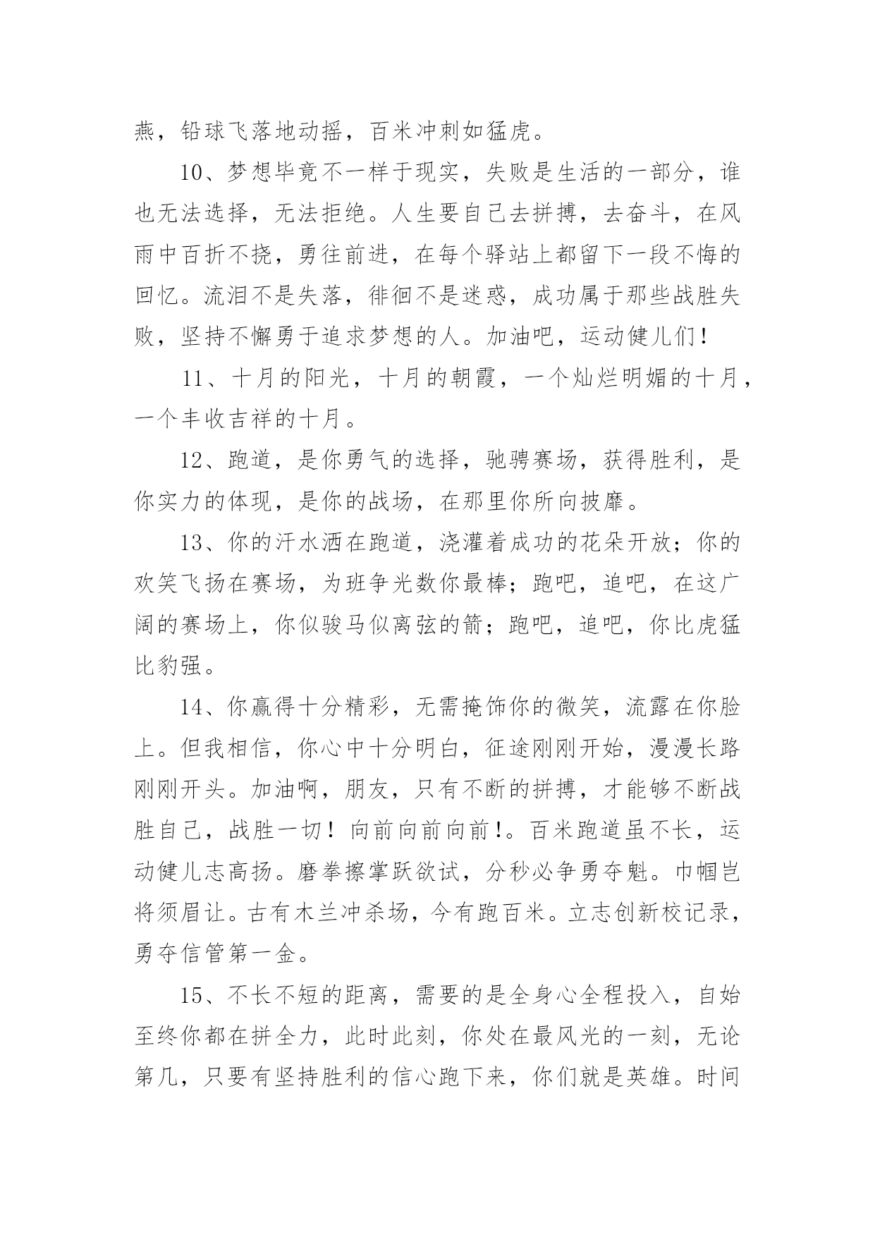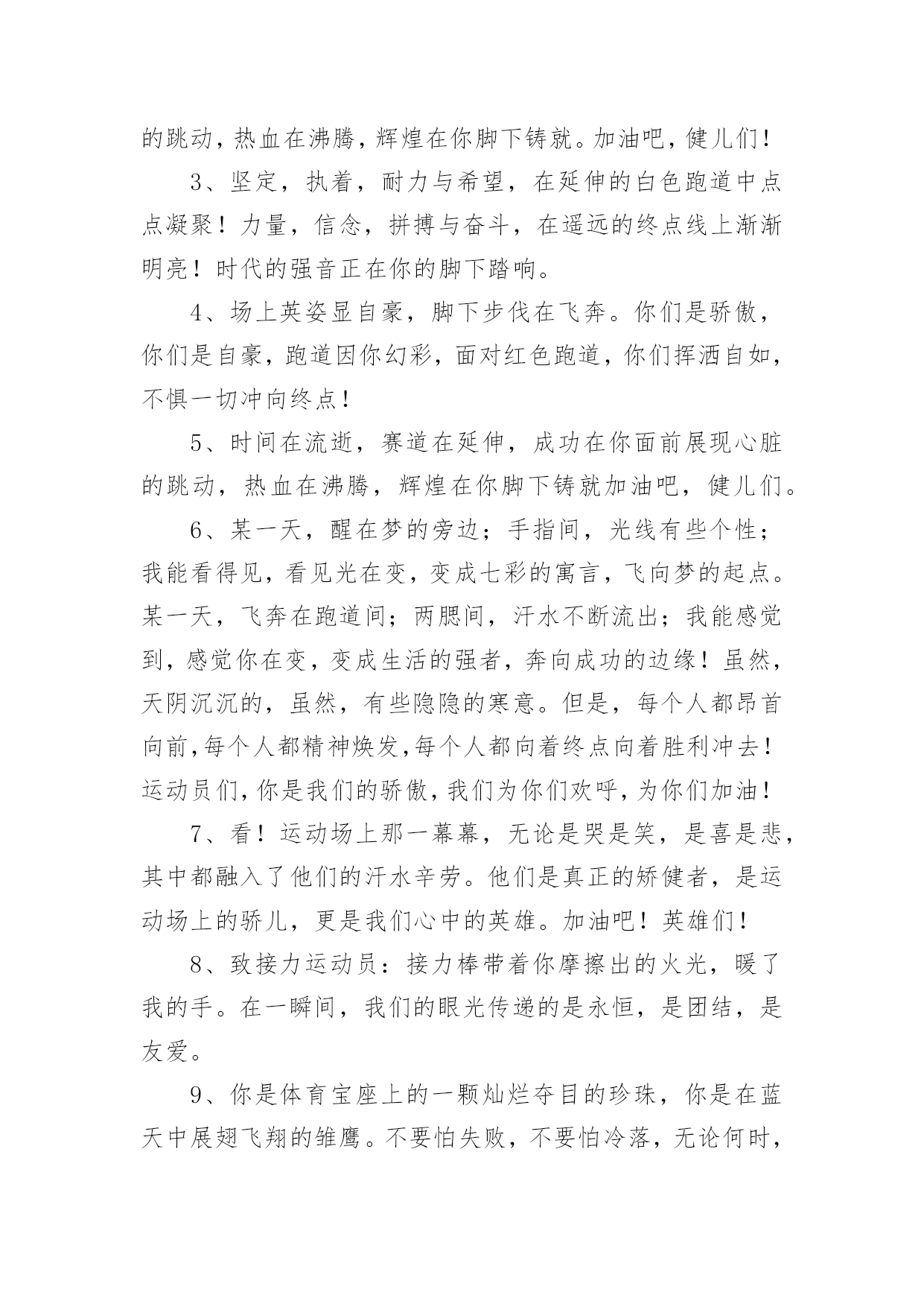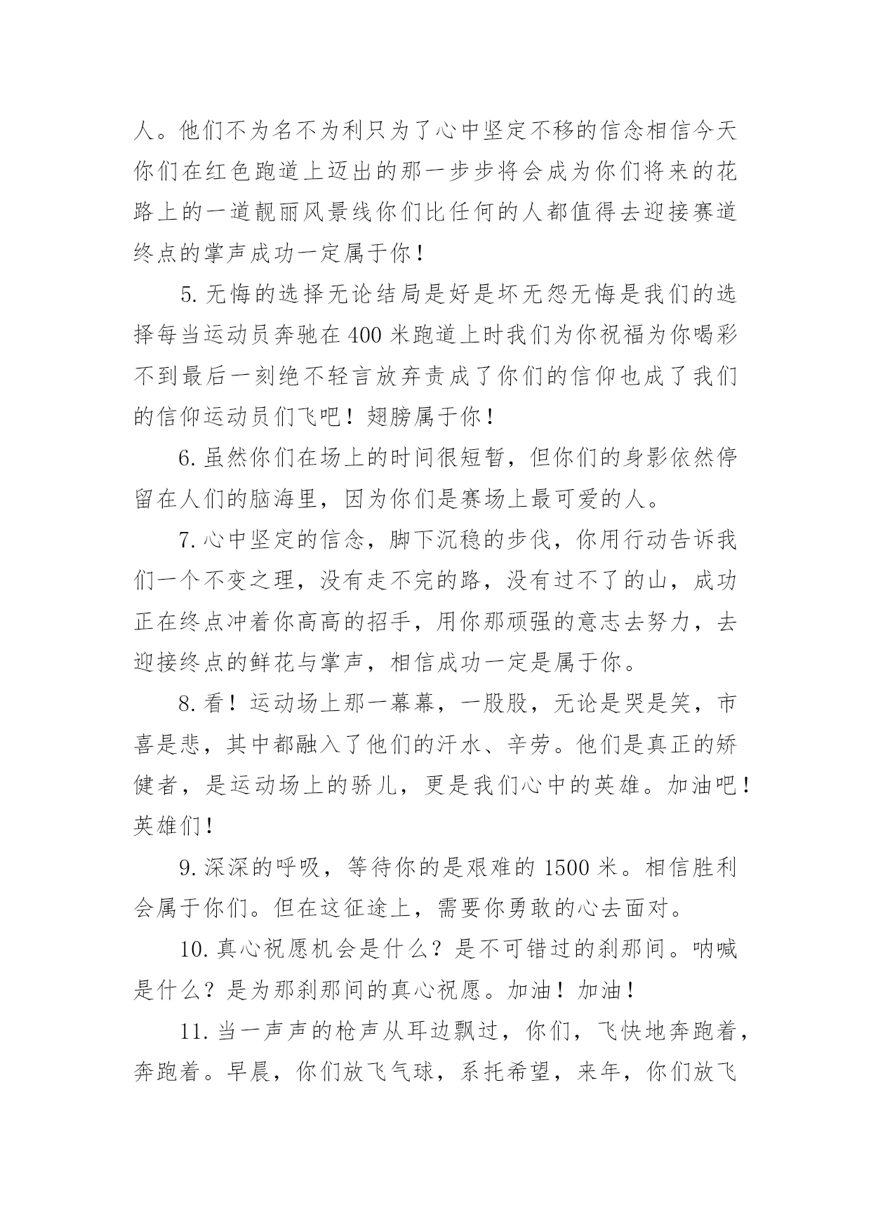 运动会加油稿运动会加油稿14篇随着社会不断地进步,需要使用加油稿的场合越来越多,适当使用加油稿可以给对方打气加油。那么你有了解过加油稿吗?下面是小编精心整理的运动会加油稿,欢迎大家借鉴与参考,希望对大家有所帮助。运动会加油稿篇11.秋风羽,天气淡淡的转凉。然而这人的秋在今天更加迷人,不是因为它的秋高气爽,也不是因为它的明媚阳光,是因为今天的人儿倍加精神气爽。看!运动场上那一幕幕,一股股,无论是哭是笑,市喜是悲,其中都融入了他们的汗水、辛劳。他们是真正的矫健者,是运动场上的骄儿,更是我们心中的英雄。加油吧!英雄们。2.年轻的我们自信飞扬,青春的气息和同出生的朝阳,蓬勃的力量如同阳光的挥洒,此时此刻,跑道便是我们精彩的舞台,声声加油是我们最高的奖项,论和成功,谈何荣辱,心中的信念只有一个,拼搏!挡不住您们破竹的锐气!3.体育是一种文化,是一种坚持,发扬体育文化,爱护自己的健康。致亲爱的跳高运动员:你的高度,跳出了飞扬,你的跳跃,飞出了优美。在阳光的照耀下,显得是那么的光芒万丈,你是那么的伟大。4.爱拼才会赢!运动健儿们都是今天最值得被夸奖的人。他们不为名不为利只为了心中坚定不移的信念相信今天你们在红色跑道上迈出的那一步步将会成为你们将来的花路上的一道靓丽风景线你们比任何的人都值得去迎接赛道终点的掌声成功一定属于你!5.无悔的选择无论结局是好是坏无怨无悔是我们的选择每当运动员奔驰在400米跑道上时我们为你祝福为你喝彩不到最后一刻绝不轻言放弃责成了你们的信仰也成了我们的信仰运动员们飞吧!翅膀属于你!6.虽然你们在场上的时间很短暂,但你们的身影依然停留在人们的脑海里,因为你们是赛场上最可爱的人。7.心中坚定的信念,脚下沉稳的步伐,你用行动告诉我们一个不变之理,没有走不完的路,没有过不了的山,成功正在终点冲着你高高的招手,用你那顽强的意志去努力,去迎接终点的鲜花与掌声,相信成功一定是属于你。8.看!运动场上那一幕幕,一股股,无论是哭是笑,市喜是悲,其中都融入了他们的汗水、辛劳。他们是真正的矫健者,是运动场上的骄儿,更是我们心中的英雄。加油吧!英雄们!9.深深的呼吸,等待你的是艰难的1500米。相信胜利会属于你们。但在这征途上,需要你勇敢的心去面对。10.真心祝愿机会是什么?是不可错过的刹那间。呐喊是什么?是为那刹那间的真心祝愿。加油!加油!11.当一声声的枪声从耳边飘过,你们,飞快地奔跑着,奔跑着。早晨,你们放飞气球,系托希望,来年,你们放飞希望,收获成功。梦想由希望构成,希望,由信念启航!愿你们在跑道上挥洒青春,让希望翱翔!加油,选手们!我们个同学都在看着你呢!12.1500米既是对你实力的考验,又是对你耐力的考察,经过1500米之后,及将变得更强,龚桂枝,我们的小花,我们的开心过,向前冲吧!1500米虽漫长。但我们的情谊更长,小花加油!13.你在红色的跑道上撒下了努力的汗水,献进了你的风采,固然你没有获得第一,但是有那默默的奉献就已经足够了,希望在下一个比赛能取得好成绩。我们会为你加油的。14.晨风轻轻地唤醒骄阳,校园的操场传来发令枪的声响,彩旗与呐喊声一起在飘荡着,心和起点紧紧的相连,用青春和热血来铺洒白色的跑道,用激情点燃胜利的曙光。15.秋风羽,天气淡淡的转凉。然而这人的秋在今天更加迷人,不是因为它的秋高气爽,也不是因为它的明媚阳光,是因为今天的人儿倍加精神气爽。16.枪响了,你们开始了并不长的征程,笔直的跑道上有你们稳健的足迹,不远的终点将留下你们冲刺时矫捷的背影,加油吧,掌声将为你响起,加油吧,胜利和鲜花终将属于你们。17.运动场上有你们的飒爽英姿,运动场上有你们拼搏的身影,面对漫漫的征程,你没有畏惧和退缩,任汗水打湿脊背,任疲惫爬满全身,依然分离追赶,只有一个目标,只有一个信念,为班级赢得荣誉,拼搏吧,我为你们呐喊,加油!18.看!那一面面迎风飘舞的彩旗,是一朵朵盛开的鲜花;听!那一阵阵惊天动地的欢呼,是回响在耳边胜利的风声。19.超越对手,更要超越自我,追求卓越是我们的目标,是我们的信念,在清爽的秋季,在喧嚣的赛场,你们点燃了似火的热情,无论成败,你们永远是我们的骄傲,我们都为你们感到自豪!20.致200米运动员:在这200米跑道上,运动健儿们挥洒着他们的汗水,坚持不懈地向着目标冲刺,他们仿佛不知疲惫,他们的心中只有一个信念——终点,只有到达了终点,之前所有的努力和汗水才会显得有价值。所以,奔跑吧,运动健儿们!让我们一起为运动健儿们呐喊吧,让我们以他们为荣吧!运动会加油稿篇21、运动健将们,用你的实力,用你的精神,去开拓出,一片属于你的长跑天地!2、你是否感到,烈日的照射那是烈日对你的祝福;你是否感到,彩旗的摇摆那是彩旗对你的呐喊人们的注视那是人们对你的希望,祝福在你身边呐喊在你耳边希望在你心中。的健儿,愿你们一展雄