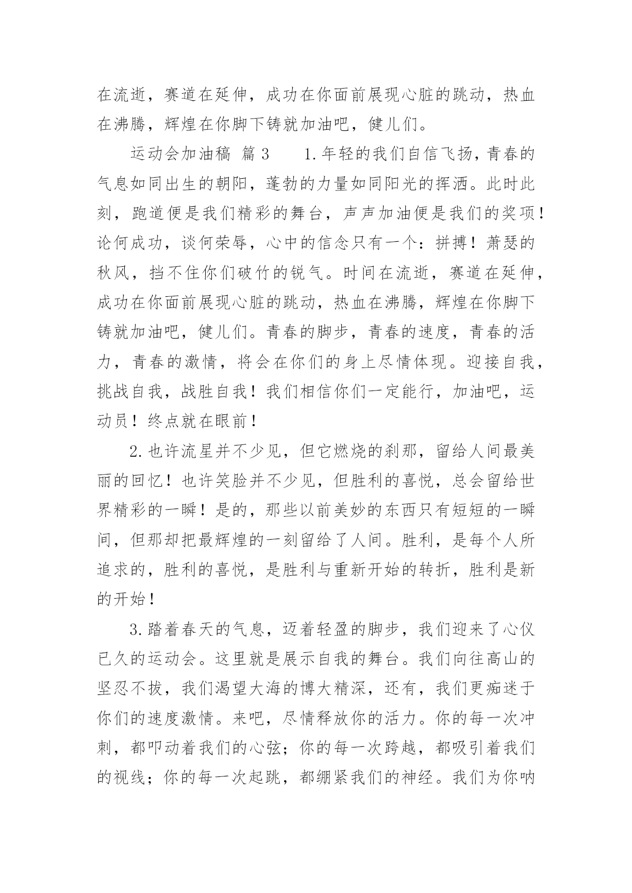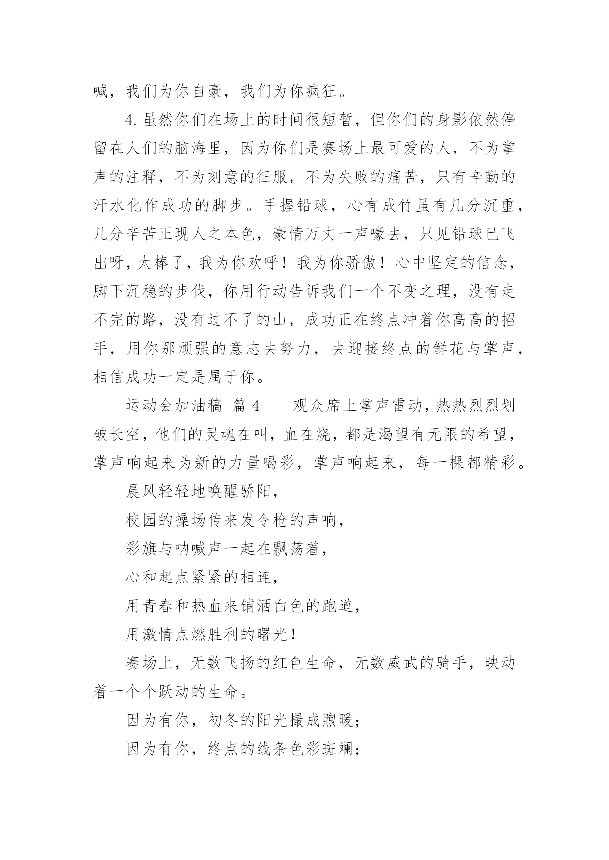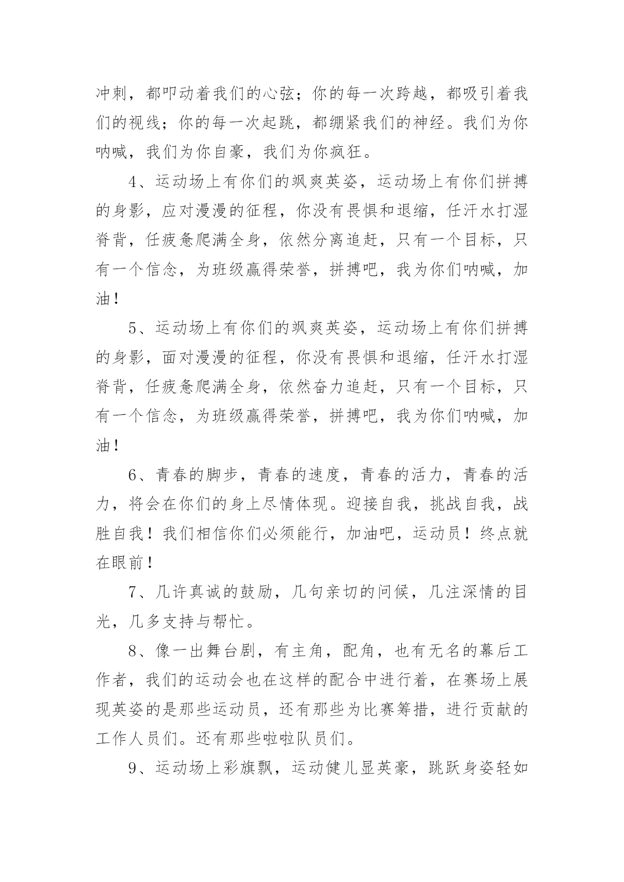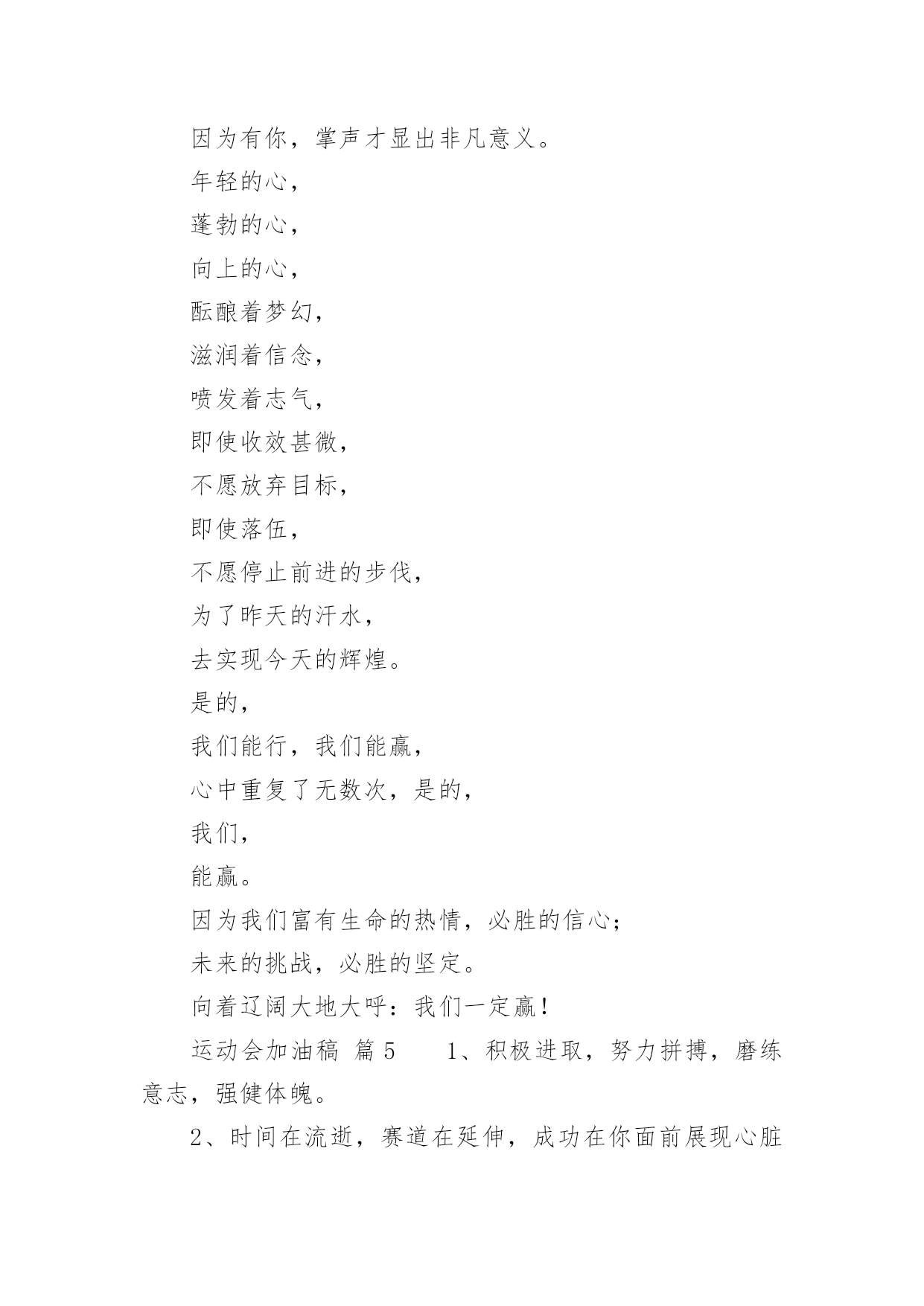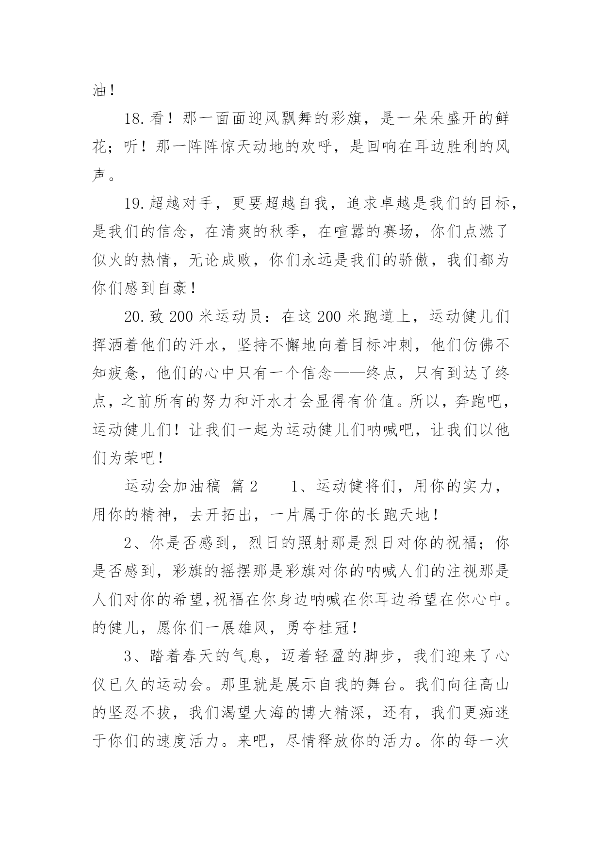 运动会加油稿运动会加油稿14篇随着社会不断地进步,需要使用加油稿的场合越来越多,适当使用加油稿可以给对方打气加油。那么你有了解过加油稿吗?下面是小编精心整理的运动会加油稿,欢迎大家借鉴与参考,希望对大家有所帮助。运动会加油稿篇11.秋风羽,天气淡淡的转凉。然而这人的秋在今天更加迷人,不是因为它的秋高气爽,也不是因为它的明媚阳光,是因为今天的人儿倍加精神气爽。看!运动场上那一幕幕,一股股,无论是哭是笑,市喜是悲,其中都融入了他们的汗水、辛劳。他们是真正的矫健者,是运动场上的骄儿,更是我们心中的英雄。加油吧!英雄们。2.年轻的我们自信飞扬,青春的气息和同出生的朝阳,蓬勃的力量如同阳光的挥洒,此时此刻,跑道便是我们精彩的舞台,声声加油是我们最高的奖项,论和成功,谈何荣辱,心中的信念只有一个,拼搏!挡不住您们破竹的锐气!3.体育是一种文化,是一种坚持,发扬体育文化,爱护自己的健康。致亲爱的跳高运动员:你的高度,跳出了飞扬,你的跳跃,飞出了优美。在阳光的照耀下,显得是那么的光芒万丈,你是那么的伟大。4.爱拼才会赢!运动健儿们都是今天最值得被夸奖的人。他们不为名不为利只为了心中坚定不移的信念相信今天你们在红色跑道上迈出的那一步步将会成为你们将来的花路上的一道靓丽风景线你们比任何的人都值得去迎接赛道终点的掌声成功一定属于你!5.无悔的选择无论结局是好是坏无怨无悔是我们的选择每当运动员奔驰在400米跑道上时我们为你祝福为你喝彩不到最后一刻绝不轻言放弃责成了你们的信仰也成了我们的信仰运动员们飞吧!翅膀属于你!6.虽然你们在场上的时间很短暂,但你们的身影依然停留在人们的脑海里,因为你们是赛场上最可爱的人。7.心中坚定的信念,脚下沉稳的步伐,你用行动告诉我们一个不变之理,没有走不完的路,没有过不了的山,成功正在终点冲着你高高的招手,用你那顽强的意志去努力,去迎接终点的鲜花与掌声,相信成功一定是属于你。8.看!运动场上那一幕幕,一股股,无论是哭是笑,市喜是悲,其中都融入了他们的汗水、辛劳。他们是真正的矫健者,是运动场上的骄儿,更是我们心中的英雄。加油吧!英雄们!9.深深的呼吸,等待你的是艰难的1500米。相信胜利会属于你们。但在这征途上,需要你勇敢的心去面对。10.真心祝愿机会是什么?是不可错过的刹那间。呐喊是什么?是为那刹那间的真心祝愿。加油!加油!11.当一声声的枪声从耳边飘过,你们,飞快地奔跑着,奔跑着。早晨,你们放飞气球,系托希望,来年,你们放飞希望,收获成功。梦想由希望构成,希望,由信念启航!愿你们在跑道上挥洒青春,让希望翱翔!加油,选手们!我们个同学都在看着你呢!12.1500米既是对你实力的考验,又是对你耐力的考察,经过1500米之后,及将变得更强,龚桂枝,我们的小花,我们的开心过,向前冲吧!1500米虽漫长。但我们的情谊更长,小花加油!13.你在红色的跑道上撒下了努力的汗水,献进了你的风采,固然你没有获得第一,但是有那默默的奉献就已经足够了,希望在下一个比赛能取得好成绩。我们会为你加油的。14.晨风轻轻地唤醒骄阳,校园的操场传来发令枪的声响,彩旗与呐喊声一起在飘荡着,心和起点紧紧的相连,用青春和热血来铺洒白色的跑道,用激情点燃胜利的曙光。15.秋风羽,天气淡淡的转凉。然而这人的秋在今天更加迷人,不是因为它的秋高气爽,也不是因为它的明媚阳光,是因为今天的人儿倍加精神气爽。16.枪响了,你们开始了并不长的征程,笔直的跑道上有你们稳健的足迹,不远的终点将留下你们冲刺时矫捷的背影,加油吧,掌声将为你响起,加油吧,胜利和鲜花终将属于你们。17.运动场上有你们的飒爽英姿,运动场上有你们拼搏的身影,面对漫漫的征程,你没有畏惧和退缩,任汗水打湿脊背,任疲惫爬满全身,依然分离追赶,只有一个目标,只有一个信念,为班级赢得荣誉,拼搏吧,我为你们呐喊,加油!18.看!那一面面迎风飘舞的彩旗,是一朵朵盛开的鲜花;听!那一阵阵惊天动地的欢呼,是回响在耳边胜利的风声。19.超越对手,更要超越自我,追求卓越是我们的目标,是我们的信念,在清爽的秋季,在喧嚣的赛场,你们点燃了似火的热情,无论成败,你们永远是我们的骄傲,我们都为你们感到自豪!20.致200米运动员:在这200米跑道上,运动健儿们挥洒着他们的汗水,坚持不懈地向着目标冲刺,他们仿佛不知疲惫,他们的心中只有一个信念——终点,只有到达了终点,之前所有的努力和汗水才会显得有价值。所以,奔跑吧,运动健儿们!让我们一起为运动健儿们呐喊吧,让我们以他们为荣吧!运动会加油稿篇21、运动健将们,用你的实力,用你的精神,去开拓出,一片属于你的长跑天地!2、你是否感到,烈日的照射那是烈日对你的祝福;你是否感到,彩旗的摇摆那是彩旗对你的呐喊人们的注视那是人们对你的希望,祝福在你身边呐喊在你耳边希望在你心中。的健儿,愿你们一展雄