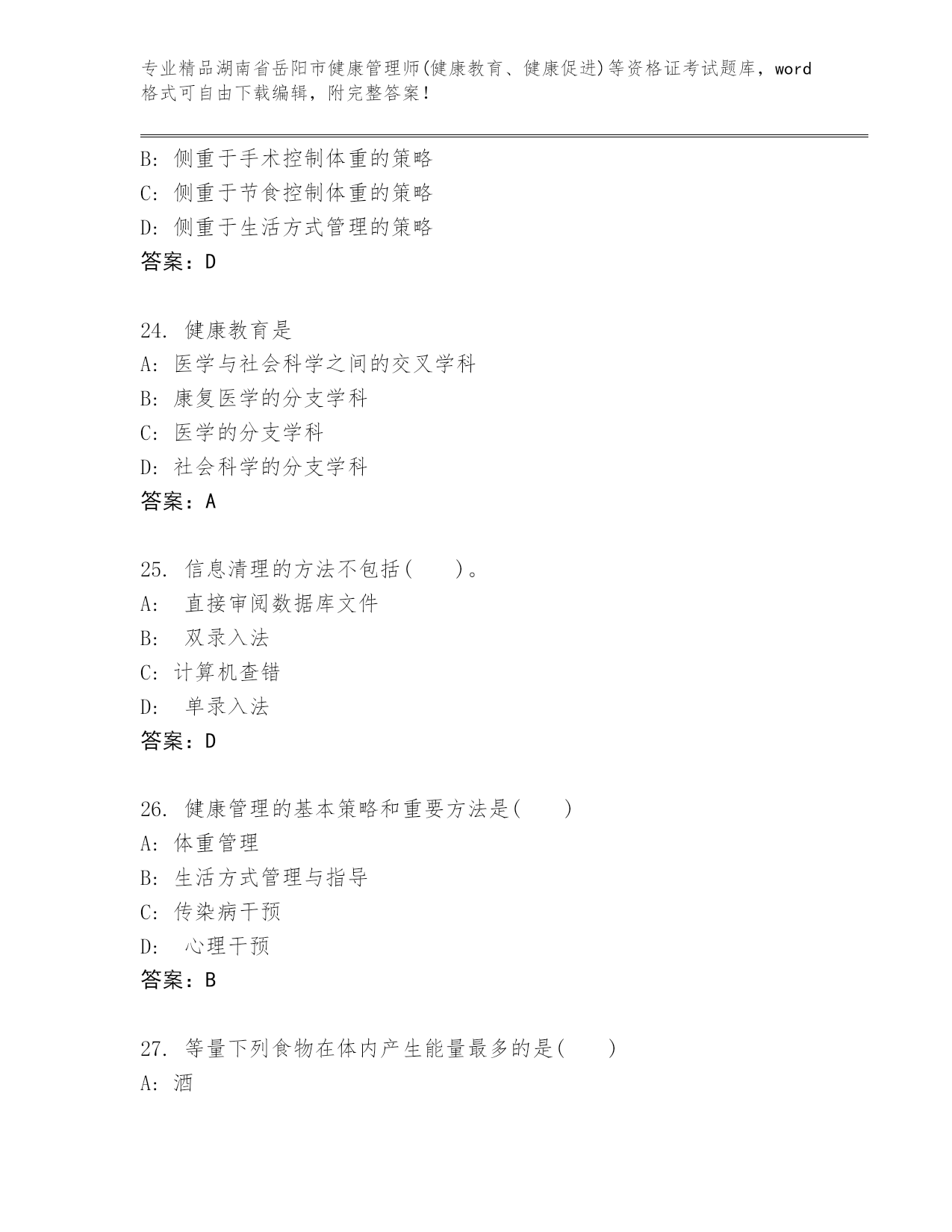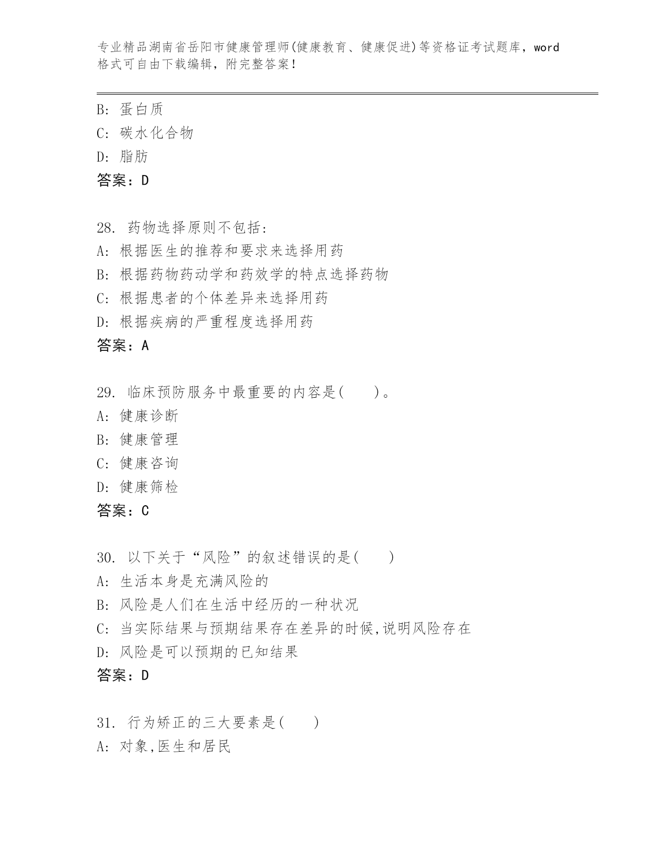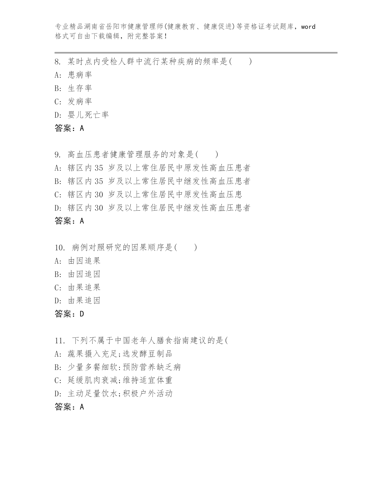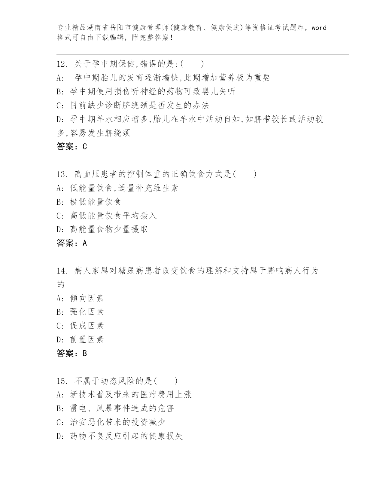 优选湖南省岳阳市健康管理师(健康教育、健康促进)等资格证考试及1套完整答案