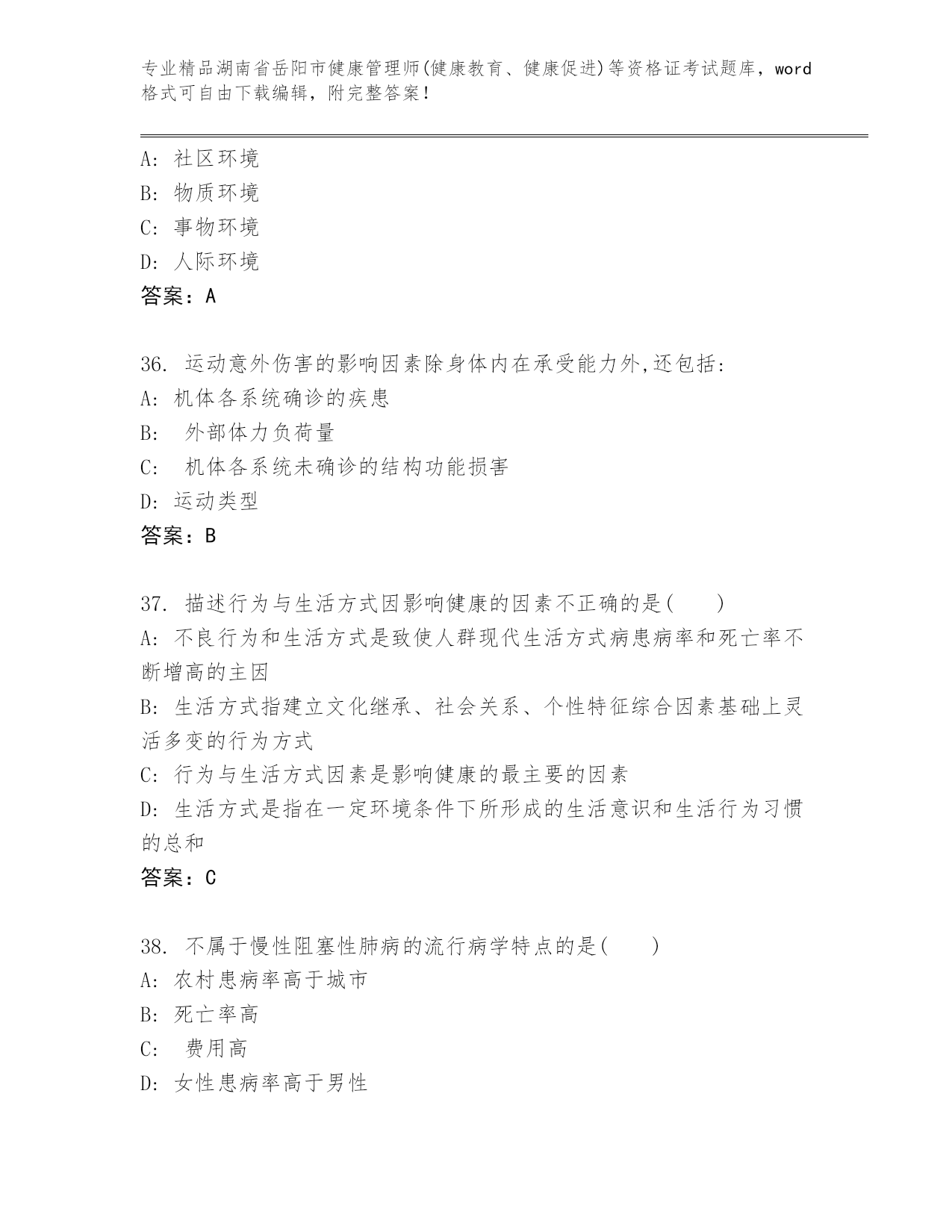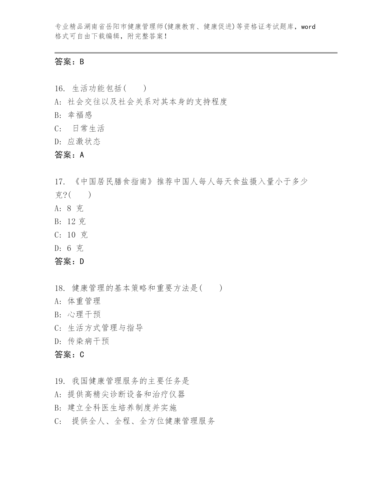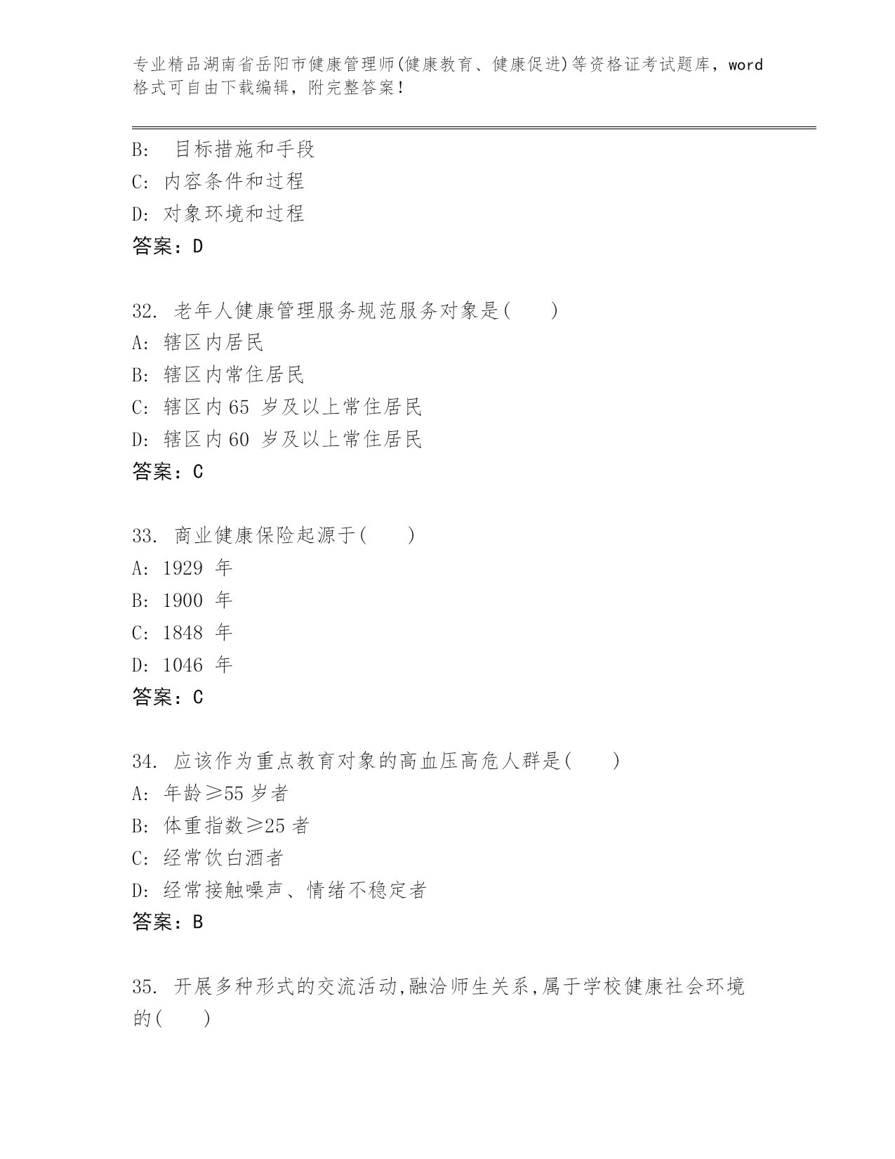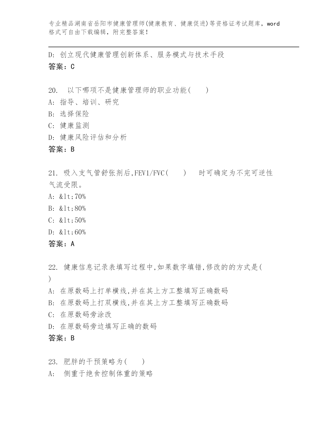 优选湖南省岳阳市健康管理师(健康教育、健康促进)等资格证考试及1套完整答案