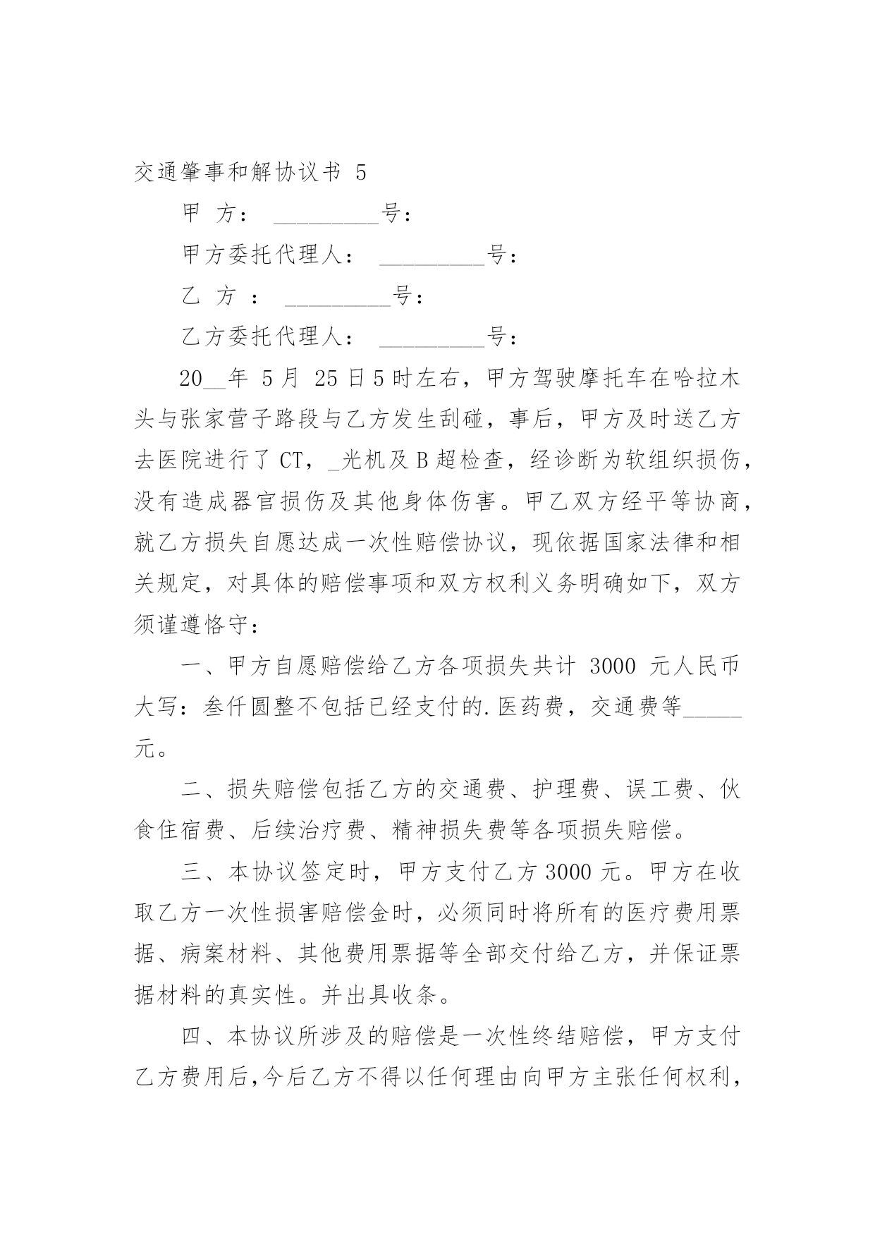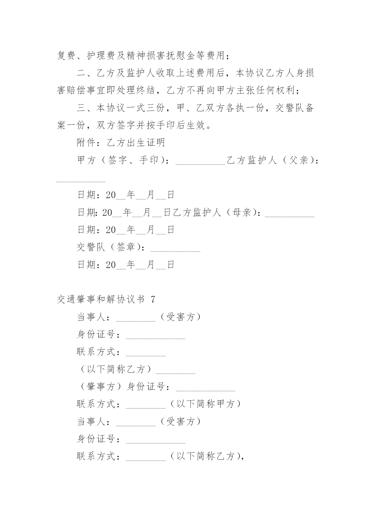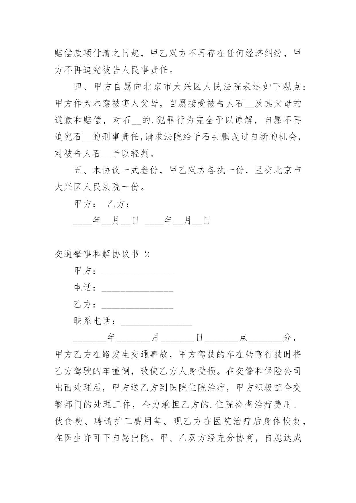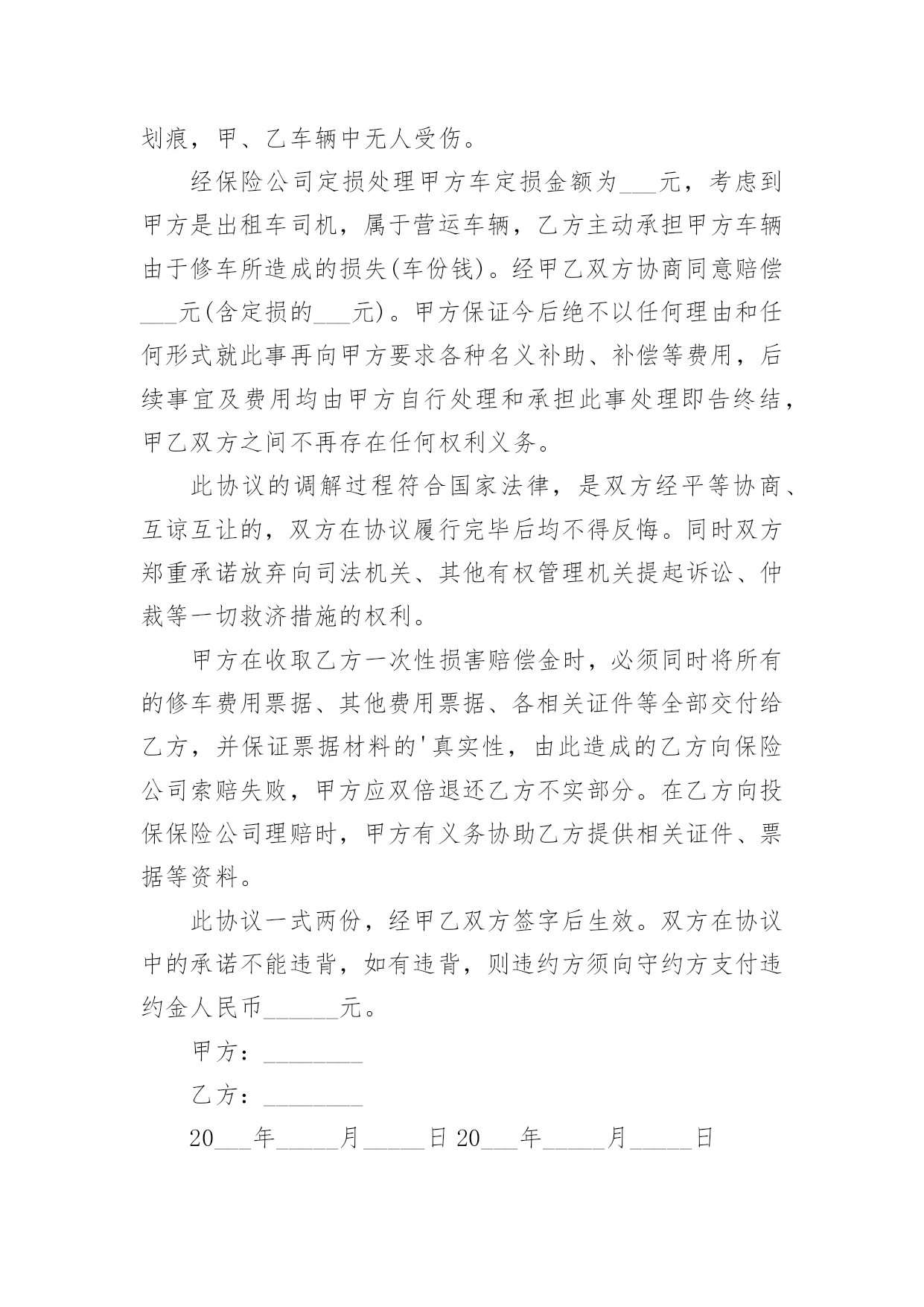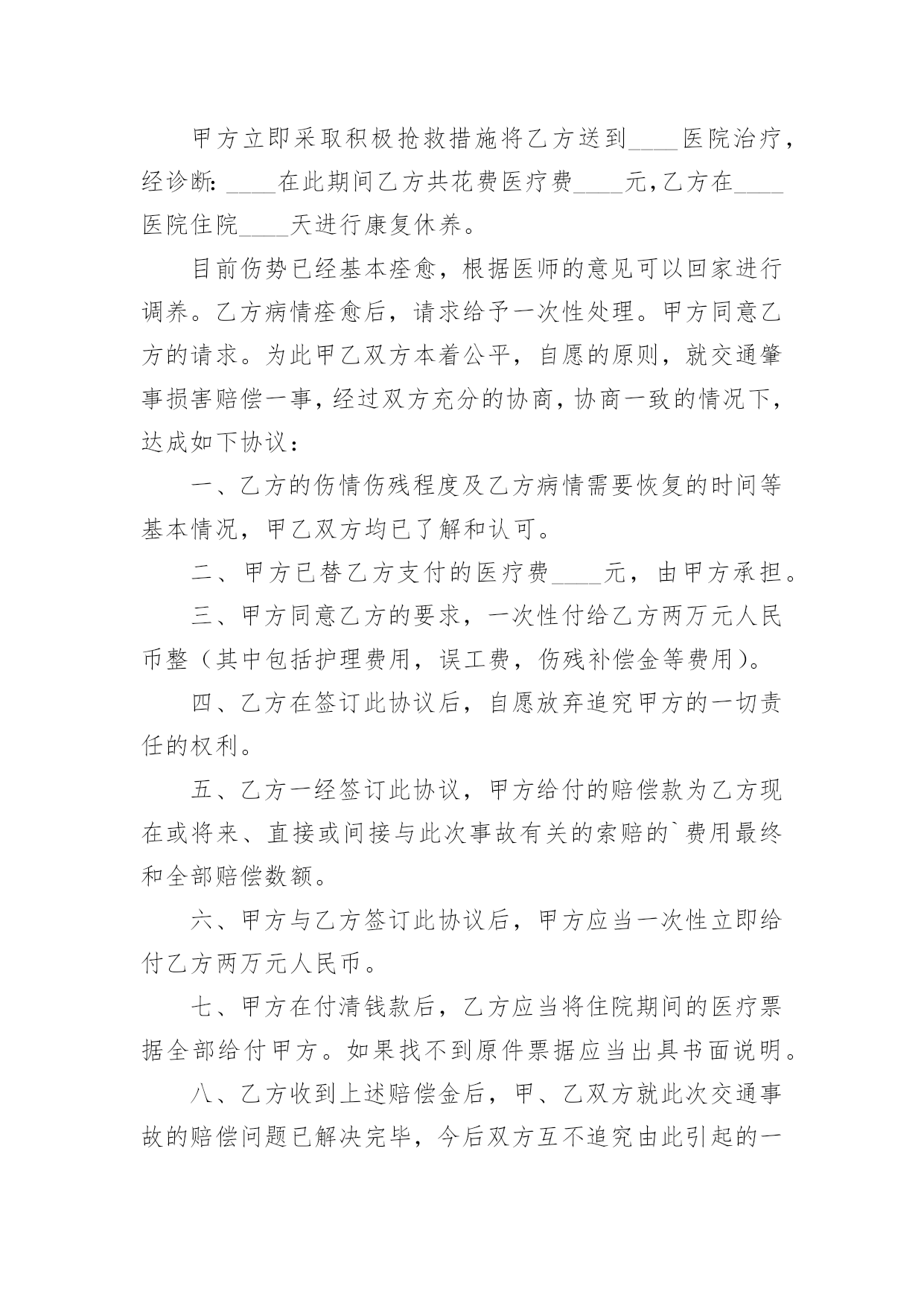 交通肇事和解协议书交通肇事和解协议书(通用13篇)在当今社会生活中,我们都跟协议有着直接或间接的联系,协议对双方的事务履行起到积极作用。那么写协议真的很难吗?以下是小编为大家整理的交通肇事和解协议书,希望能够帮助到大家。交通肇事和解协议书1甲方:杨__(系受害人杨__父亲),男,汉族,____年__月__日出生,住址河南省__市__镇__村__。甲方:张__(系受害人杨__母亲),女,汉族,____年__月__日出生,住址河南省__市__镇__村__。乙方:石__(系被告人石__父亲),男,汉族,住址河北省__县__镇__村,电话____。鉴于被告人石__犯交通肇事罪一案给甲方造成了经济损失。目前一审庭审结束,甲、乙双方经协商就民事赔偿部分达成以下和解协议:一、石__就其交通肇事行为给甲方造成的精神痛苦和经济损失深表歉意,并致以最诚恳的道歉,请求甲方予以谅解。二、乙方作为被告人的父亲,代其一次性向甲方支付死亡赔偿金人民币31万元整,刑事附带民事起诉书上请求赔偿的其他项目自愿放弃,甲方不再向石__及其家属主张。三、乙方在本协议签订之日起一次性付清上述赔偿款项;赔偿款项付清之日起,甲乙双方不再存在任何经济纠纷,甲方不再追究被告人民事责任。四、甲方自愿向北京市大兴区人民法院表达如下观点:甲方作为本案被害人父母,自愿接受被告人石__及其父母的道歉和赔偿,对石__的.犯罪行为完全予以谅解,自愿不再追究石__的刑事责任,请求法院给予石去鹏改过自新的机会,对被告人石__予以轻判。五、本协议一式叁份,甲乙双方各执一份,呈交北京市大兴区人民法院一份。甲方:乙方:____年__月__日____年__月__日交通肇事和解协议书2甲方:_______________电话:_______________乙方:_______________联系电话:______________________年_______月_______日_______点_______分,甲方乙方在路发生交通事故,甲方驾驶的车在转弯行驶时将乙方驾驶的车撞倒,致使乙方人身受损。在交警和保险公司出面处理后,甲方送乙方到医院住院治疗,甲方积极配合交警部门的处理工作,全力承担乙方的.住院检查治疗费用、伙食费、聘请护工费用等。现乙方在医院治疗后身体恢复,在医生许可下自愿出院。甲、乙双方经充分协商,自愿达成如下协议:一、甲方扣除前期支付的部分医疗费用(计:_______________元人民币)外,另行赔偿乙方医药费、护理费、营养费、住院伙食补助费、误工费、伤残赔偿金、精神伤害抚慰金、交通费等合计_______元人民币。乙方不支付任何费用。二、甲方与保险公司进行理赔期间,乙方积极配合甲方出具相关证明。三、甲、乙方已经解决了全部的事故责任,乙方今后不再因此事追究甲方的任何责任。四、本协议书一式两份,甲、乙双方各执一份,自签字之日起生效。甲方:_______________乙方:_____________________________年_______月_______日交通肇事和解协议书3赔偿人:汪__,男,26岁,汉族,车主,现住__乡__村,身份证号码:___被赔偿人:____,男,56岁,汉族,农民,现住__市__县__村,身份证号码:___20__年__月__日,汪__在公路上骑摩托车正常行驶的过程中,___由于骑着自行车看牛导致岔道,和汪__驾驶的摩托车相撞,致使__受伤。__被撞伤后立即被汪__送到___医院住院治疗,经检查,是大腿骨处骨折受伤,住院___天后于20__年___月__日好转出院经双方进行友好协商,达成一致,自愿达成以下赔偿交通事故协议条款:一、由汪__赔偿___各项医疗费(不包含前期住院已经支付给__的医疗费)、残疾赔偿金、误工费、住院伙食补助费、护理费、营养费、精神抚慰金、二次手术费、残疾辅助器具费、被扶养人生活费、鉴定费、自行车修理费、交通费等共计(总数额22138.30-已经支付的'医疗费16000元)=现在还需给付的金额10769.15元;二、以上款项一次性支付,支付后双方均不得反悔,__不得再追究汪__的任何责任,放弃对赔偿人的诉权;三、双方再无其他争议。四、本交通事故协议书一式两份,双方各执一份,自签字之日起生效。赔偿人:(签名)被赔偿人:(签名)交通肇事和解协议书4甲方:______身份证号:____________车牌号:____________乙方:______身份证号:____________车牌号:____________甲、乙双方于20____年____月____日7点45分在________桥西南角发生了交通刮蹭事故,双方车辆均有轻微划痕,甲、乙车辆中无人受伤。经保险公司定损处理甲方车定损金额为___元,考虑到甲方是出租车司机,属于营运车辆,