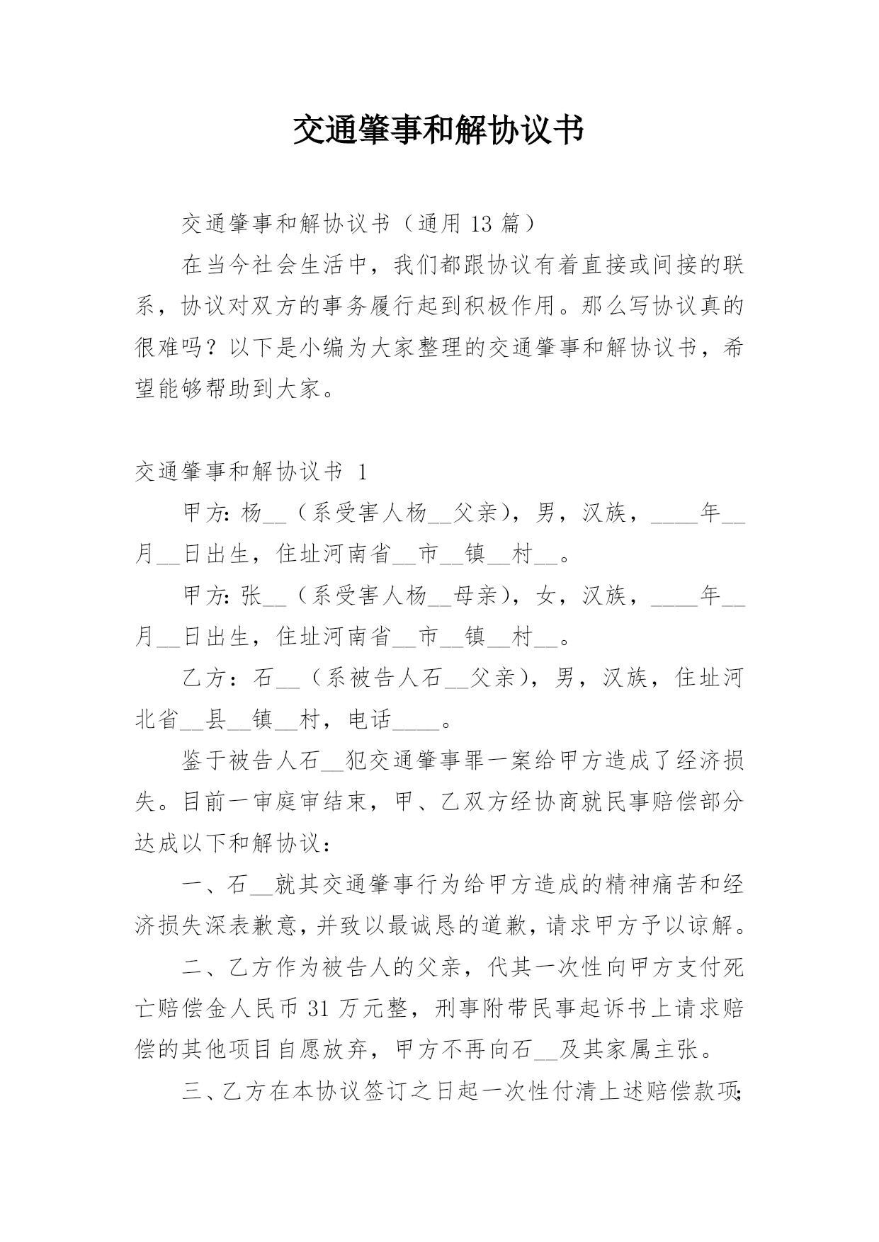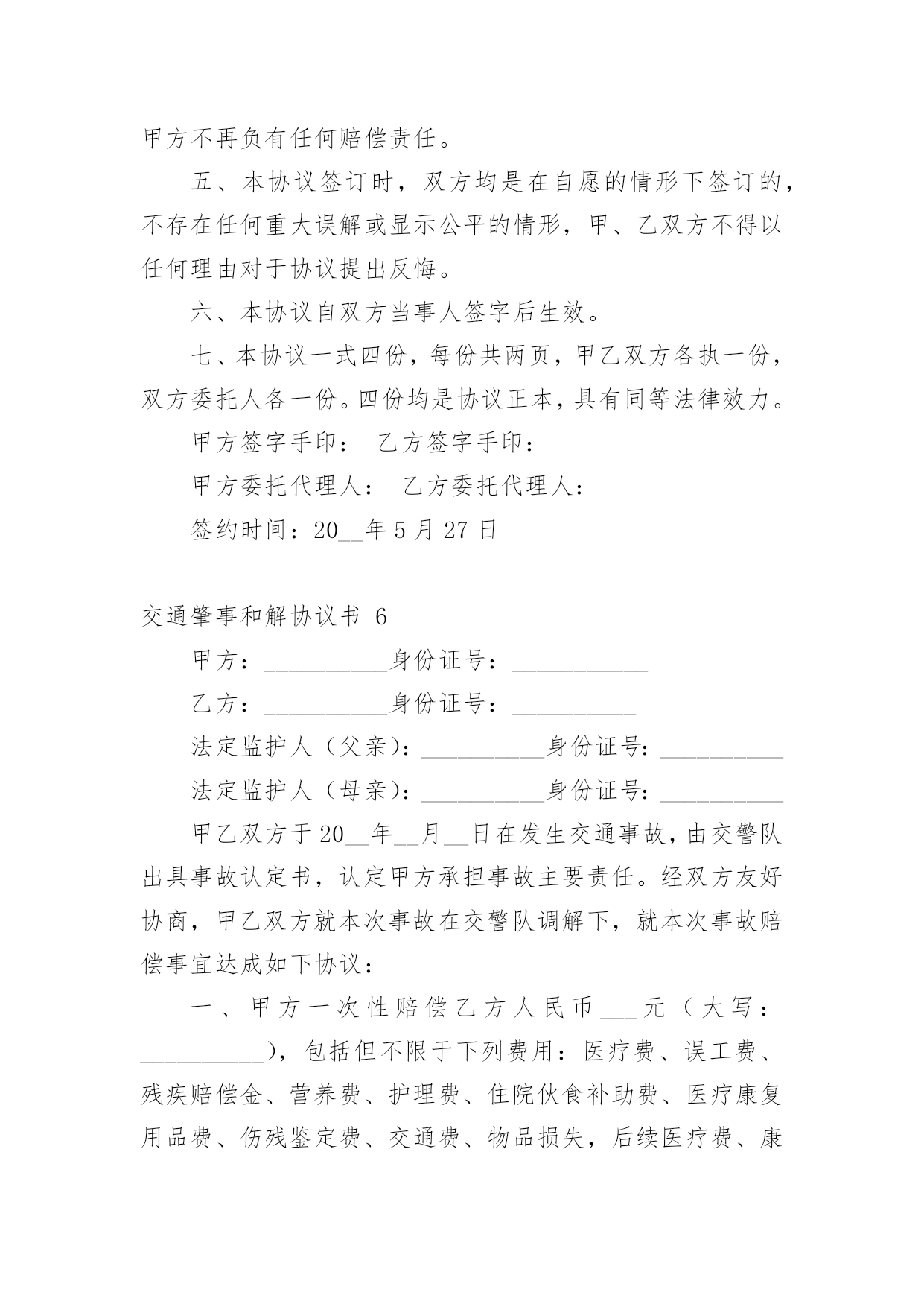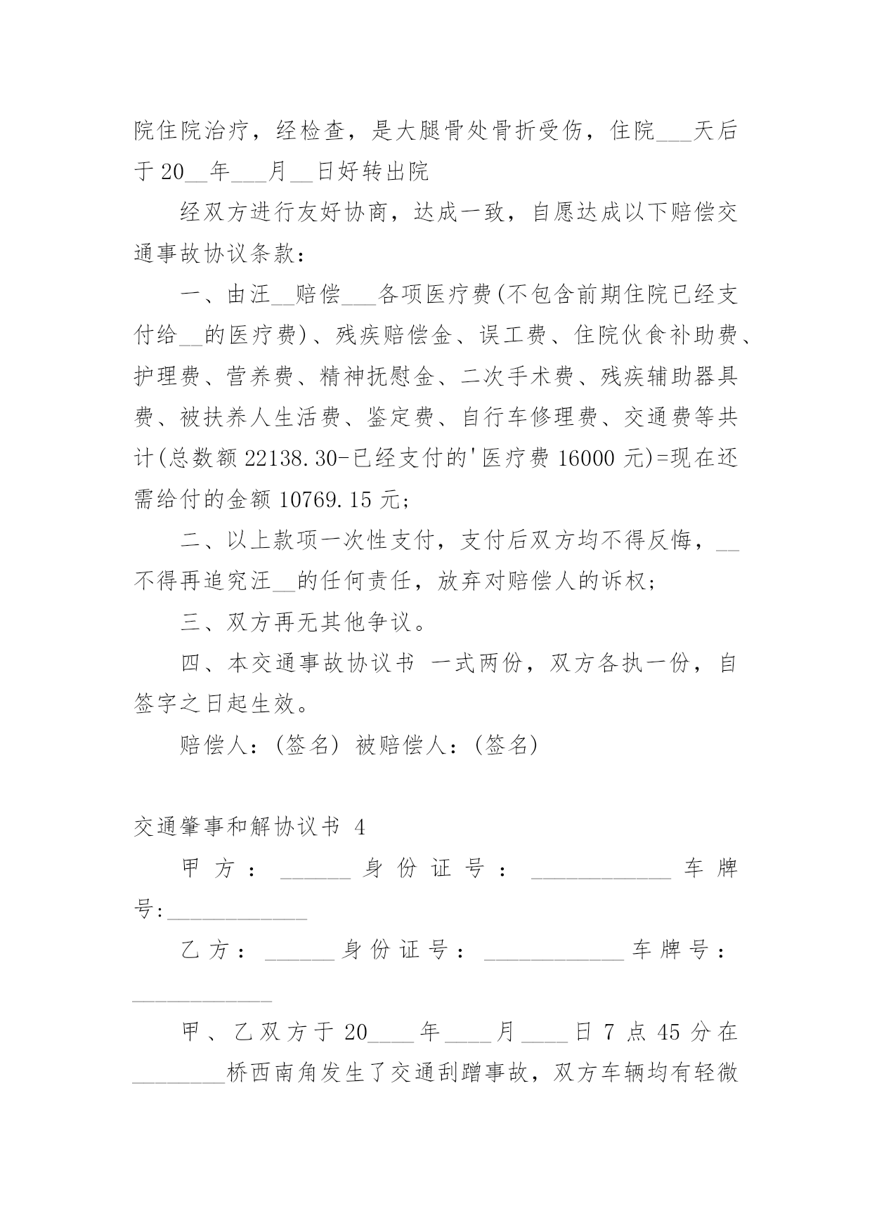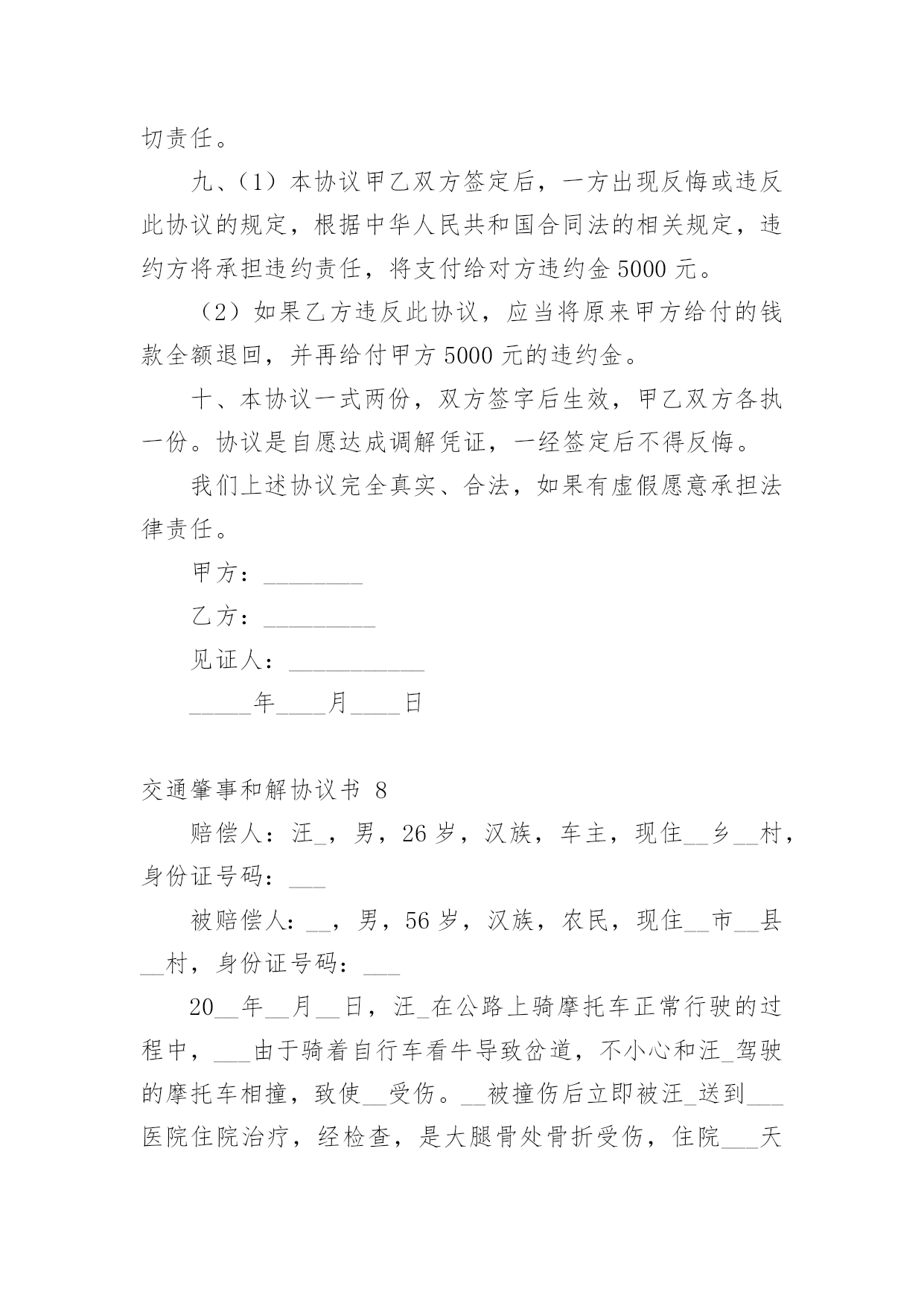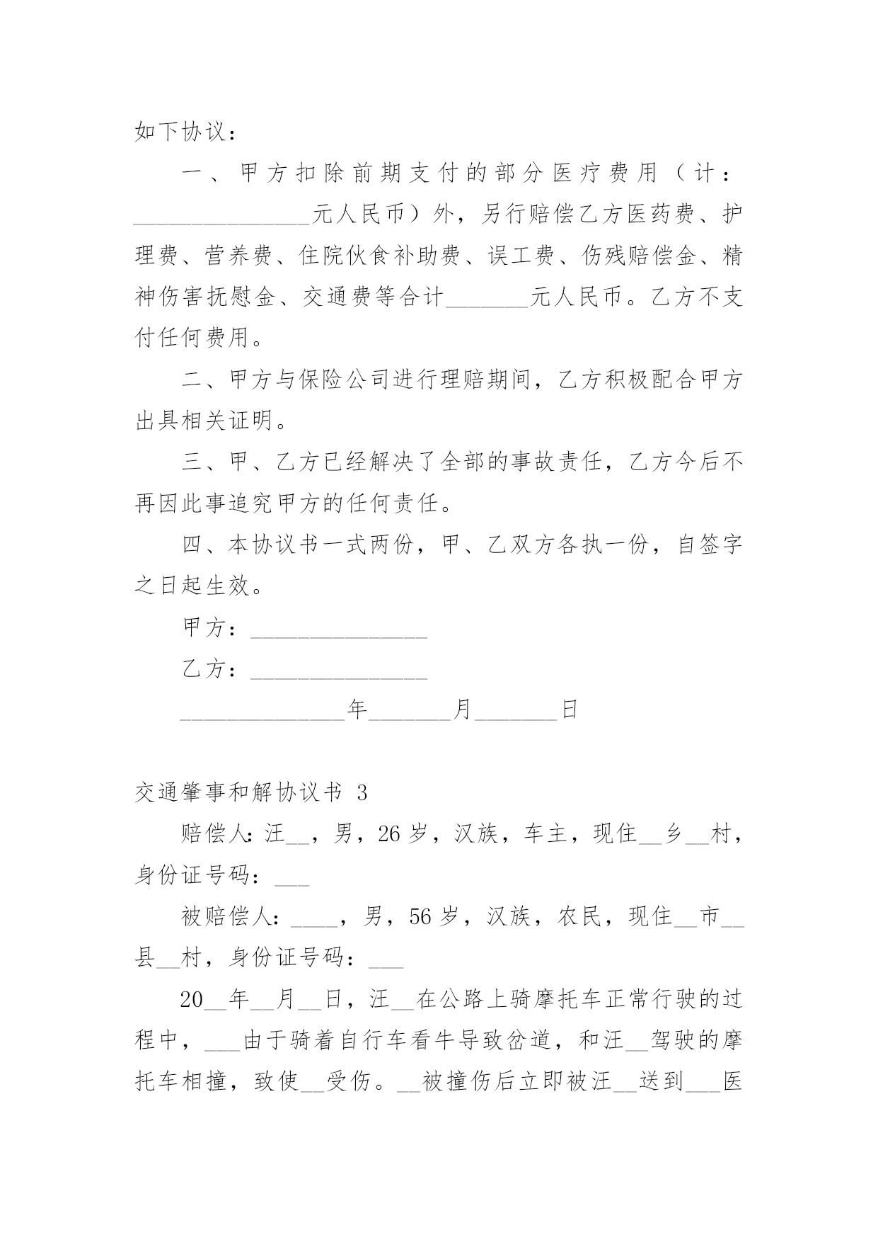 交通肇事和解协议书交通肇事和解协议书(通用13篇)在当今社会生活中,我们都跟协议有着直接或间接的联系,协议对双方的事务履行起到积极作用。那么写协议真的很难吗?以下是小编为大家整理的交通肇事和解协议书,希望能够帮助到大家。交通肇事和解协议书1甲方:杨__(系受害人杨__父亲),男,汉族,____年__月__日出生,住址河南省__市__镇__村__。甲方:张__(系受害人杨__母亲),女,汉族,____年__月__日出生,住址河南省__市__镇__村__。乙方:石__(系被告人石__父亲),男,汉族,住址河北省__县__镇__村,电话____。鉴于被告人石__犯交通肇事罪一案给甲方造成了经济损失。目前一审庭审结束,甲、乙双方经协商就民事赔偿部分达成以下和解协议:一、石__就其交通肇事行为给甲方造成的精神痛苦和经济损失深表歉意,并致以最诚恳的道歉,请求甲方予以谅解。二、乙方作为被告人的父亲,代其一次性向甲方支付死亡赔偿金人民币31万元整,刑事附带民事起诉书上请求赔偿的其他项目自愿放弃,甲方不再向石__及其家属主张。三、乙方在本协议签订之日起一次性付清上述赔偿款项;赔偿款项付清之日起,甲乙双方不再存在任何经济纠纷,甲方不再追究被告人民事责任。四、甲方自愿向北京市大兴区人民法院表达如下观点:甲方作为本案被害人父母,自愿接受被告人石__及其父母的道歉和赔偿,对石__的.犯罪行为完全予以谅解,自愿不再追究石__的刑事责任,请求法院给予石去鹏改过自新的机会,对被告人石__予以轻判。五、本协议一式叁份,甲乙双方各执一份,呈交北京市大兴区人民法院一份。甲方:乙方:____年__月__日____年__月__日交通肇事和解协议书2甲方:_______________电话:_______________乙方:_______________联系电话:______________________年_______月_______日_______点_______分,甲方乙方在路发生交通事故,甲方驾驶的车在转弯行驶时将乙方驾驶的车撞倒,致使乙方人身受损。在交警和保险公司出面处理后,甲方送乙方到医院住院治疗,甲方积极配合交警部门的处理工作,全力承担乙方的.住院检查治疗费用、伙食费、聘请护工费用等。现乙方在医院治疗后身体恢复,在医生许可下自愿出院。甲、乙双方经充分协商,自愿达成如下协议:一、甲方扣除前期支付的部分医疗费用(计:_______________元人民币)外,另行赔偿乙方医药费、护理费、营养费、住院伙食补助费、误工费、伤残赔偿金、精神伤害抚慰金、交通费等合计_______元人民币。乙方不支付任何费用。二、甲方与保险公司进行理赔期间,乙方积极配合甲方出具相关证明。三、甲、乙方已经解决了全部的事故责任,乙方今后不再因此事追究甲方的任何责任。四、本协议书一式两份,甲、乙双方各执一份,自签字之日起生效。甲方:_______________乙方:_____________________________年_______月_______日交通肇事和解协议书3赔偿人:汪__,男,26岁,汉族,车主,现住__乡__村,身份证号码:___被赔偿人:____,男,56岁,汉族,农民,现住__市__县__村,身份证号码:___20__年__月__日,汪__在公路上骑摩托车正常行驶的过程中,___由于骑着自行车看牛导致岔道,和汪__驾驶的摩托车相撞,致使__受伤。__被撞伤后立即被汪__送到___医院住院治疗,经检查,是大腿骨处骨折受伤,住院___天后于20__年___月__日好转出院经双方进行友好协商,达成一致,自愿达成以下赔偿交通事故协议条款:一、由汪__赔偿___各项医疗费(不包含前期住院已经支付给__的医疗费)、残疾赔偿金、误工费、住院伙食补助费、护理费、营养费、精神抚慰金、二次手术费、残疾辅助器具费、被扶养人生活费、鉴定费、自行车修理费、交通费等共计(总数额22138.30-已经支付的'医疗费16000元)=现在还需给付的金额10769.15元;二、以上款项一次性支付,支付后双方均不得反悔,__不得再追究汪__的任何责任,放弃对赔偿人的诉权;三、双方再无其他争议。四、本交通事故协议书一式两份,双方各执一份,自签字之日起生效。赔偿人:(签名)被赔偿人:(签名)交通肇事和解协议书4甲方:______身份证号:____________车牌号:____________乙方:______身份证号:____________车牌号:____________甲、乙双方于20____年____月____日7点45分在________桥西南角发生了交通刮蹭事故,双方车辆均有轻微划痕,甲、乙车辆中无人受伤。经保险公司定损处理甲方车定损金额为___元,考虑到甲方是出租车司机,属于营运车辆,