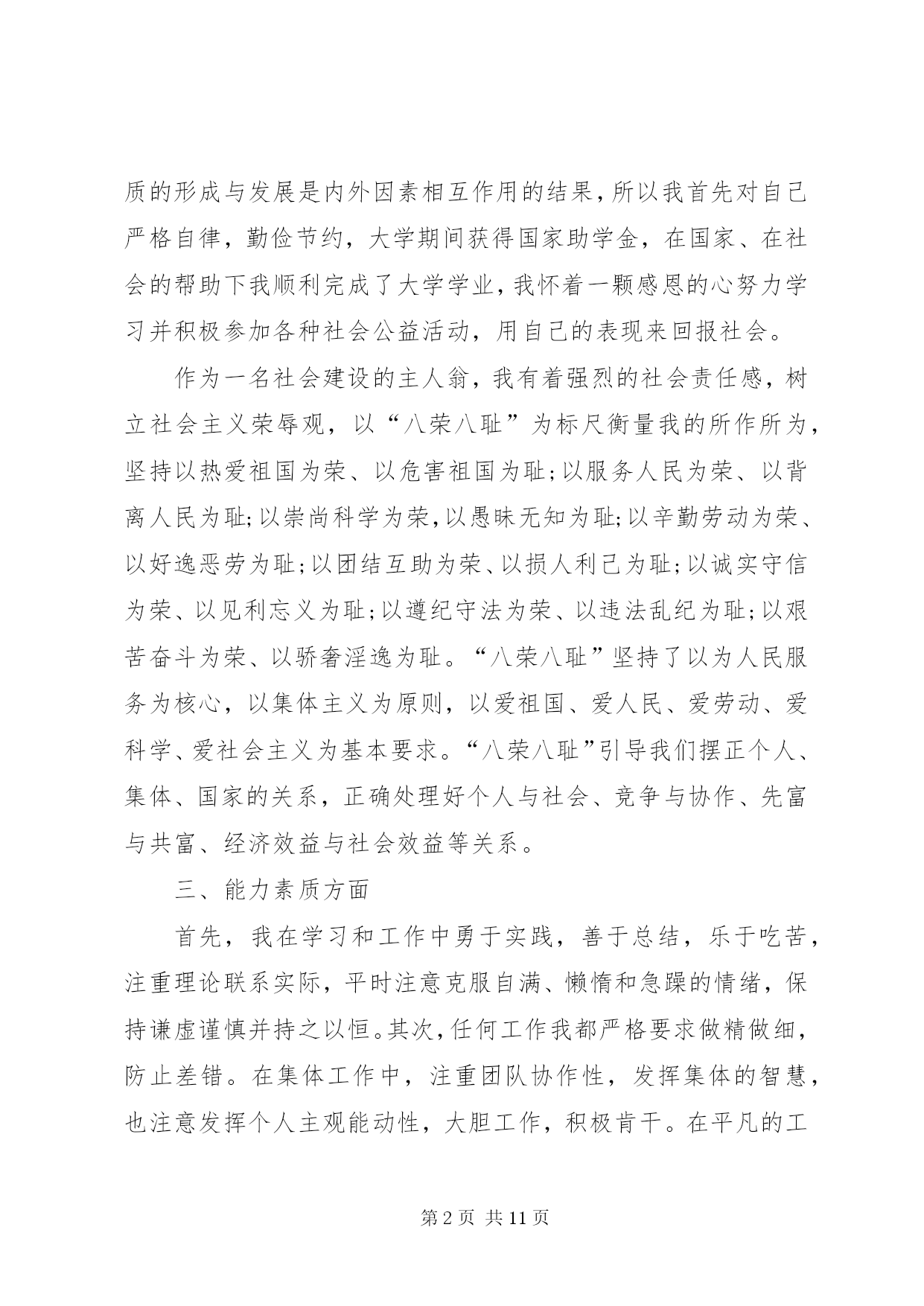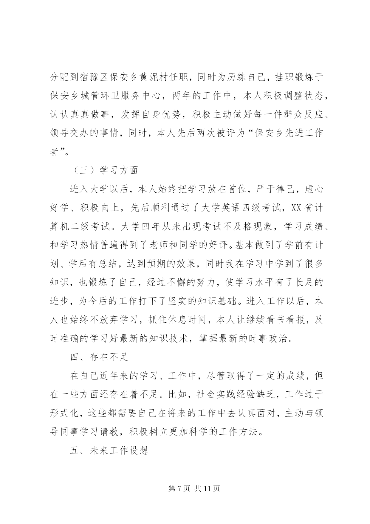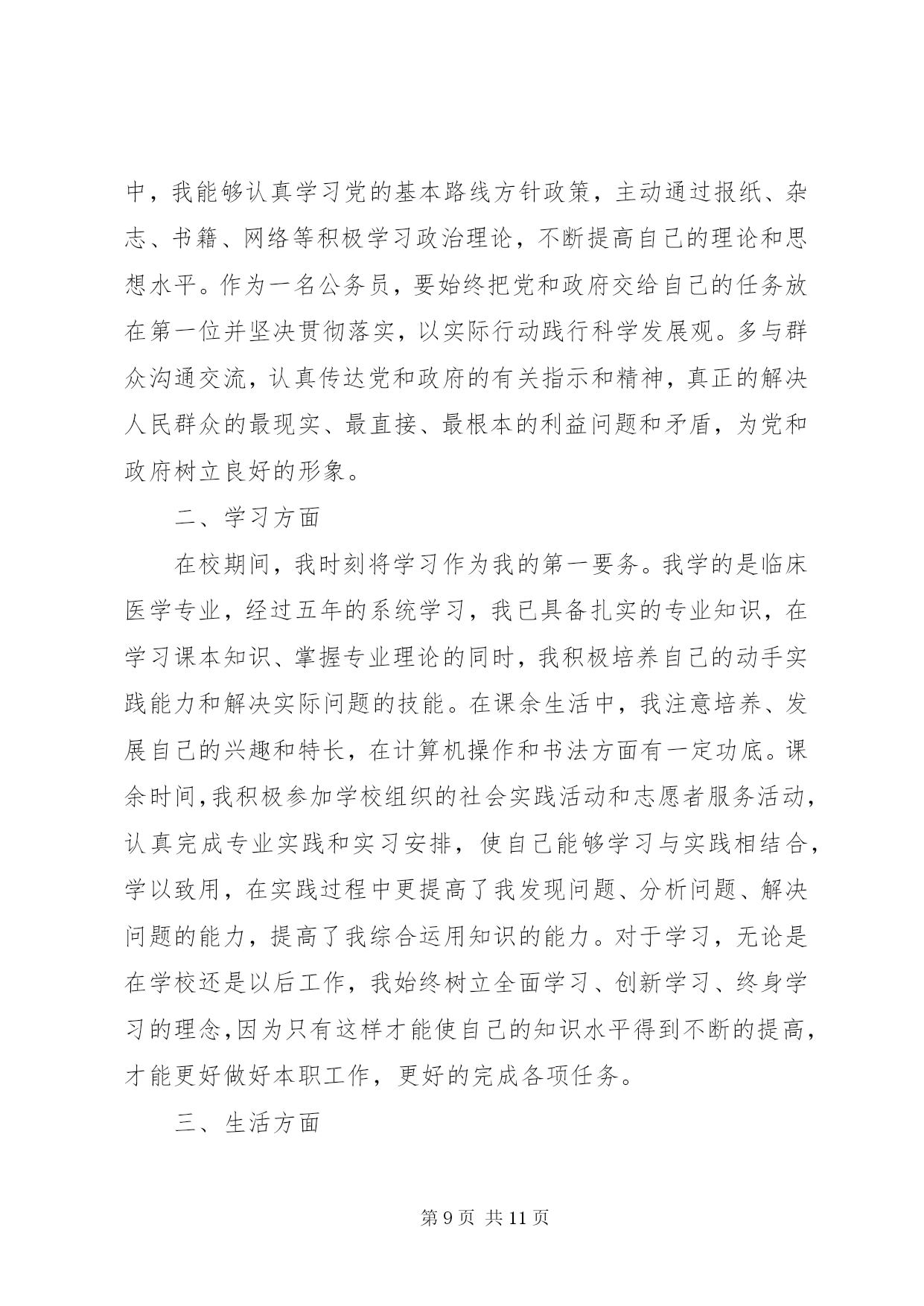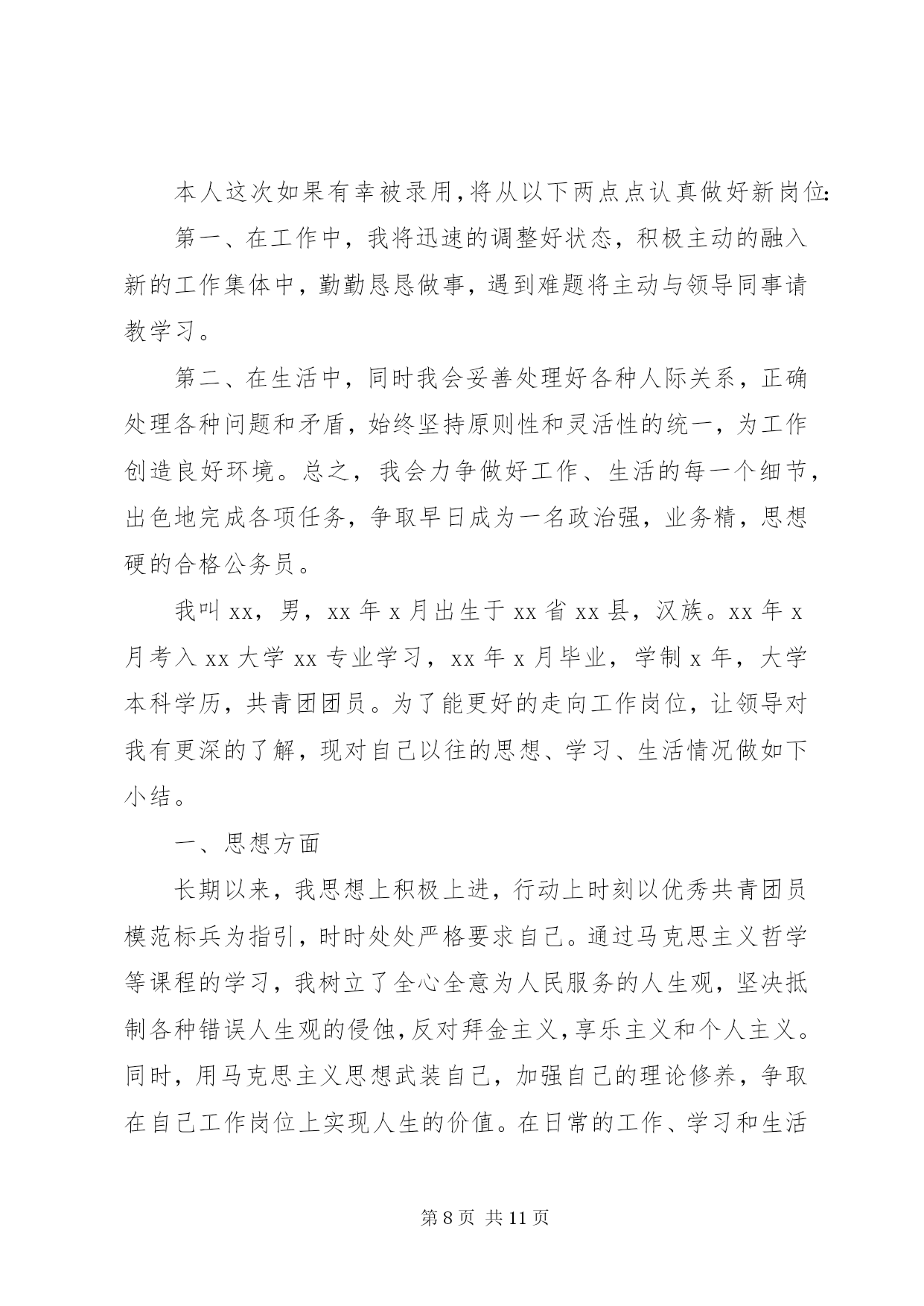 第PAGE\*Arabic\*MERGEFORMAT11页共NUMPAGES\*MERGEFORMAT11页精选公务员政审工作总结范文我叫xxx,女,于xxx年x月出生在XX市XX县区,汉族。xxx年x月考入西南大学资源环境与城乡规划专业学习,20xx年7月毕业,学制四年,大学本科学历,共青团员,现在,XX县区事业单位公开、公平、公正的选拔机制让我有机会实现自己的社会价值。为了能更好地走向工作岗位,让组织对我有更深的了解,我把自己过去的学习、工作、生活和思想情况做一个小结。一、政治思想方面在思想上,我积极上进,从小我就受到外公这位老党员的熏陶,立志长大以后要成为一名合格的共产党员。我热爱祖国,热爱中国共产党,热爱社会主义,拥护中国共产党的领导,拥护改革开放,坚信社会主义最终必然战胜资本主义,对社会主义充满必胜的信心。我始终坚持运用马克思列宁主义的立场观点和方法论,运用辩证唯物主义与历史唯物主义去分析和观察事物,明辨是非,坚持真理,坚持正确的世界观、人生观、价值观,用正确的世界观、人生观、价值观指导自己的学习、工作和生活实践,在思想上积极构筑抵御资产阶级民主和自由化、拜金主义、自由主义等一切腐朽思想侵蚀的坚固防线。认真贯彻执行党的路线、方针、政策,为加快社会主义建设事业认真做好本职工作。二、道德品质方面大学期间,我接受到学校良好的思想政治教育,深知道德品质的形成与发展是内外因素相互作用的结果,所以我首先对自己严格自律,勤俭节约,大学期间获得国家助学金,在国家、在社会的帮助下我顺利完成了大学学业,我怀着一颗感恩的心努力学习并积极参加各种社会公益活动,用自己的表现来回报社会。作为一名社会建设的主人翁,我有着强烈的社会责任感,树立社会主义荣辱观,以“八荣八耻”为标尺衡量我的所作所为,坚持以热爱祖国为荣、以危害祖国为耻;以服务人民为荣、以背离人民为耻;以崇尚科学为荣,以愚昧无知为耻;以辛勤劳动为荣、以好逸恶劳为耻;以团结互助为荣、以损人利己为耻;以诚实守信为荣、以见利忘义为耻;以遵纪守法为荣、以违法乱纪为耻;以艰苦奋斗为荣、以骄奢淫逸为耻。“八荣八耻”坚持了以为人民服务为核心,以集体主义为原则,以爱祖国、爱人民、爱劳动、爱科学、爱社会主义为基本要求。“八荣八耻”引导我们摆正个人、集体、国家的关系,正确处理好个人与社会、竞争与协作、先富与共富、经济效益与社会效益等关系。三、能力素质方面首先,我在学习和工作中勇于实践,善于总结,乐于吃苦,注重理论联系实际,平时注意克服自满、懒惰和急躁的情绪,保持谦虚谨慎并持之以恒。其次,任何工作我都严格要求做精做细,防止差错。在集体工作中,注重团队协作性,发挥集体的智慧,也注意发挥个人主观能动性,大胆工作,积极肯干。在平凡的工作中自我加压,自我激励。第三,我在工作实践中不断反思和在思维锻炼中提升能力素质。总结、反思是我对工作实践进行回顾和思考,提炼升华的过程,从中吸取经验教训,避免今后再发生类似的错误。在大学和工作期间,我不断扩展自己的知识领域和能力,先后取得了人力资源管理助理,计算机和英语四级证书。希望对今后的工作能有所帮助。四、主要学习和工作表现自从进入大学以来,我一直团结同学,本着顾全大局、作风严谨、虚心好学、积极向上的原则,充分发挥自己吃苦耐劳、虚心请教、主动学习的优点,明确了学习的方向。在具体的学习过程中能形成一个较为清晰的思路,做到有组织、有目的、有计划,顺利的完成大学四年的学业。学习成绩和学习热情普遍得到了老师和同学的认可。基本做到了学前有计划,学后有总结,让我在学习中学到了很多知识,也锻炼了自己,经过不懈的努力,我的学习水平有了长足的进步,也为自己今后的工作打下了一个良好的基础。毕业时,由于我所学专业比较冷门,未能找到符合专业知识的工作,我一边在XX县区新世纪打工,一边坚持自学,2009年受聘于重庆君创劳务有限公司,随公司参与了北京京石客运专线的建设,担任综合办公室主任,并兼任人力资源科长,面对工程战线长、人员多、人员流动大等各种繁杂情况,我加班加点,顺利完成了公司交给我的各项任务,受到本公司领导及中铁六局京石项目部相关领导的高度赞扬。去年,在京石工程的工作顺利结束以后,我回到XX县区,积极备考,还取得了教师资格证。我深知,机会都是留给有准备的人,时代的发展,工作的需要,激励我不断通过学习充实自己,努力使自己成为适应各种工作需要的复合型人才。五、遵纪守法情况我从小就在良好的家庭环境中长大,外公是大学教授,外婆是小学教师,受他们影响、熏陶,我从小就懂得严于律己,从小学到大学一直都品学兼优,深受老师和同学喜爱。受父母下岗影响,我们家境一直比较困难,一家三口挤在不足20平方米的单间里,贫穷没能让我丧失对生活的信心,相反,我更加刻苦的学习,更懂得遵纪守法的重要性。大学时靠国