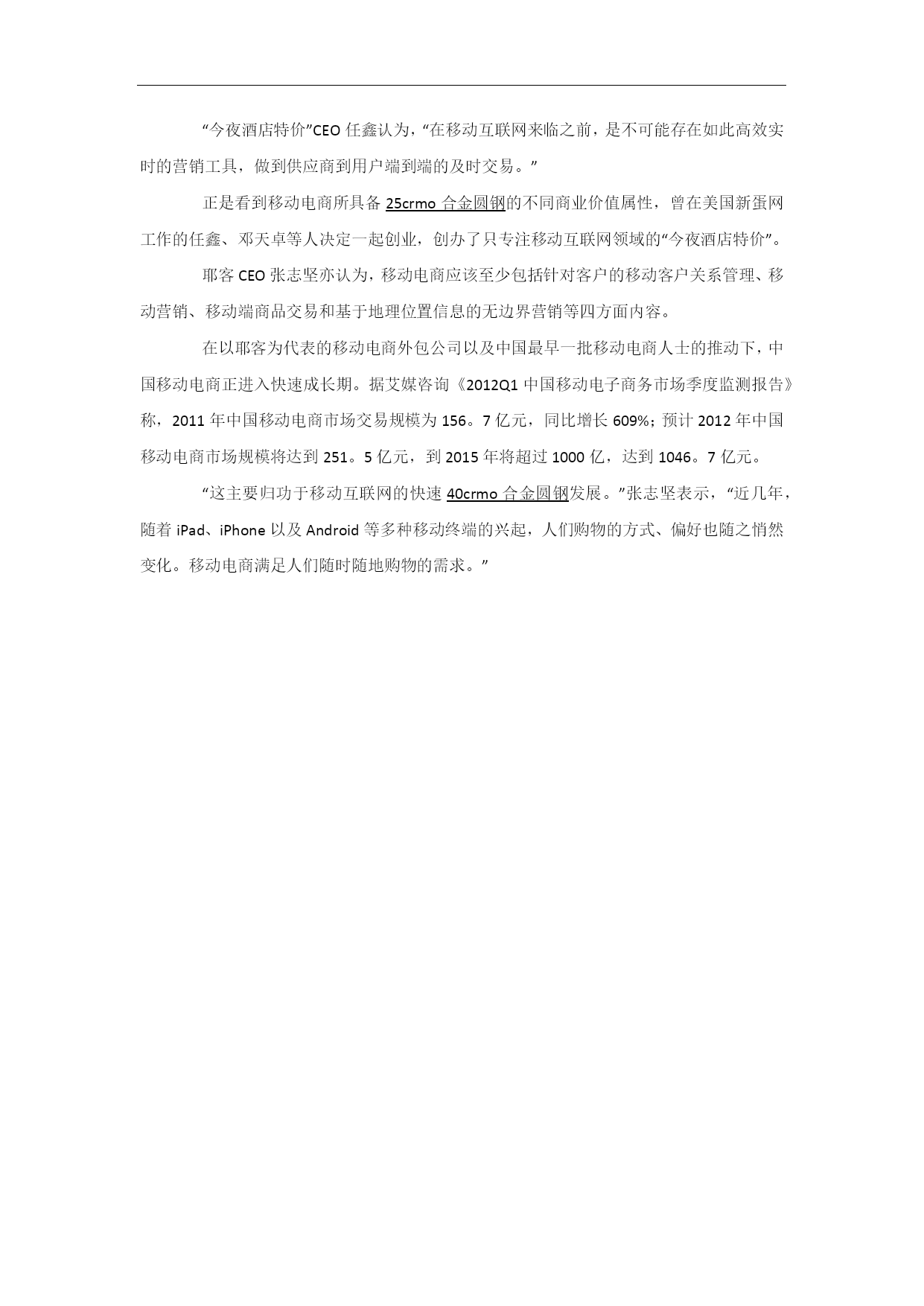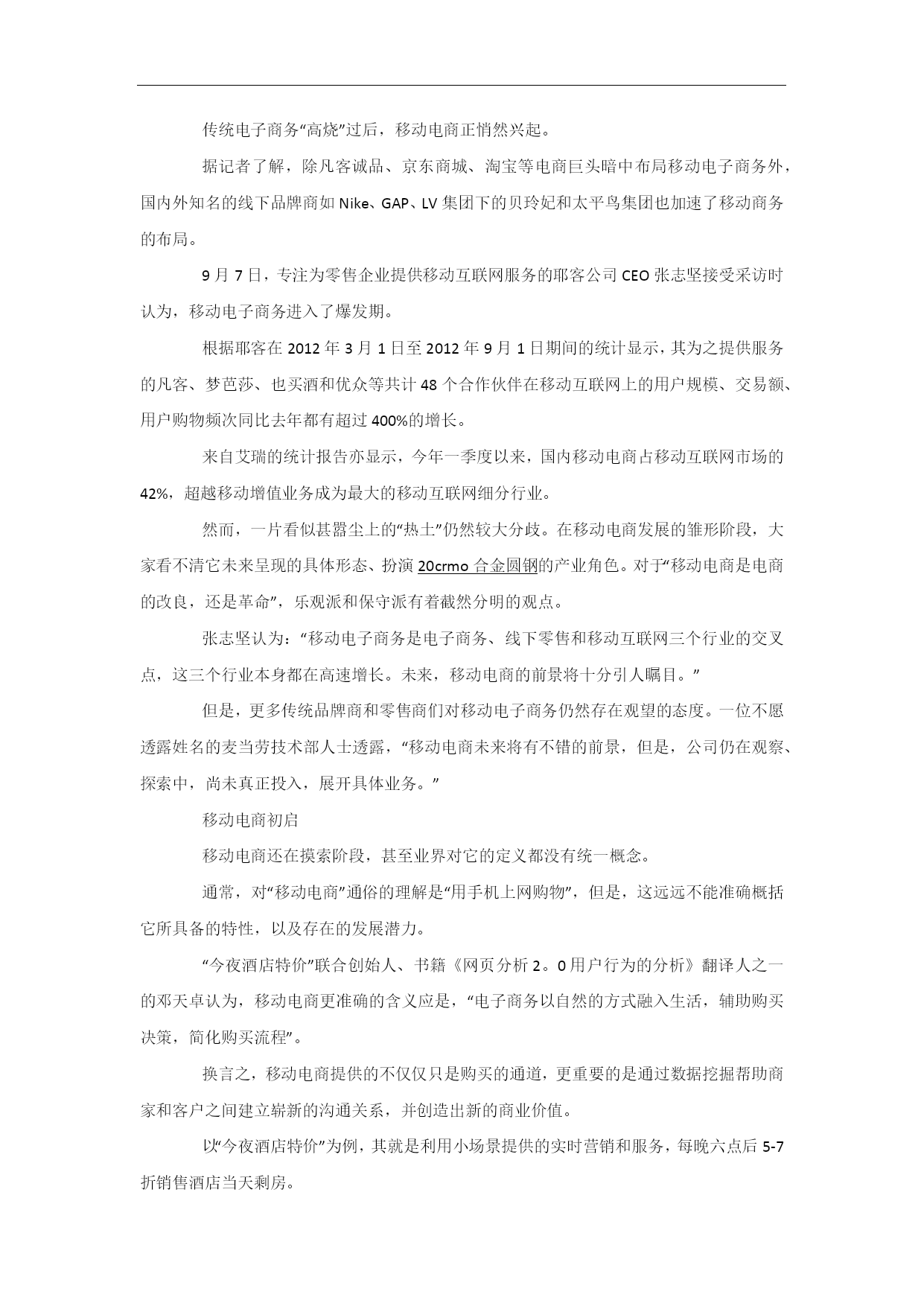 传统电子商务“高烧”过后,移动电商正悄然兴起。据记者了解,除凡客诚品、京东商城、淘宝等电商巨头暗中布局移动电子商务外,国内外知名的线下品牌商如Nike、GAP、LV集团下的贝玲妃和太平鸟集团也加速了移动商务的布局。9月7日,专注为零售企业提供移动互联网服务的耶客公司CEO张志坚接受采访时认为,移动电子商务进入了爆发期。根据耶客在2012年3月1日至2012年9月1日期间的统计显示,其为之提供服务的凡客、梦芭莎、也买酒和优众等共计48个合作伙伴在移动互联网上的用户规模、交易额、用户购物频次同比去年都有超过400%的增长。来自艾瑞的统计报告亦显示,今年一季度以来,国内移动电商占移动互联网市场的42%,超越移动增值业务成为最大的移动互联网细分行业。然而,一片看似甚嚣尘上的“热土”仍然较大分歧。在移动电商发展的雏形阶段,大家看不清它未来呈现的具体形态、扮演HYPERLINK"http://boli88.jdol.com.cn/"20crmo合金圆钢的产业角色。对于“移动电商是电商的改良,还是革命”,乐观派和保守派有着截然分明的观点。张志坚认为:“移动电子商务是电子商务、线下零售和移动互联网三个行业的交叉点,这三个行业本身都在高速增长。未来,移动电商的前景将十分引人瞩目。”但是,更多传统品牌商和零售商们对移动电子商务仍然存在观望的态度。一位不愿透露姓名的麦当劳技术部人士透露,“移动电商未来将有不错的前景,但是,公司仍在观察、探索中,尚未真正投入,展开具体业务。”移动电商初启移动电商还在摸索阶段,甚至业界对它的定义都没有统一概念。通常,对“移动电商”通俗的理解是“用手机上网购物”,但是,这远远不能准确概括它所具备的特性,以及存在的发展潜力。“今夜酒店特价”联合创始人、书籍《网页分析2。0用户行为的分析》翻译人之一的邓天卓认为,移动电商更准确的含义应是,“电子商务以自然的方式融入生活,辅助购买决策,简化购买流程”。换言之,移动电商提供的不仅仅只是购买的通道,更重要的是通过数据挖掘帮助商家和客户之间建立崭新的沟通关系,并创造出新的商业价值。以“今夜酒店特价”为例,其就是利用小场景提供的实时营销和服务,每晚六点后5-7折销售酒店当天剩房。“今夜酒店特价”CEO任鑫认为,“在移动互联网来临之前,是不可能存在如此高效实时的营销工具,做到供应商到用户端到端的及时交易。”正是看到移动电商所具备HYPERLINK"http://boli88.jdol.com.cn/"25crmo合金圆钢的不同商业价值属性,曾在美国新蛋网工作的任鑫、邓天卓等人决定一起创业,创办了只专注移动互联网领域的“今夜酒店特价”。耶客CEO张志坚亦认为,移动电商应该至少包括针对客户的移动客户关系管理、移动营销、移动端商品交易和基于地理位置信息的无边界营销等四方面内容。在以耶客为代表的移动电商外包公司以及中国最早一批移动电商人士的推动下,中国移动电商正进入快速成长期。据艾媒咨询《2012Q1中国移动电子商务市场季度监测报告》称,2011年中国移动电商市场交易规模为156。7亿元,同比增长609%;预计2012年中国移动电商市场规模将达到251。5亿元,到2015年将超过1000亿,达到1046。7亿元。“这主要归功于移动互联网的快速HYPERLINK"http://boli88.jdol.com.cn/"40crmo合金圆钢发展。”张志坚表示,“近几年,随着iPad、iPhone以及Android等多种移动终端的兴起,人们购物的方式、偏好也随之悄然变化。移动电商满足人们随时随地购物的需求。”
