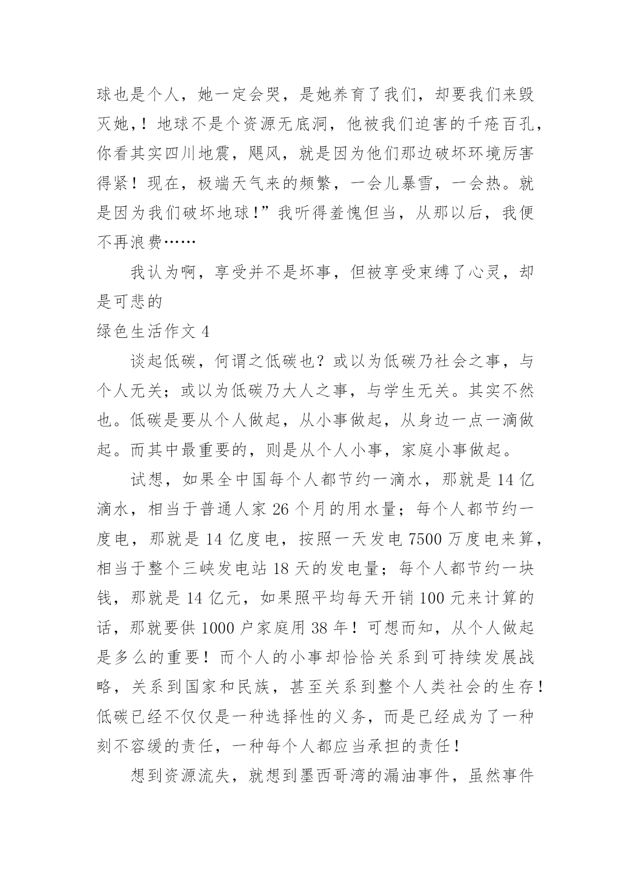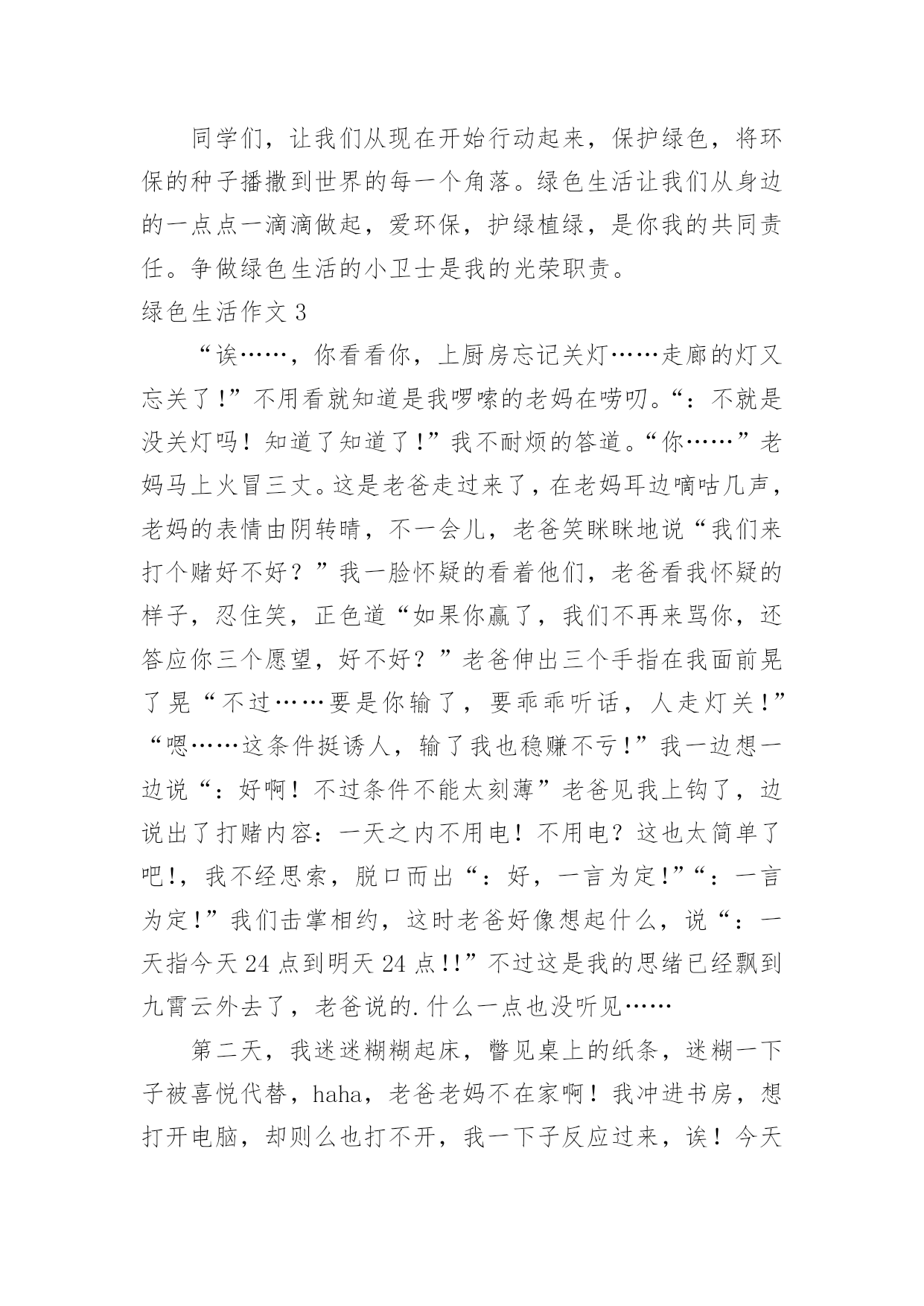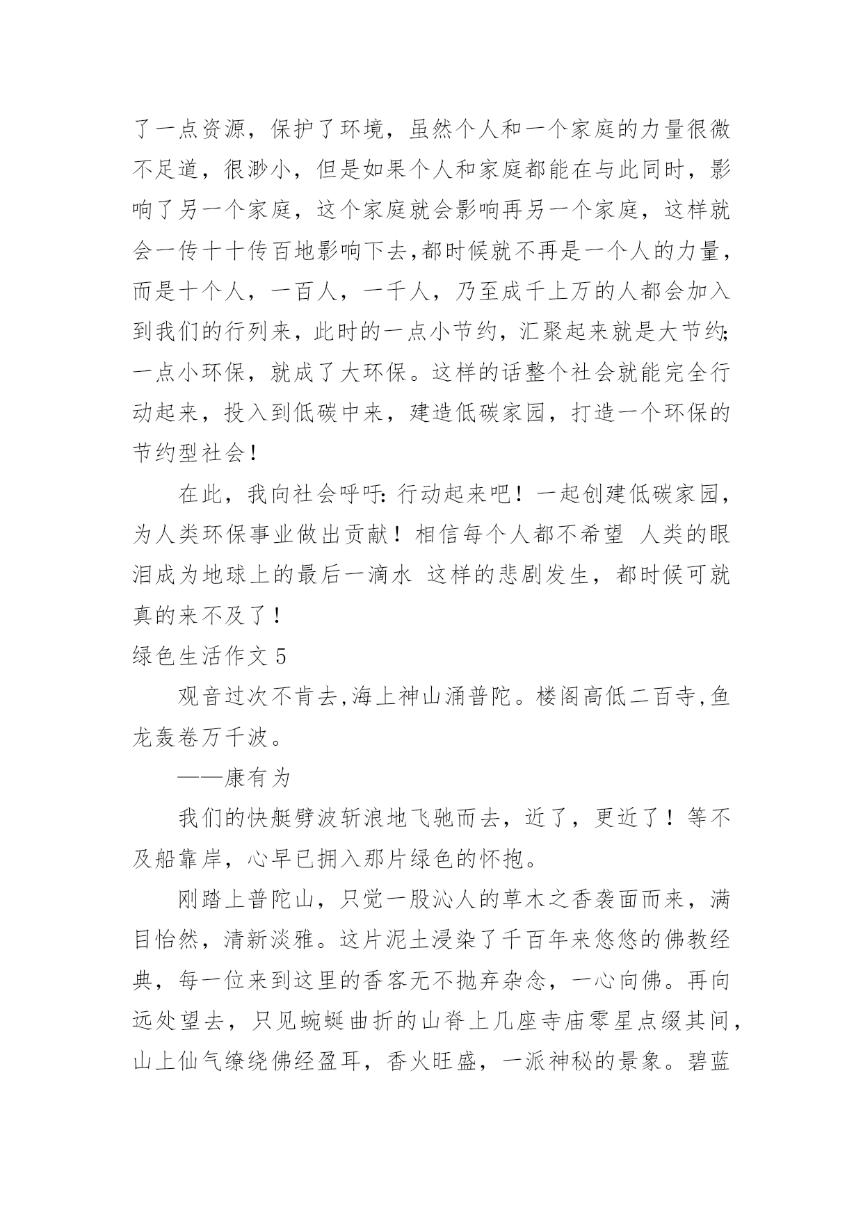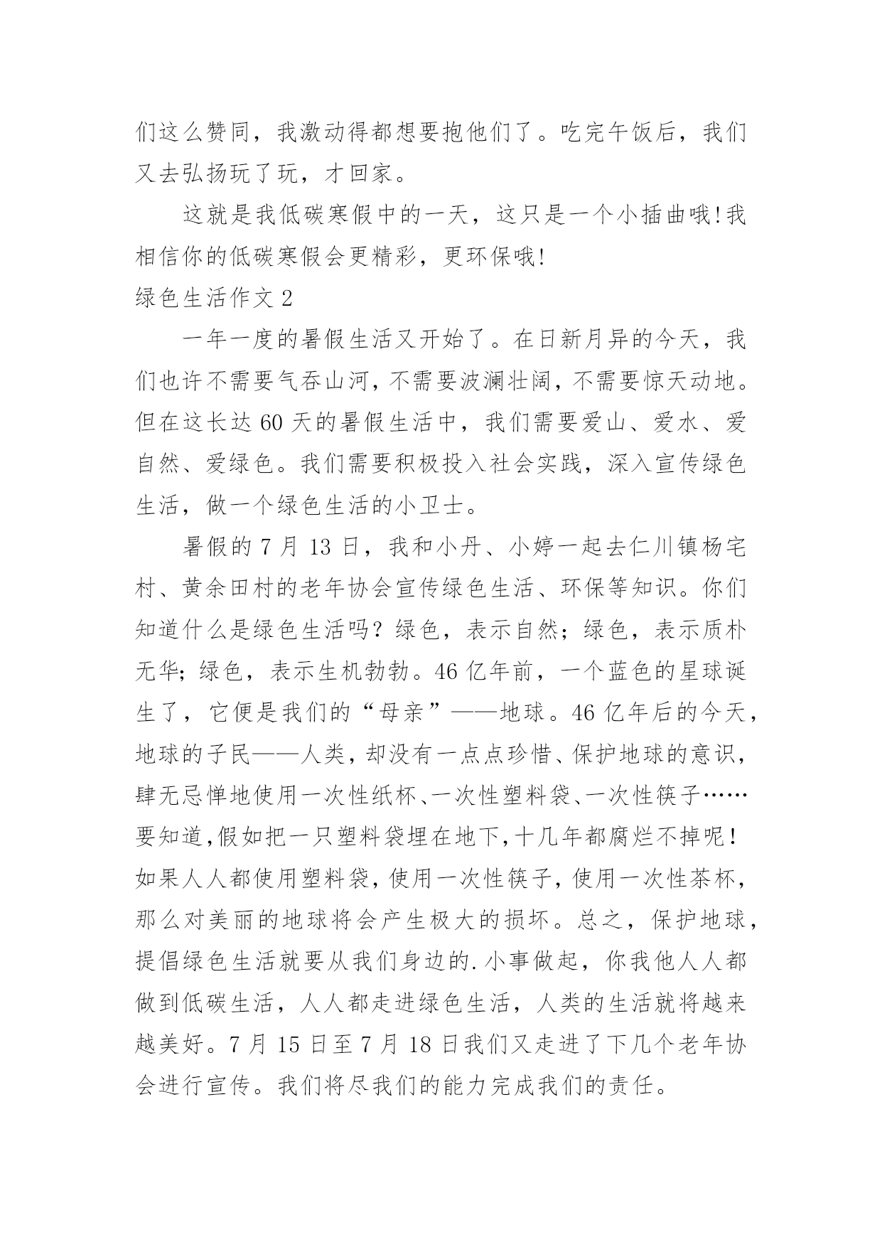 绿色生活作文(热)绿色生活作文12篇在平日的学习、工作和生活里,大家一定都接触过作文吧,写作文可以锻炼我们的独处习惯,让自己的心静下来,思考自己未来的方向。相信许多人会觉得作文很难写吧,以下是小编帮大家整理的绿色生活作文,欢迎阅读与收藏。绿色生活作文1此刻社会都讲究低碳生活,"低碳"这个词也就从此刻在了大家的心中,那么,在寒假即将结束之际,我问大家一句:"你们的寒假低碳了吗"答案是肯定的。但每个人的寒假都各不相同,你们的低碳寒假是怎样度过的呢我不明白,但我却有一个不一样凡响的低碳寒假。在寒假中,有一天最令我记忆犹新。那天我和爸爸妈妈一齐去购物。刚出家门,在爸爸正准备开动汽车时,我突然大吼一声:"停!"爸爸妈妈随即用诧异的眼神望着我。我调整了一下去购物的激动心境,缓慢地说道:"此刻大家都讲究低碳生活了,要少开私家车,能不开就不要开,私家车排出的尾气会污染空气,破坏大气层。我们不能在自我兴高采烈的时候,破坏了环境,所以说,今日我们就不要开车了,坐公交吧!"爸爸妈妈听了,恍然大悟,连连点头。我们一家人正准备上路时,妈妈问了一句:"有没有带袋子""没有。"我和爸爸齐声回答。"那怎样行啊!得回去拿。""为什么啊,门都锁好了,到时候买一个不就得了嘛!"爸爸反驳道。这时,我经过妈妈的提醒,明白了其中用意,便对爸爸说:"出门购物,尽量自我带环保袋,无论是免费或者收费的塑料袋,都减少使用,这是低碳生活的定律之一。""哦,原先是这样啊!"爸爸听罢,二话不说便把门打开,取出了环保袋。一家人欢天喜地地上路了。到了购物广场,我们开始了疯狂购物,妈妈这个也要买,那个也要买。最终,爸爸实在看不下去了,便搬出了低碳生活定律:"老婆,少买不必要的衣服。服装在生产、加工和运输过程中,要消耗很多的能源,同时产生废气、废水等污染物。在保证生活需要的前提下,每人每年少买一件不必要的衣服可节能约2.5千克标准煤,相应减排二氧化碳6.4千克。如果全国每年有2500万人做到这一点,就能够节能约6.25万吨标准煤,减排二氧化碳16万吨呢,所以说,不要买了,不仅仅浪费钱,还破坏了环境。"妈妈一听,吓得花容失色,赶忙停止了她的疯狂采购计划,开始精挑细选,如此,我们的行程又减少了一大半。最终结束了采购,我们开开心心的`跑去"傣妹"吃火锅。当点菜时,我又发挥了环保大使的作风,义正言辞的说:"爸爸妈妈,我们少点一些荤菜吧,因为.肉类在生产、加工及处理过程中排放的温室气体尤其高,全球约50%的温室气体源自生产肉类。包括飞机、火车、汽车、摩托车的总排放量还多。所以,鼓励大家多菜少肉,吃素不吃肉1餐,减碳1100克,所以说,多点一些素菜吧!""好啊!"开始以为爸爸妈妈必须会反对,没想到他们这么赞同,我激动得都想要抱他们了。吃完午饭后,我们又去弘扬玩了玩,才回家。这就是我低碳寒假中的一天,这只是一个小插曲哦!我相信你的低碳寒假会更精彩,更环保哦!绿色生活作文2一年一度的暑假生活又开始了。在日新月异的今天,我们也许不需要气吞山河,不需要波澜壮阔,不需要惊天动地。但在这长达60天的暑假生活中,我们需要爱山、爱水、爱自然、爱绿色。我们需要积极投入社会实践,深入宣传绿色生活,做一个绿色生活的小卫士。暑假的7月13日,我和小丹、小婷一起去仁川镇杨宅村、黄余田村的老年协会宣传绿色生活、环保等知识。你们知道什么是绿色生活吗?绿色,表示自然;绿色,表示质朴无华;绿色,表示生机勃勃。46亿年前,一个蓝色的星球诞生了,它便是我们的“母亲”——地球。46亿年后的今天,地球的子民——人类,却没有一点点珍惜、保护地球的意识,肆无忌惮地使用一次性纸杯、一次性塑料袋、一次性筷子……要知道,假如把一只塑料袋埋在地下,十几年都腐烂不掉呢!如果人人都使用塑料袋,使用一次性筷子,使用一次性茶杯,那么对美丽的地球将会产生极大的损坏。总之,保护地球,提倡绿色生活就要从我们身边的.小事做起,你我他人人都做到低碳生活,人人都走进绿色生活,人类的生活就将越来越美好。7月15日至7月18日我们又走进了下几个老年协会进行宣传。我们将尽我们的能力完成我们的责任。窗外满树垂丝海棠,小骨蔷薇拥簇如云霞。深绿、浅绿、墨绿、翠绿、新绿……在不断蔓延、交织、盘旋,仿佛天地中只剩下了绿海。漫山遍野泛着迷人的绿光,一浪接一浪翻滚着,此起彼伏,像碧玉,像翡翠。但夏天的太阳像火球一样炙烤着大地,今年的暑假又遇到了严重的干旱,农民伯伯辛辛苦苦种起来的农作物都快被晒死了。我对爸爸说:“真可惜呀,田野里的庄稼,土地里的蔬菜,山上的小树苗、果林,也快被晒光了。看来,暑假是吃不到新鲜的水果和蔬菜了!这时,爸爸提议:“后山种了许多空心菜和青菜、山上还有果林,我们可以每天早上、晚上去浇水呀。”说干就干,于是,我组织了小婷、小丁等8个优秀少先队员,每天两次去浇水,还帮助杨龙龙