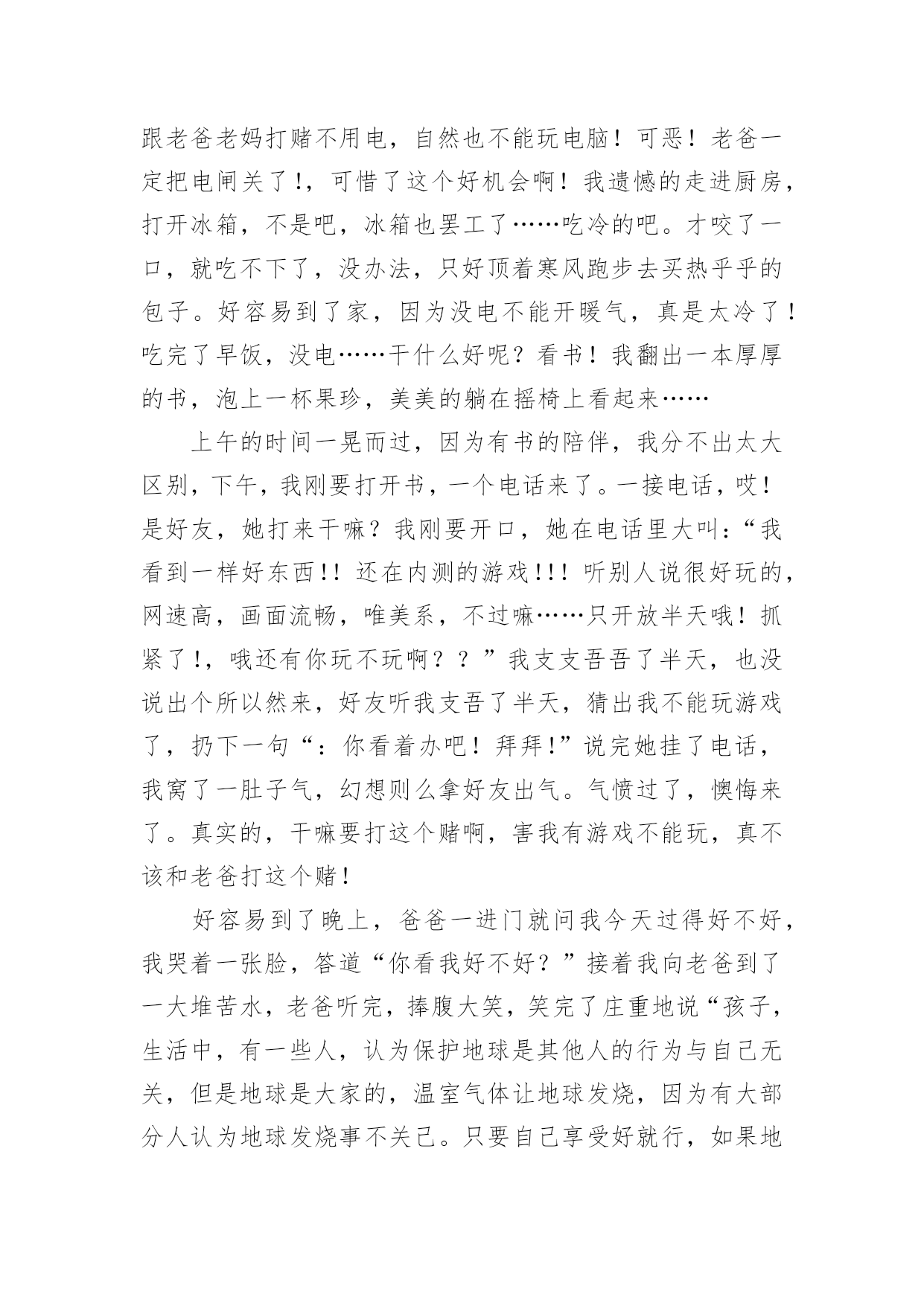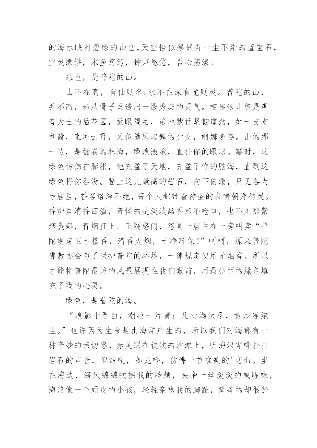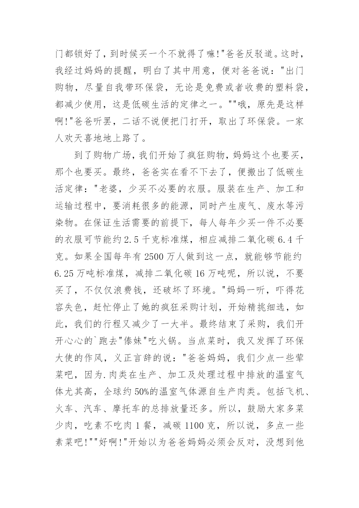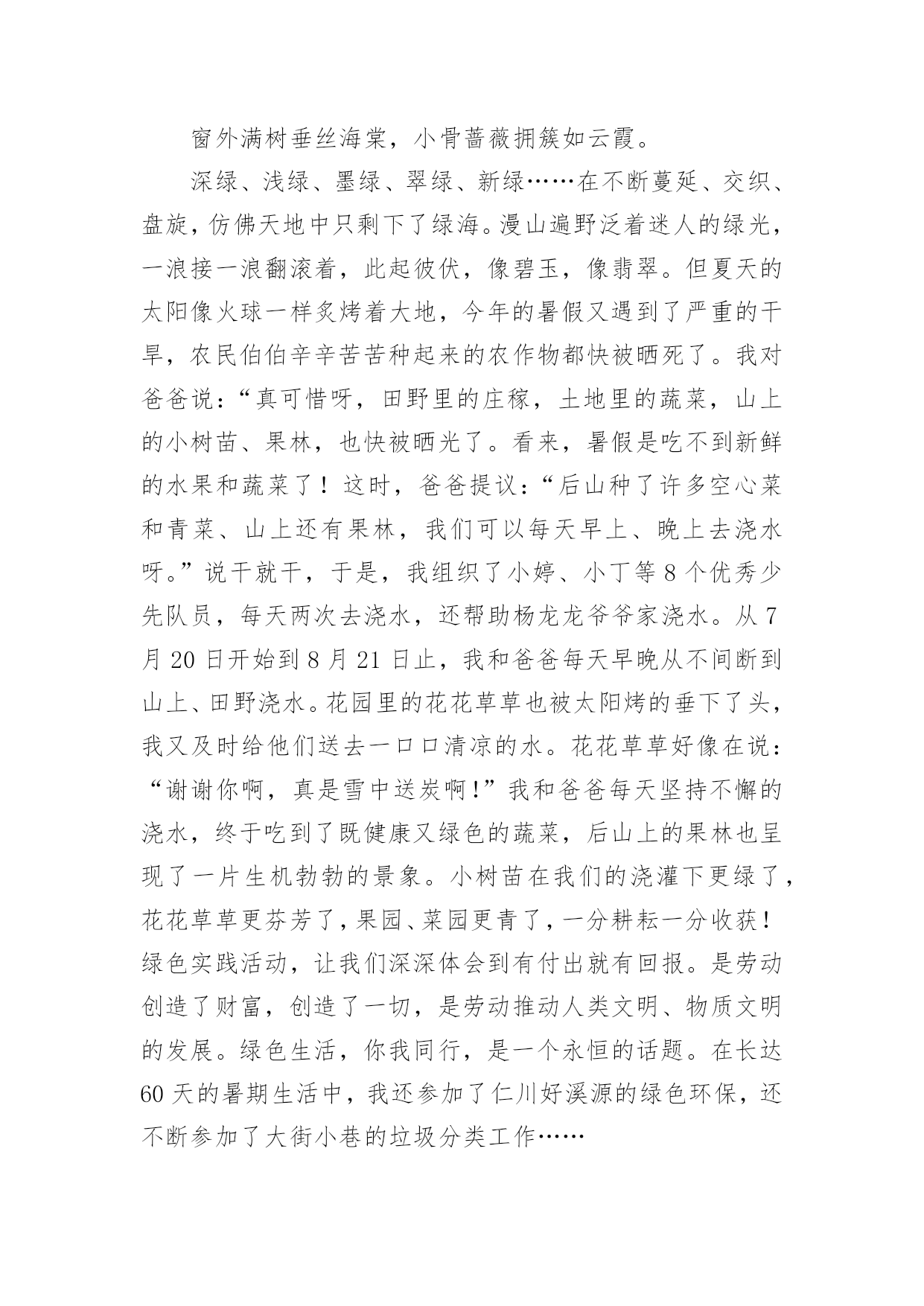 绿色生活作文(热)绿色生活作文12篇在平日的学习、工作和生活里,大家一定都接触过作文吧,写作文可以锻炼我们的独处习惯,让自己的心静下来,思考自己未来的方向。相信许多人会觉得作文很难写吧,以下是小编帮大家整理的绿色生活作文,欢迎阅读与收藏。绿色生活作文1此刻社会都讲究低碳生活,"低碳"这个词也就从此刻在了大家的心中,那么,在寒假即将结束之际,我问大家一句:"你们的寒假低碳了吗"答案是肯定的。但每个人的寒假都各不相同,你们的低碳寒假是怎样度过的呢我不明白,但我却有一个不一样凡响的低碳寒假。在寒假中,有一天最令我记忆犹新。那天我和爸爸妈妈一齐去购物。刚出家门,在爸爸正准备开动汽车时,我突然大吼一声:"停!"爸爸妈妈随即用诧异的眼神望着我。我调整了一下去购物的激动心境,缓慢地说道:"此刻大家都讲究低碳生活了,要少开私家车,能不开就不要开,私家车排出的尾气会污染空气,破坏大气层。我们不能在自我兴高采烈的时候,破坏了环境,所以说,今日我们就不要开车了,坐公交吧!"爸爸妈妈听了,恍然大悟,连连点头。我们一家人正准备上路时,妈妈问了一句:"有没有带袋子""没有。"我和爸爸齐声回答。"那怎样行啊!得回去拿。""为什么啊,门都锁好了,到时候买一个不就得了嘛!"爸爸反驳道。这时,我经过妈妈的提醒,明白了其中用意,便对爸爸说:"出门购物,尽量自我带环保袋,无论是免费或者收费的塑料袋,都减少使用,这是低碳生活的定律之一。""哦,原先是这样啊!"爸爸听罢,二话不说便把门打开,取出了环保袋。一家人欢天喜地地上路了。到了购物广场,我们开始了疯狂购物,妈妈这个也要买,那个也要买。最终,爸爸实在看不下去了,便搬出了低碳生活定律:"老婆,少买不必要的衣服。服装在生产、加工和运输过程中,要消耗很多的能源,同时产生废气、废水等污染物。在保证生活需要的前提下,每人每年少买一件不必要的衣服可节能约2.5千克标准煤,相应减排二氧化碳6.4千克。如果全国每年有2500万人做到这一点,就能够节能约6.25万吨标准煤,减排二氧化碳16万吨呢,所以说,不要买了,不仅仅浪费钱,还破坏了环境。"妈妈一听,吓得花容失色,赶忙停止了她的疯狂采购计划,开始精挑细选,如此,我们的行程又减少了一大半。最终结束了采购,我们开开心心的`跑去"傣妹"吃火锅。当点菜时,我又发挥了环保大使的作风,义正言辞的说:"爸爸妈妈,我们少点一些荤菜吧,因为.肉类在生产、加工及处理过程中排放的温室气体尤其高,全球约50%的温室气体源自生产肉类。包括飞机、火车、汽车、摩托车的总排放量还多。所以,鼓励大家多菜少肉,吃素不吃肉1餐,减碳1100克,所以说,多点一些素菜吧!""好啊!"开始以为爸爸妈妈必须会反对,没想到他们这么赞同,我激动得都想要抱他们了。吃完午饭后,我们又去弘扬玩了玩,才回家。这就是我低碳寒假中的一天,这只是一个小插曲哦!我相信你的低碳寒假会更精彩,更环保哦!绿色生活作文2一年一度的暑假生活又开始了。在日新月异的今天,我们也许不需要气吞山河,不需要波澜壮阔,不需要惊天动地。但在这长达60天的暑假生活中,我们需要爱山、爱水、爱自然、爱绿色。我们需要积极投入社会实践,深入宣传绿色生活,做一个绿色生活的小卫士。暑假的7月13日,我和小丹、小婷一起去仁川镇杨宅村、黄余田村的老年协会宣传绿色生活、环保等知识。你们知道什么是绿色生活吗?绿色,表示自然;绿色,表示质朴无华;绿色,表示生机勃勃。46亿年前,一个蓝色的星球诞生了,它便是我们的“母亲”——地球。46亿年后的今天,地球的子民——人类,却没有一点点珍惜、保护地球的意识,肆无忌惮地使用一次性纸杯、一次性塑料袋、一次性筷子……要知道,假如把一只塑料袋埋在地下,十几年都腐烂不掉呢!如果人人都使用塑料袋,使用一次性筷子,使用一次性茶杯,那么对美丽的地球将会产生极大的损坏。总之,保护地球,提倡绿色生活就要从我们身边的.小事做起,你我他人人都做到低碳生活,人人都走进绿色生活,人类的生活就将越来越美好。7月15日至7月18日我们又走进了下几个老年协会进行宣传。我们将尽我们的能力完成我们的责任。窗外满树垂丝海棠,小骨蔷薇拥簇如云霞。深绿、浅绿、墨绿、翠绿、新绿……在不断蔓延、交织、盘旋,仿佛天地中只剩下了绿海。漫山遍野泛着迷人的绿光,一浪接一浪翻滚着,此起彼伏,像碧玉,像翡翠。但夏天的太阳像火球一样炙烤着大地,今年的暑假又遇到了严重的干旱,农民伯伯辛辛苦苦种起来的农作物都快被晒死了。我对爸爸说:“真可惜呀,田野里的庄稼,土地里的蔬菜,山上的小树苗、果林,也快被晒光了。看来,暑假是吃不到新鲜的水果和蔬菜了!这时,爸爸提议:“后山种了许多空心菜和青菜、山上还有果林,我们可以每天早上、晚上去浇水呀。”说干就干,于是,我组织了小婷、小丁等8个优秀少先队员,每天两次去浇水,还帮助杨龙龙