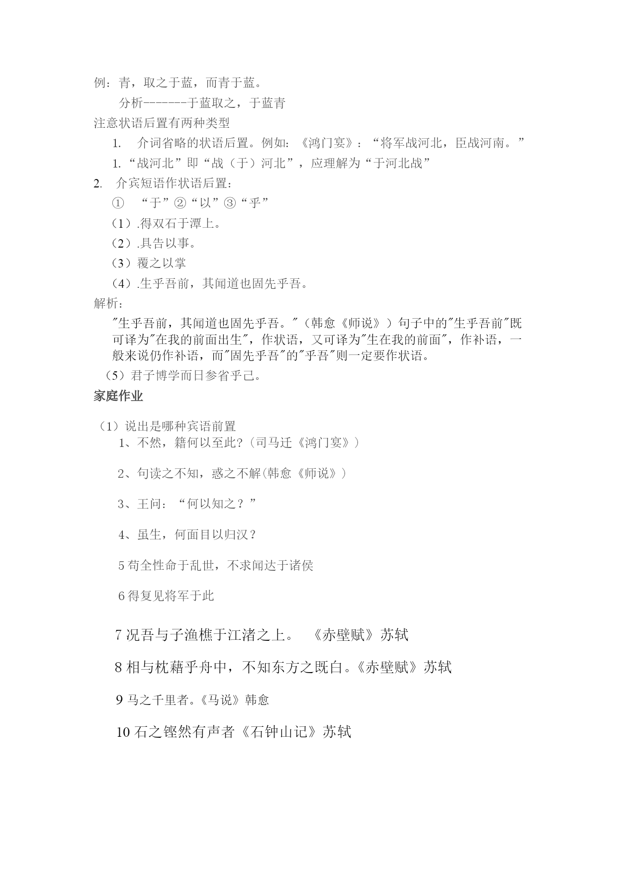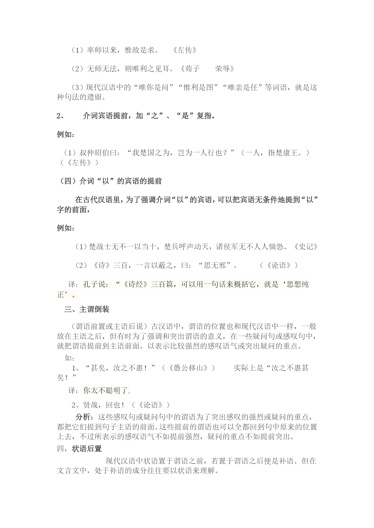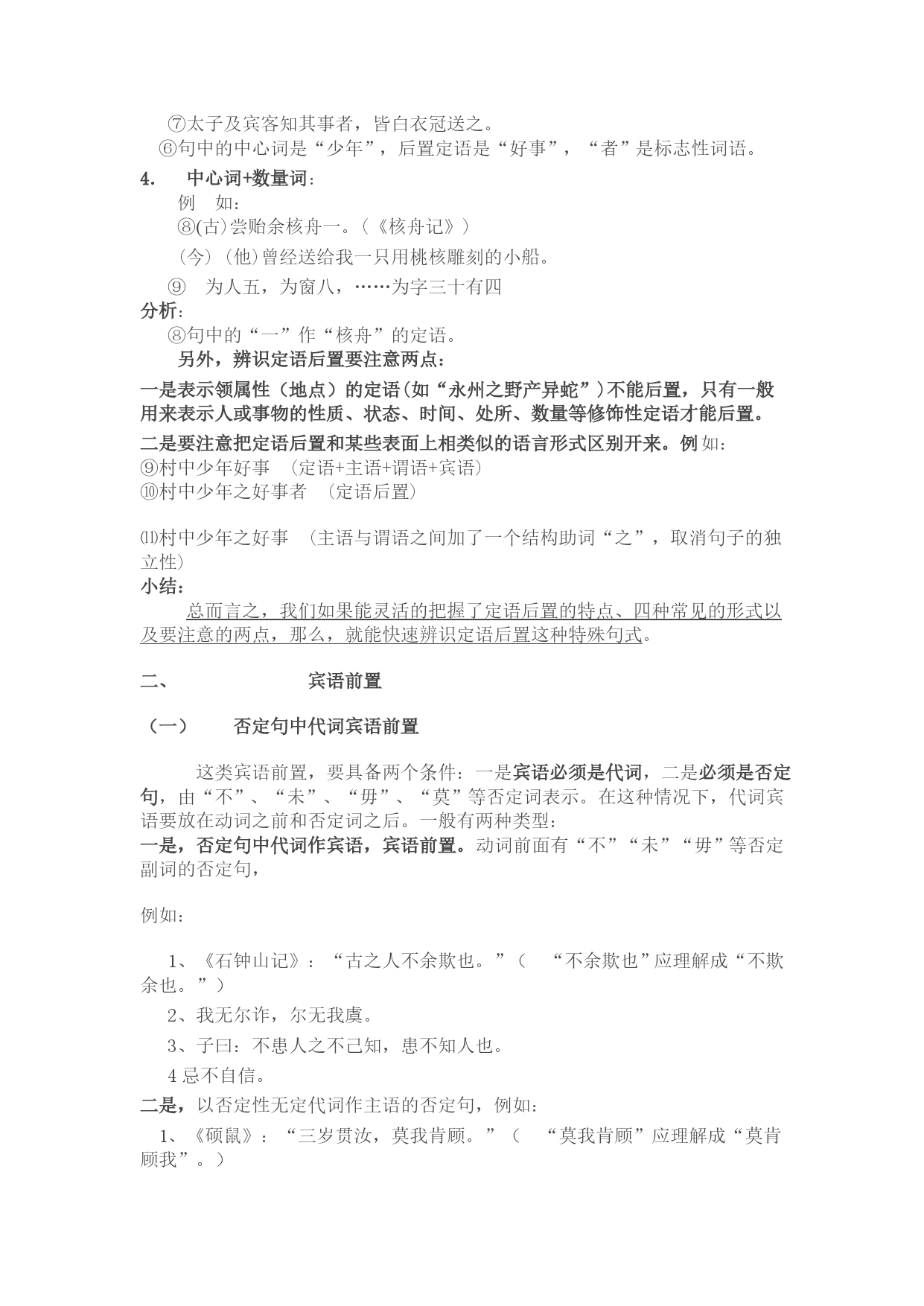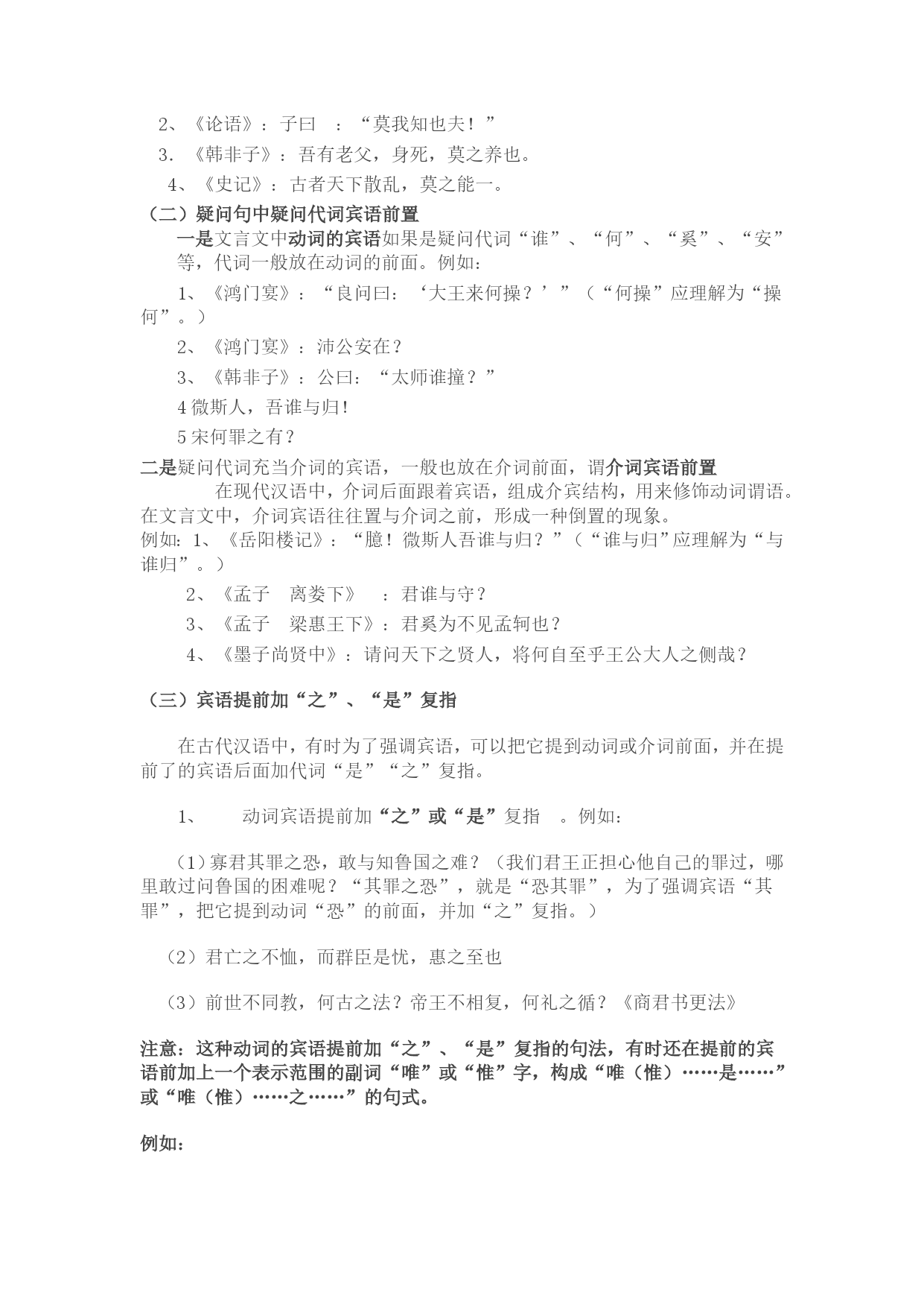 文言文中的倒装句式牢记句子成分结构图:(定)主+(状)谓+(定)宾(补),这是一切语法知识的根本!一、定语后置我们知道,定语(形容词或形容词性短语)是用来限制或修饰中心词(名词或名词性短语)的,一般放在中心词的前面。在古汉语里,有时为了强调和突出定语,把它放到中心词的后面,这种语法现象就称为定语后置。形式变为:主(定)+谓+宾或者:主+谓+宾(定)定语后置一般有标志性的词语。所以,我们可以根据这些特点把它归结为四种常见的形式:二、1.中心词+之+后置定语例如①(古)蚓无爪牙之利,筋骨之强。(《劝学》)(今)蚯蚓没有锋利的爪牙,强健的筋骨。②(古)居庙堂之高则忧其民,处江湖之远则忧其君。(《岳阳楼记》)(今)处在高高的庙堂上,就为他的人民忧虑,处在僻远的江湖间,就替他的君主担忧。分析:①②句中的中心词分别是“爪牙”、“筋骨”、“庙堂”、“江湖”,后置定语分别是“利”、“强”、“高”、“远”,四个“之”是定语后置句的标志,无实在意义。2.中心词+之(而)+后置定语+者例如:③(古)马之千里者,一食或尽粟一石。(《马说》)(今)能日行千里的马,吃一顿有时要吃一担粮食。④(古)此四者,天下之穷民而无告者。(《孟子"梁惠王下》)(今)这四种人,是天下无依无靠的走投无路的老百姓。⑤石之铿然有声者,所在皆是也。分析:③④句中的中心词分别是“马”、“穷民”,后置定语分别是“千里”、“无告”,标志性的词语分别是“之……者”、“而……者”,其中的“者”相当现代汉语中联系定语和中心词的结构助词“的”。3.中心词+后置定语+者例如:⑥(古)村中少年好事者,驯养一虫。(《促织》)(今)村里好事的少年,养了一只蟋蟀。⑦太子及宾客知其事者,皆白衣冠送之。⑥句中的中心词是“少年”,后置定语是“好事”,“者”是标志性词语。4.中心词+数量词:例如:⑧(古)尝贻余核舟一。(《核舟记》)(今)(他)曾经送给我一只用桃核雕刻的小船。⑨为人五,为窗八,……为字三十有四分析:⑧句中的“一”作“核舟”的定语。另外,辨识定语后置要注意两点:一是表示领属性(地点)的定语(如“永州之野产异蛇”)不能后置,只有一般用来表示人或事物的性质、状态、时间、处所、数量等修饰性定语才能后置。二是要注意把定语后置和某些表面上相类似的语言形式区别开来。例如:⑨村中少年好事(定语+主语+谓语+宾语)⑩村中少年之好事者(定语后置)⑾村中少年之好事(主语与谓语之间加了一个结构助词“之”,取消句子的独立性)小结:总而言之,我们如果能灵活的把握了定语后置的特点、四种常见的形式以及要注意的两点,那么,就能快速辨识定语后置这种特殊句式。二、宾语前置(一)否定句中代词宾语前置这类宾语前置,要具备两个条件:一是宾语必须是代词,二是必须是否定句,由“不”、“未”、“毋”、“莫”等否定词表示。在这种情况下,代词宾语要放在动词之前和否定词之后。一般有两种类型:一是,否定句中代词作宾语,宾语前置。动词前面有“不”“未”“毋”等否定副词的否定句,例如:1、《石钟山记》:“古之人不余欺也。”(“不余欺也”应理解成“不欺余也。”)2、我无尔诈,尔无我虞。3、子曰:不患人之不己知,患不知人也。4忌不自信。二是,以否定性无定代词作主语的否定句,例如:1、《硕鼠》:“三岁贯汝,莫我肯顾。”(“莫我肯顾”应理解成“莫肯顾我”。)2、《论语》:子曰:“莫我知也夫!”3.《韩非子》:吾有老父,身死,莫之养也。4、《史记》:古者天下散乱,莫之能一。(二)疑问句中疑问代词宾语前置一是文言文中动词的宾语如果是疑问代词“谁”、“何”、“奚”、“安”等,代词一般放在动词的前面。例如:1、《鸿门宴》:“良问曰:‘大王来何操?’”(“何操”应理解为“操何”。)2、《鸿门宴》:沛公安在?3、《韩非子》:公曰:“太师谁撞?”4微斯人,吾谁与归!5宋何罪之有?二是疑问代词充当介词的宾语,一般也放在介词前面,谓介词宾语前置在现代汉语中,介词后面跟着宾语,组成介宾结构,用来修饰动词谓语。在文言文中,介词宾语往往置与介词之前,形成一种倒置的现象。例如:1、《岳阳楼记》:“臆!微斯人吾谁与归?”(“谁与归”应理解为“与谁归”。)2、《孟子离娄下》:君谁与守?3、《孟子梁惠王下》:君奚为不见孟轲也?4、《墨子尚贤中》:请问天下之贤人,将何自至乎王公大人之侧哉?(三)宾语提前加“之”、“是”复指在古代汉语中,有时为了强调宾语,可以把它提到动词或介词前面,并在提前了的宾语后面加代词“是”“之”复指。1、动词宾语提前加“之”或“是”复指。例如:(1)寡君其罪之恐,敢与知鲁国之难?(我们君王正担心他自己的罪过,哪里敢过问鲁国的困难呢?“其罪之恐”,就是“恐其罪”,为了强调宾语“