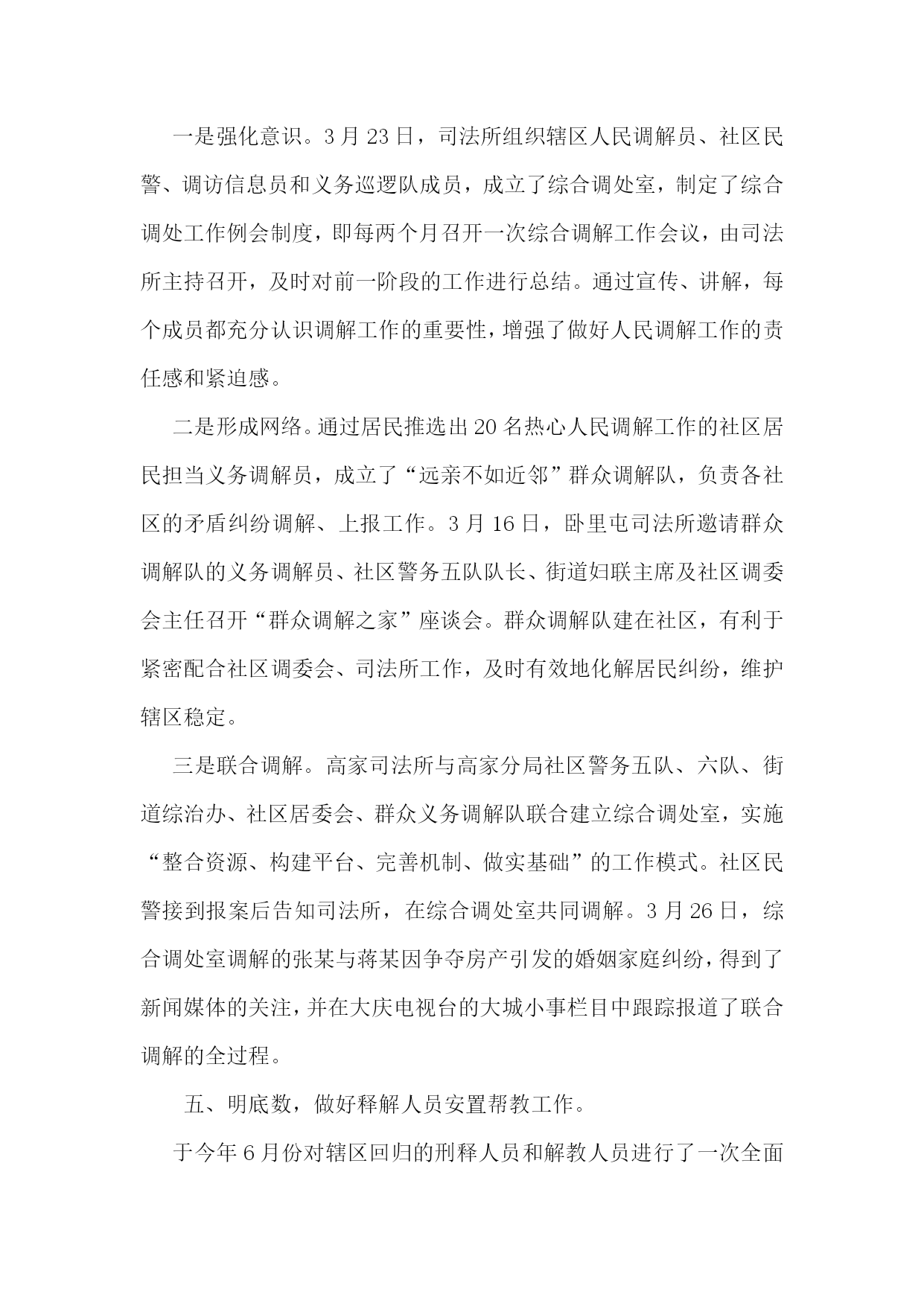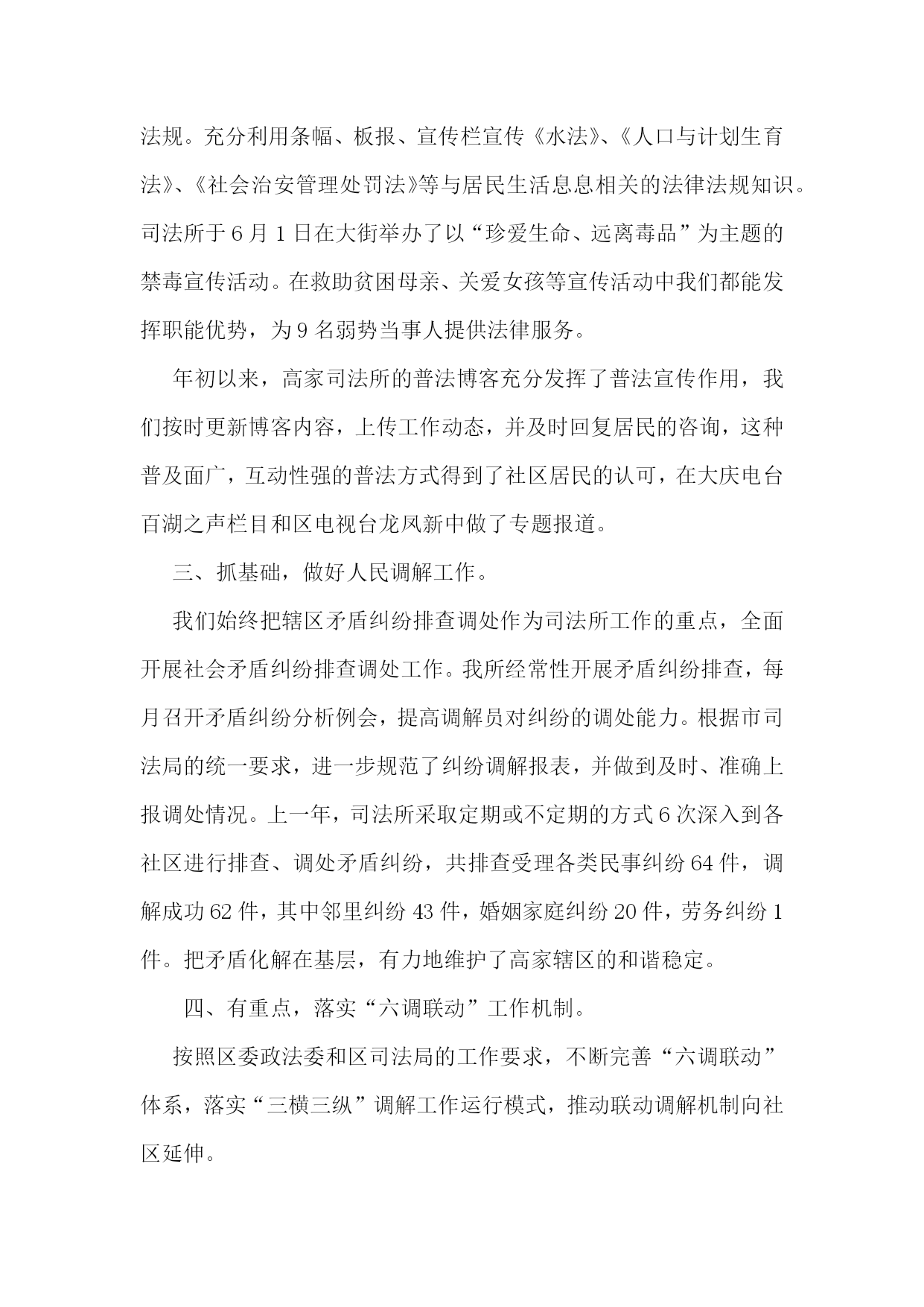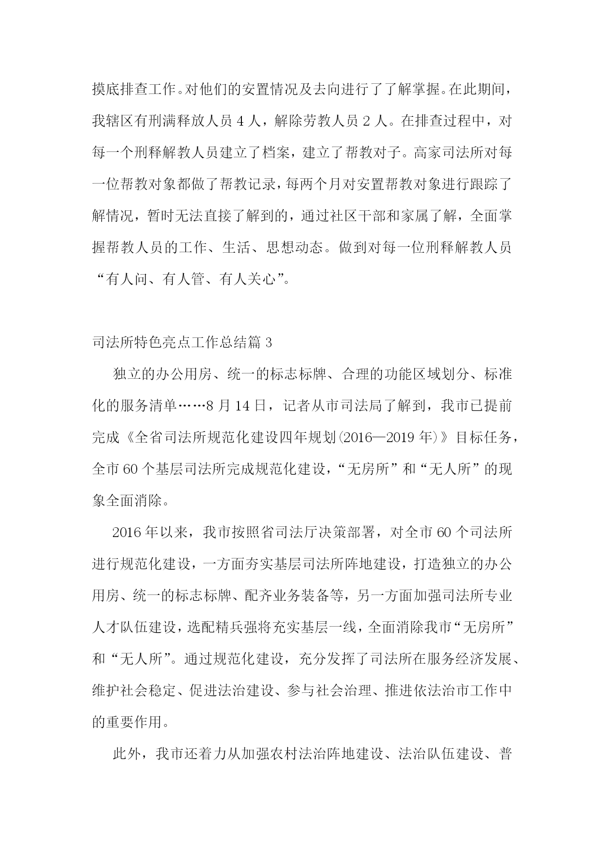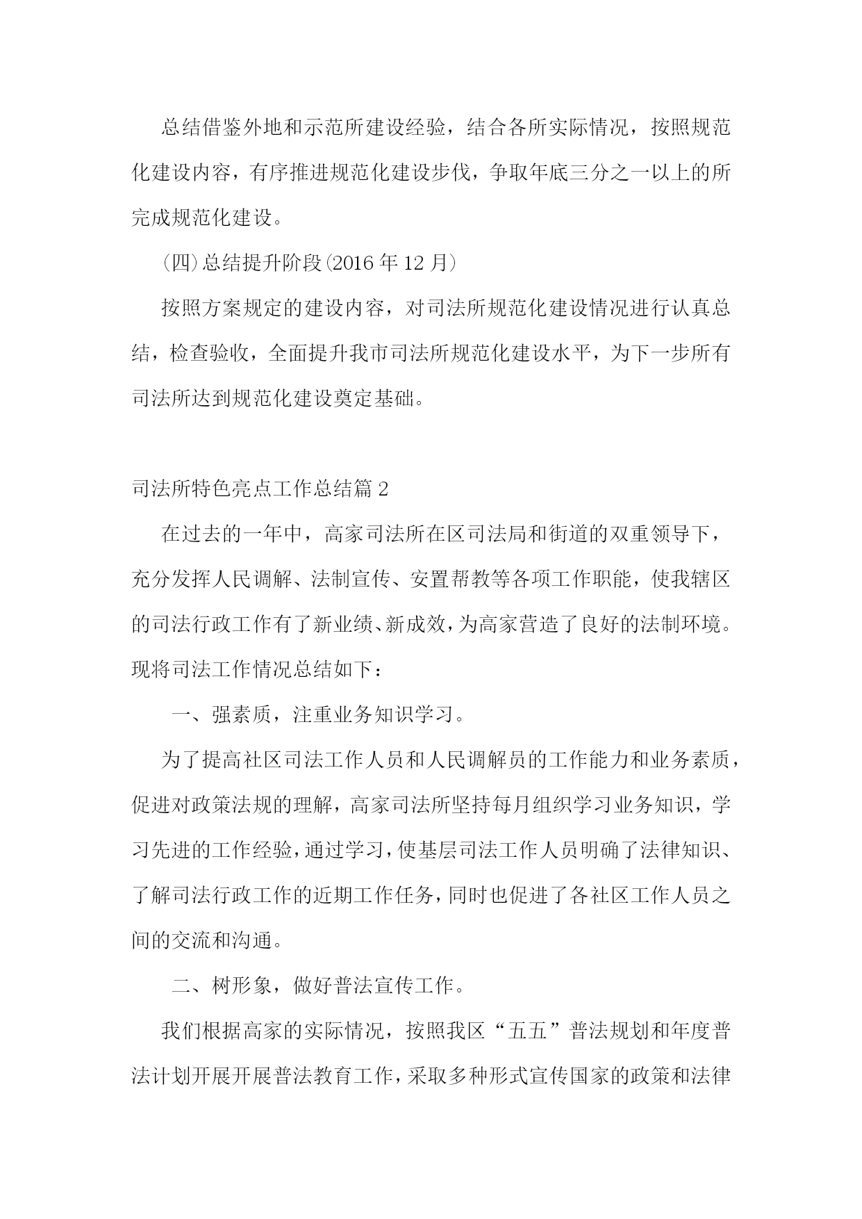 司法所特色亮点工作总结【四篇】司法所特色亮点工作总结篇1为全面实施全市司法行政基层基础建设工程,切实将司法所建设成一线实战单位,全面提升基层司法行政服务保障能力,有力推进司法行政事业跨越发展。根据上级有关规定和工作实际需要,现就进一步加强司法所规范化建设提出如下实施方案:一、建设内容(一)组织队伍建设1、司法所由编制部门批准设立,实行司法局和镇(街道)双重管理、以司法局为主的管理体制。2、司法所全称为新沂市司法局XX(司法所所在地地名,不含乡镇街道字样)司法所,并制作与名称一致的印章、标牌。3、司法所配备3名以上工作人员,定编人员在岗在位,公务员不兼职,分工明确。4、司法所实行所长负责制,设所长1人(根据需要可设副所长1人),必须由政法专项编制人员担任。5、所长和司法干事的任免、调动、提拔以司法局意见为主,并征求镇(街道)意见后,按干部管理权限和有关规定执行。6、司法所专职社工按标准配备到位(社区矫正对象按15:1,安置帮教对象按50:1配备专职社工),专职从事“两类人员”管理。7、镇(街道)调处中心配备2名以上专职人民调解员,且常驻司法所,工作性津贴落实到位。8、镇(街道)公共法律服务中心配备1名专职工作人员,专门从事公共法律服务工作,工资落实到位。9、工作人员业务能力强,考核绩效好,群众评价高。无违法犯罪或违纪行为受到党纪政纪处分。(二)管理制度建设1、司法所实行例会制度。司法局每个月组织召开一次司法所长会议,安排部署近期工作,学习司法行政业务知识,听取工作汇报,讨论交流工作方法。2、实行司法所所务管理“四公开”。工作职能、工作流程、工作规则公开;工作人员职责、职务、联系方式公开;工作人员每日工作去向公开;管理事物和工作过程依法公开。3、强化工作人员自身管理,做到所内纪律严明、作风严谨,分工明确、责任落实,考评公正、奖惩分明。4、健全完善请示汇报、政治业务学习、岗位目标责任、公开公示、廉政勤政、执法监督与执法过错责任追究、考评奖惩、档案管理和装备管理等各项管理制度;5、建立健全人民调解、社区矫正、安置帮教、法制宣传、依法治理、法律援助、公共法律服务等工作制度。6、建立司法所各项业务工作规范台账和各种登记簿,装订成册,分类归档,由专人负责保管,及时、准确统计上报各类业务报表。(三)基础设施建设1、办公场所标牌标识明显。司法所办公场所应保持整洁美观、庄重大方。除悬挂司法行政徽、司法所和调处服务中心以及公共法律服务中心标牌外,不得悬挂其他任何标牌、标识。2、司法行政徽应当端正悬挂司法所办公场所正门上方显著位置,按标准规格(直径70CM)执行,可结合司法所办公用房实际,按比例缩放,但不得改变司法行政徽图案、颜色和比例。3、司法所和调处服务中心标牌为竖式外挂标牌,司法所标牌悬挂于司法所正门左侧合适位置,调处服务中心(全称为新沂市ХХ镇或街道社会矛盾纠纷调处服务中心)标牌悬挂于司法所正门右侧合适位置,规格均为长165CM,宽31CM,字体为“文鼎CS大黑”。可结合司法所办公用房的实际,按比例缩放。公共法律服务中心(全称为新沂市ХХ镇或街道公共法律服务中心),可根据实际情况设置在司法所或便民服务中心,并在合适位置悬挂标牌(标牌规格由市局统一制作)。4、司法所业务用房面积要达到120㎡,示范所办公业务用房面积达到省优秀司法所标准(乡镇司法所220㎡以上,街道司法所180㎡以上)。5、业务用房功能设置合理,科学设置便民服务区、执法管理区、矛盾调处区、日常办公区等功能区域,司法所应设有所长办公室、多功能会议室、人民调解室、社区矫正室、安置帮教室、法治宣传室、法律援助室、档案资料室。各房间门外悬挂职能标识牌,室内公开明示各项工作制度、工作人员照片、姓名、职务、工作职责等内容。6、在司法所办公区适当位置设立政务公开栏、法制宣传栏及司法所工作人员去向明示栏。7、办公设备齐全,配齐电话、电脑(人均1台)、打印机、复印机、照相机、录音笔、执法仪等,能满足工作需要,利用充分,管理严格。各类信息平台运行正常,内外网终端设置符合相关要求。8、司法所工作经费按规定保障到位,专职社工、专职调解员生活补贴及调解员个案补贴落实到位。(四)业务能力建设司法所业务能力规范化按照《江苏省司法所基本工作规范(试行)》要求建设。二、实施步骤司法所规范化建设按照四个阶段推进实施。(一)动员部署阶段(2016年3月)召开规范化建设座谈会,了解各所规范化建设的困难和不足,进一步统一思想提高认识,各所要根据自身基础情况,制定切实可行的建设计划。(二)示范建设阶段(2016年4月-6月)在新安所和马陵山所开展试点建设,配强组织队伍,调整办公用房进行重新装修,建立远程监控和安置帮教分中心,建设我市司法所规范化建设的示范所。开展司法所业务集中培训活动,提高司法所工作人员业务规范化水平,开