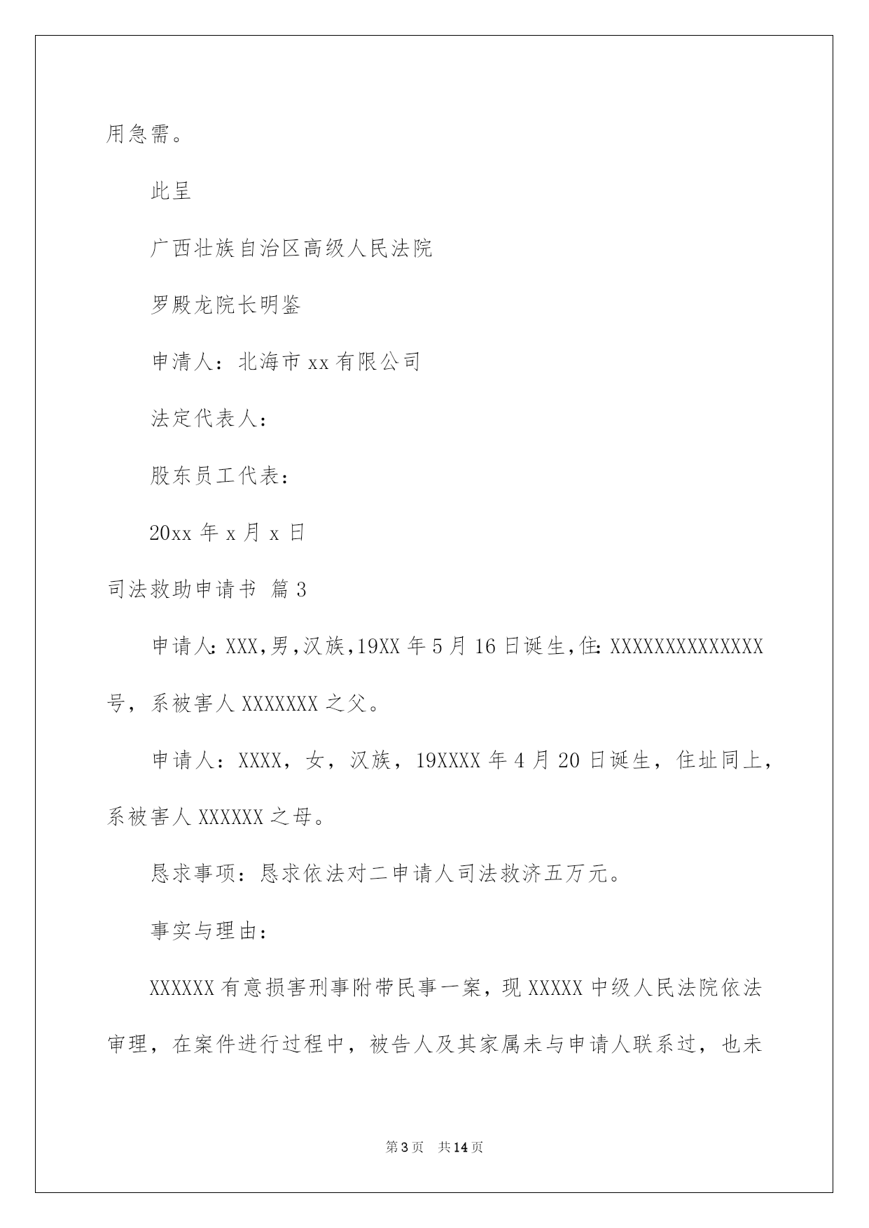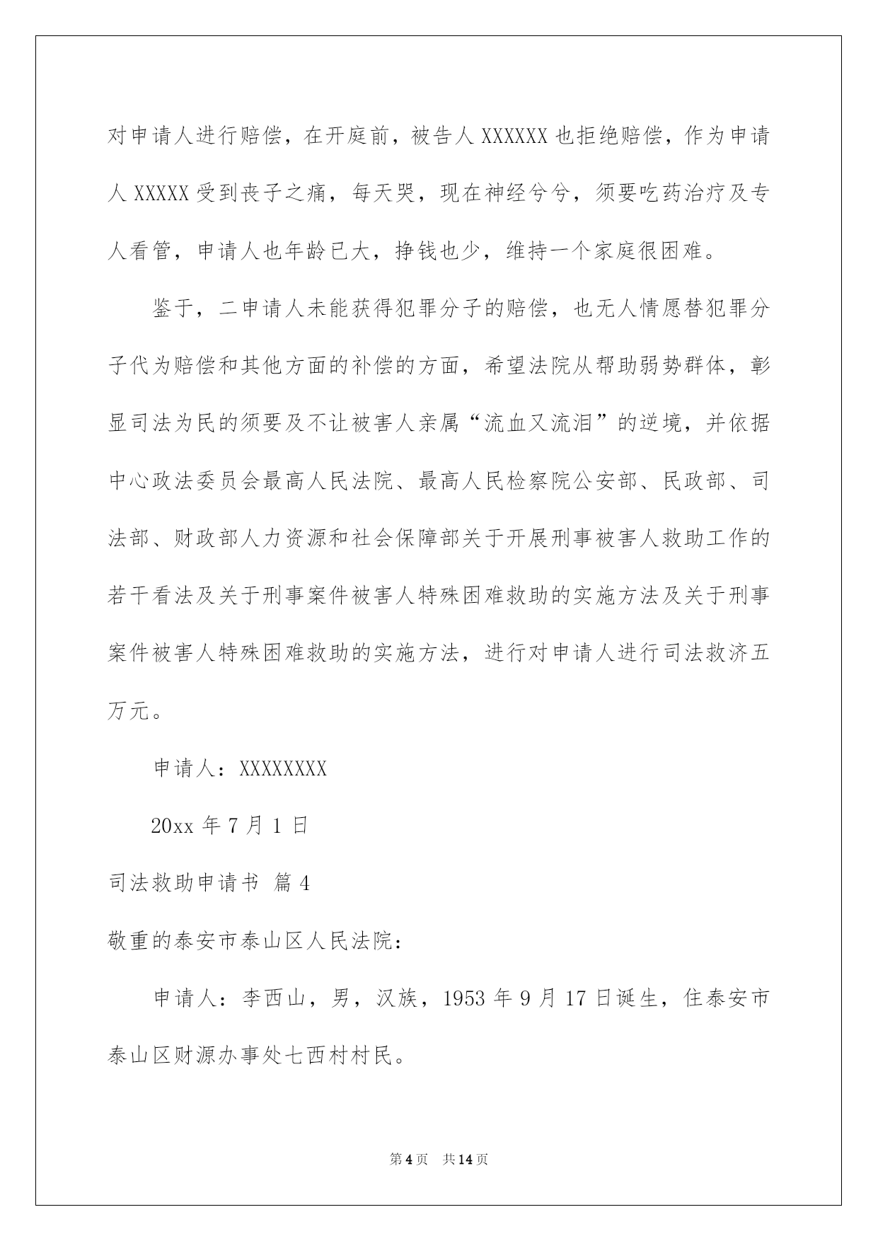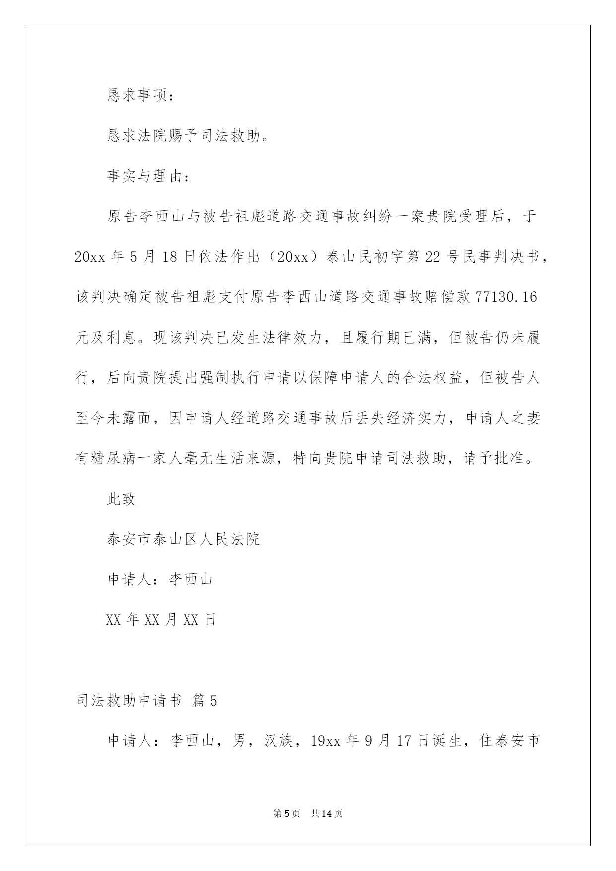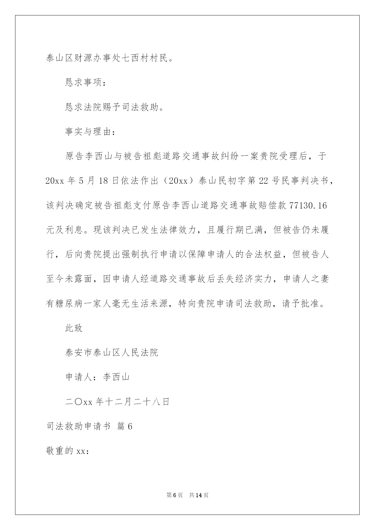 第PAGE\*Arabic\*MERGEFORMAT14页共NUMPAGES\*Arabic\*MERGEFORMAT14页第PAGE\*MERGEFORMAT14页共NUMPAGES\*MERGEFORMAT14页第PAGE\*MERGEFORMAT14页共NUMPAGES\*MERGEFORMAT14页第PAGE\*MERGEFORMAT14页共NUMPAGES\*MERGEFORMAT14页第PAGE\*MERGEFORMAT14页共NUMPAGES\*MERGEFORMAT14页第PAGE\*MERGEFORMAT14页共NUMPAGES\*MERGEFORMAT14页第PAGE\*MERGEFORMAT14页共NUMPAGES\*MERGEFORMAT14页第PAGE\*MERGEFORMAT14页共NUMPAGES\*MERGEFORMAT14页第PAGE\*MERGEFORMAT14页共NUMPAGES\*MERGEFORMAT14页第PAGE\*MERGEFORMAT14页共NUMPAGES\*MERGEFORMAT14页第PAGE\*MERGEFORMAT14页共NUMPAGES\*MERGEFORMAT14页2022司法救助申请书关于司法救助申请书十篇在现在社会,申请书运用的次数愈发增长,我们在写申请书的时候要切忌长篇大论。那么大家知道正规的申请书怎么写吗?下面是我为大家收集的司法救助申请书10篇,仅供参考,大家一起来看看吧。司法救助申请书篇1XX县人民法院:贵院受理的申请人邹XX诉吴XX、中国人寿财产保险股份有限公司XX分公司一案,现申请人邹XX由于交通事故致残且无固定生活来源,无法全额缴纳诉讼费,特向法院申请缓(免)诉讼费,请予准许。此致XX县人民法院申请人:XXX年X月X日司法救助申请书篇2申请人刘保民、男73岁、汉族、原北海市宝美有限公司董事长,现无业无居所。户藉所在地:湖北省鄂洲市鄂城区。暂寄住祖藉:江西省宜丰县棠浦镇南坪村。唐必凤、女、44岁、汉族、原北海市宝美有限公司股东、总经理助理,现无业无居所。户藉所在地:广西北海市海城区。暂寄住江西省宜丰县棠浦镇南坪村。1994年北海市宝美有限公司被北海市检察院违法扣押查封灭失400余万元商品财产,被北海市公安人员吕维澄等包庇犯罪、挟持会计出纳、纵容刀刺、枪击、***、侵占、绑架等严峻刑事侵害。全体股东员工被光身逐出北海、为维护法人公民合法权益,申清人长期缠于举债诉讼上访。十八年了,早己债台高筑,告债无门,生存危机重重。20xx年北海市宝美有限公司涉法上访群案,中心向广西交办。申请人知其宝美冤假错案处理,追责阻力大。为维持生存和规躲债务冲突激化等生存危机及社会稳定事故的发生。申请人首要诉求北海市公安机关对宝美公司报案上访十数年的公安人员挟持会计出纳包庇侵占罪犯、***盗绑架等严峻刑事犯罪立案追赃,以解生存债务危困急需。然北海市公安机关等只见雷声没有作为。无奈向广西高级人民法院申请司法救助50万元。以解生存、高额债务利息、听证诉讼律师费等费用急需。此呈广西壮族自治区高级人民法院罗殿龙院长明鉴申清人:北海市xx有限公司法定代表人:股东员工代表:20xx年x月x日司法救助申请书篇3申请人:XXX,男,汉族,19XX年5月16日诞生,住:XXXXXXXXXXXXXX号,系被害人XXXXXXX之父。申请人:XXXX,女,汉族,19XXXX年4月20日诞生,住址同上,系被害人XXXXXX之母。恳求事项:恳求依法对二申请人司法救济五万元。事实与理由:XXXXXX有意损害刑事附带民事一案,现XXXXX中级人民法院依法审理,在案件进行过程中,被告人及其家属未与申请人联系过,也未对申请人进行赔偿,在开庭前,被告人XXXXXX也拒绝赔偿,作为申请人XXXXX受到丧子之痛,每天哭,现在神经兮兮,须要吃药治疗及专人看管,申请人也年龄已大,挣钱也少,维持一个家庭很困难。鉴于,二申请人未能获得犯罪分子的赔偿,也无人情愿替犯罪分子代为赔偿和其他方面的补偿的方面,希望法院从帮助弱势群体,彰显司法为民的须要及不让被害人亲属“流血又流泪”的逆境,并依据中心政法委员会最高人民法院、最高人民检察院公安部、民政部、司法部、财政部人力资源和社会保障部关于开展刑事被害人救助工作的若干看法及关于刑事案件被害人特殊困难救助的实施方法及关于刑事案件被害人特殊困难救助的实施方法,进行对申请人进行司法救济五万元。申请人:XXXXXXXX20xx年7月1日司法救助申请书篇4敬重的泰安市泰山区人民法院:申请人:李西山,男,汉族,1953年9月17日诞生,住泰安
