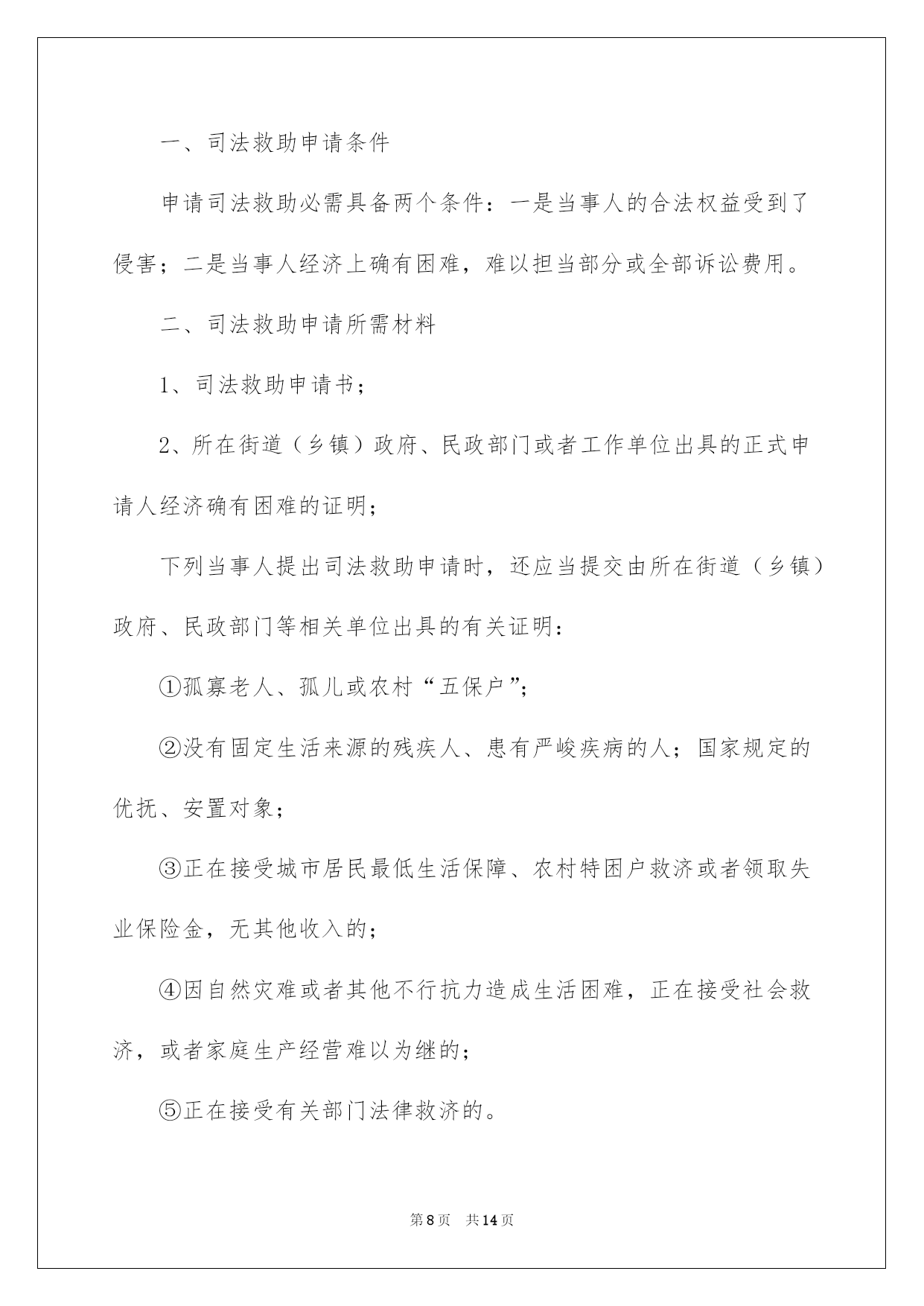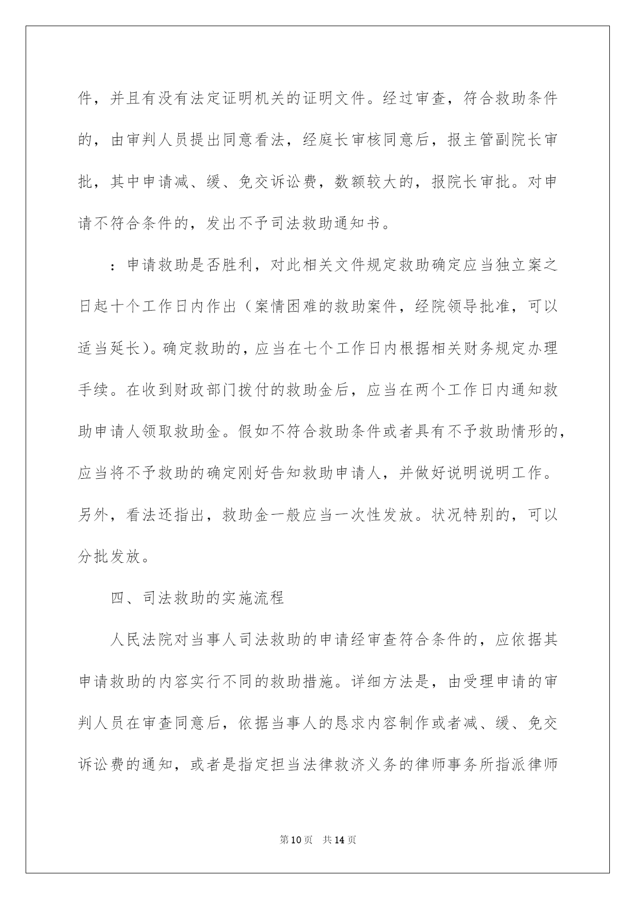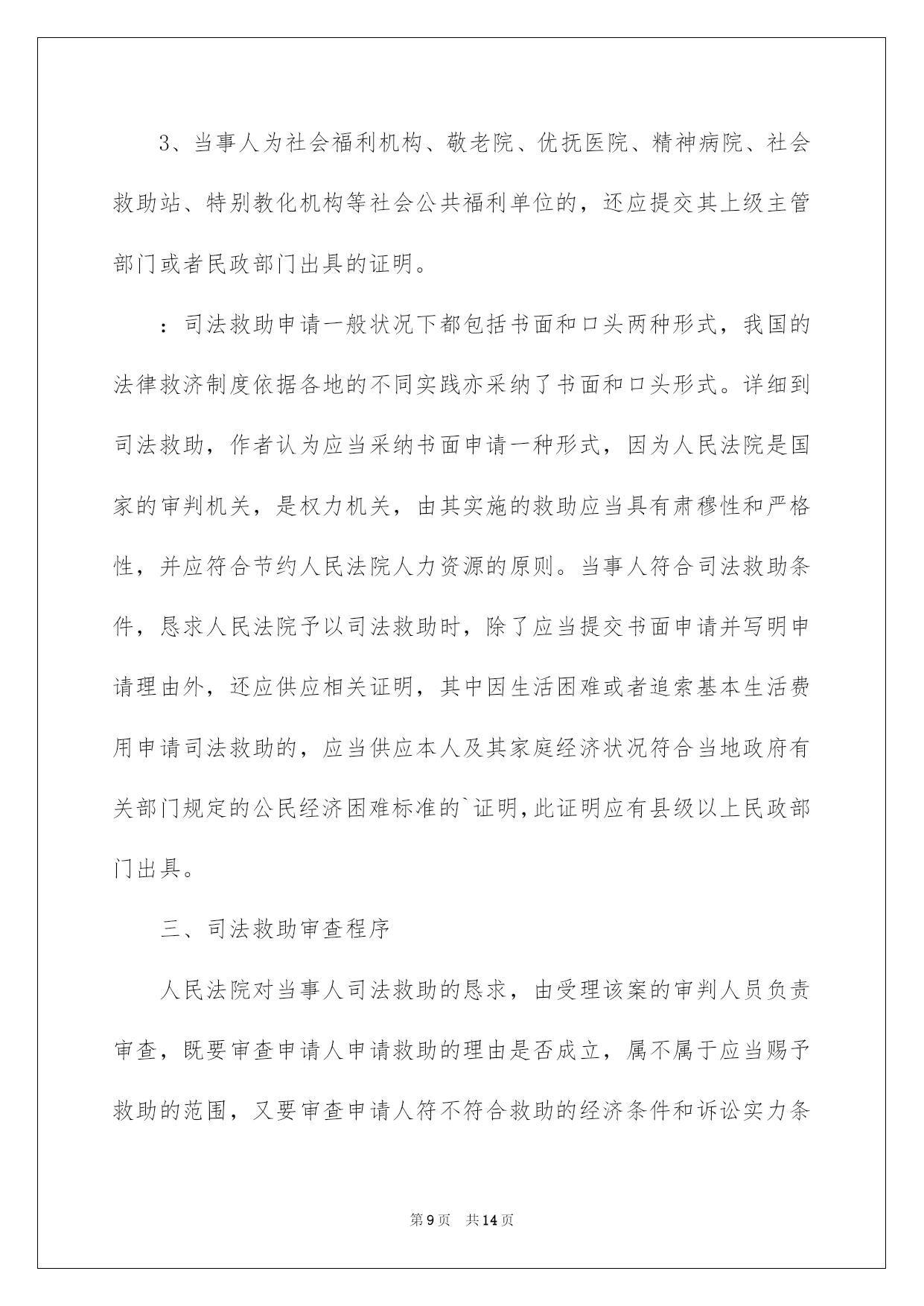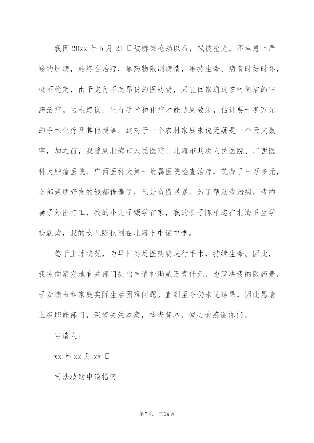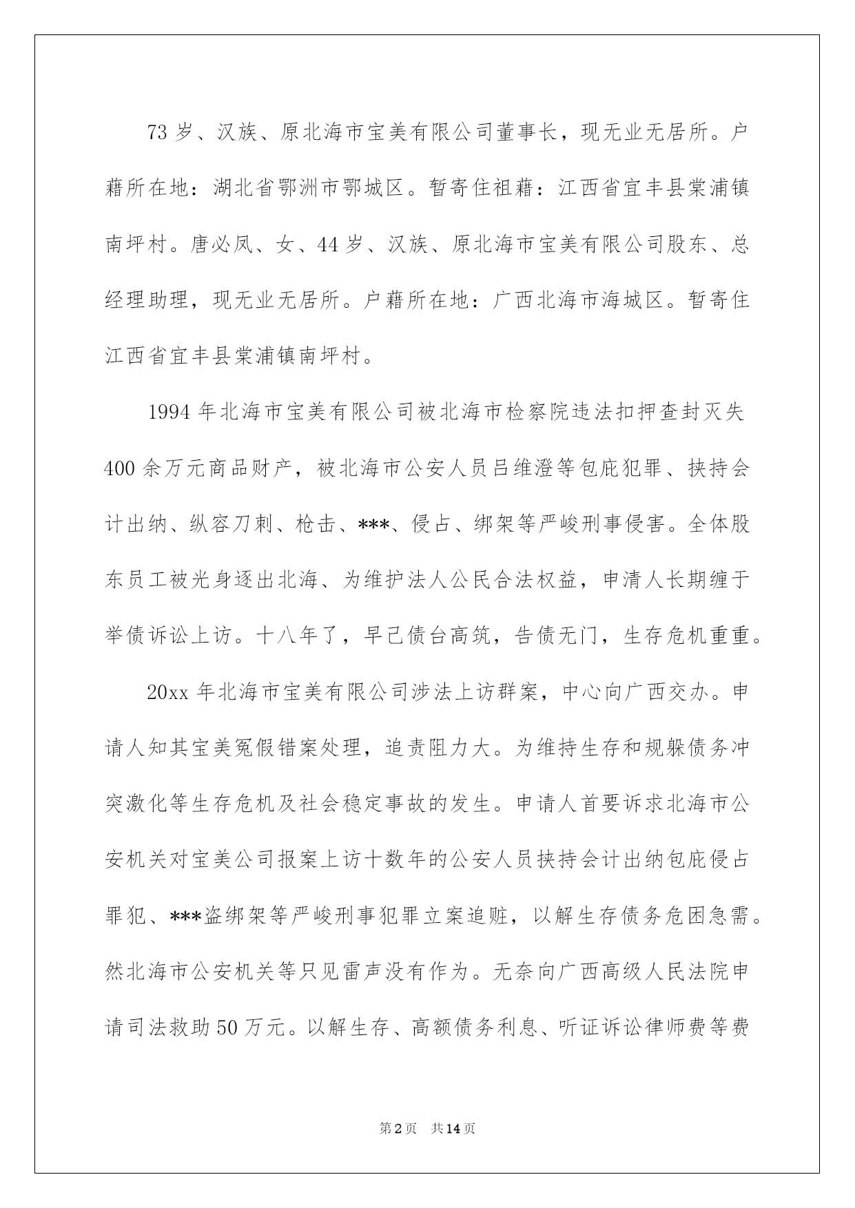 第PAGE\*Arabic\*MERGEFORMAT14页共NUMPAGES\*Arabic\*MERGEFORMAT14页第PAGE\*MERGEFORMAT14页共NUMPAGES\*MERGEFORMAT14页第PAGE\*MERGEFORMAT14页共NUMPAGES\*MERGEFORMAT14页第PAGE\*MERGEFORMAT14页共NUMPAGES\*MERGEFORMAT14页第PAGE\*MERGEFORMAT14页共NUMPAGES\*MERGEFORMAT14页第PAGE\*MERGEFORMAT14页共NUMPAGES\*MERGEFORMAT14页第PAGE\*MERGEFORMAT14页共NUMPAGES\*MERGEFORMAT14页第PAGE\*MERGEFORMAT14页共NUMPAGES\*MERGEFORMAT14页第PAGE\*MERGEFORMAT14页共NUMPAGES\*MERGEFORMAT14页第PAGE\*MERGEFORMAT14页共NUMPAGES\*MERGEFORMAT14页第PAGE\*MERGEFORMAT14页共NUMPAGES\*MERGEFORMAT14页2022司法救助申请书关于司法救助申请书十篇在现在社会,申请书运用的次数愈发增长,我们在写申请书的时候要切忌长篇大论。那么大家知道正规的申请书怎么写吗?下面是我为大家收集的司法救助申请书10篇,仅供参考,大家一起来看看吧。司法救助申请书篇1XX县人民法院:贵院受理的申请人邹XX诉吴XX、中国人寿财产保险股份有限公司XX分公司一案,现申请人邹XX由于交通事故致残且无固定生活来源,无法全额缴纳诉讼费,特向法院申请缓(免)诉讼费,请予准许。此致XX县人民法院申请人:XXX年X月X日司法救助申请书篇2申请人刘保民、男73岁、汉族、原北海市宝美有限公司董事长,现无业无居所。户藉所在地:湖北省鄂洲市鄂城区。暂寄住祖藉:江西省宜丰县棠浦镇南坪村。唐必凤、女、44岁、汉族、原北海市宝美有限公司股东、总经理助理,现无业无居所。户藉所在地:广西北海市海城区。暂寄住江西省宜丰县棠浦镇南坪村。1994年北海市宝美有限公司被北海市检察院违法扣押查封灭失400余万元商品财产,被北海市公安人员吕维澄等包庇犯罪、挟持会计出纳、纵容刀刺、枪击、***、侵占、绑架等严峻刑事侵害。全体股东员工被光身逐出北海、为维护法人公民合法权益,申清人长期缠于举债诉讼上访。十八年了,早己债台高筑,告债无门,生存危机重重。20xx年北海市宝美有限公司涉法上访群案,中心向广西交办。申请人知其宝美冤假错案处理,追责阻力大。为维持生存和规躲债务冲突激化等生存危机及社会稳定事故的发生。申请人首要诉求北海市公安机关对宝美公司报案上访十数年的公安人员挟持会计出纳包庇侵占罪犯、***盗绑架等严峻刑事犯罪立案追赃,以解生存债务危困急需。然北海市公安机关等只见雷声没有作为。无奈向广西高级人民法院申请司法救助50万元。以解生存、高额债务利息、听证诉讼律师费等费用急需。此呈广西壮族自治区高级人民法院罗殿龙院长明鉴申清人:北海市xx有限公司法定代表人:股东员工代表:20xx年x月x日司法救助申请书篇3申请人:XXX,男,汉族,19XX年5月16日诞生,住:XXXXXXXXXXXXXX号,系被害人XXXXXXX之父。申请人:XXXX,女,汉族,19XXXX年4月20日诞生,住址同上,系被害人XXXXXX之母。恳求事项:恳求依法对二申请人司法救济五万元。事实与理由:XXXXXX有意损害刑事附带民事一案,现XXXXX中级人民法院依法审理,在案件进行过程中,被告人及其家属未与申请人联系过,也未对申请人进行赔偿,在开庭前,被告人XXXXXX也拒绝赔偿,作为申请人XXXXX受到丧子之痛,每天哭,现在神经兮兮,须要吃药治疗及专人看管,申请人也年龄已大,挣钱也少,维持一个家庭很困难。鉴于,二申请人未能获得犯罪分子的赔偿,也无人情愿替犯罪分子代为赔偿和其他方面的补偿的方面,希望法院从帮助弱势群体,彰显司法为民的须要及不让被害人亲属“流血又流泪”的逆境,并依据中心政法委员会最高人民法院、最高人民检察院公安部、民政部、司法部、财政部人力资源和社会保障部关于开展刑事被害人救助工作的若干看法及关于刑事案件被害人特殊困难救助的实施方法及关于刑事案件被害人特殊困难救助的实施方法,进行对申请人进行司法救济五万元。申请人:XXXXXXXX20xx年7月1日司法救助申请书篇4敬重的泰安市泰山区人民法院:申请人:李西山,男,汉族,1953年9月17日诞生,住泰安