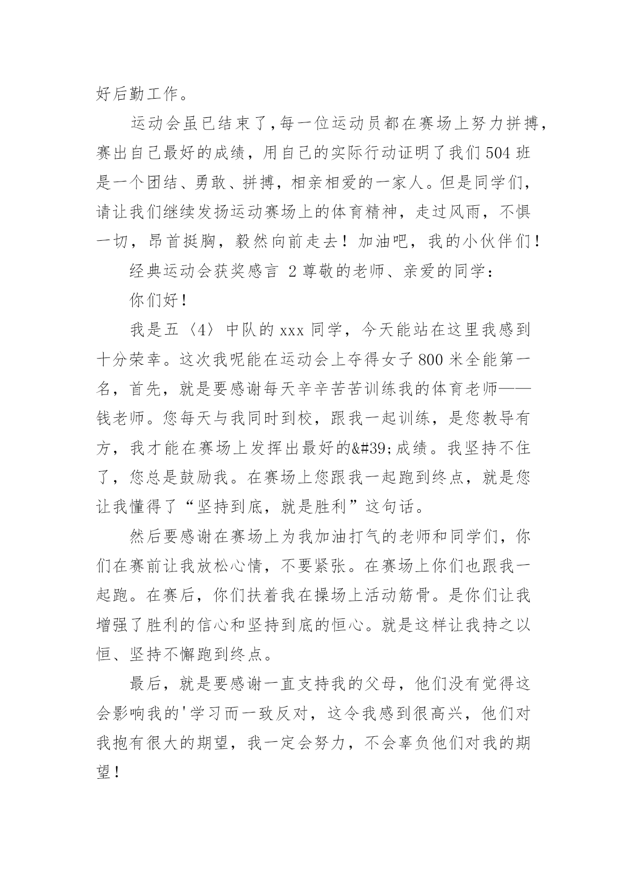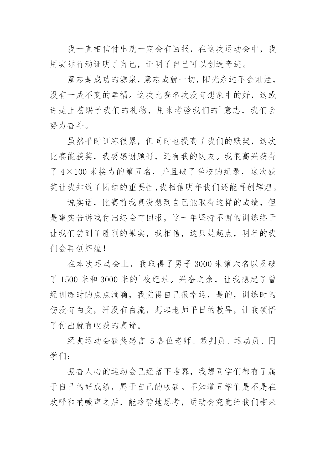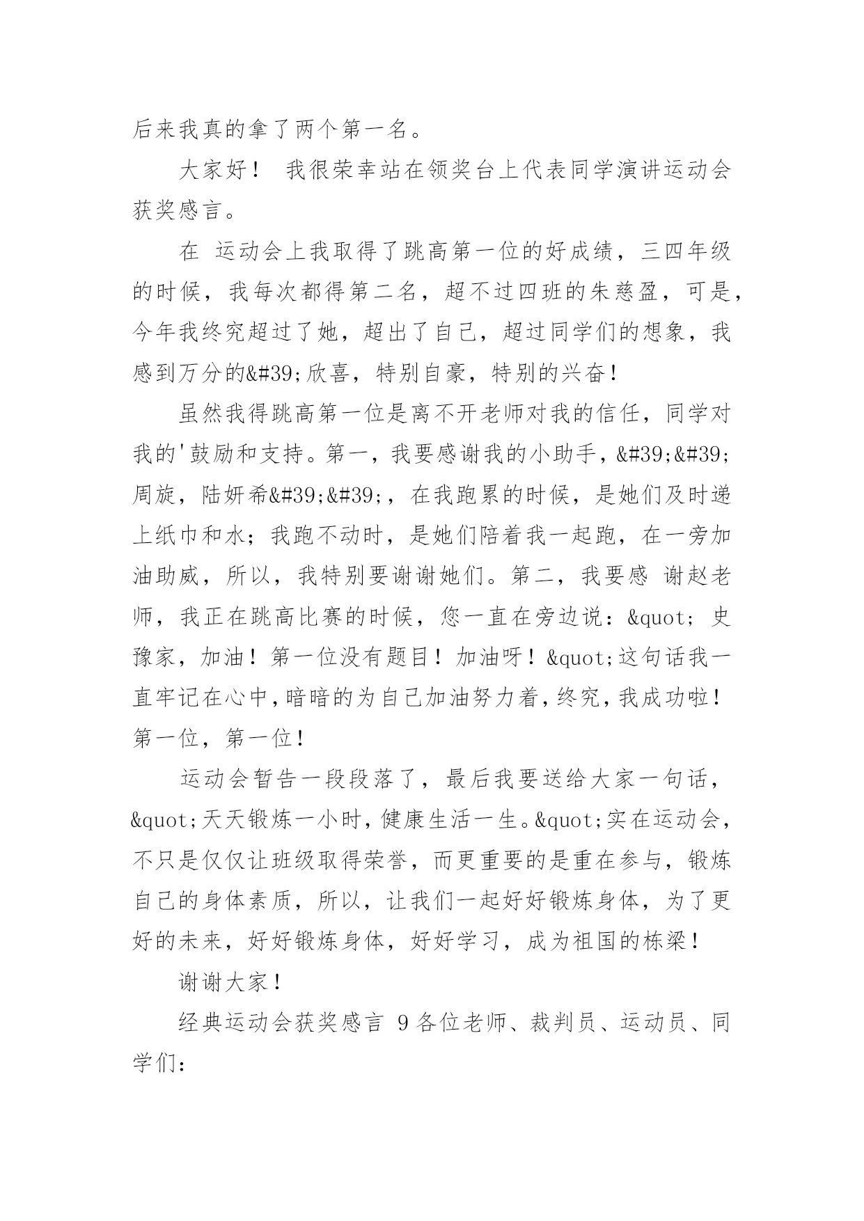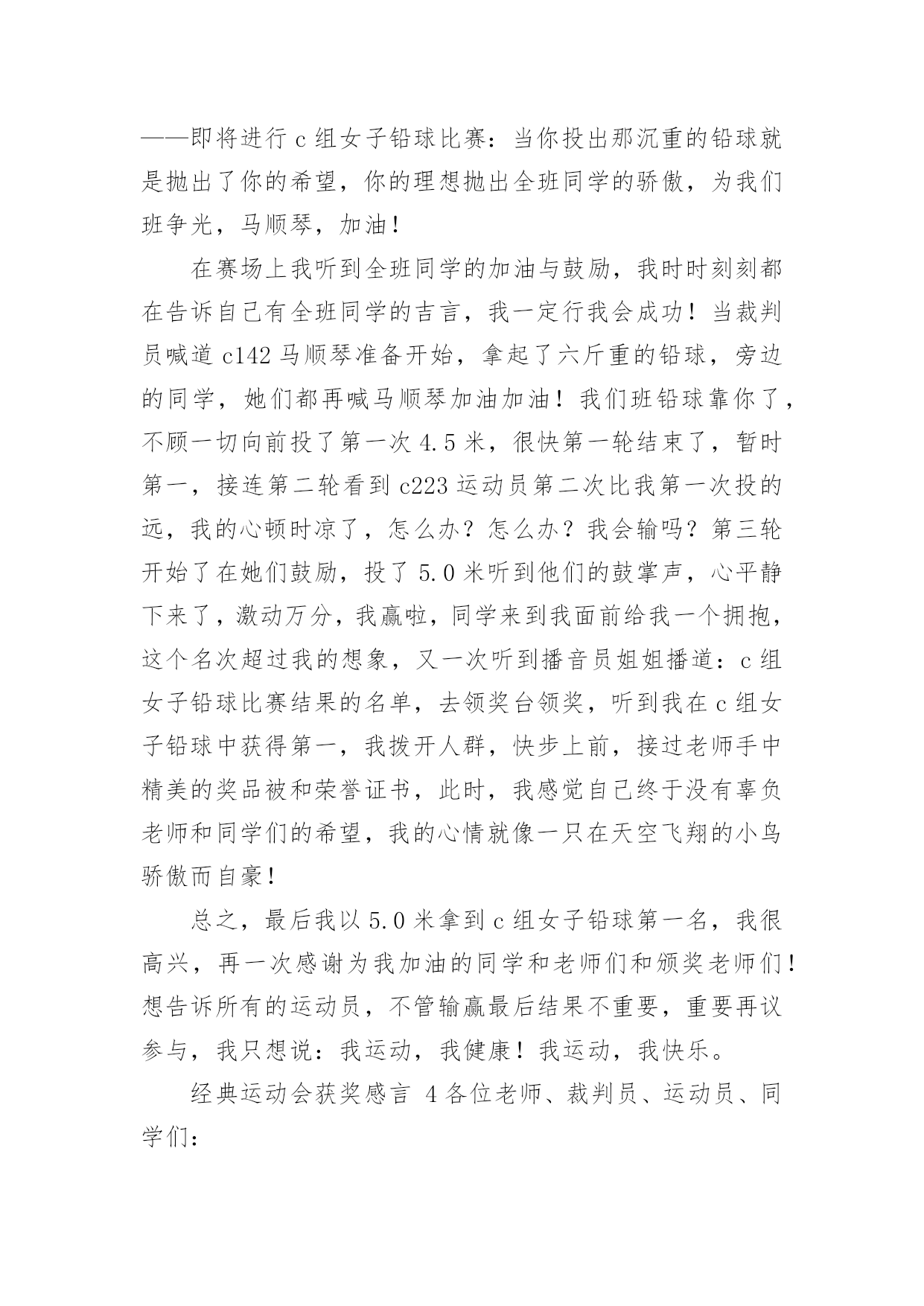 经典运动会获奖感言经典运动会获奖感言(精选14篇)在日常学习、工作和生活中,我们常常会因为所接触的人和事而备受启迪,这时就可以将其写成一篇感言,让自己铭记于心。那么好的感言是什么样的呢?以下是小编为大家收集的经典运动会获奖感言,仅供参考,欢迎大家阅读。经典运动会获奖感言1敬爱的老师、亲爱的同学们:大家好!今天我演讲的题目是“运动会赛事”。在那金秋送爽,风和日丽的日子里,我们迎来了心仪已久的20xx年秋季运动会。看,那一面面迎风飘舞的彩旗,像一朵朵盛开的鲜花;听,那一阵阵震耳欲聋的欢呼,是回响在耳边胜利的风声。在本次运动会中,我们取得了较好的成绩。首先,我们要感谢所有的运动员在赛场上的出色表现,为我们班做出的努力。我们班的男运动员们,勇夺跳高和跳远的.NO.1。我们班的女运动员们,更是“巾帼不让须眉”,在实心球比赛中,打破了我们学校的`校记录。我们班的运动员们,你们都是好样的,我们都应向你们学习,是你们让我们更深刻地体会到成功的快乐,更深刻的理解了奋斗的艰辛。其次,我们还要感谢报道团的六名同学们,正是你们二百多篇的通讯报道,激励着我们运动员们努力拼搏。最后,我们还应感谢我们的后援团,你们坚守阵地,呐喊助威,帮助运动员们做好后勤工作。运动会虽已结束了,每一位运动员都在赛场上努力拼搏,赛出自己最好的成绩,用自己的实际行动证明了我们504班是一个团结、勇敢、拼搏,相亲相爱的一家人。但是同学们,请让我们继续发扬运动赛场上的体育精神,走过风雨,不惧一切,昂首挺胸,毅然向前走去!加油吧,我的小伙伴们!经典运动会获奖感言2尊敬的老师、亲爱的同学:你们好!我是五〈4〉中队的xxx同学,今天能站在这里我感到十分荣幸。这次我呢能在运动会上夺得女子800米全能第一名,首先,就是要感谢每天辛辛苦苦训练我的体育老师——钱老师。您每天与我同时到校,跟我一起训练,是您教导有方,我才能在赛场上发挥出最好的'成绩。我坚持不住了,您总是鼓励我。在赛场上您跟我一起跑到终点,就是您让我懂得了“坚持到底,就是胜利”这句话。然后要感谢在赛场上为我加油打气的老师和同学们,你们在赛前让我放松心情,不要紧张。在赛场上你们也跟我一起跑。在赛后,你们扶着我在操场上活动筋骨。是你们让我增强了胜利的信心和坚持到底的恒心。就是这样让我持之以恒、坚持不懈跑到终点。最后,就是要感谢一直支持我的父母,他们没有觉得这会影响我的'学习而一致反对,这令我感到很高兴,他们对我抱有很大的期望,我一定会努力,不会辜负他们对我的期望!这次运动会上我夺得了第一名,相信我在下一次运动会上也能夺得第一名,为五〈4〉班争光,为学校争光。在这里我祝全校老师工作顺利,全校学生学习进步,谢谢大家!经典运动会获奖感言3各位老师、裁判员、运动员、同学们:我叫xx,现在是学院校通社下记者站的一名成员。在风和日丽的十一月二号下午,我參加了学院XX年秋季田劲运动会c组女子铅球预决赛,获得了第一名,感谢所有为我加油的老师及同学们,因为有你们的支持,我才会获得这样好的成绩!赛场是一个重在参于、展示自己的舞台,其意义不在于名次的高低,在于參加运动而努力拼搏的精神。中午在寝室休息的时候,眼看下午二点即将来临,告诉自己不要紧张,名次不是最要的,就这样不断的安慰自己直到铅球预决赛开始看到男子在投铅球比赛的时候,我的心情逐步紧张起来了,看到他们都投得很远,而我到时候又会投多远呢?对自己没有一丝希望和信心,在以前的运动会上我只看过别人投球,而我从没碰过铅球,不知道它的重量,不知道它的技巧,当我报名參加投铅球的.时候,我只考虑了重在参于,没想拿名次。眼看c组男子铅球预决赛快结束时,我的`心情七上八下,真的无法形容的那种紧张,拿起我的牌号一步一步从阶梯走像比赛区,时间一分一秒流逝到c组女子铅球了,听到播音员姐姐在报道:中专部来稿,11会计物流班来稿——即将进行c组女子铅球比赛:当你投出那沉重的铅球就是抛出了你的希望,你的理想抛出全班同学的骄傲,为我们班争光,马顺琴,加油!在赛场上我听到全班同学的加油与鼓励,我时时刻刻都在告诉自己有全班同学的吉言,我一定行我会成功!当裁判员喊道c142马顺琴准备开始,拿起了六斤重的铅球,旁边的同学,她们都再喊马顺琴加油加油!我们班铅球靠你了,不顾一切向前投了第一次4.5米,很快第一轮结束了,暂时第一,接连第二轮看到c223运动员第二次比我第一次投的远,我的心顿时凉了,怎么办?怎么办?我会输吗?第三轮开始了在她们鼓励,投了5.0米听到他们的鼓掌声,心平静下来了,激动万分,我赢啦,同学来到我面前给我一个拥抱,这个名次超过我的想象,又一次听到播音员姐姐播道:c组女子铅球比赛结果的名单,去领奖台领奖,听到我在c组女子铅球中获得第一,我拨开人群,快步上前,接过老师手中精美的奖品被和荣誉证书,此时,我感觉自己终于没有辜