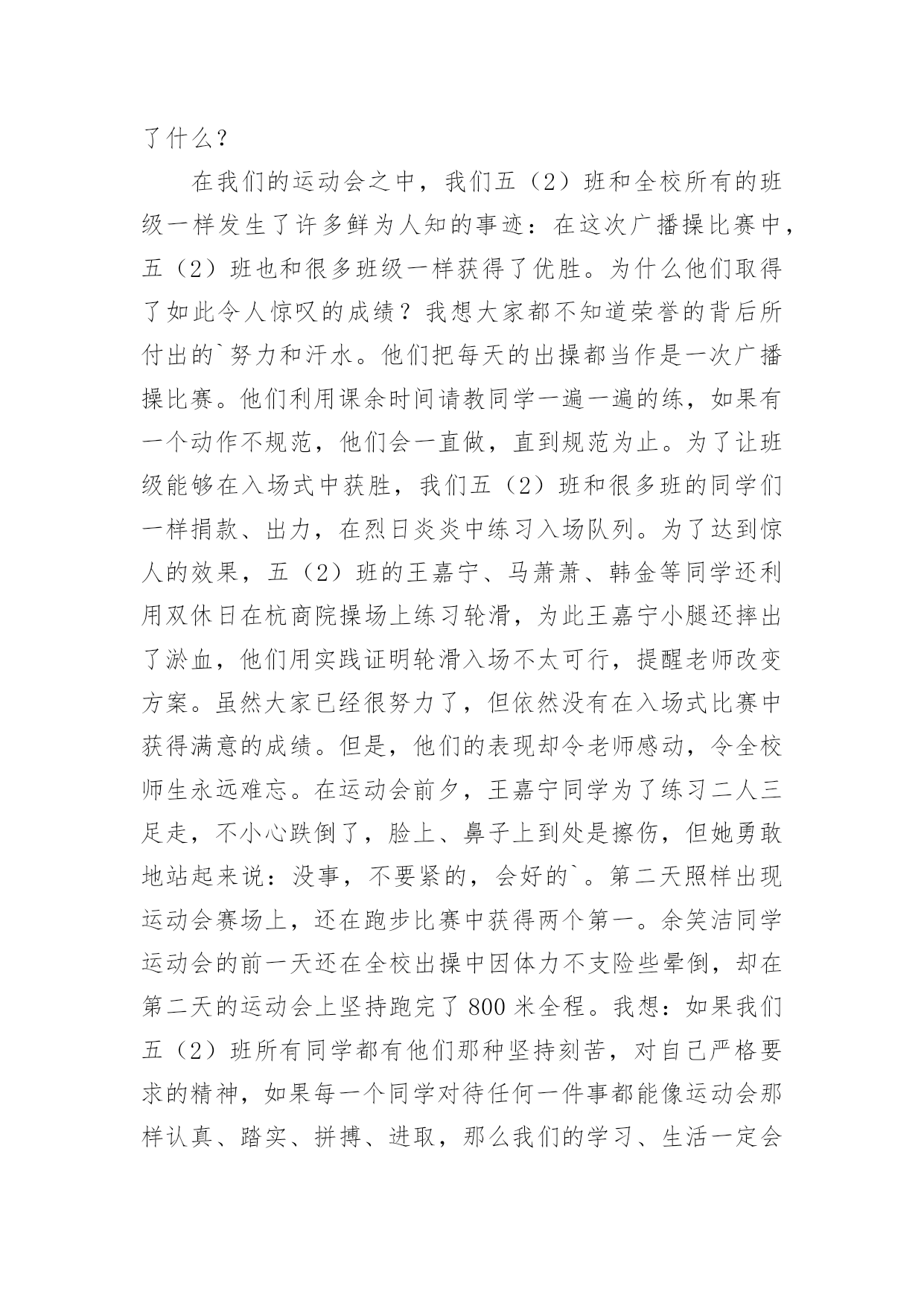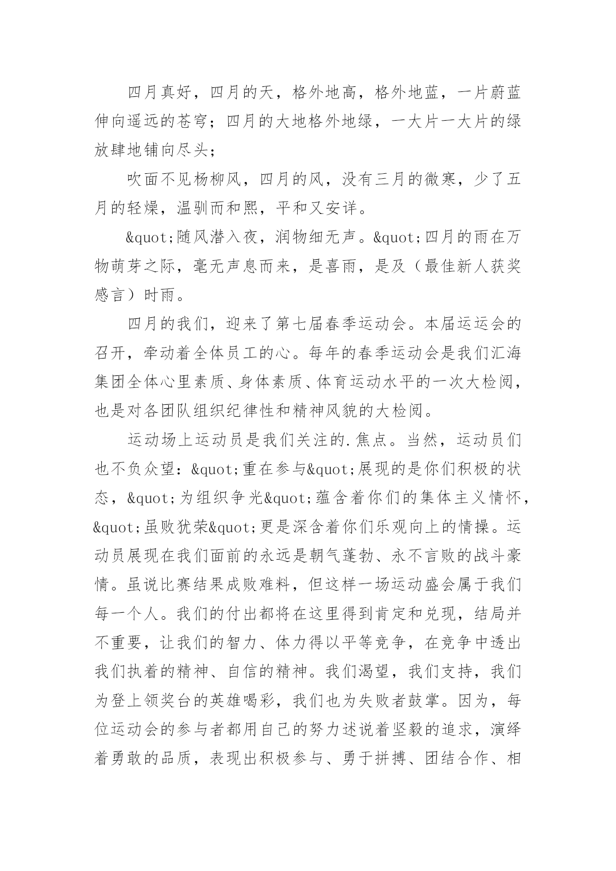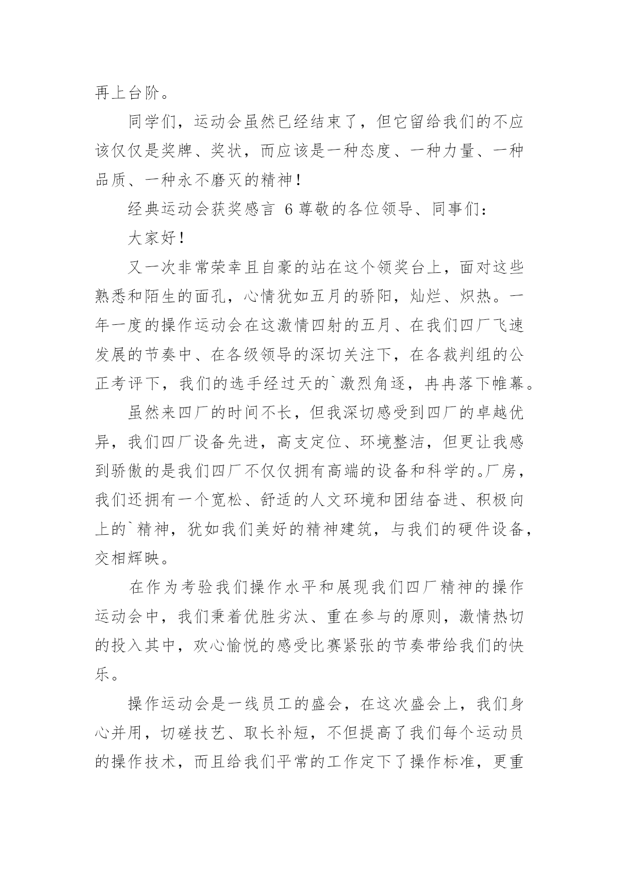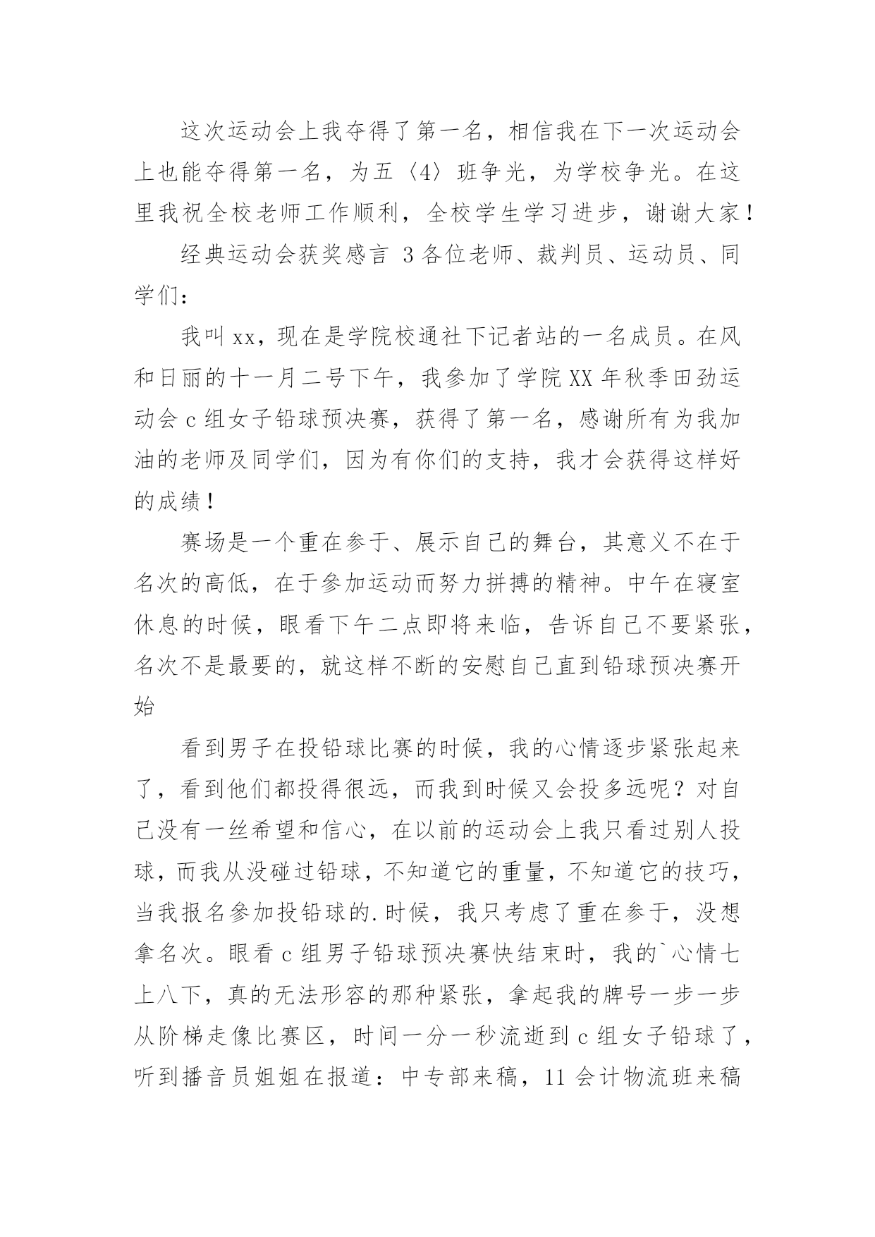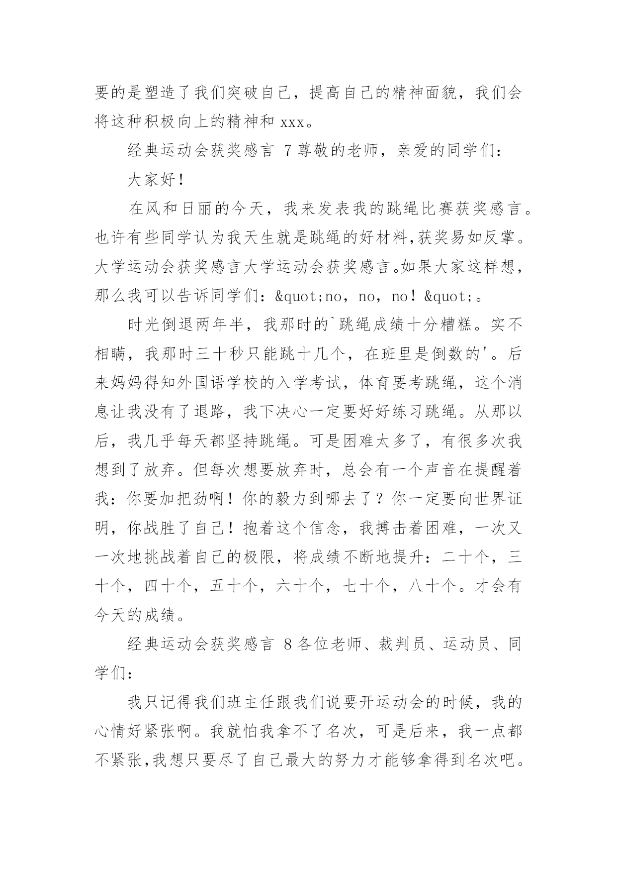 经典运动会获奖感言经典运动会获奖感言(精选14篇)在日常学习、工作和生活中,我们常常会因为所接触的人和事而备受启迪,这时就可以将其写成一篇感言,让自己铭记于心。那么好的感言是什么样的呢?以下是小编为大家收集的经典运动会获奖感言,仅供参考,欢迎大家阅读。经典运动会获奖感言1敬爱的老师、亲爱的同学们:大家好!今天我演讲的题目是“运动会赛事”。在那金秋送爽,风和日丽的日子里,我们迎来了心仪已久的20xx年秋季运动会。看,那一面面迎风飘舞的彩旗,像一朵朵盛开的鲜花;听,那一阵阵震耳欲聋的欢呼,是回响在耳边胜利的风声。在本次运动会中,我们取得了较好的成绩。首先,我们要感谢所有的运动员在赛场上的出色表现,为我们班做出的努力。我们班的男运动员们,勇夺跳高和跳远的.NO.1。我们班的女运动员们,更是“巾帼不让须眉”,在实心球比赛中,打破了我们学校的`校记录。我们班的运动员们,你们都是好样的,我们都应向你们学习,是你们让我们更深刻地体会到成功的快乐,更深刻的理解了奋斗的艰辛。其次,我们还要感谢报道团的六名同学们,正是你们二百多篇的通讯报道,激励着我们运动员们努力拼搏。最后,我们还应感谢我们的后援团,你们坚守阵地,呐喊助威,帮助运动员们做好后勤工作。运动会虽已结束了,每一位运动员都在赛场上努力拼搏,赛出自己最好的成绩,用自己的实际行动证明了我们504班是一个团结、勇敢、拼搏,相亲相爱的一家人。但是同学们,请让我们继续发扬运动赛场上的体育精神,走过风雨,不惧一切,昂首挺胸,毅然向前走去!加油吧,我的小伙伴们!经典运动会获奖感言2尊敬的老师、亲爱的同学:你们好!我是五〈4〉中队的xxx同学,今天能站在这里我感到十分荣幸。这次我呢能在运动会上夺得女子800米全能第一名,首先,就是要感谢每天辛辛苦苦训练我的体育老师——钱老师。您每天与我同时到校,跟我一起训练,是您教导有方,我才能在赛场上发挥出最好的'成绩。我坚持不住了,您总是鼓励我。在赛场上您跟我一起跑到终点,就是您让我懂得了“坚持到底,就是胜利”这句话。然后要感谢在赛场上为我加油打气的老师和同学们,你们在赛前让我放松心情,不要紧张。在赛场上你们也跟我一起跑。在赛后,你们扶着我在操场上活动筋骨。是你们让我增强了胜利的信心和坚持到底的恒心。就是这样让我持之以恒、坚持不懈跑到终点。最后,就是要感谢一直支持我的父母,他们没有觉得这会影响我的'学习而一致反对,这令我感到很高兴,他们对我抱有很大的期望,我一定会努力,不会辜负他们对我的期望!这次运动会上我夺得了第一名,相信我在下一次运动会上也能夺得第一名,为五〈4〉班争光,为学校争光。在这里我祝全校老师工作顺利,全校学生学习进步,谢谢大家!经典运动会获奖感言3各位老师、裁判员、运动员、同学们:我叫xx,现在是学院校通社下记者站的一名成员。在风和日丽的十一月二号下午,我參加了学院XX年秋季田劲运动会c组女子铅球预决赛,获得了第一名,感谢所有为我加油的老师及同学们,因为有你们的支持,我才会获得这样好的成绩!赛场是一个重在参于、展示自己的舞台,其意义不在于名次的高低,在于參加运动而努力拼搏的精神。中午在寝室休息的时候,眼看下午二点即将来临,告诉自己不要紧张,名次不是最要的,就这样不断的安慰自己直到铅球预决赛开始看到男子在投铅球比赛的时候,我的心情逐步紧张起来了,看到他们都投得很远,而我到时候又会投多远呢?对自己没有一丝希望和信心,在以前的运动会上我只看过别人投球,而我从没碰过铅球,不知道它的重量,不知道它的技巧,当我报名參加投铅球的.时候,我只考虑了重在参于,没想拿名次。眼看c组男子铅球预决赛快结束时,我的`心情七上八下,真的无法形容的那种紧张,拿起我的牌号一步一步从阶梯走像比赛区,时间一分一秒流逝到c组女子铅球了,听到播音员姐姐在报道:中专部来稿,11会计物流班来稿——即将进行c组女子铅球比赛:当你投出那沉重的铅球就是抛出了你的希望,你的理想抛出全班同学的骄傲,为我们班争光,马顺琴,加油!在赛场上我听到全班同学的加油与鼓励,我时时刻刻都在告诉自己有全班同学的吉言,我一定行我会成功!当裁判员喊道c142马顺琴准备开始,拿起了六斤重的铅球,旁边的同学,她们都再喊马顺琴加油加油!我们班铅球靠你了,不顾一切向前投了第一次4.5米,很快第一轮结束了,暂时第一,接连第二轮看到c223运动员第二次比我第一次投的远,我的心顿时凉了,怎么办?怎么办?我会输吗?第三轮开始了在她们鼓励,投了5.0米听到他们的鼓掌声,心平静下来了,激动万分,我赢啦,同学来到我面前给我一个拥抱,这个名次超过我的想象,又一次听到播音员姐姐播道:c组女子铅球比赛结果的名单,去领奖台领奖,听到我在c组女子铅球中获得第一,我拨开人群,快步上前,接过老师手中精美的奖品被和荣誉证书,此时,我感觉自己终于没有辜