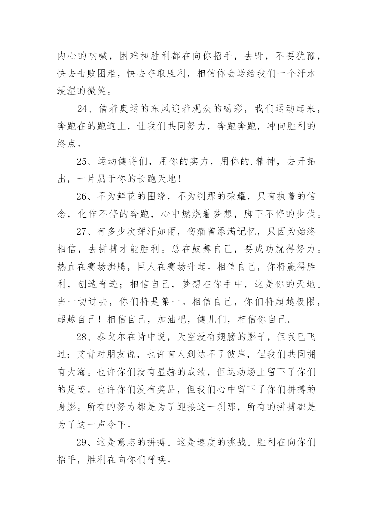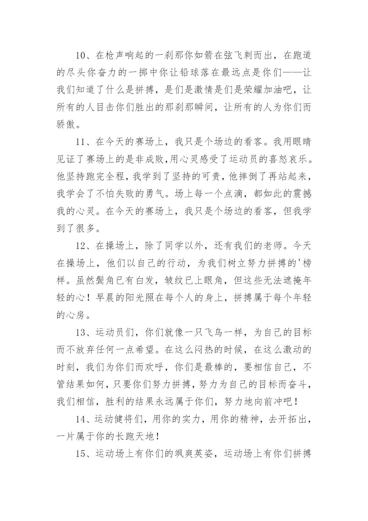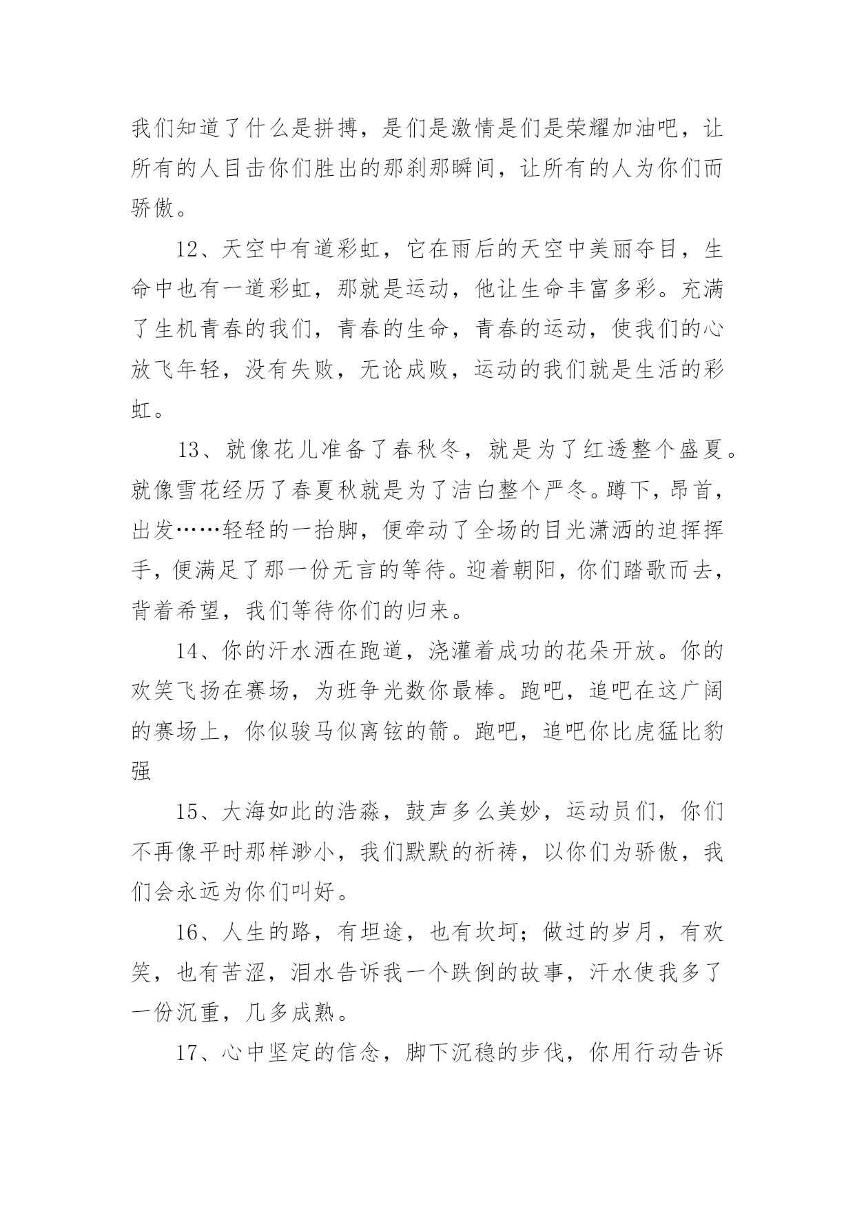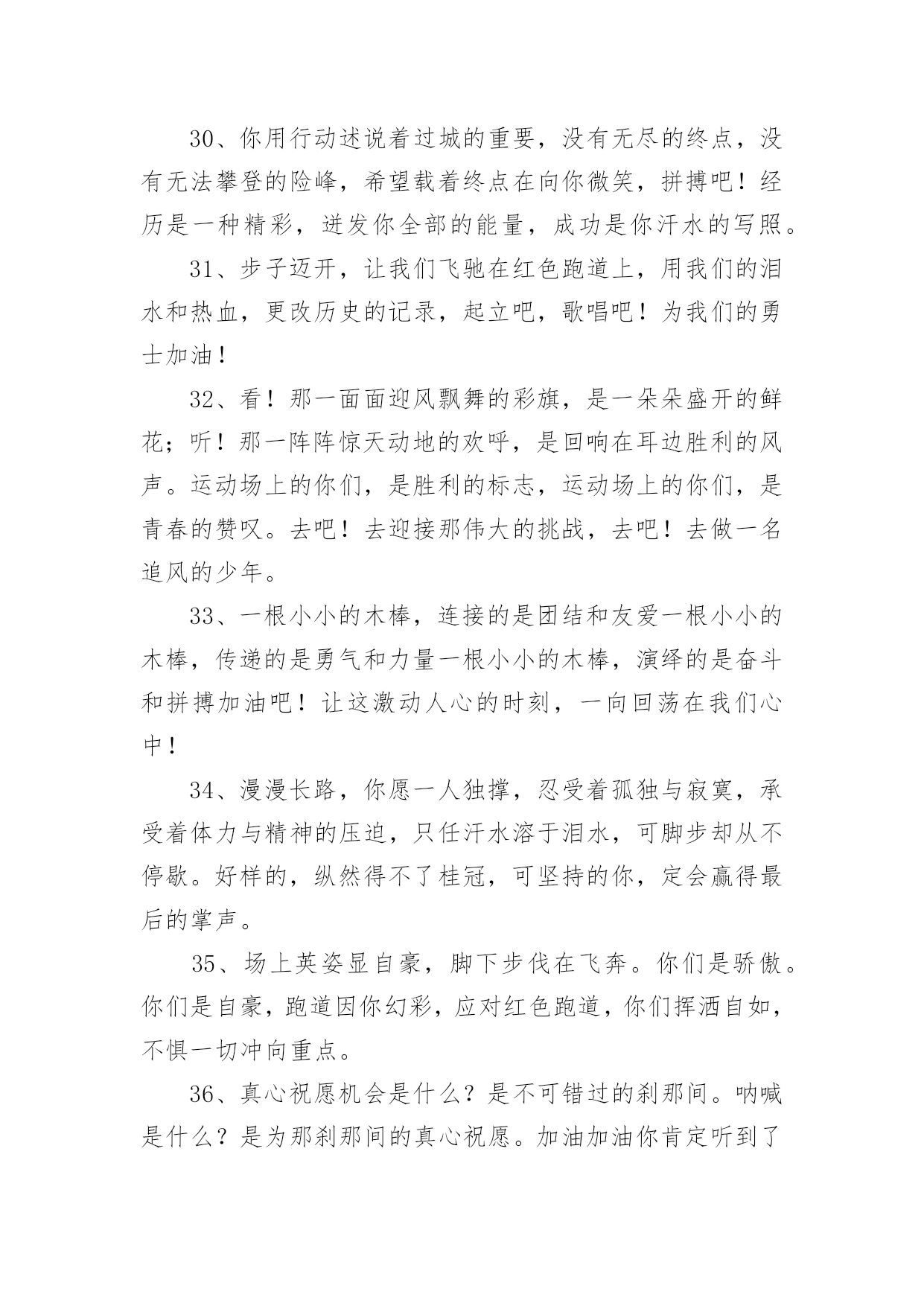运动会加油稿运动会加油稿汇总(10篇)随着社会不断地进步,很多情况下我们需要用到加油稿,加油稿有着正向的鼓动作用。写起加油稿来就毫无头绪?下面是小编为大家整理的运动会加油稿,希望对大家有所帮助。运动会加油稿篇11、致运动员,是体育场上游走的火焰,是来去不息的脚步,是风中飞舞的树叶折射的金色光芒,藉此,可以诠释运动员兴奋的脸庞。那轻盈的步伐似飞鸟的翅膀,那清脆的枪声响彻天际,它粲然升起那跃动的渴望,起跑、加速、超越、冲刺,一步一步延向胜利的曙光。那是力的比拼,素质的较量,是石榴树上,跃动的心脏。2、致失败者倒下的时候,生命又怎能屹立!歪歪斜斜的身影,又怎耐的住风雨的洗礼。你若有一个不屈的灵魂,脚下才会有一方坚实的土地。昨天的失败已经过去,胜利不仅仅是一个美好的话题。3、只有拼搏,才会取得辉煌的成绩;只有播种,才能收获丰硕的果实;只有追求,才能品味真正的人生。金牌和花环从来不是撞树的兔子,骄傲和自豪,也从来不是天上掉下来的馅饼,只瞄准而不射击的猎手不是好猎手,只呐喊不冲锋的士兵不是好士兵。运动健儿们,加油!无论成功还是失败,只要为之奋斗!4、只要你努力,辉煌不是空中阁楼;只要你奋斗,辉煌不是若隐若现的星河;只要你拼搏,辉煌不会与你擦肩而过;只要你进取,辉煌自然会与你亲切握手。祝运动场上的全体运动健儿们取得自己满意的好成绩!5、真心祝愿机会是什么?是不可错过的刹那间。呐喊是什么?是为那刹那间的真心祝愿。加油加油你肯定听到了那一声声呐喊你肯定看到了那双双期待的眼睛你肯定感受到了那发自内心的祝愿。6、这是意志的拼搏。这是速度的挑战。胜利在向你们招手,胜利在向你们呼唤。7、在这激动的时刻,白云露出了笑脸,太阳为你们而高照。亲爱的运动员们,为了你们的目标而努力向前冲吧!只要你们相信自己能行,我想:胜利的到来就离你们不远了。冲吧,运动员们,我们会为你们呐喊,会为你们加油的,记住,前面的胜利旗永远为你们而准备的。8、在这200米跑道上,运动健儿们挥洒着他们的汗水,坚持不懈地向着目标冲刺,他们仿佛不知疲惫,他们的心中只有一个信念——终点,只有到达了终点,之前所有的努力和汗水才会显得有价值。所以,让我们一起为运动健儿们呐喊吧,让我们以他们为荣吧!9、在同一片晴空下,我们相聚一起,或欢乐、或失落、或兴奋、或悲伤,尽数写在我们的脸旁。我们曾一起悲伤,在那个败北的沙坑上;我们也一起击掌,在这红色的跑道上。在同一片晴空下,我们拼搏,为美丽的目标;我们奋斗,为班级的辉煌。这就是团结、奋进、文明的03企管班。10、在枪声响起的一刹那你如箭在弦飞刺而出,在跑道的尽头你奋力的一掷中你让铅球落在最远点是你们——让我们知道了什么是拼搏,是们是激情是们是荣耀加油吧,让所有的人目击你们胜出的那刹那瞬间,让所有的人为你们而骄傲。11、在今天的赛场上,我只是个场边的看客。我用眼睛见证了赛场上的是非成败,用心灵感受了运动员的喜怒哀乐。他坚持跑完全程,我学到了坚持的可贵,他摔倒了再站起来,我学会了不怕失败的勇气。场上每一个点滴,都如此的震撼我的心灵。在今天的赛场上,我只是个场边的看客,但我学到了很多。12、在操场上,除了同学以外,还有我们的老师。今天在操场上,他们以自己的行动,为我们树立努力拼搏的'榜样。虽然鬓角已有白发,皱纹已上眼角,但这些无法遮掩年轻的心!早晨的阳光照在每个人的身上,拼搏属于每个年轻的心房。13、运动员们,你们就像一只飞鸟一样,为自己的目标而不放弃任何一点希望。在这么闷热的时候,在这么激动的时刻,我们为你们而欢呼,你们是最棒的,要相信自己,不管结果如何,只要你们努力拼搏,努力为自己的目标而奋斗,我们相信,胜利的结果永远属于你们,努力地向前冲吧!14、运动健将们,用你的实力,用你的精神,去开拓出,一片属于你的长跑天地!15、运动场上有你们的飒爽英姿,运动场上有你们拼搏的身影,面对漫漫的征程,你没有畏惧和退缩,任汗水打湿脊背,任疲惫爬满全身,依然分离追赶,只有一个目标,只有一个信念,为班级赢得荣誉,拼搏吧,我为你们呐喊,加油。16、不为鲜花的围绕,不为刹那的荣耀,只有执着的信念,化作不停的奔跑,心中燃烧着梦想,脚下不停的步伐。运动会加油稿篇21、坚定,执着,耐力与希望,在延伸的白色跑道中点点凝聚!力量,信念,拼搏与奋斗,在遥远的终点线上渐渐明亮!时代的强音正在你的脚下踏响。2、温暖的阳光洒在赛场上,男子乙组标枪的比赛即将开始。赛场上,一道道优美的弧线将轻盈地划过天空。健儿们用手中的标枪向距离的权限发起一轮又一轮的挑战。标枪在空中轻盈的姿态,是健儿们强健的力量和熟练的技巧的结合。谁能在这场激烈的竞争中获胜?让我们拭目以待,让我们为他们呐喊助威吧!只有将力量与技巧合二为一的人,才能获得胜利的桂冠!3、人生的路,有坦途,也有坎坷,做过的岁月,有欢笑,也有苦涩,泪水告