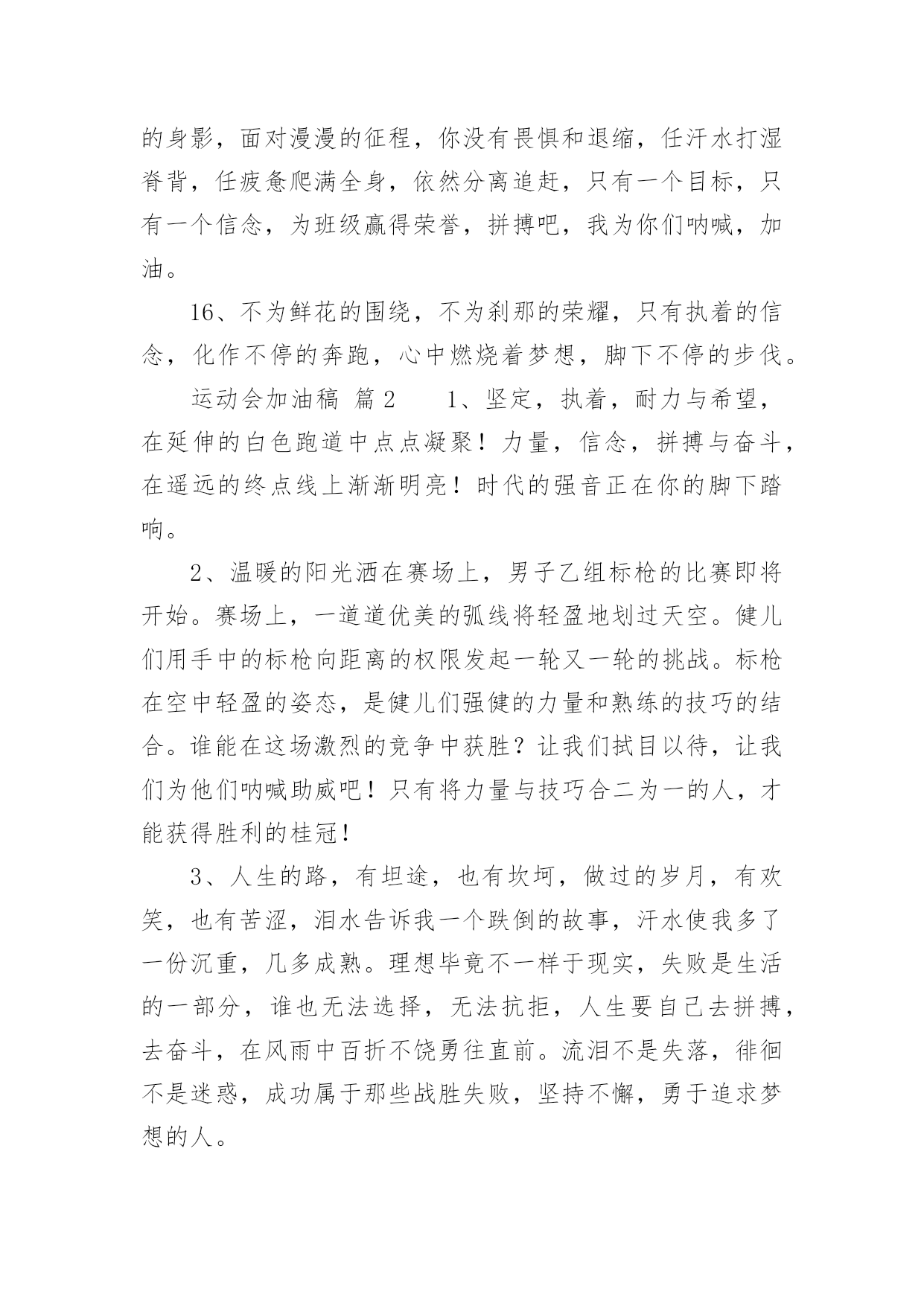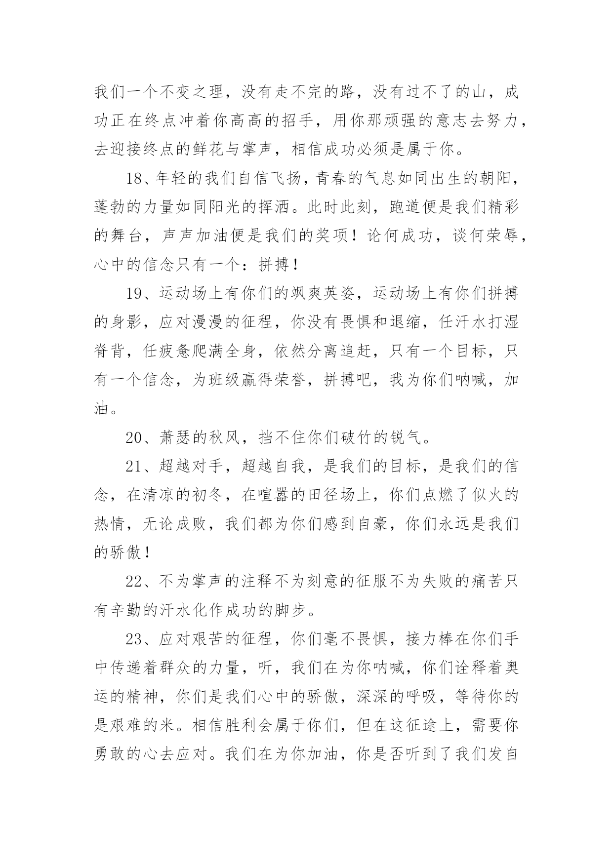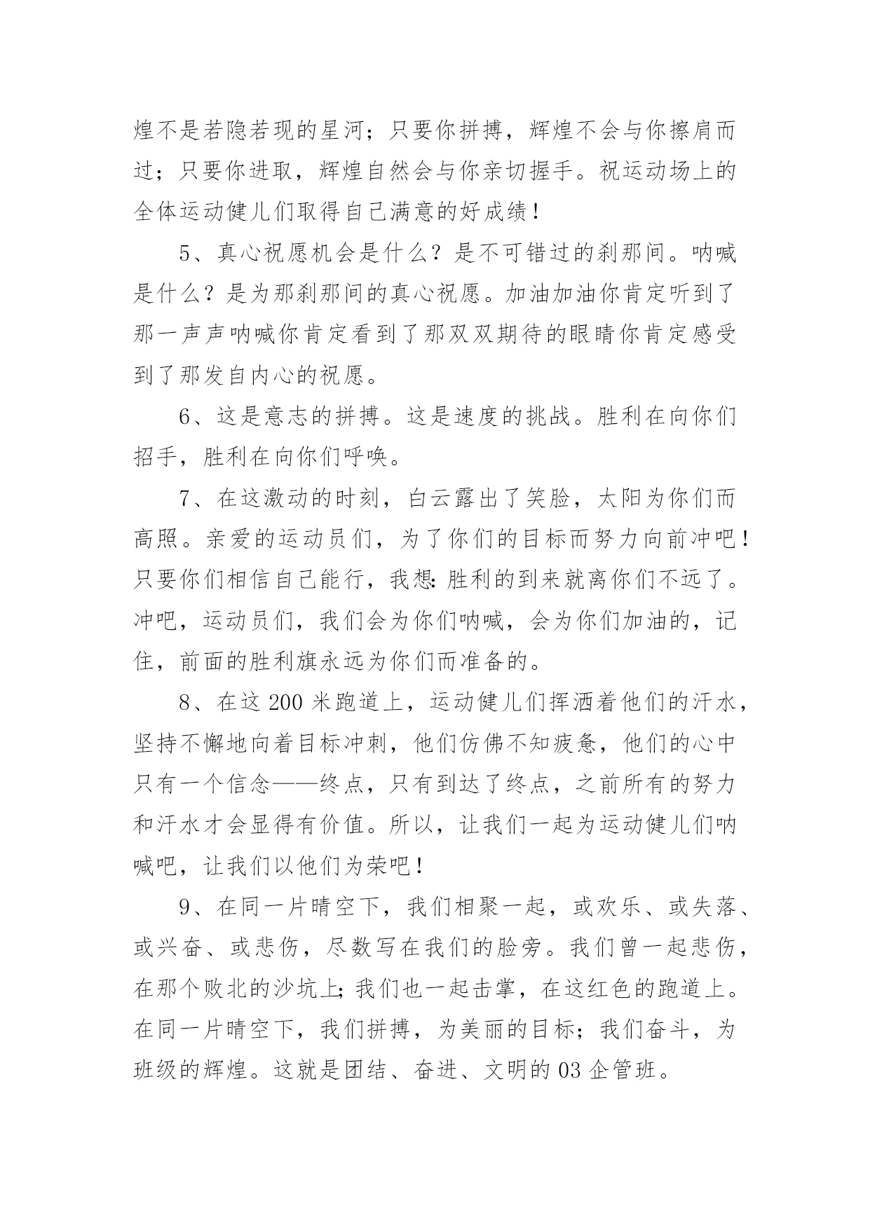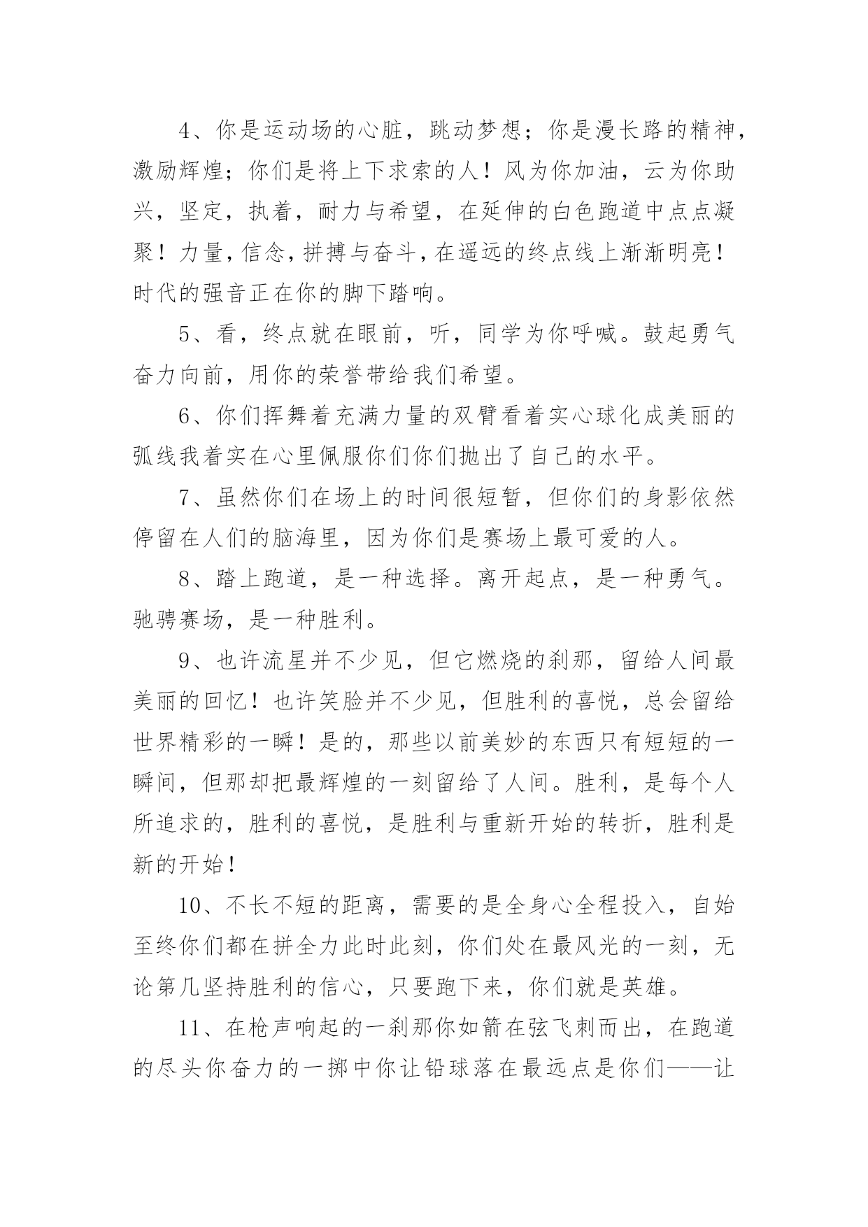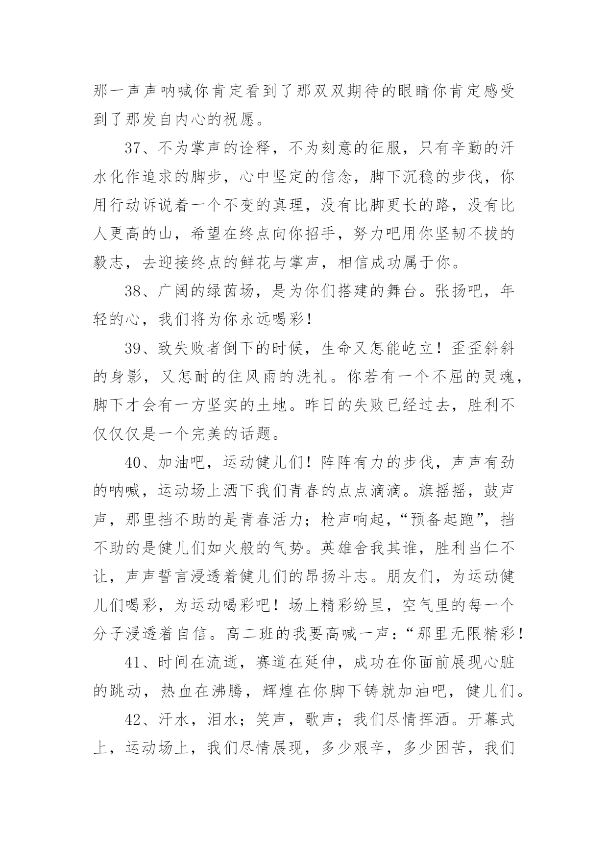 运动会加油稿运动会加油稿汇总(10篇)随着社会不断地进步,很多情况下我们需要用到加油稿,加油稿有着正向的鼓动作用。写起加油稿来就毫无头绪?下面是小编为大家整理的运动会加油稿,希望对大家有所帮助。运动会加油稿篇11、致运动员,是体育场上游走的火焰,是来去不息的脚步,是风中飞舞的树叶折射的金色光芒,藉此,可以诠释运动员兴奋的脸庞。那轻盈的步伐似飞鸟的翅膀,那清脆的枪声响彻天际,它粲然升起那跃动的渴望,起跑、加速、超越、冲刺,一步一步延向胜利的曙光。那是力的比拼,素质的较量,是石榴树上,跃动的心脏。2、致失败者倒下的时候,生命又怎能屹立!歪歪斜斜的身影,又怎耐的住风雨的洗礼。你若有一个不屈的灵魂,脚下才会有一方坚实的土地。昨天的失败已经过去,胜利不仅仅是一个美好的话题。3、只有拼搏,才会取得辉煌的成绩;只有播种,才能收获丰硕的果实;只有追求,才能品味真正的人生。金牌和花环从来不是撞树的兔子,骄傲和自豪,也从来不是天上掉下来的馅饼,只瞄准而不射击的猎手不是好猎手,只呐喊不冲锋的士兵不是好士兵。运动健儿们,加油!无论成功还是失败,只要为之奋斗!4、只要你努力,辉煌不是空中阁楼;只要你奋斗,辉煌不是若隐若现的星河;只要你拼搏,辉煌不会与你擦肩而过;只要你进取,辉煌自然会与你亲切握手。祝运动场上的全体运动健儿们取得自己满意的好成绩!5、真心祝愿机会是什么?是不可错过的刹那间。呐喊是什么?是为那刹那间的真心祝愿。加油加油你肯定听到了那一声声呐喊你肯定看到了那双双期待的眼睛你肯定感受到了那发自内心的祝愿。6、这是意志的拼搏。这是速度的挑战。胜利在向你们招手,胜利在向你们呼唤。7、在这激动的时刻,白云露出了笑脸,太阳为你们而高照。亲爱的运动员们,为了你们的目标而努力向前冲吧!只要你们相信自己能行,我想:胜利的到来就离你们不远了。冲吧,运动员们,我们会为你们呐喊,会为你们加油的,记住,前面的胜利旗永远为你们而准备的。8、在这200米跑道上,运动健儿们挥洒着他们的汗水,坚持不懈地向着目标冲刺,他们仿佛不知疲惫,他们的心中只有一个信念——终点,只有到达了终点,之前所有的努力和汗水才会显得有价值。所以,让我们一起为运动健儿们呐喊吧,让我们以他们为荣吧!9、在同一片晴空下,我们相聚一起,或欢乐、或失落、或兴奋、或悲伤,尽数写在我们的脸旁。我们曾一起悲伤,在那个败北的沙坑上;我们也一起击掌,在这红色的跑道上。在同一片晴空下,我们拼搏,为美丽的目标;我们奋斗,为班级的辉煌。这就是团结、奋进、文明的03企管班。10、在枪声响起的一刹那你如箭在弦飞刺而出,在跑道的尽头你奋力的一掷中你让铅球落在最远点是你们——让我们知道了什么是拼搏,是们是激情是们是荣耀加油吧,让所有的人目击你们胜出的那刹那瞬间,让所有的人为你们而骄傲。11、在今天的赛场上,我只是个场边的看客。我用眼睛见证了赛场上的是非成败,用心灵感受了运动员的喜怒哀乐。他坚持跑完全程,我学到了坚持的可贵,他摔倒了再站起来,我学会了不怕失败的勇气。场上每一个点滴,都如此的震撼我的心灵。在今天的赛场上,我只是个场边的看客,但我学到了很多。12、在操场上,除了同学以外,还有我们的老师。今天在操场上,他们以自己的行动,为我们树立努力拼搏的'榜样。虽然鬓角已有白发,皱纹已上眼角,但这些无法遮掩年轻的心!早晨的阳光照在每个人的身上,拼搏属于每个年轻的心房。13、运动员们,你们就像一只飞鸟一样,为自己的目标而不放弃任何一点希望。在这么闷热的时候,在这么激动的时刻,我们为你们而欢呼,你们是最棒的,要相信自己,不管结果如何,只要你们努力拼搏,努力为自己的目标而奋斗,我们相信,胜利的结果永远属于你们,努力地向前冲吧!14、运动健将们,用你的实力,用你的精神,去开拓出,一片属于你的长跑天地!15、运动场上有你们的飒爽英姿,运动场上有你们拼搏的身影,面对漫漫的征程,你没有畏惧和退缩,任汗水打湿脊背,任疲惫爬满全身,依然分离追赶,只有一个目标,只有一个信念,为班级赢得荣誉,拼搏吧,我为你们呐喊,加油。16、不为鲜花的围绕,不为刹那的荣耀,只有执着的信念,化作不停的奔跑,心中燃烧着梦想,脚下不停的步伐。运动会加油稿篇21、坚定,执着,耐力与希望,在延伸的白色跑道中点点凝聚!力量,信念,拼搏与奋斗,在遥远的终点线上渐渐明亮!时代的强音正在你的脚下踏响。2、温暖的阳光洒在赛场上,男子乙组标枪的比赛即将开始。赛场上,一道道优美的弧线将轻盈地划过天空。健儿们用手中的标枪向距离的权限发起一轮又一轮的挑战。标枪在空中轻盈的姿态,是健儿们强健的力量和熟练的技巧的结合。谁能在这场激烈的竞争中获胜?让我们拭目以待,让我们为他们呐喊助威吧!只有将力量与技巧合二为一的人,才能获得胜利的桂冠!3、人生的路,有坦途,也有坎坷,做过的岁月,有欢笑,也有苦涩,泪水告
