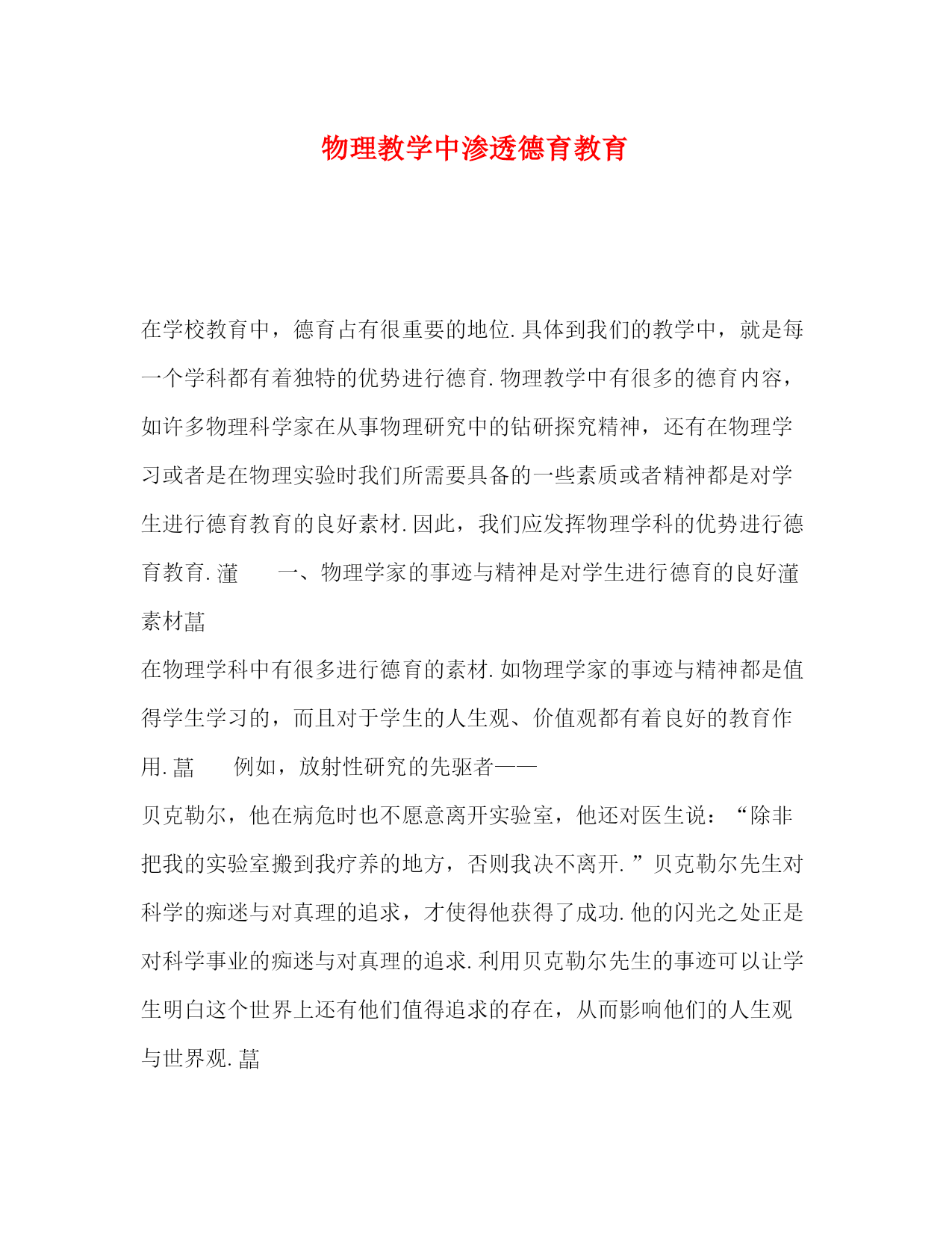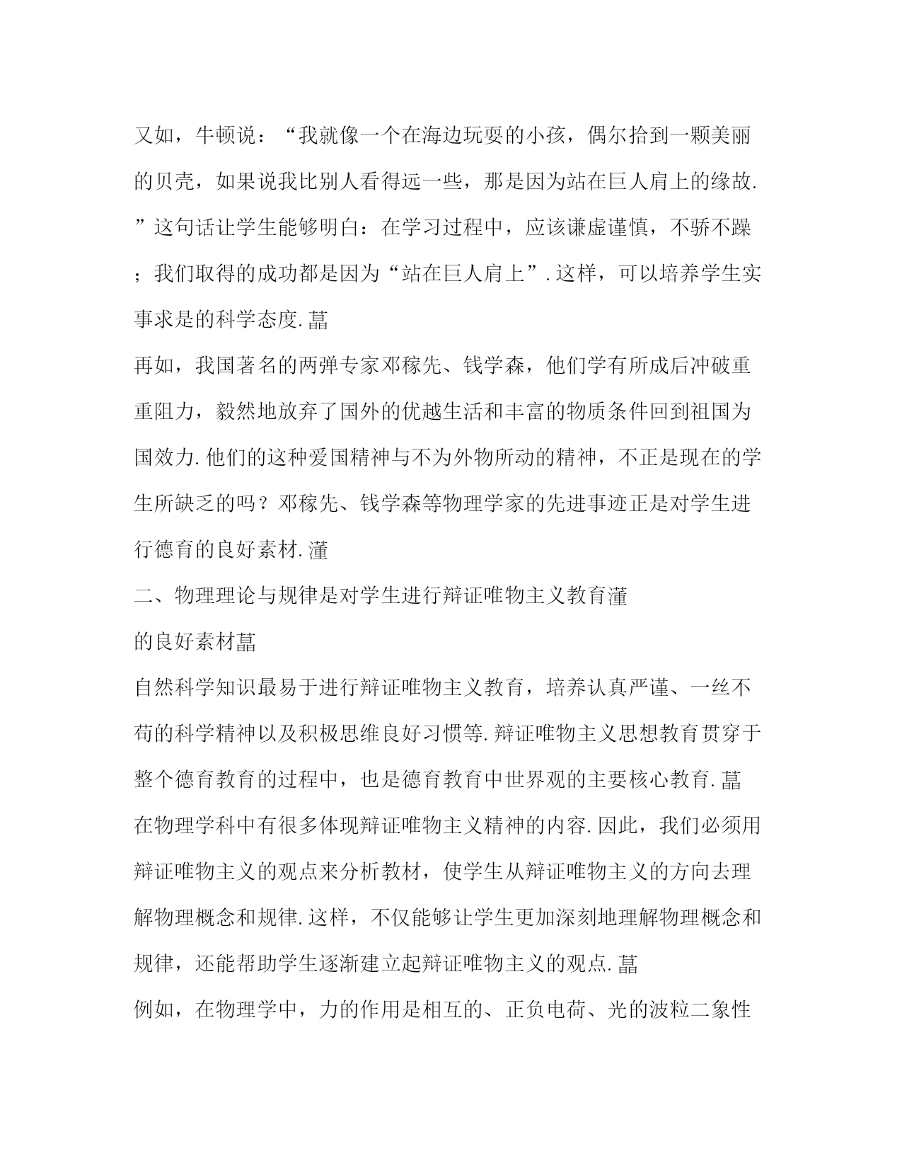 PAGE此资料由网络收集而来,如有侵权请告知上传者立即删除。资料共分享,我们负责传递知识。物理教学中渗透德育教育在学校教育中,德育占有很重要的地位.具体到我们的教学中,就是每一个学科都有着独特的优势进行德育.物理教学中有很多的德育内容,如许多物理科学家在从事物理研究中的钻研探究精神,还有在物理学习或者是在物理实验时我们所需要具备的一些素质或者精神都是对学生进行德育教育的良好素材.因此,我们应发挥物理学科的优势进行德育教育.一、物理学家的事迹与精神是对学生进行德育的良好素材在物理学科中有很多进行德育的素材.如物理学家的事迹与精神都是值得学生学习的,而且对于学生的人生观、价值观都有着良好的教育作用.例如,放射性研究的先驱者——贝克勒尔,他在病危时也不愿意离开实验室,他还对医生说:“除非把我的实验室搬到我疗养的地方,否则我决不离开.”贝克勒尔先生对科学的痴迷与对真理的追求,才使得他获得了成功.他的闪光之处正是对科学事业的痴迷与对真理的追求.利用贝克勒尔先生的事迹可以让学生明白这个世界上还有他们值得追求的存在,从而影响他们的人生观与世界观.又如,牛顿说:“我就像一个在海边玩耍的小孩,偶尔拾到一颗美丽的贝壳,如果说我比别人看得远一些,那是因为站在巨人肩上的缘故.”这句话让学生能够明白:在学习过程中,应该谦虚谨慎,不骄不躁;我们取得的成功都是因为“站在巨人肩上”.这样,可以培养学生实事求是的科学态度.再如,我国著名的两弹专家邓稼先、钱学森,他们学有所成后冲破重重阻力,毅然地放弃了国外的优越生活和丰富的物质条件回到祖国为国效力.他们的这种爱国精神与不为外物所动的精神,不正是现在的学生所缺乏的吗?邓稼先、钱学森等物理学家的先进事迹正是对学生进行德育的良好素材.二、物理理论与规律是对学生进行辩证唯物主义教育的良好素材自然科学知识最易于进行辩证唯物主义教育,培养认真严谨、一丝不苟的科学精神以及积极思维良好习惯等.辩证唯物主义思想教育贯穿于整个德育教育的过程中,也是德育教育中世界观的主要核心教育.在物理学科中有很多体现辩证唯物主义精神的内容.因此,我们必须用辩证唯物主义的观点来分析教材,使学生从辩证唯物主义的方向去理解物理概念和规律.这样,不仅能够让学生更加深刻地理解物理概念和规律,还能帮助学生逐渐建立起辩证唯物主义的观点.例如,在物理学中,力的作用是相互的、正负电荷、光的波粒二象性等都体现出了对立统一规律.而物态的变化、运动状态的改变以及原子核的转变等都是量变引起质变规律的有力例证.惯性、摩擦力等对人类有着有益一面,同时又有着有害的一面,这些都能够帮助学生树立起“任何事物都是一分为二”的辩证观点.通过物体的运动和静止的学习,可以让学生体会到这个世界是物质的,而物质是在不断地运动的,运动是绝对的,静止是相对的.在物理学科中,有着很多与辩证唯物主义相关的内容,这需要我们教师去思考如何利用这些知识对学生进行辩证唯物主义教育.三、利用物理实验对学生进行德育教育物理是一门建立在实验上的学科,有很多的物理规律都是从多次的实验中总结出来的,而且新的理论形成也不能离开实验,其最后的检验也需要建立在实验之上.同时,物理学的发展也对推动生产力的发展有着十分重要的作用.正因为如此,在进行实验时需要遵循实事求是的原则.我们可以利用这一原则帮助学生树立“实践是检验真理的唯一标准”的思想.物理学中探索各种问题时经常采用的方法是:发现现象—提出问题—科学实验—总结升华揭示规律——回到实践检验——再实践再认识.在物理教学的过程中,我们可以以此为契机,引导学生养成尊重事实、探索客观规律的科学态度.例如,伽利略为什么会如此著名,不仅仅是因为他所提出的各种物理定律,同时也是因为他将物理实验引入到了物理研究中,最终为物理学科的发展奠定了良好的基础.史蒂芬•霍金说:“自然科学的诞生要归功于伽利略,他这方面的功劳大概无人能及.”又如,法拉第为了研究电磁感应及其规律在十年的时间里一直在孜孜不倦地进行实验,为的就是探索真理、实事求是.因此,我们应该利用物理实验,培养学生探索真理、实事求是的态度.总之,在物理教学的过程中对学生进行德育是我们物理教师值得探讨和研究的课题.这需要我们物理教师去进行深入思考.我们不仅要为学生传授各种物理知识,同时还应注重提升学生的品德素质,让他们能够成为一个思想道德健全的人.