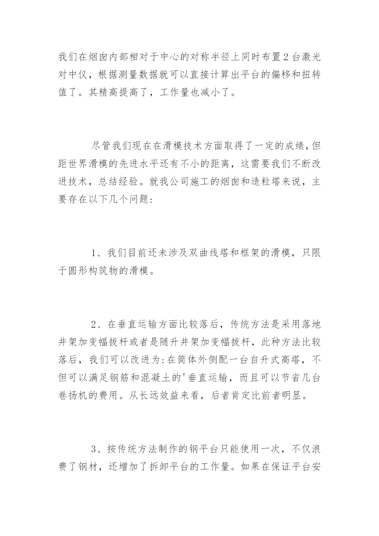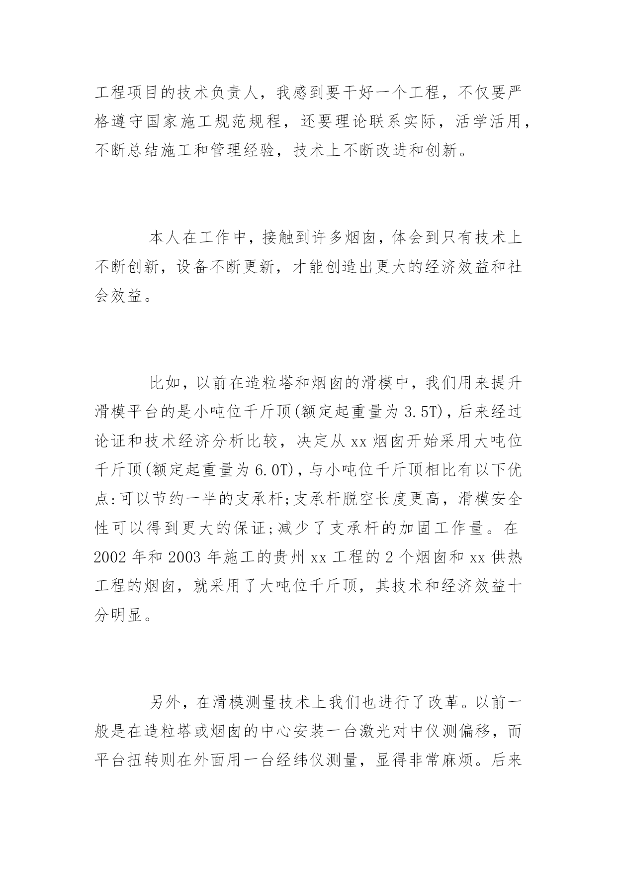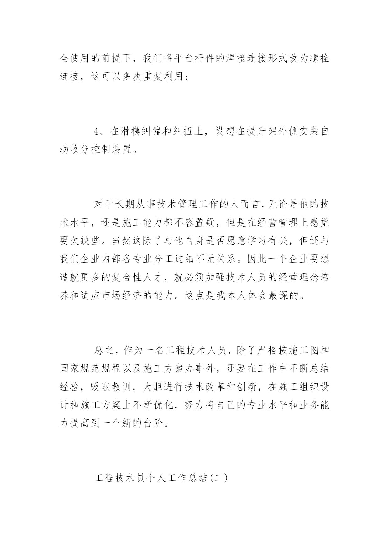 工程技术员个人工作总结工程技术员个人工作总结工程技术员指负担工程技术和工程技术管理工作并具有工程技术能力的人员,填报告期末人数,下面由百分网小编为你整理的工程技术员个人工作总结,希望大家希望!工程技术员个人工作总结(一)本人xx年x月参加工作,先后参加了:xx公司综合楼的建设;涪陵xx大化肥工程造粒塔的技术准备工作和▼14.60~▼82.00米筒身滑模的施工工作;xx工程合成氨片区氨罐基础的施工工作;新疆xx工程造粒塔的滑模施工工作;贵州xx工程H=100m排气筒的技术准备工作和筒身滑模工作;新疆xx电站的施工管理;云天化xx烟囱的施工管理;新疆xx电站烟囱的施工管理;新疆xx会展中心的施工管理;贵州xx硫酸工程的技术管理及贵州xx磷酸工程的技术管理;xx供热工程的施工管理工作。无论是作为一名普通的工程技术人员,还是作为一个工程项目的技术负责人,我感到要干好一个工程,不仅要严格遵守国家施工规范规程,还要理论联系实际,活学活用,不断总结施工和管理经验,技术上不断改进和创新。本人在工作中,接触到许多烟囱,体会到只有技术上不断创新,设备不断更新,才能创造出更大的经济效益和社会效益。比如,以前在造粒塔和烟囱的滑模中,我们用来提升滑模平台的是小吨位千斤顶(额定起重量为3.5T),后来经过论证和技术经济分析比较,决定从xx烟囱开始采用大吨位千斤顶(额定起重量为6.0T),与小吨位千斤顶相比有以下优点:可以节约一半的支承杆;支承杆脱空长度更高,滑模安全性可以得到更大的保证;减少了支承杆的加固工作量。在2002年和2003年施工的贵州xx工程的2个烟囱和xx供热工程的烟囱,就采用了大吨位千斤顶,其技术和经济效益十分明显。另外,在滑模测量技术上我们也进行了改革。以前一般是在造粒塔或烟囱的中心安装一台激光对中仪测偏移,而平台扭转则在外面用一台经纬仪测量,显得非常麻烦。后来我们在烟囱内部相对于中心的对称半径上同时布置2台激光对中仪,根据测量数据就可以直接计算出平台的偏移和扭转值了。其精高提高了,工作量也减小了。尽管我们现在在滑模技术方面取得了一定的成绩,但距世界滑模的先进水平还有不小的距离,这需要我们不断改进技术,总结经验。就我公司施工的烟囱和造粒塔来说,主要存在以下几个问题:1、我们目前还未涉及双曲线塔和框架的滑模,只限于圆形构筑物的滑模。2、在垂直运输方面比较落后,传统方法是采用落地井架加变幅拔杆或者是随升井架加变幅拔杆,此种方法比较落后,我们可以改进为:在筒体外侧配一台自升式高塔,不但可以满足钢筋和混凝土的'垂直运输,而且可以节省几台卷扬机的费用。从长远效益来看,后者肯定比前者明显。3、按传统方法制作的钢平台只能使用一次,不仅浪费了钢材,还增加了拆卸平台的工作量。如果在保证平台安全使用的前提下,我们将平台杆件的焊接连接形式改为螺栓连接,这可以多次重复利用;4、在滑模纠偏和纠扭上,设想在提升架外侧安装自动收分控制装置。对于长期从事技术管理工作的人而言,无论是他的技术水平,还是施工能力都不容置疑,但是在经营管理上感觉要欠缺些。当然这除了与他自身是否愿意学习有关,但还与我们企业内部各专业分工过细不无关系。因此一个企业要想造就更多的复合性人才,就必须加强技术人员的经营理念培养和适应市场经济的能力。这点是我本人体会最深的。总之,作为一名工程技术人员,除了严格按施工图和国家规范规程以及施工方案办事外,还要在工作中不断总结经验,吸取教训,大胆进行技术改革和创新,在施工组织设计和施工方案上不断优化,努力将自己的专业水平和业务能力提高到一个新的台阶。工程技术员个人工作总结(二)时光荏苒,岁月流转,转眼间参加工作一年了。我于2013年6月7日进入北京城建集团水务部小红门项目部业已满一年了。回顾一年的工作,在工地领导及各位同志的帮助下,在思想意思、工作能力等各方面都取得了一定的进步,在这里衷心的表示感谢。为了更好的做好自己今后的工作,总结经验、吸取教训,现将过去一年的工作情况总结如下:一、在去年6月份我进入水务部小红门项目部工作,在工地一年的时间里,使我对图纸、仪器、工程质量要求、文明施工、安全管理等有了进一步认知。1、在图纸方面使我认识到,在施工之前要仔细查看图纸,把图纸的每个细节都要了然于胸,不懂得地方要及时请教同事或领导,不能想当然施工。要做到按图施工,百分百确定以后再施工。但凡有图纸更改,以及有施工图不符的地方,必须详细记录。2、在仪器方面让我知道,算数据时要专心,算完必须复查,以免出现错误,在使用仪器的时候要专心致志,仔细观察确认好数据后要赶紧记录,以免前后观测的数据在脑子里面混淆不清,仪器要经常效验,保证准确度。3、在工程质量问题必须要严格要求,不能差不多就行。按照规范要求施工,严格要求自己以及施工人员,精益