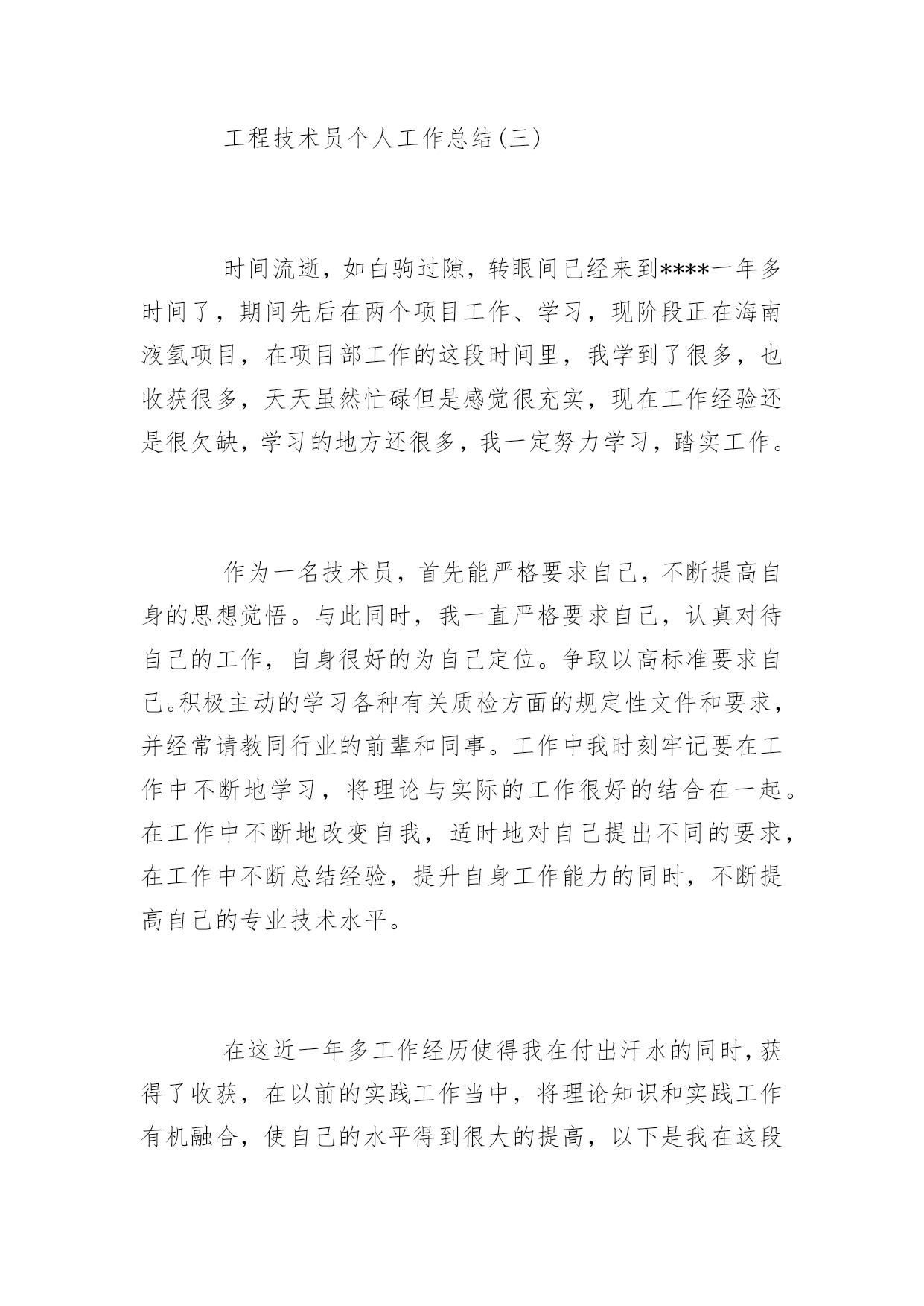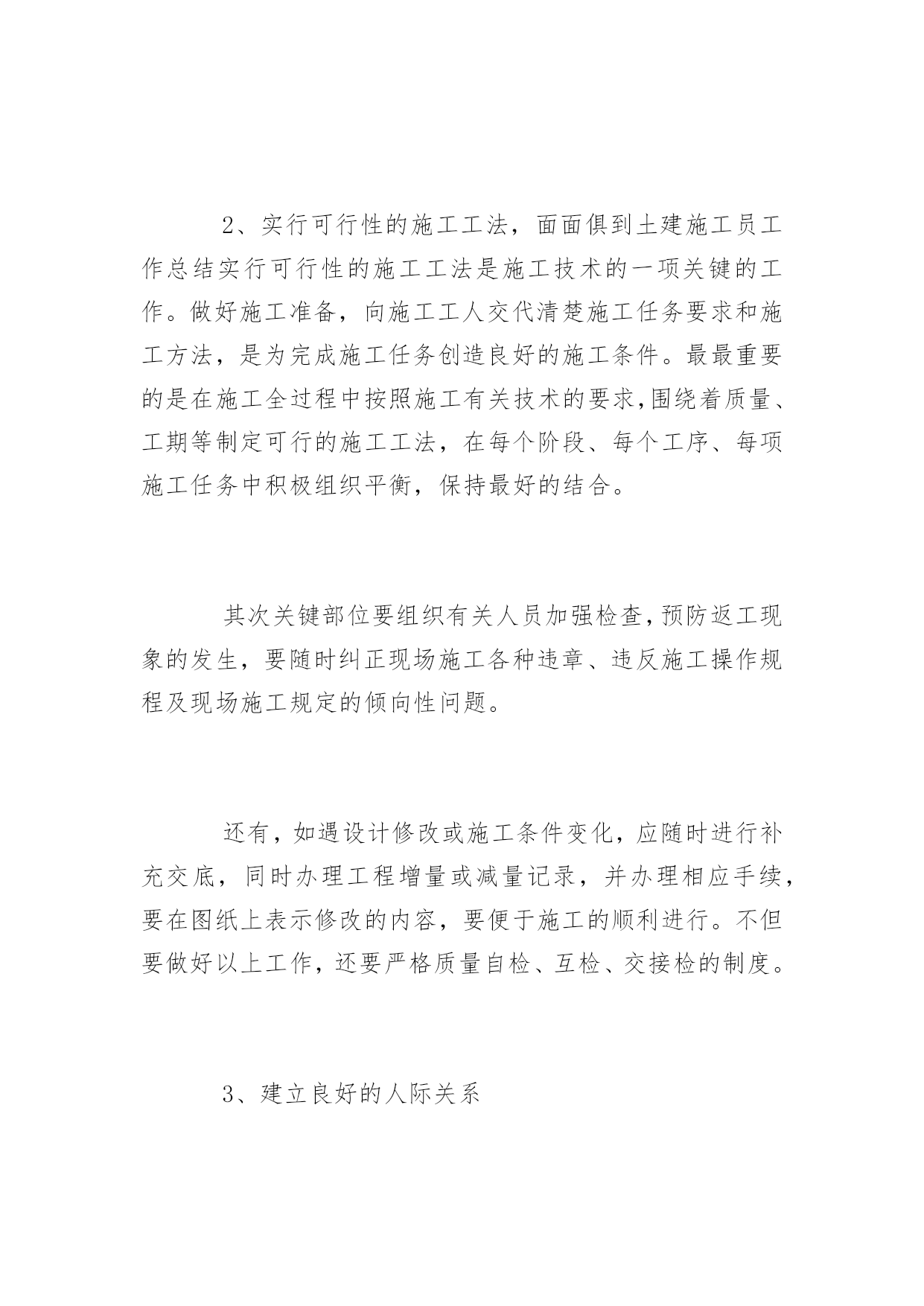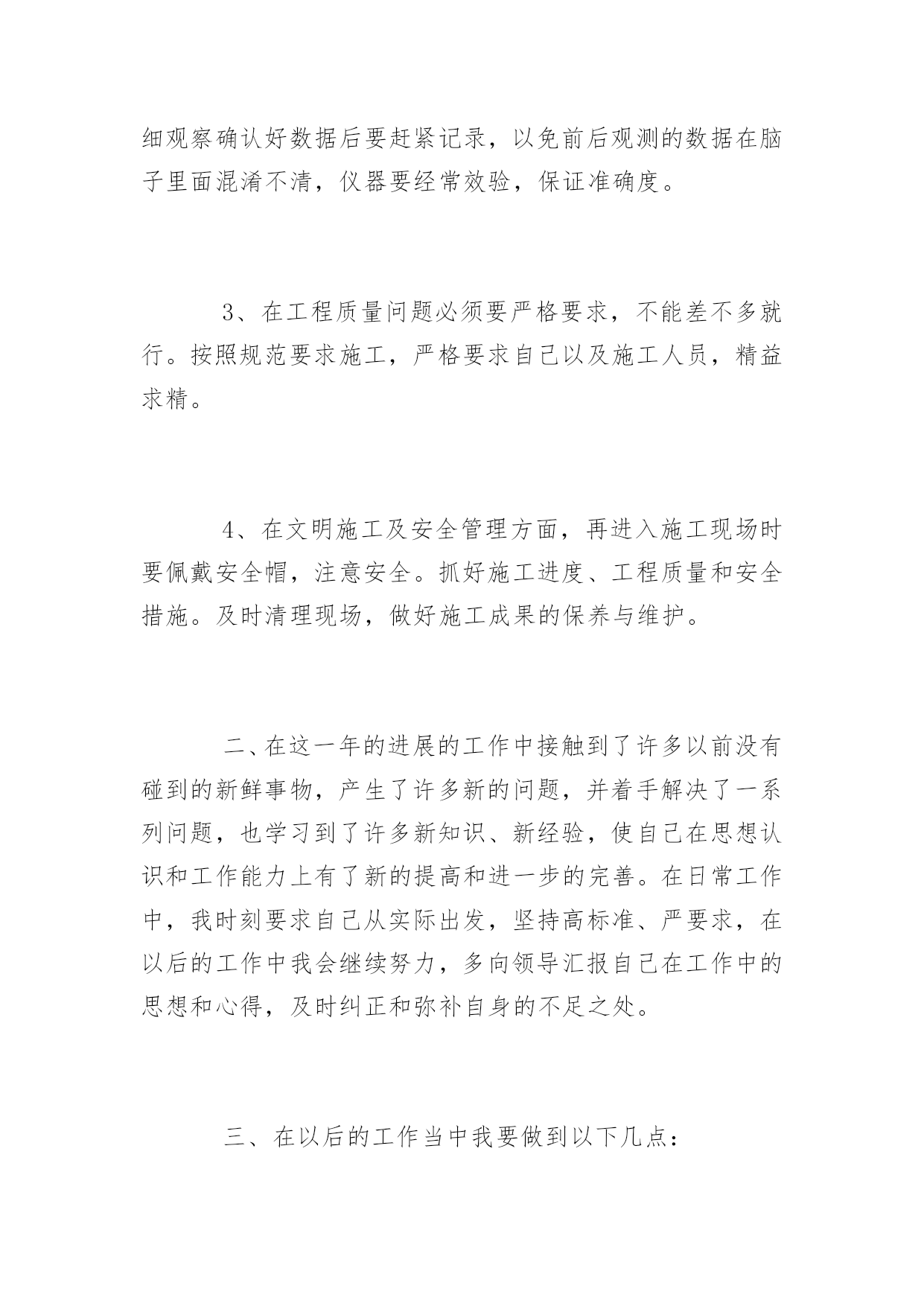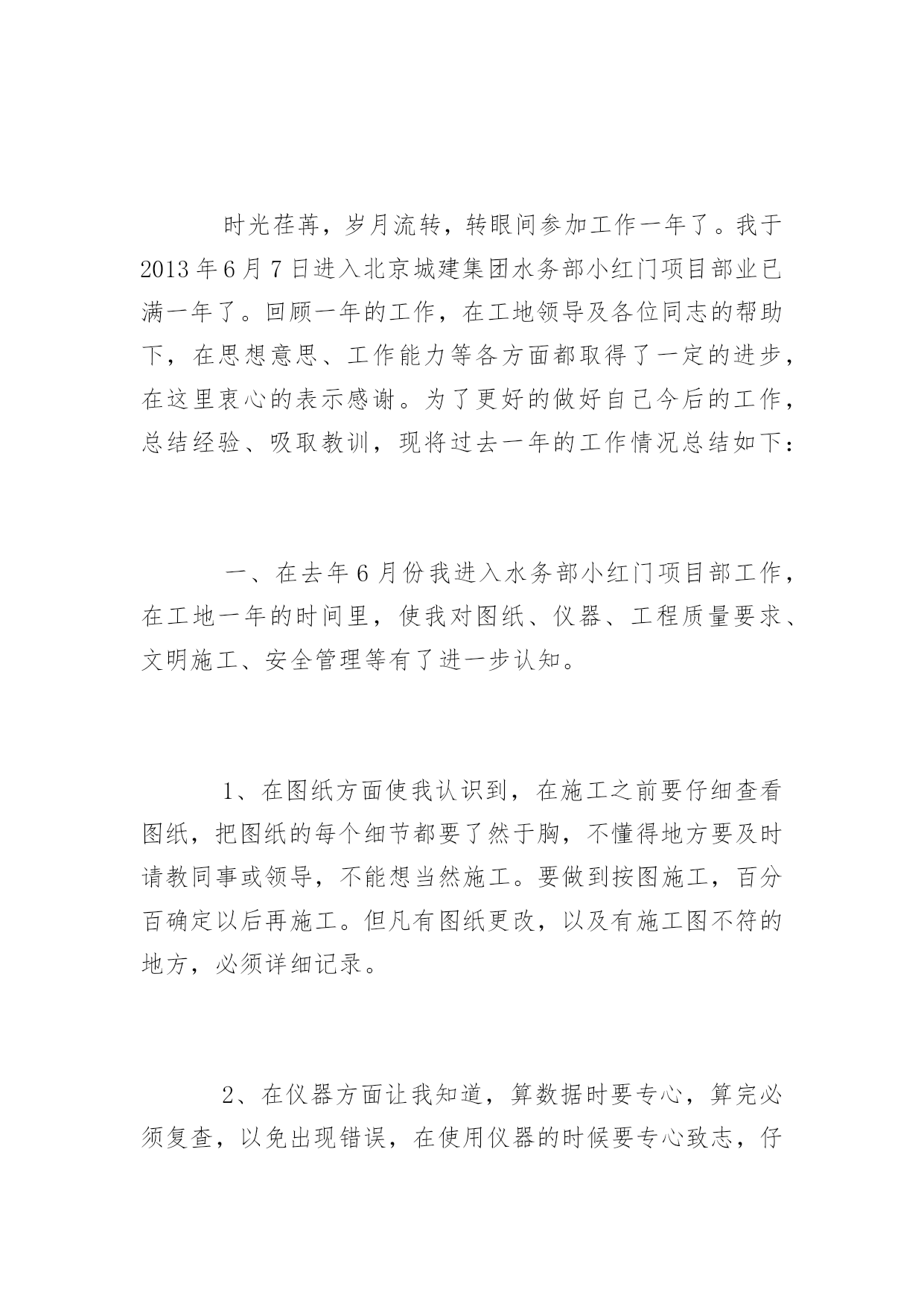 工程技术员个人工作总结工程技术员个人工作总结工程技术员指负担工程技术和工程技术管理工作并具有工程技术能力的人员,填报告期末人数,下面由百分网小编为你整理的工程技术员个人工作总结,希望大家希望!工程技术员个人工作总结(一)本人xx年x月参加工作,先后参加了:xx公司综合楼的建设;涪陵xx大化肥工程造粒塔的技术准备工作和▼14.60~▼82.00米筒身滑模的施工工作;xx工程合成氨片区氨罐基础的施工工作;新疆xx工程造粒塔的滑模施工工作;贵州xx工程H=100m排气筒的技术准备工作和筒身滑模工作;新疆xx电站的施工管理;云天化xx烟囱的施工管理;新疆xx电站烟囱的施工管理;新疆xx会展中心的施工管理;贵州xx硫酸工程的技术管理及贵州xx磷酸工程的技术管理;xx供热工程的施工管理工作。无论是作为一名普通的工程技术人员,还是作为一个工程项目的技术负责人,我感到要干好一个工程,不仅要严格遵守国家施工规范规程,还要理论联系实际,活学活用,不断总结施工和管理经验,技术上不断改进和创新。本人在工作中,接触到许多烟囱,体会到只有技术上不断创新,设备不断更新,才能创造出更大的经济效益和社会效益。比如,以前在造粒塔和烟囱的滑模中,我们用来提升滑模平台的是小吨位千斤顶(额定起重量为3.5T),后来经过论证和技术经济分析比较,决定从xx烟囱开始采用大吨位千斤顶(额定起重量为6.0T),与小吨位千斤顶相比有以下优点:可以节约一半的支承杆;支承杆脱空长度更高,滑模安全性可以得到更大的保证;减少了支承杆的加固工作量。在2002年和2003年施工的贵州xx工程的2个烟囱和xx供热工程的烟囱,就采用了大吨位千斤顶,其技术和经济效益十分明显。另外,在滑模测量技术上我们也进行了改革。以前一般是在造粒塔或烟囱的中心安装一台激光对中仪测偏移,而平台扭转则在外面用一台经纬仪测量,显得非常麻烦。后来我们在烟囱内部相对于中心的对称半径上同时布置2台激光对中仪,根据测量数据就可以直接计算出平台的偏移和扭转值了。其精高提高了,工作量也减小了。尽管我们现在在滑模技术方面取得了一定的成绩,但距世界滑模的先进水平还有不小的距离,这需要我们不断改进技术,总结经验。就我公司施工的烟囱和造粒塔来说,主要存在以下几个问题:1、我们目前还未涉及双曲线塔和框架的滑模,只限于圆形构筑物的滑模。2、在垂直运输方面比较落后,传统方法是采用落地井架加变幅拔杆或者是随升井架加变幅拔杆,此种方法比较落后,我们可以改进为:在筒体外侧配一台自升式高塔,不但可以满足钢筋和混凝土的'垂直运输,而且可以节省几台卷扬机的费用。从长远效益来看,后者肯定比前者明显。3、按传统方法制作的钢平台只能使用一次,不仅浪费了钢材,还增加了拆卸平台的工作量。如果在保证平台安全使用的前提下,我们将平台杆件的焊接连接形式改为螺栓连接,这可以多次重复利用;4、在滑模纠偏和纠扭上,设想在提升架外侧安装自动收分控制装置。对于长期从事技术管理工作的人而言,无论是他的技术水平,还是施工能力都不容置疑,但是在经营管理上感觉要欠缺些。当然这除了与他自身是否愿意学习有关,但还与我们企业内部各专业分工过细不无关系。因此一个企业要想造就更多的复合性人才,就必须加强技术人员的经营理念培养和适应市场经济的能力。这点是我本人体会最深的。总之,作为一名工程技术人员,除了严格按施工图和国家规范规程以及施工方案办事外,还要在工作中不断总结经验,吸取教训,大胆进行技术改革和创新,在施工组织设计和施工方案上不断优化,努力将自己的专业水平和业务能力提高到一个新的台阶。工程技术员个人工作总结(二)时光荏苒,岁月流转,转眼间参加工作一年了。我于2013年6月7日进入北京城建集团水务部小红门项目部业已满一年了。回顾一年的工作,在工地领导及各位同志的帮助下,在思想意思、工作能力等各方面都取得了一定的进步,在这里衷心的表示感谢。为了更好的做好自己今后的工作,总结经验、吸取教训,现将过去一年的工作情况总结如下:一、在去年6月份我进入水务部小红门项目部工作,在工地一年的时间里,使我对图纸、仪器、工程质量要求、文明施工、安全管理等有了进一步认知。1、在图纸方面使我认识到,在施工之前要仔细查看图纸,把图纸的每个细节都要了然于胸,不懂得地方要及时请教同事或领导,不能想当然施工。要做到按图施工,百分百确定以后再施工。但凡有图纸更改,以及有施工图不符的地方,必须详细记录。2、在仪器方面让我知道,算数据时要专心,算完必须复查,以免出现错误,在使用仪器的时候要专心致志,仔细观察确认好数据后要赶紧记录,以免前后观测的数据在脑子里面混淆不清,仪器要经常效验,保证准确度。3、在工程质量问题必须要严格要求,不能差不多就行。按照规范要求施工,严格要求自己以及施工人员,精益