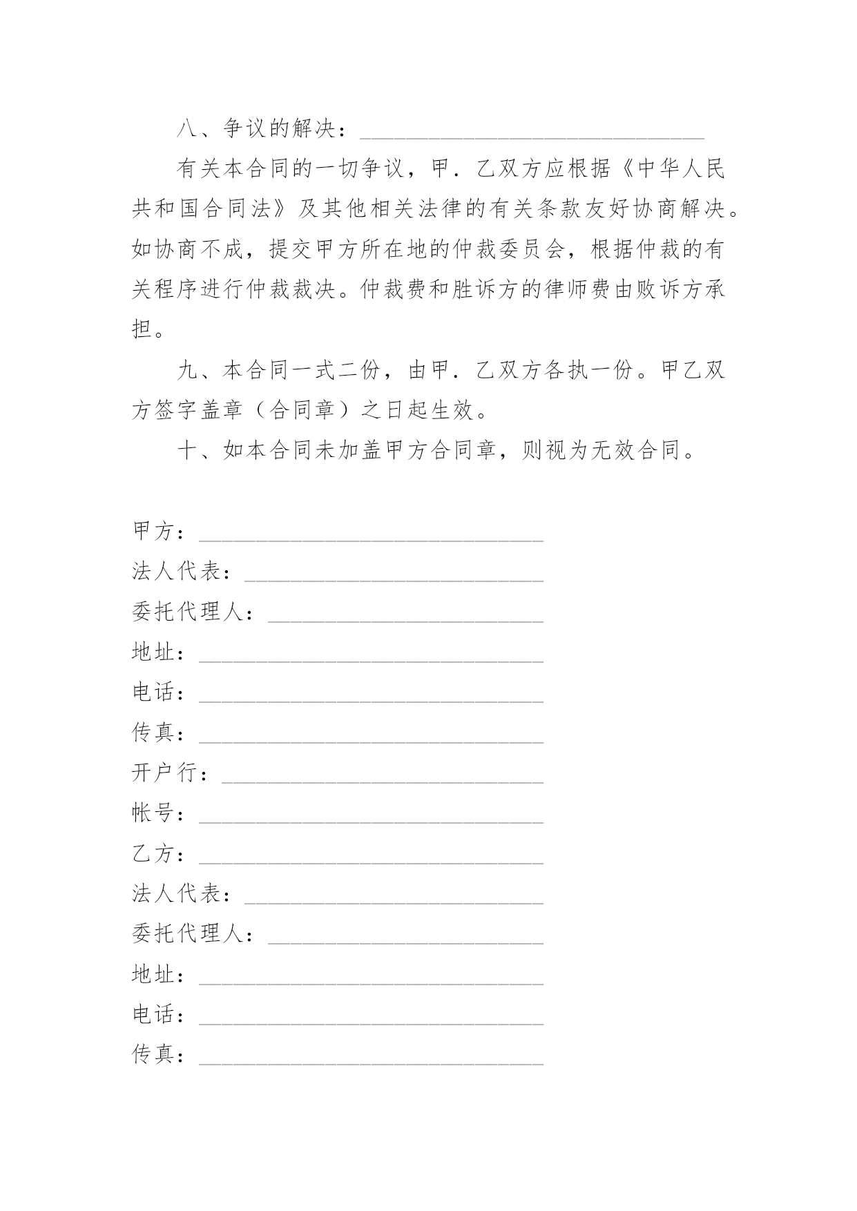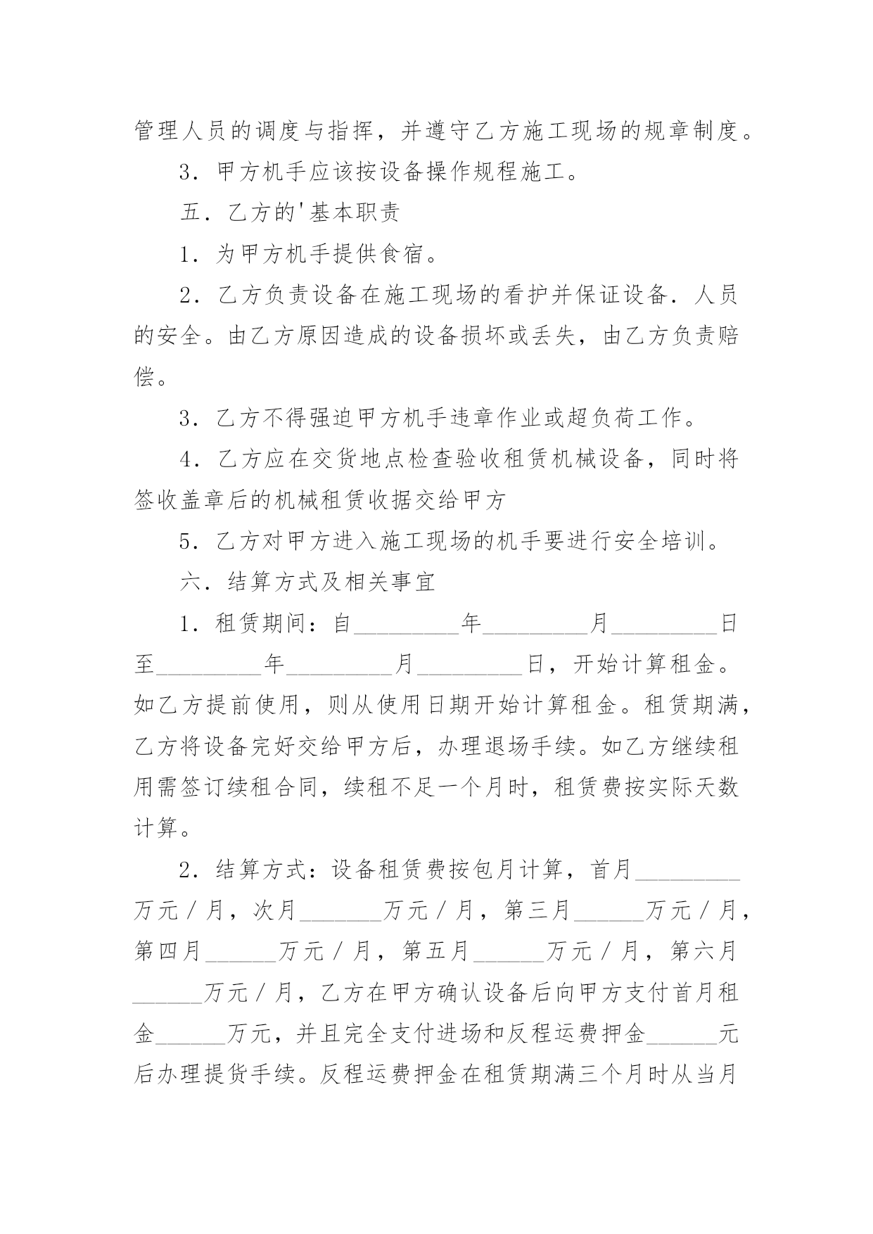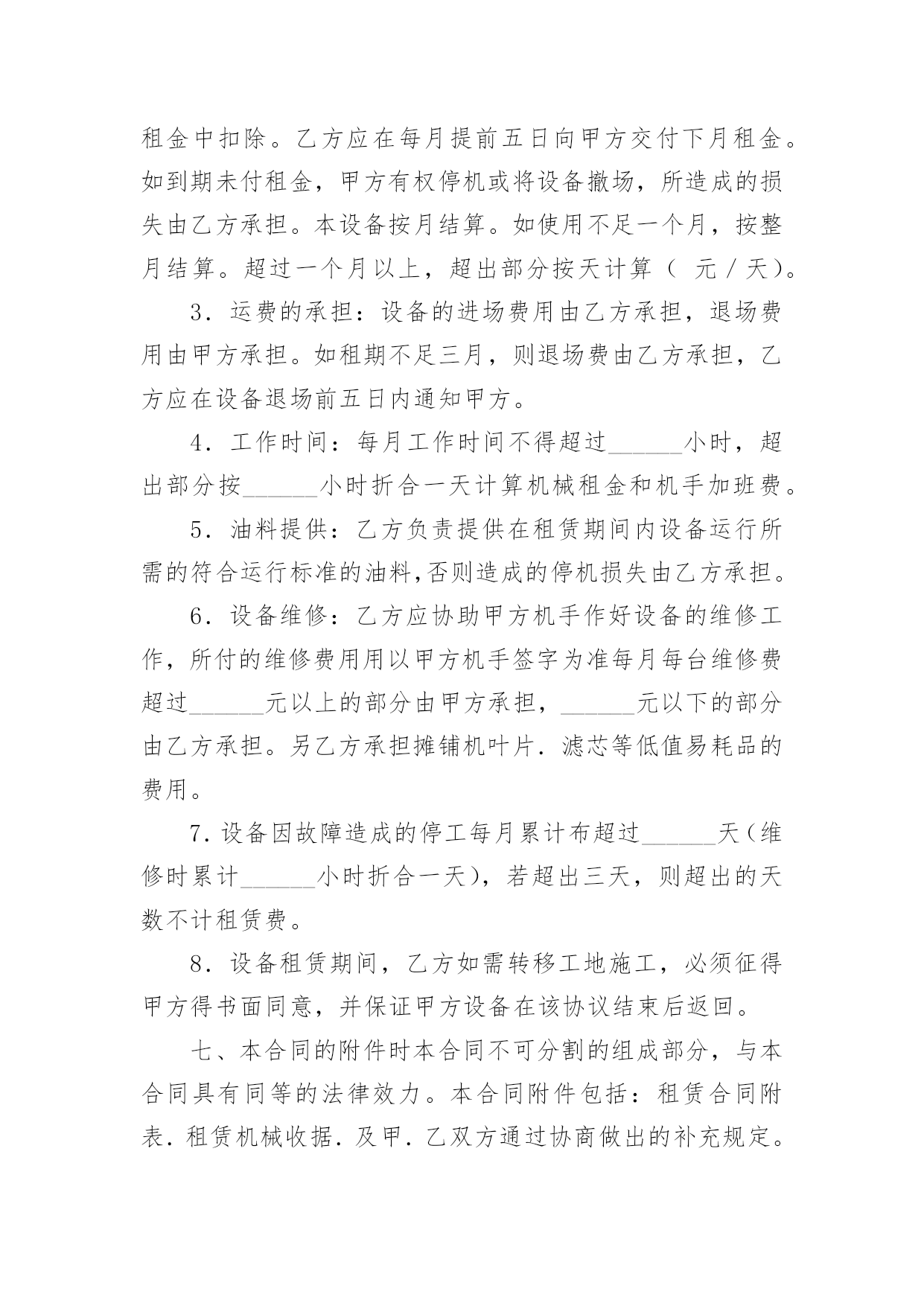 工程机械租赁合同工程机械租赁合同出租方(甲方):___________________承租方(乙方):___________________根据《中华人民共和国合同法》的规定,经双方协商一致,就乙方向甲方承租以下设备达成协议:一、设备的使用地点及工程情况____________________________________二、租赁设备概况设备名称:_____________________规格型号:_____________________数量(台):___________________随机人员(人数):_____________机手补助:_____________________租赁金额:_____________________三、设备的所有权本合同所列的所有租赁设备的所有权属于出租方,承租方对租赁设备机械只享受租赁期间的使用权,没有对设备的转租权。承租方不得以任何理由对设备进行抵押,否则造成的全部后果由承租方承担。四、甲方的基本责任1.提供技术型良好的设备。2.设备进入乙方施工现场厚,甲方机手服从乙方施工管理人员的调度与指挥,并遵守乙方施工现场的规章制度。3.甲方机手应该按设备操作规程施工。五.乙方的'基本职责1.为甲方机手提供食宿。2.乙方负责设备在施工现场的看护并保证设备.人员的安全。由乙方原因造成的设备损坏或丢失,由乙方负责赔偿。3.乙方不得强迫甲方机手违章作业或超负荷工作。4.乙方应在交货地点检查验收租赁机械设备,同时将签收盖章后的机械租赁收据交给甲方5.乙方对甲方进入施工现场的机手要进行安全培训。六.结算方式及相关事宜1.租赁期间:自_________年_________月_________日至_________年_________月_________日,开始计算租金。如乙方提前使用,则从使用日期开始计算租金。租赁期满,乙方将设备完好交给甲方后,办理退场手续。如乙方继续租用需签订续租合同,续租不足一个月时,租赁费按实际天数计算。2.结算方式:设备租赁费按包月计算,首月_________万元/月,次月_______万元/月,第三月______万元/月,第四月______万元/月,第五月______万元/月,第六月______万元/月,乙方在甲方确认设备后向甲方支付首月租金______万元,并且完全支付进场和反程运费押金______元后办理提货手续。反程运费押金在租赁期满三个月时从当月租金中扣除。乙方应在每月提前五日向甲方交付下月租金。如到期未付租金,甲方有权停机或将设备撤场,所造成的损失由乙方承担。本设备按月结算。如使用不足一个月,按整月结算。超过一个月以上,超出部分按天计算(元/天)。3.运费的承担:设备的进场费用由乙方承担,退场费用由甲方承担。如租期不足三月,则退场费由乙方承担,乙方应在设备退场前五日内通知甲方。4.工作时间:每月工作时间不得超过______小时,超出部分按______小时折合一天计算机械租金和机手加班费。5.油料提供:乙方负责提供在租赁期间内设备运行所需的符合运行标准的油料,否则造成的停机损失由乙方承担。6.设备维修:乙方应协助甲方机手作好设备的维修工作,所付的维修费用用以甲方机手签字为准每月每台维修费超过______元以上的部分由甲方承担,______元以下的部分由乙方承担。另乙方承担摊铺机叶片.滤芯等低值易耗品的费用。7.设备因故障造成的停工每月累计布超过______天(维修时累计______小时折合一天),若超出三天,则超出的天数不计租赁费。8.设备租赁期间,乙方如需转移工地施工,必须征得甲方得书面同意,并保证甲方设备在该协议结束后返回。七、本合同的附件时本合同不可分割的组成部分,与本合同具有同等的法律效力。本合同附件包括:租赁合同附表.租赁机械收据.及甲.乙双方通过协商做出的补充规定。八、争议的解决:______________________________有关本合同的一切争议,甲.乙双方应根据《中华人民共和国合同法》及其他相关法律的有关条款友好协商解决。如协商不成,提交甲方所在地的仲裁委员会,根据仲裁的有关程序进行仲裁裁决。仲裁费和胜诉方的律师费由败诉方承担。九、本合同一式二份,由甲.乙双方各执一份。甲乙双方签字盖章(合同章)之日起生效。十、如本合同未加盖甲方合同章,则视为无效合同。甲方:______________________________法人代表:__________________________委托代理人:________________________地址:______________________________电话:______________________________传真:______________________________开户行:_