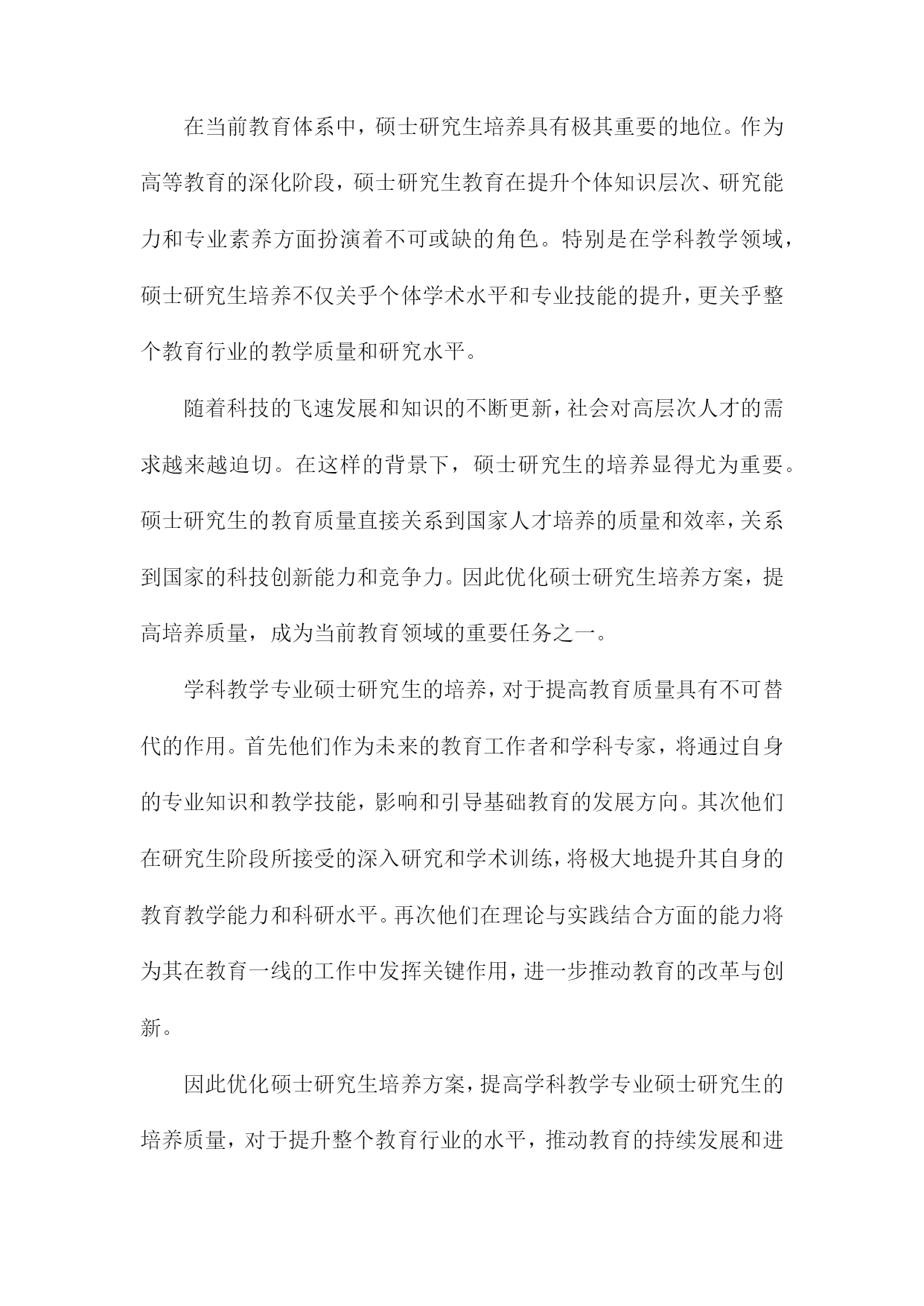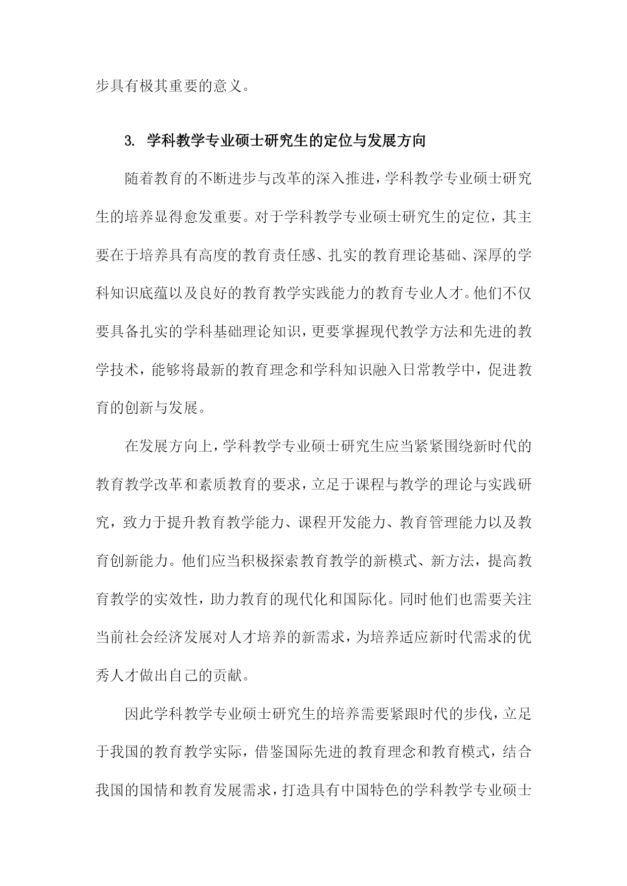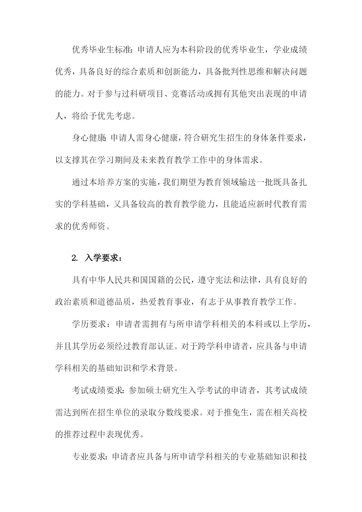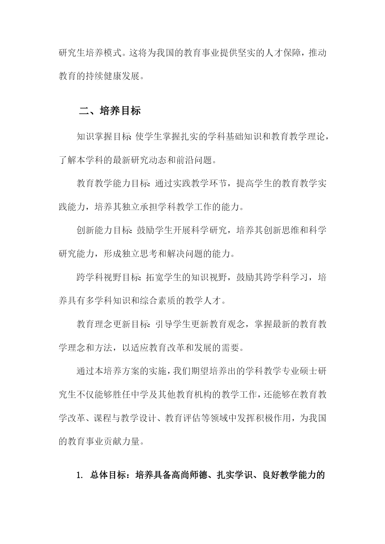 学科教学专业硕士研究生培养方案一、简述随着教育领域的不断发展和进步,对于高层次、专业化的学科教学人才的需求日益增强。为适应这一需求,我们制定了本《学科教学专业硕士研究生培养方案》。该方案旨在培养具备高度专业素养,掌握先进教学理念和方法,能够胜任各学科教学工作的硕士研究生。本方案以培养具有创新精神、实践能力和国际视野的优秀人才为目标,注重理论与实践相结合,强调学术性与应用性的统一。在教学内容上,方案涵盖了教育教学理论、学科基础知识、教学方法论、教学实践等多个方面,旨在全面提升学生的综合素质和专业能力。通过本方案的培养,学生将掌握先进的教育技术,熟悉最新的教育趋势和理念,并能够在未来教育教学工作中发挥重要作用。此外本方案还注重培养学生的跨学科视野和综合素养,以适应新时代教育教学的多元化需求。1.背景介绍:当前教育发展趋势及教育教学改革的需要《学科教学专业硕士研究生培养方案》之背景介绍:当前教育发展趋势及教育教学改革的需要背景介绍:随着全球化进程的加速和知识经济时代的到来,教育领域的改革与发展日新月异。当前我国教育事业正处在全面建设社会主义现代化国家的关键时期,教育教学改革不断深化,旨在培养更多具备创新精神和实践能力的高素质人才。在这样的时代背景下,学科教学专业硕士研究生的培养显得尤为重要。随着教育理念的更新和教育技术的不断进步,现代教育正朝着多元化、个性化、智能化的方向发展。社会对教育的要求越来越高,对教师的专业素养和教学能力也提出了更高的要求。特别是在新课程改革的推动下,教师需要不断更新教育观念,提高教育教学能力,以适应新时代教育的需求。因此加强学科教学专业硕士研究生的培养工作,提高教师的专业素养和教学能力水平,是当前教育发展的必然趋势。此外教育教学改革的需要也日益迫切,在新时代背景下,教育教学改革面临着许多新的挑战和机遇。教育教学改革需要教师具备更高的教育教学能力和科研水平,以适应社会对教育的多元化需求。因此加强学科教学专业硕士研究生的培养工作,为教育教学改革提供有力的人才支撑,是当前教育教学改革的需要。当前教育发展趋势和教育教学改革的需要,为学科教学专业硕士研究生的培养提供了广阔的空间和机遇。我们必须紧跟时代步伐,加强教育教学改革,不断提高教师的专业素养和教学能力水平,以满足新时代社会对教育的需求。2.硕士研究生培养的重要性及其在提高教育质量中的作用在当前教育体系中,硕士研究生培养具有极其重要的地位。作为高等教育的深化阶段,硕士研究生教育在提升个体知识层次、研究能力和专业素养方面扮演着不可或缺的角色。特别是在学科教学领域,硕士研究生培养不仅关乎个体学术水平和专业技能的提升,更关乎整个教育行业的教学质量和研究水平。随着科技的飞速发展和知识的不断更新,社会对高层次人才的需求越来越迫切。在这样的背景下,硕士研究生的培养显得尤为重要。硕士研究生的教育质量直接关系到国家人才培养的质量和效率,关系到国家的科技创新能力和竞争力。因此优化硕士研究生培养方案,提高培养质量,成为当前教育领域的重要任务之一。学科教学专业硕士研究生的培养,对于提高教育质量具有不可替代的作用。首先他们作为未来的教育工作者和学科专家,将通过自身的专业知识和教学技能,影响和引导基础教育的发展方向。其次他们在研究生阶段所接受的深入研究和学术训练,将极大地提升其自身的教育教学能力和科研水平。再次他们在理论与实践结合方面的能力将为其在教育一线的工作中发挥关键作用,进一步推动教育的改革与创新。因此优化硕士研究生培养方案,提高学科教学专业硕士研究生的培养质量,对于提升整个教育行业的水平,推动教育的持续发展和进步具有极其重要的意义。3.学科教学专业硕士研究生的定位与发展方向随着教育的不断进步与改革的深入推进,学科教学专业硕士研究生的培养显得愈发重要。对于学科教学专业硕士研究生的定位,其主要在于培养具有高度的教育责任感、扎实的教育理论基础、深厚的学科知识底蕴以及良好的教育教学实践能力的教育专业人才。他们不仅要具备扎实的学科基础理论知识,更要掌握现代教学方法和先进的教学技术,能够将最新的教育理念和学科知识融入日常教学中,促进教育的创新与发展。在发展方向上,学科教学专业硕士研究生应当紧紧围绕新时代的教育教学改革和素质教育的要求,立足于课程与教学的理论与实践研究,致力于提升教育教学能力、课程开发能力、教育管理能力以及教育创新能力。他们应当积极探索教育教学的新模式、新方法,提高教育教学的实效性,助力教育的现代化和国际化。同时他们也需要关注当前社会经济发展对人才培养的新需求,为培养适应新时代需求的优秀人才做出自己的贡献。因此学科教学专业硕士研究生的培养需要紧跟时代的步伐,立足于我国的教育教学实际,借鉴国际先进的教育理念和教育模式,结合我国的国情和教育发展需求,
