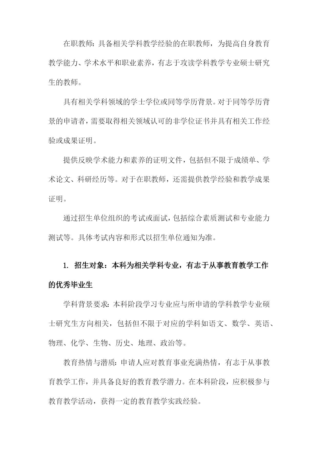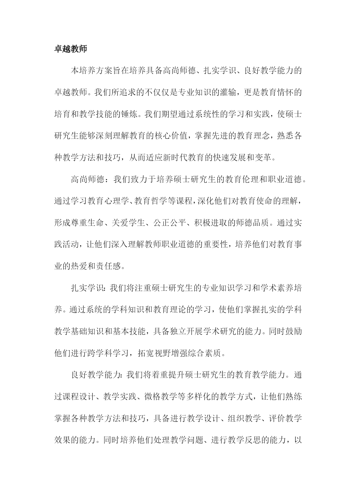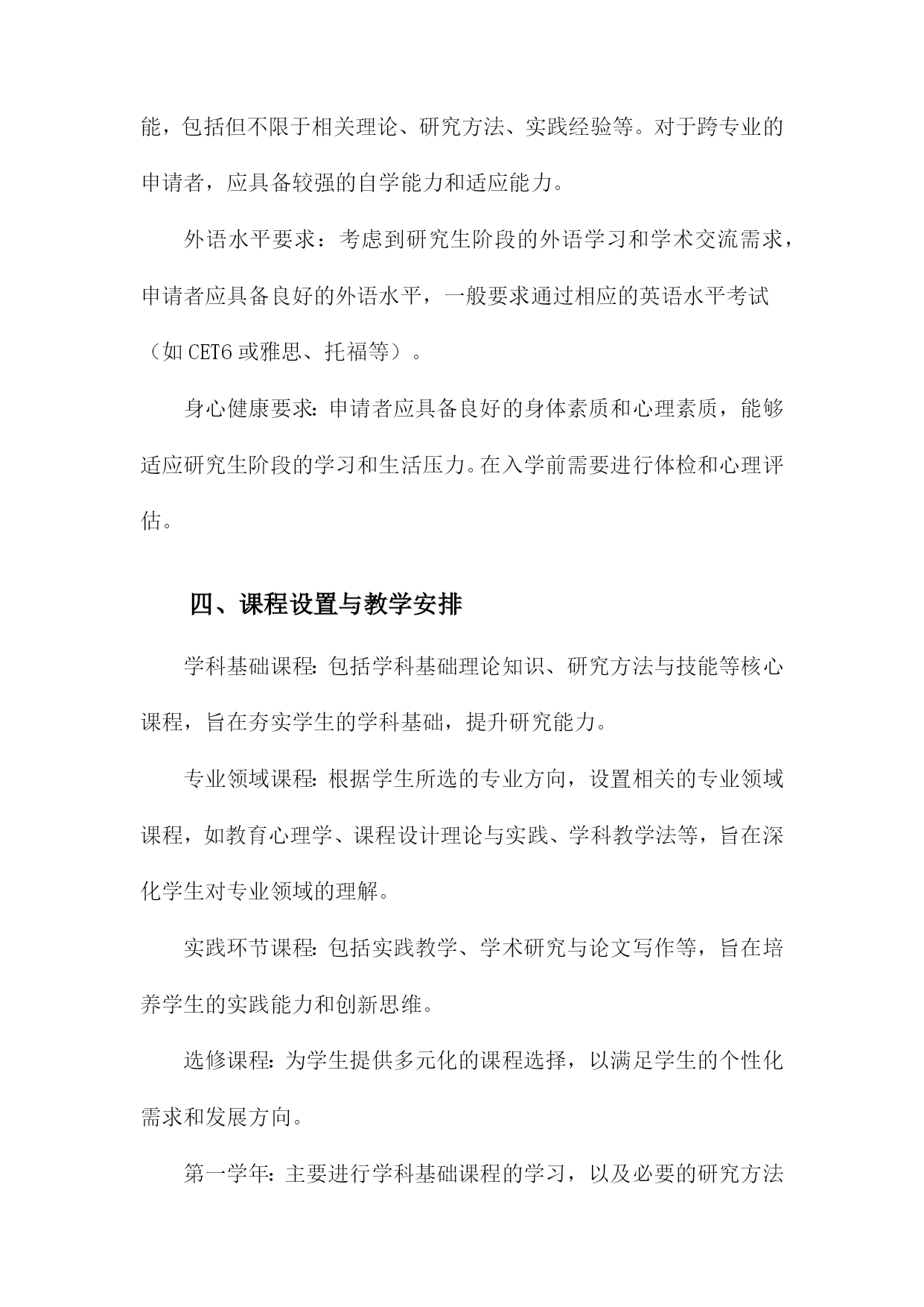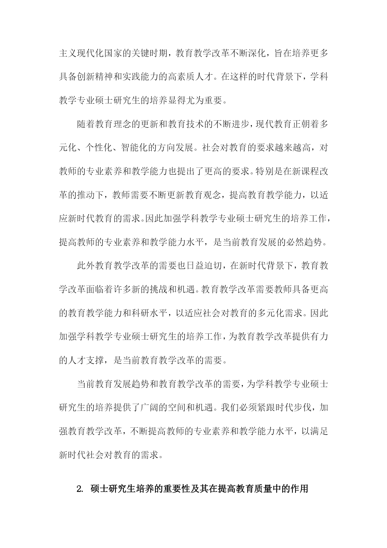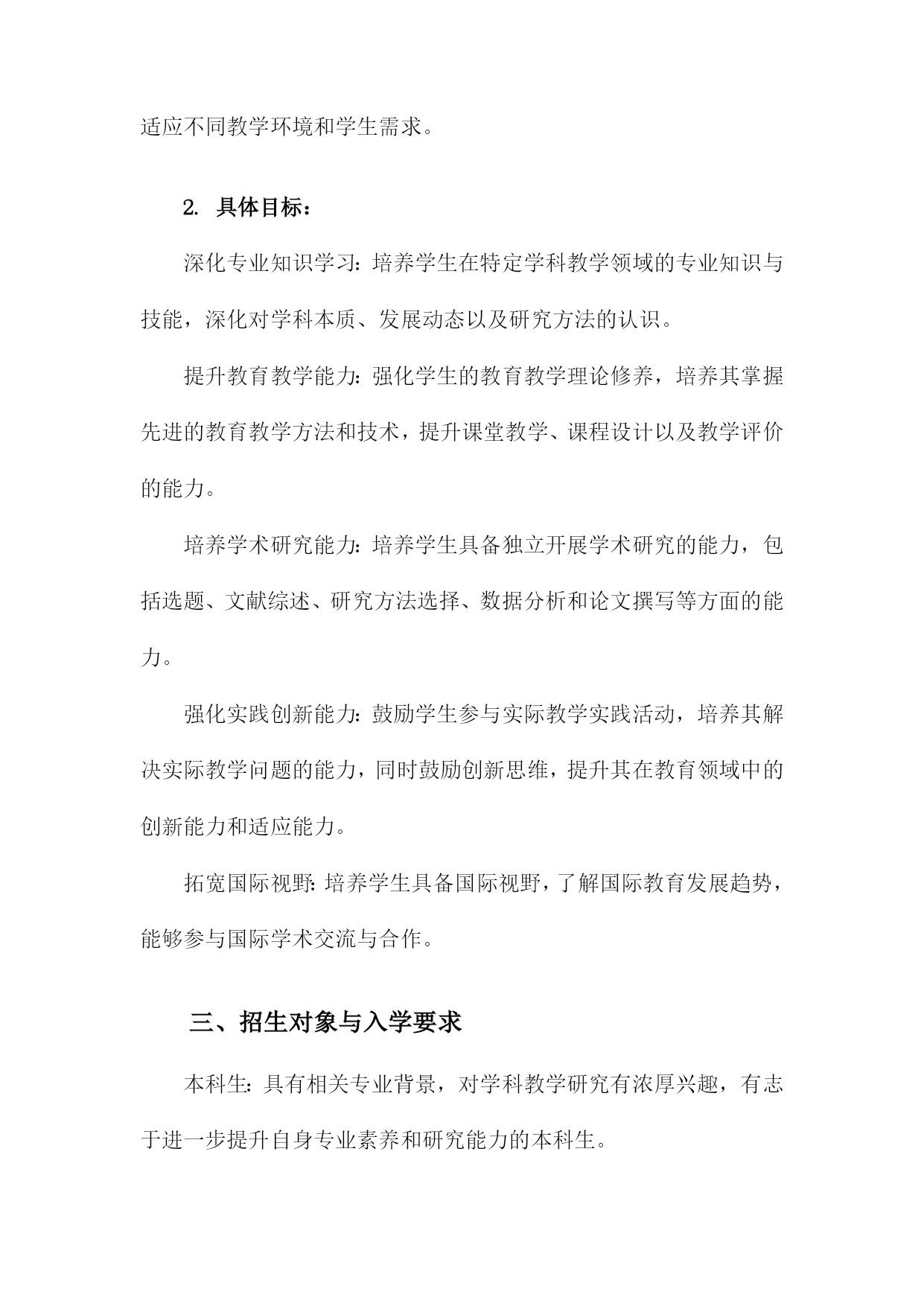 学科教学专业硕士研究生培养方案一、简述随着教育领域的不断发展和进步,对于高层次、专业化的学科教学人才的需求日益增强。为适应这一需求,我们制定了本《学科教学专业硕士研究生培养方案》。该方案旨在培养具备高度专业素养,掌握先进教学理念和方法,能够胜任各学科教学工作的硕士研究生。本方案以培养具有创新精神、实践能力和国际视野的优秀人才为目标,注重理论与实践相结合,强调学术性与应用性的统一。在教学内容上,方案涵盖了教育教学理论、学科基础知识、教学方法论、教学实践等多个方面,旨在全面提升学生的综合素质和专业能力。通过本方案的培养,学生将掌握先进的教育技术,熟悉最新的教育趋势和理念,并能够在未来教育教学工作中发挥重要作用。此外本方案还注重培养学生的跨学科视野和综合素养,以适应新时代教育教学的多元化需求。1.背景介绍:当前教育发展趋势及教育教学改革的需要《学科教学专业硕士研究生培养方案》之背景介绍:当前教育发展趋势及教育教学改革的需要背景介绍:随着全球化进程的加速和知识经济时代的到来,教育领域的改革与发展日新月异。当前我国教育事业正处在全面建设社会主义现代化国家的关键时期,教育教学改革不断深化,旨在培养更多具备创新精神和实践能力的高素质人才。在这样的时代背景下,学科教学专业硕士研究生的培养显得尤为重要。随着教育理念的更新和教育技术的不断进步,现代教育正朝着多元化、个性化、智能化的方向发展。社会对教育的要求越来越高,对教师的专业素养和教学能力也提出了更高的要求。特别是在新课程改革的推动下,教师需要不断更新教育观念,提高教育教学能力,以适应新时代教育的需求。因此加强学科教学专业硕士研究生的培养工作,提高教师的专业素养和教学能力水平,是当前教育发展的必然趋势。此外教育教学改革的需要也日益迫切,在新时代背景下,教育教学改革面临着许多新的挑战和机遇。教育教学改革需要教师具备更高的教育教学能力和科研水平,以适应社会对教育的多元化需求。因此加强学科教学专业硕士研究生的培养工作,为教育教学改革提供有力的人才支撑,是当前教育教学改革的需要。当前教育发展趋势和教育教学改革的需要,为学科教学专业硕士研究生的培养提供了广阔的空间和机遇。我们必须紧跟时代步伐,加强教育教学改革,不断提高教师的专业素养和教学能力水平,以满足新时代社会对教育的需求。2.硕士研究生培养的重要性及其在提高教育质量中的作用在当前教育体系中,硕士研究生培养具有极其重要的地位。作为高等教育的深化阶段,硕士研究生教育在提升个体知识层次、研究能力和专业素养方面扮演着不可或缺的角色。特别是在学科教学领域,硕士研究生培养不仅关乎个体学术水平和专业技能的提升,更关乎整个教育行业的教学质量和研究水平。随着科技的飞速发展和知识的不断更新,社会对高层次人才的需求越来越迫切。在这样的背景下,硕士研究生的培养显得尤为重要。硕士研究生的教育质量直接关系到国家人才培养的质量和效率,关系到国家的科技创新能力和竞争力。因此优化硕士研究生培养方案,提高培养质量,成为当前教育领域的重要任务之一。学科教学专业硕士研究生的培养,对于提高教育质量具有不可替代的作用。首先他们作为未来的教育工作者和学科专家,将通过自身的专业知识和教学技能,影响和引导基础教育的发展方向。其次他们在研究生阶段所接受的深入研究和学术训练,将极大地提升其自身的教育教学能力和科研水平。再次他们在理论与实践结合方面的能力将为其在教育一线的工作中发挥关键作用,进一步推动教育的改革与创新。因此优化硕士研究生培养方案,提高学科教学专业硕士研究生的培养质量,对于提升整个教育行业的水平,推动教育的持续发展和进步具有极其重要的意义。3.学科教学专业硕士研究生的定位与发展方向随着教育的不断进步与改革的深入推进,学科教学专业硕士研究生的培养显得愈发重要。对于学科教学专业硕士研究生的定位,其主要在于培养具有高度的教育责任感、扎实的教育理论基础、深厚的学科知识底蕴以及良好的教育教学实践能力的教育专业人才。他们不仅要具备扎实的学科基础理论知识,更要掌握现代教学方法和先进的教学技术,能够将最新的教育理念和学科知识融入日常教学中,促进教育的创新与发展。在发展方向上,学科教学专业硕士研究生应当紧紧围绕新时代的教育教学改革和素质教育的要求,立足于课程与教学的理论与实践研究,致力于提升教育教学能力、课程开发能力、教育管理能力以及教育创新能力。他们应当积极探索教育教学的新模式、新方法,提高教育教学的实效性,助力教育的现代化和国际化。同时他们也需要关注当前社会经济发展对人才培养的新需求,为培养适应新时代需求的优秀人才做出自己的贡献。因此学科教学专业硕士研究生的培养需要紧跟时代的步伐,立足于我国的教育教学实际,借鉴国际先进的教育理念和教育模式,结合我国的国情和教育发展需求,