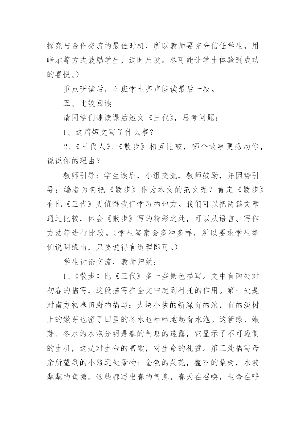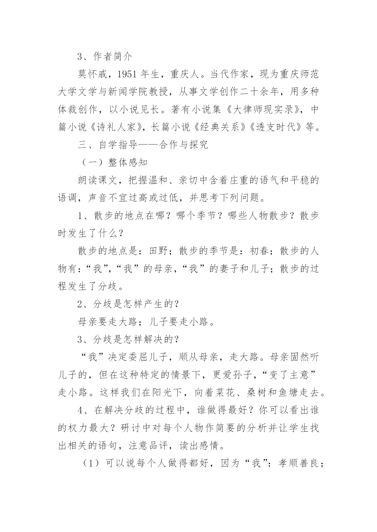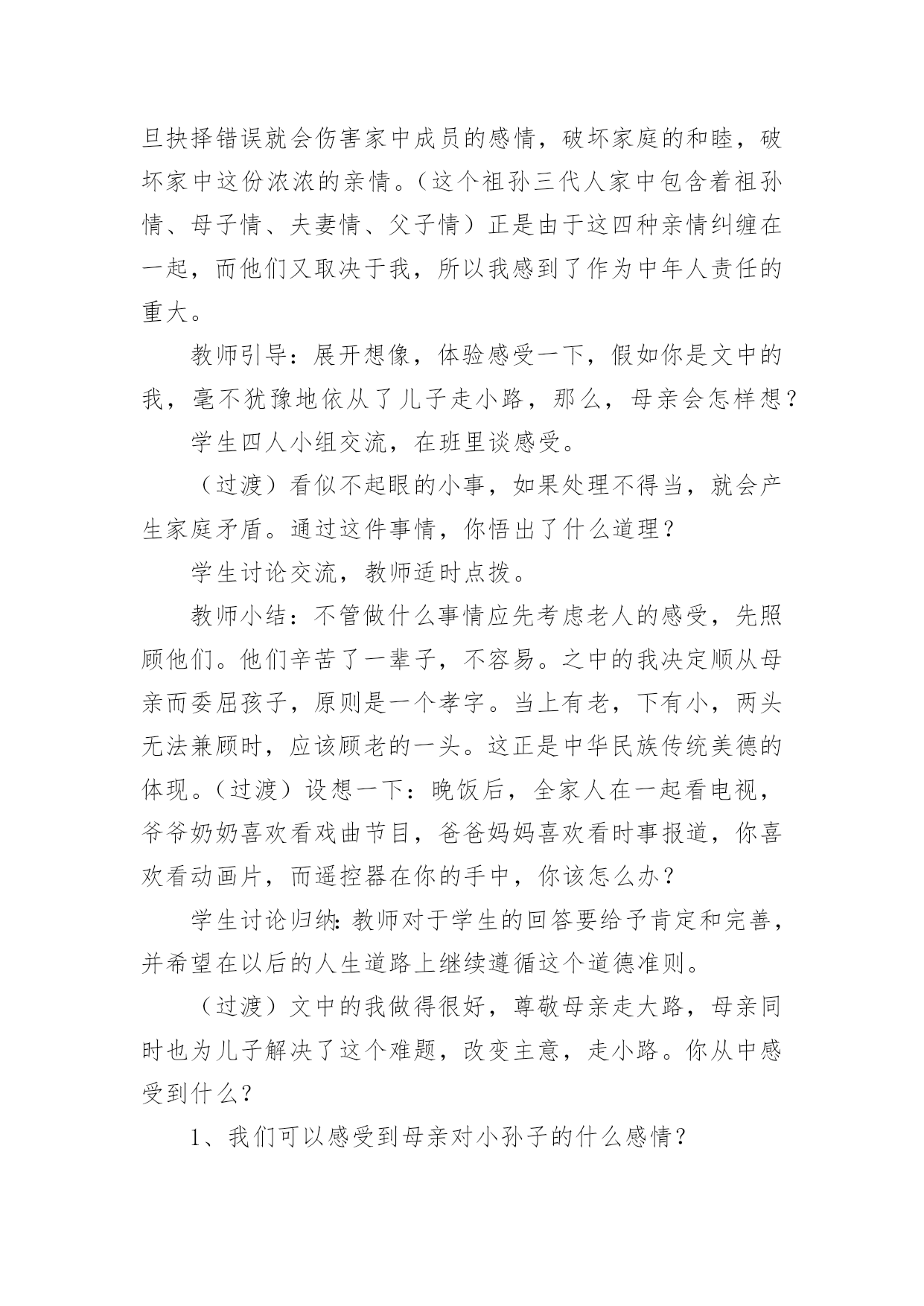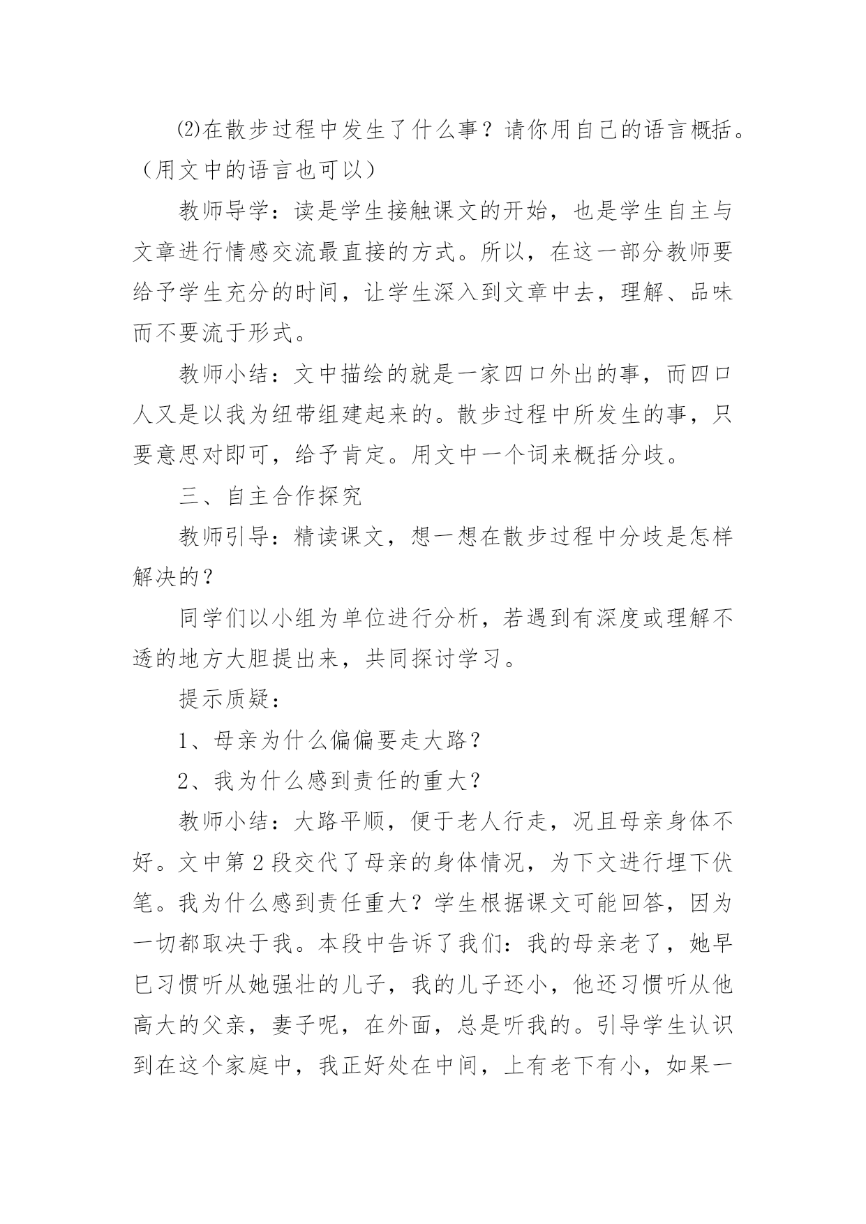 《散步》优秀教学设计《散步》优秀教学设计范文作为一位杰出的老师,时常需要准备好教学设计,教学设计是教育技术的组成部分,它的功能在于运用系统方法设计教学过程,使之成为一种具有操作性的程序。如何把教学设计做到重点突出呢?下面是小编为大家收集的《散步》优秀教学设计范文,供大家参考借鉴,希望可以帮助到有需要的朋友。《散步》优秀教学设计范文1【教学目标】1、知识和技能:整体感悟课文内容,通过比较阅读提高审美情趣。2、过程和方法:学习自主、合作、探究的学习方式。3、情感态度价值观:培养尊老爱幼、珍爱亲情、珍爱生命的情感。【教学重点】整体感知课文内容,品味揣摩语句。【课前准备】学生:强调课文预习,自读课文,圈点生字词。勾画出文中不理解的句子,提出疑难问题。教师:1、准备课前说话训练的资料(尊老爱幼的故事),安排学生作准备。2、可用多媒体辅助教学。【教学内容】1、整体感悟课文内容。2、培养尊老爱幼、珍爱亲情、珍爱生命的情感。【教学设计】一、导入孝敬父母、尊老爱幼是我们中华民族传统美德,也体现着人世间美好的情感──亲情。其实,在我们成长的过程中一直都沐浴着亲情。哪位同学能联系生活实际,说说你都感受到了哪些亲情?(学生举例回答,教师予以肯定)像在日常生活中全家人一起吃饭、看电视、聊天,等等。哪怕是一家人一起散步这样平常的小事,也能体现出浓浓的亲情。《散步》这篇课文就为我们讲述了这样一个感人的故事。出示学习目标并板书课题二、感知课文内容1、检查生字词。2、教师可配乐范读课文,学生体验作品的语感和情感。3、学生自由朗读课文。(或仿读)要求:正确、流利、有感情。4、带问题朗读课文。大屏幕投影出示问题组:⑴课文写了哪几个人物?主人公是谁?⑵在散步过程中发生了什么事?请你用自己的语言概括。(用文中的语言也可以)教师导学:读是学生接触课文的开始,也是学生自主与文章进行情感交流最直接的方式。所以,在这一部分教师要给予学生充分的时间,让学生深入到文章中去,理解、品味而不要流于形式。教师小结:文中描绘的就是一家四口外出的事,而四口人又是以我为纽带组建起来的。散步过程中所发生的事,只要意思对即可,给予肯定。用文中一个词来概括分歧。三、自主合作探究教师引导:精读课文,想一想在散步过程中分歧是怎样解决的?同学们以小组为单位进行分析,若遇到有深度或理解不透的地方大胆提出来,共同探讨学习。提示质疑:1、母亲为什么偏偏要走大路?2、我为什么感到责任的重大?教师小结:大路平顺,便于老人行走,况且母亲身体不好。文中第2段交代了母亲的身体情况,为下文进行埋下伏笔。我为什么感到责任重大?学生根据课文可能回答,因为一切都取决于我。本段中告诉了我们:我的母亲老了,她早巳习惯听从她强壮的儿子,我的儿子还小,他还习惯听从他高大的父亲,妻子呢,在外面,总是听我的。引导学生认识到在这个家庭中,我正好处在中间,上有老下有小,如果一旦抉择错误就会伤害家中成员的感情,破坏家庭的和睦,破坏家中这份浓浓的亲情。(这个祖孙三代人家中包含着祖孙情、母子情、夫妻情、父子情)正是由于这四种亲情纠缠在一起,而他们又取决于我,所以我感到了作为中年人责任的重大。教师引导:展开想像,体验感受一下,假如你是文中的我,毫不犹豫地依从了儿子走小路,那么,母亲会怎样想?学生四人小组交流,在班里谈感受。(过渡)看似不起眼的小事,如果处理不得当,就会产生家庭矛盾。通过这件事情,你悟出了什么道理?学生讨论交流,教师适时点拨。教师小结:不管做什么事情应先考虑老人的感受,先照顾他们。他们辛苦了一辈子,不容易。之中的我决定顺从母亲而委屈孩子,原则是一个孝字。当上有老,下有小,两头无法兼顾时,应该顾老的一头。这正是中华民族传统美德的体现。(过渡)设想一下:晚饭后,全家人在一起看电视,爷爷奶奶喜欢看戏曲节目,爸爸妈妈喜欢看时事报道,你喜欢看动画片,而遥控器在你的手中,你该怎么办?学生讨论归纳:教师对于学生的回答要给予肯定和完善,并希望在以后的人生道路上继续遵循这个道德准则。(过渡)文中的我做得很好,尊敬母亲走大路,母亲同时也为儿子解决了这个难题,改变主意,走小路。你从中感受到什么?1、我们可以感受到母亲对小孙子的什么感情?2、作者为我们展示了什么样的家庭?3、分别用两个字概括出母亲、妻子、我是什么样的人?学生四人小组讨论交流(鼓励学生各抒己见,言之成理即可)。四、重点研读(过渡):我和妻子是如何背着母亲、儿子走过那条小路的?为什么说我背上的同她背上的加起来,就是整个世界?请同学们齐读课文最后一段,体会这段话的深刻含义。同学们以小组为单位,互相交流探讨一下说说你对这段话的理解。(这部分讨论旨在让学生自主探究,通过交流合作,最终挖掘出课文主旨。对于学生的讨论和作答,教师应鼓励、肯定,积极引导,适时点拔。)教师小结:文中我和妻子就代表着中年人,上