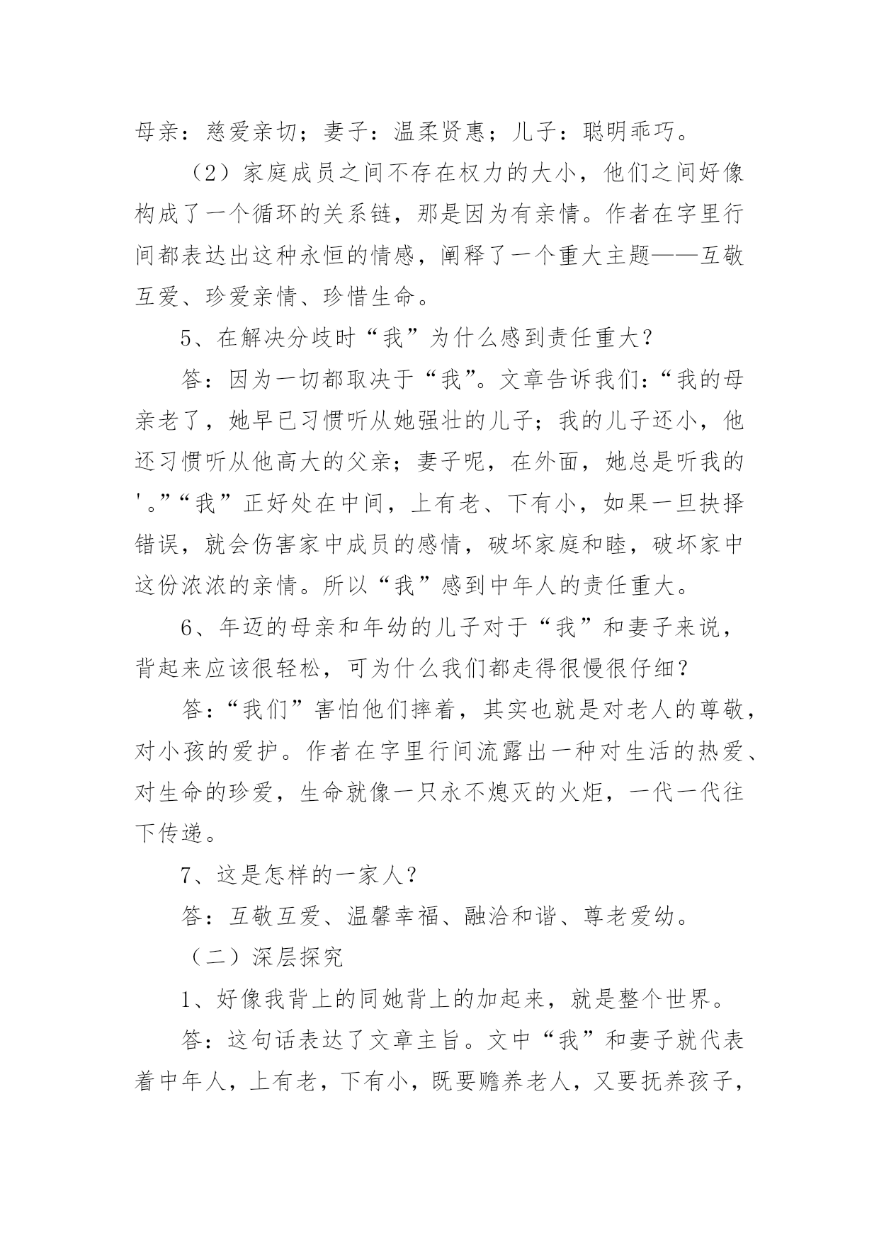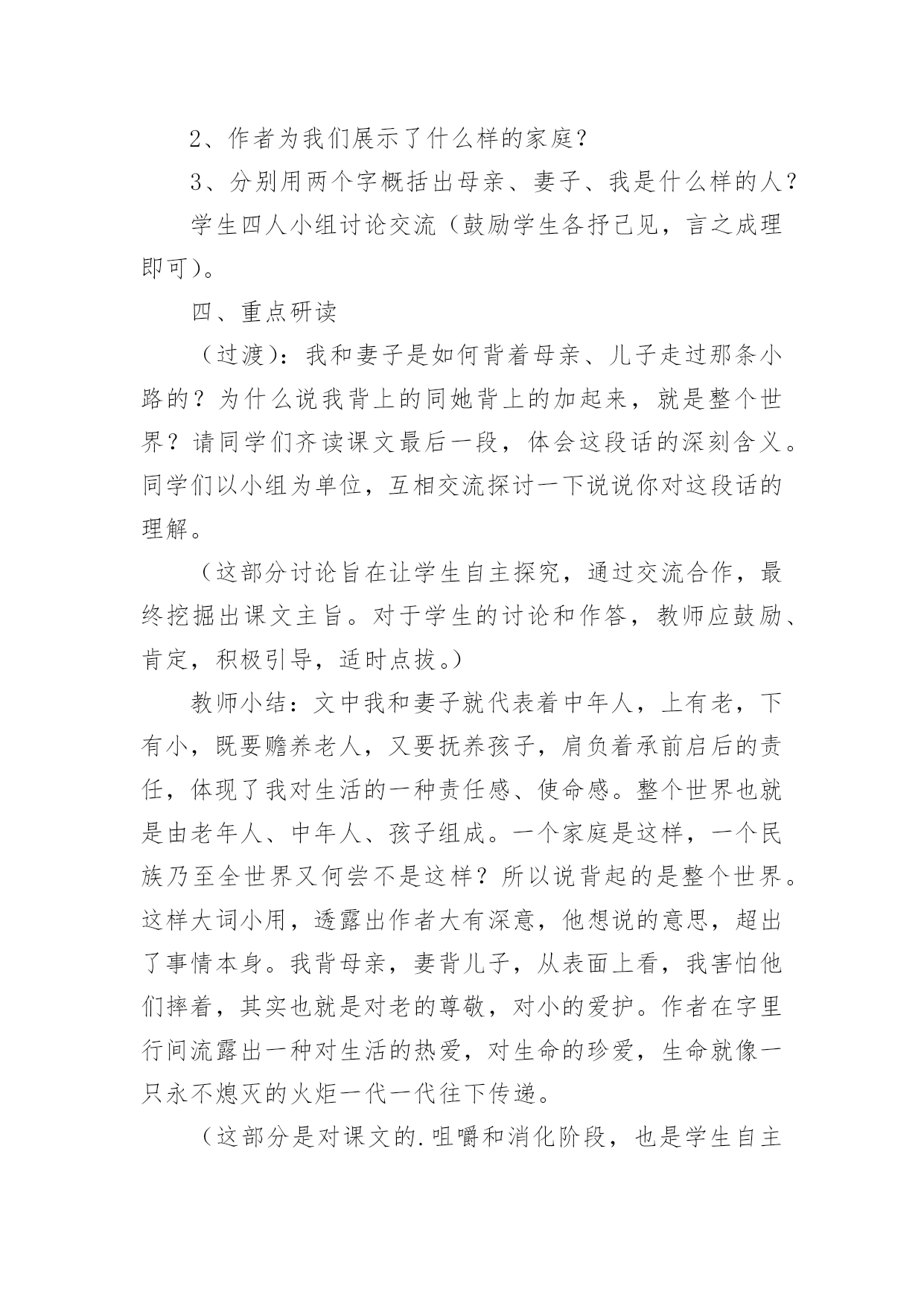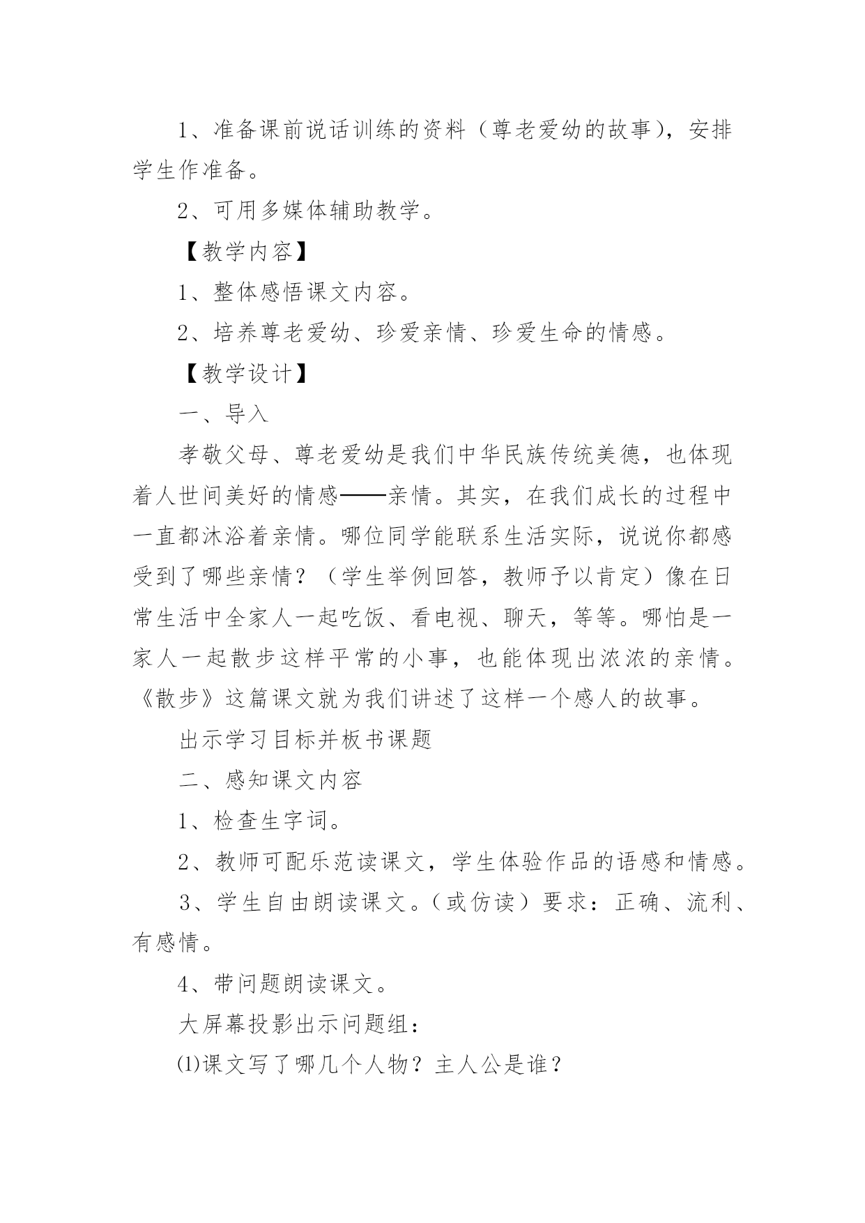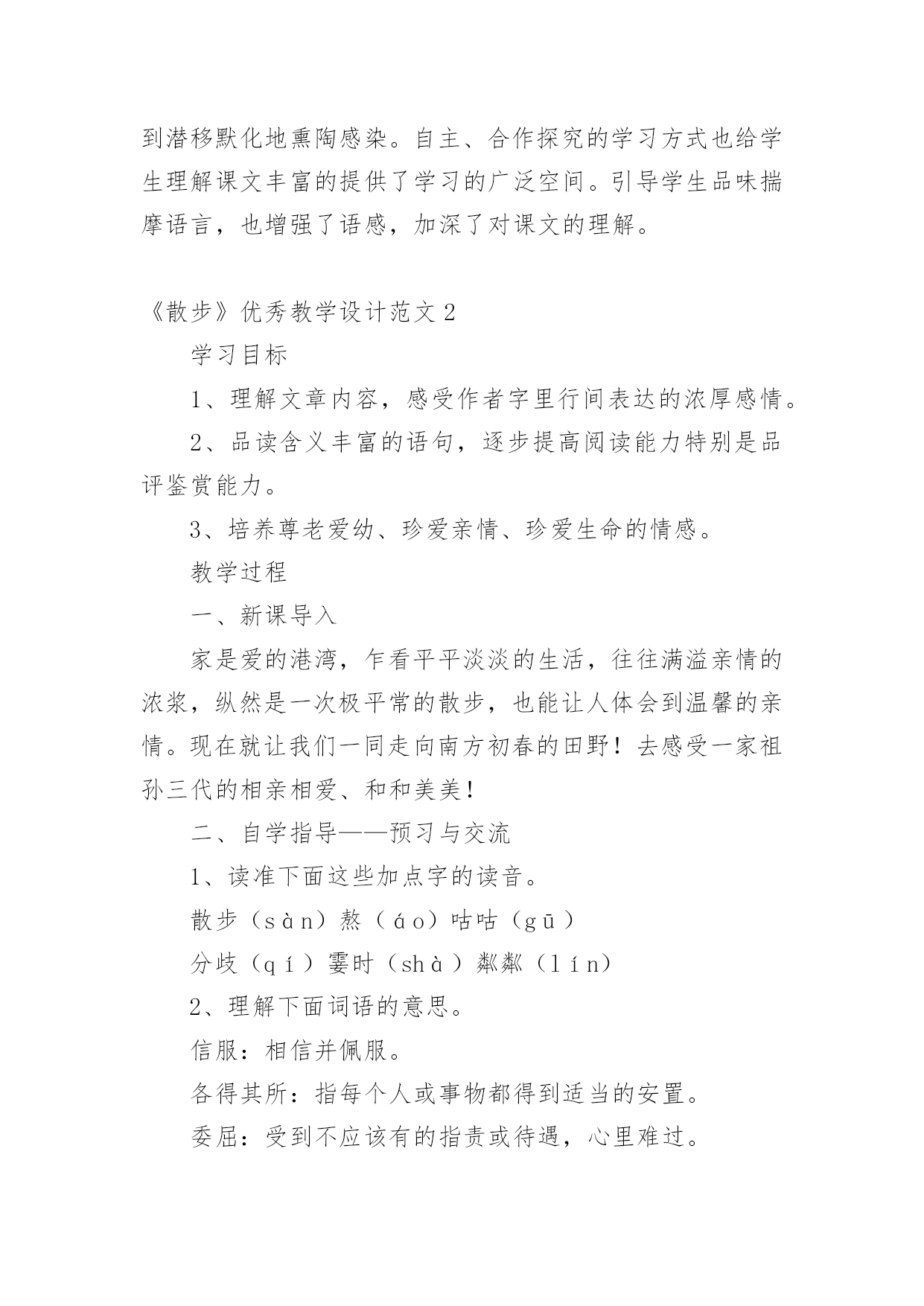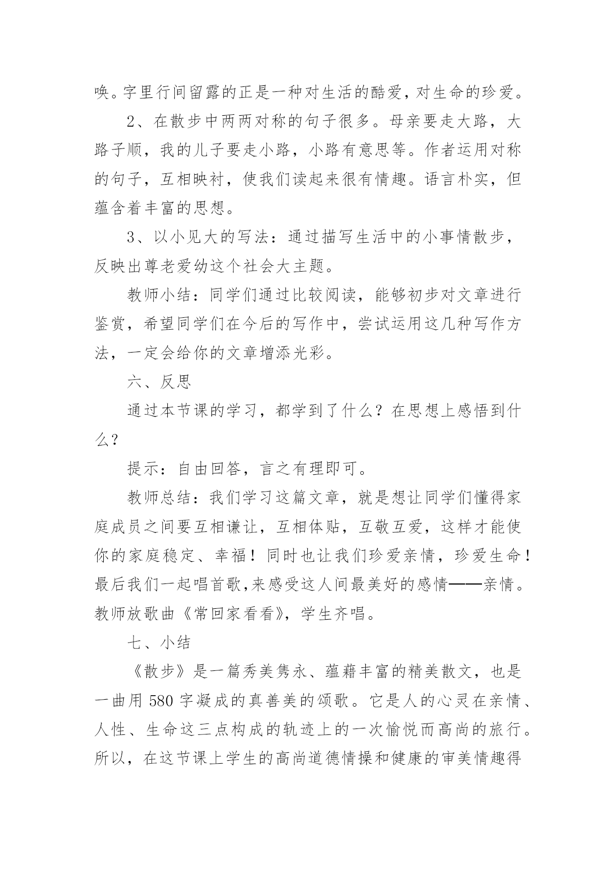 《散步》优秀教学设计《散步》优秀教学设计范文作为一位杰出的老师,时常需要准备好教学设计,教学设计是教育技术的组成部分,它的功能在于运用系统方法设计教学过程,使之成为一种具有操作性的程序。如何把教学设计做到重点突出呢?下面是小编为大家收集的《散步》优秀教学设计范文,供大家参考借鉴,希望可以帮助到有需要的朋友。《散步》优秀教学设计范文1【教学目标】1、知识和技能:整体感悟课文内容,通过比较阅读提高审美情趣。2、过程和方法:学习自主、合作、探究的学习方式。3、情感态度价值观:培养尊老爱幼、珍爱亲情、珍爱生命的情感。【教学重点】整体感知课文内容,品味揣摩语句。【课前准备】学生:强调课文预习,自读课文,圈点生字词。勾画出文中不理解的句子,提出疑难问题。教师:1、准备课前说话训练的资料(尊老爱幼的故事),安排学生作准备。2、可用多媒体辅助教学。【教学内容】1、整体感悟课文内容。2、培养尊老爱幼、珍爱亲情、珍爱生命的情感。【教学设计】一、导入孝敬父母、尊老爱幼是我们中华民族传统美德,也体现着人世间美好的情感──亲情。其实,在我们成长的过程中一直都沐浴着亲情。哪位同学能联系生活实际,说说你都感受到了哪些亲情?(学生举例回答,教师予以肯定)像在日常生活中全家人一起吃饭、看电视、聊天,等等。哪怕是一家人一起散步这样平常的小事,也能体现出浓浓的亲情。《散步》这篇课文就为我们讲述了这样一个感人的故事。出示学习目标并板书课题二、感知课文内容1、检查生字词。2、教师可配乐范读课文,学生体验作品的语感和情感。3、学生自由朗读课文。(或仿读)要求:正确、流利、有感情。4、带问题朗读课文。大屏幕投影出示问题组:⑴课文写了哪几个人物?主人公是谁?⑵在散步过程中发生了什么事?请你用自己的语言概括。(用文中的语言也可以)教师导学:读是学生接触课文的开始,也是学生自主与文章进行情感交流最直接的方式。所以,在这一部分教师要给予学生充分的时间,让学生深入到文章中去,理解、品味而不要流于形式。教师小结:文中描绘的就是一家四口外出的事,而四口人又是以我为纽带组建起来的。散步过程中所发生的事,只要意思对即可,给予肯定。用文中一个词来概括分歧。三、自主合作探究教师引导:精读课文,想一想在散步过程中分歧是怎样解决的?同学们以小组为单位进行分析,若遇到有深度或理解不透的地方大胆提出来,共同探讨学习。提示质疑:1、母亲为什么偏偏要走大路?2、我为什么感到责任的重大?教师小结:大路平顺,便于老人行走,况且母亲身体不好。文中第2段交代了母亲的身体情况,为下文进行埋下伏笔。我为什么感到责任重大?学生根据课文可能回答,因为一切都取决于我。本段中告诉了我们:我的母亲老了,她早巳习惯听从她强壮的儿子,我的儿子还小,他还习惯听从他高大的父亲,妻子呢,在外面,总是听我的。引导学生认识到在这个家庭中,我正好处在中间,上有老下有小,如果一旦抉择错误就会伤害家中成员的感情,破坏家庭的和睦,破坏家中这份浓浓的亲情。(这个祖孙三代人家中包含着祖孙情、母子情、夫妻情、父子情)正是由于这四种亲情纠缠在一起,而他们又取决于我,所以我感到了作为中年人责任的重大。教师引导:展开想像,体验感受一下,假如你是文中的我,毫不犹豫地依从了儿子走小路,那么,母亲会怎样想?学生四人小组交流,在班里谈感受。(过渡)看似不起眼的小事,如果处理不得当,就会产生家庭矛盾。通过这件事情,你悟出了什么道理?学生讨论交流,教师适时点拨。教师小结:不管做什么事情应先考虑老人的感受,先照顾他们。他们辛苦了一辈子,不容易。之中的我决定顺从母亲而委屈孩子,原则是一个孝字。当上有老,下有小,两头无法兼顾时,应该顾老的一头。这正是中华民族传统美德的体现。(过渡)设想一下:晚饭后,全家人在一起看电视,爷爷奶奶喜欢看戏曲节目,爸爸妈妈喜欢看时事报道,你喜欢看动画片,而遥控器在你的手中,你该怎么办?学生讨论归纳:教师对于学生的回答要给予肯定和完善,并希望在以后的人生道路上继续遵循这个道德准则。(过渡)文中的我做得很好,尊敬母亲走大路,母亲同时也为儿子解决了这个难题,改变主意,走小路。你从中感受到什么?1、我们可以感受到母亲对小孙子的什么感情?2、作者为我们展示了什么样的家庭?3、分别用两个字概括出母亲、妻子、我是什么样的人?学生四人小组讨论交流(鼓励学生各抒己见,言之成理即可)。四、重点研读(过渡):我和妻子是如何背着母亲、儿子走过那条小路的?为什么说我背上的同她背上的加起来,就是整个世界?请同学们齐读课文最后一段,体会这段话的深刻含义。同学们以小组为单位,互相交流探讨一下说说你对这段话的理解。(这部分讨论旨在让学生自主探究,通过交流合作,最终挖掘出课文主旨。对于学生的讨论和作答,教师应鼓励、肯定,积极引导,适时点拔。)教师小结:文中我和妻子就代表着中年人,上
