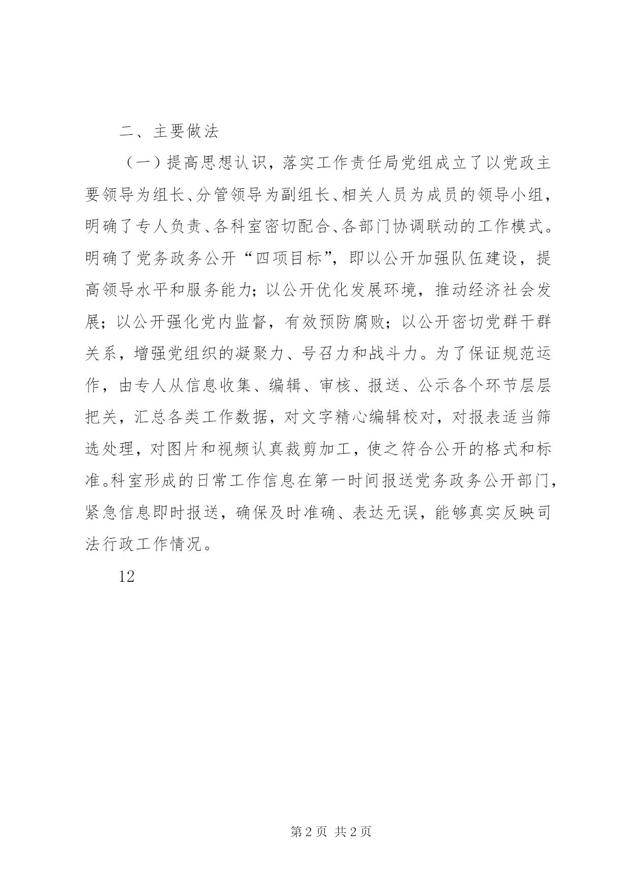 第PAGE\*Arabic\*MERGEFORMAT2页共NUMPAGES\*MERGEFORMAT2页司法局党务政务公开工作总结今年,区司法局按照“透明、准确、即时”的工作思路,坚持党务公开与政务公开工作同安排、同要求、同落实,实现了党务政务公开的规范化、制度化和信息化,突出了司法行政作风效能建设和解决群众实际问题等工作热点,对完善工作机制、提高行政透明度、促进监督管理以及推动部门信息化建设发挥了重要作用。现将一年以来的党务政务公开情况汇报如下。一、基本情况今年的党务政务公开工作取得了新的成效。一是密切了局党组和干部职工的联系,增强了党组织凝聚力、战斗力;二是党员干部廉洁自律意识不断增强,干部队伍的整体素质进一步提高;三是基本实现了所有能公开的信息全部上网公开,公开的力度、广度和实效性有了显著提高。1月至11月,我局通过会议公开24项,通过文件公开25项,更新公示栏48项内容,更新党务政务公开网75项信息。通过白云普法网和xx区政府门户网站(司法局版块)发布了160条信息,其中,更新“依法治理”15项、“普法教育”17项、“人民调解”18项、“法律服务”18项、“法律援助”17项、“司法行政”18项、“工作动态”47项、“部门文件”23项内容。每周坚持收集科室、司法所简报信息,向市局报送了65条工作信息用于充实贵阳司法行政网,及时反映白云司法行政工作动态。二、主要做法(一)提高思想认识,落实工作责任局党组成立了以党政主要领导为组长、分管领导为副组长、相关人员为成员的领导小组,明确了专人负责、各科室密切配合、各部门协调联动的工作模式。明确了党务政务公开“四项目标”,即以公开加强队伍建设,提高领导水平和服务能力;以公开优化发展环境,推动经济社会发展;以公开强化党内监督,有效预防腐败;以公开密切党群干群关系,增强党组织的凝聚力、号召力和战斗力。为了保证规范运作,由专人从信息收集、编辑、审核、报送、公示各个环节层层把关,汇总各类工作数据,对文字精心编辑校对,对报表适当筛选处理,对图片和视频认真裁剪加工,使之符合公开的格式和标准。科室形成的日常工作信息在第一时间报送党务政务公开部门,紧急信息即时报送,确保及时准确、表达无误,能够真实反映司法行政工作情况。12