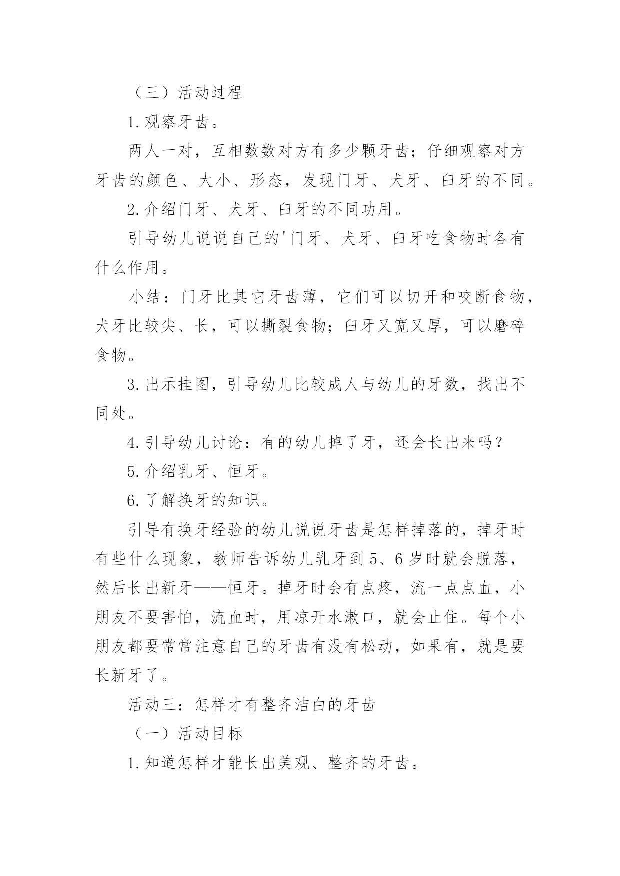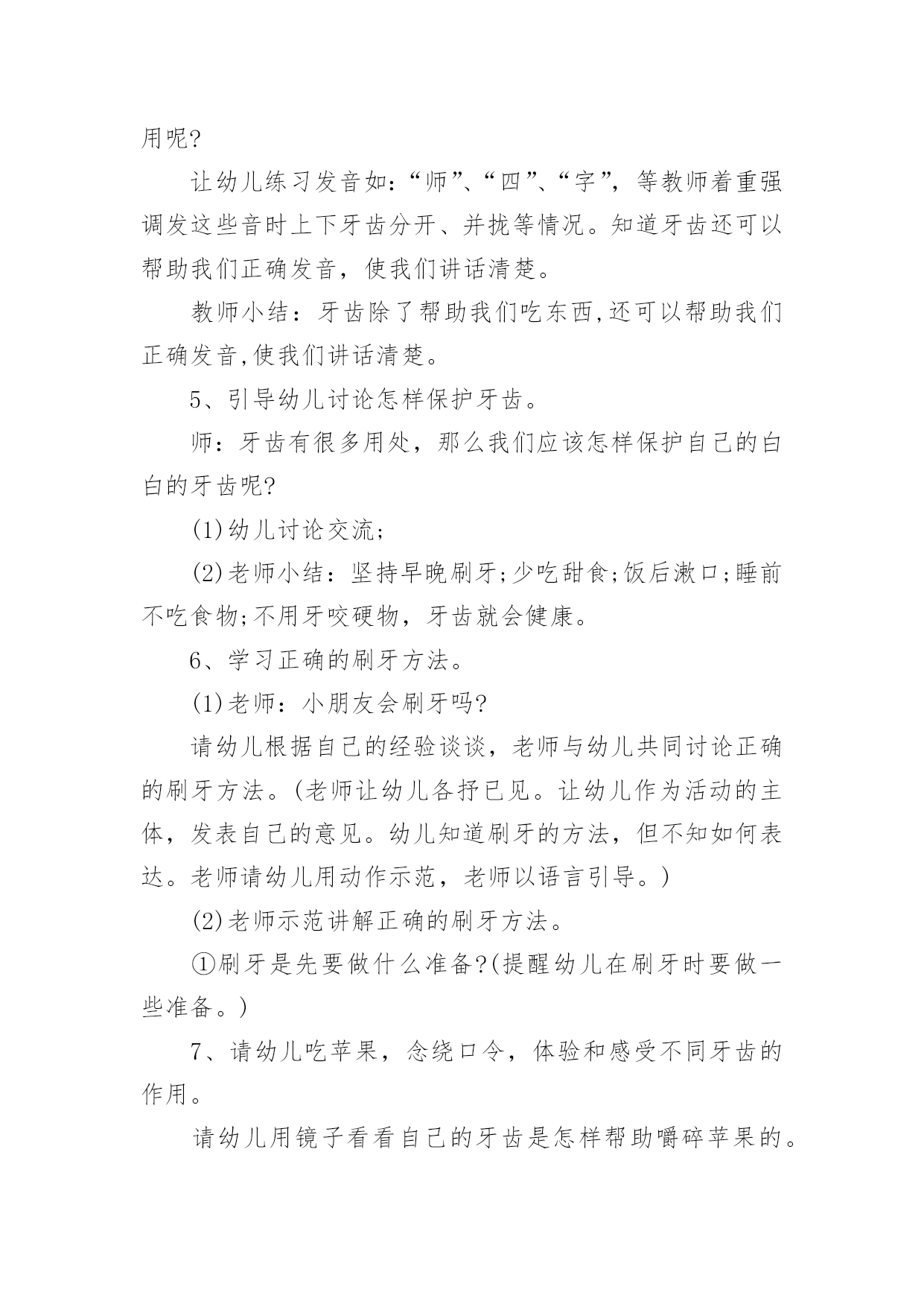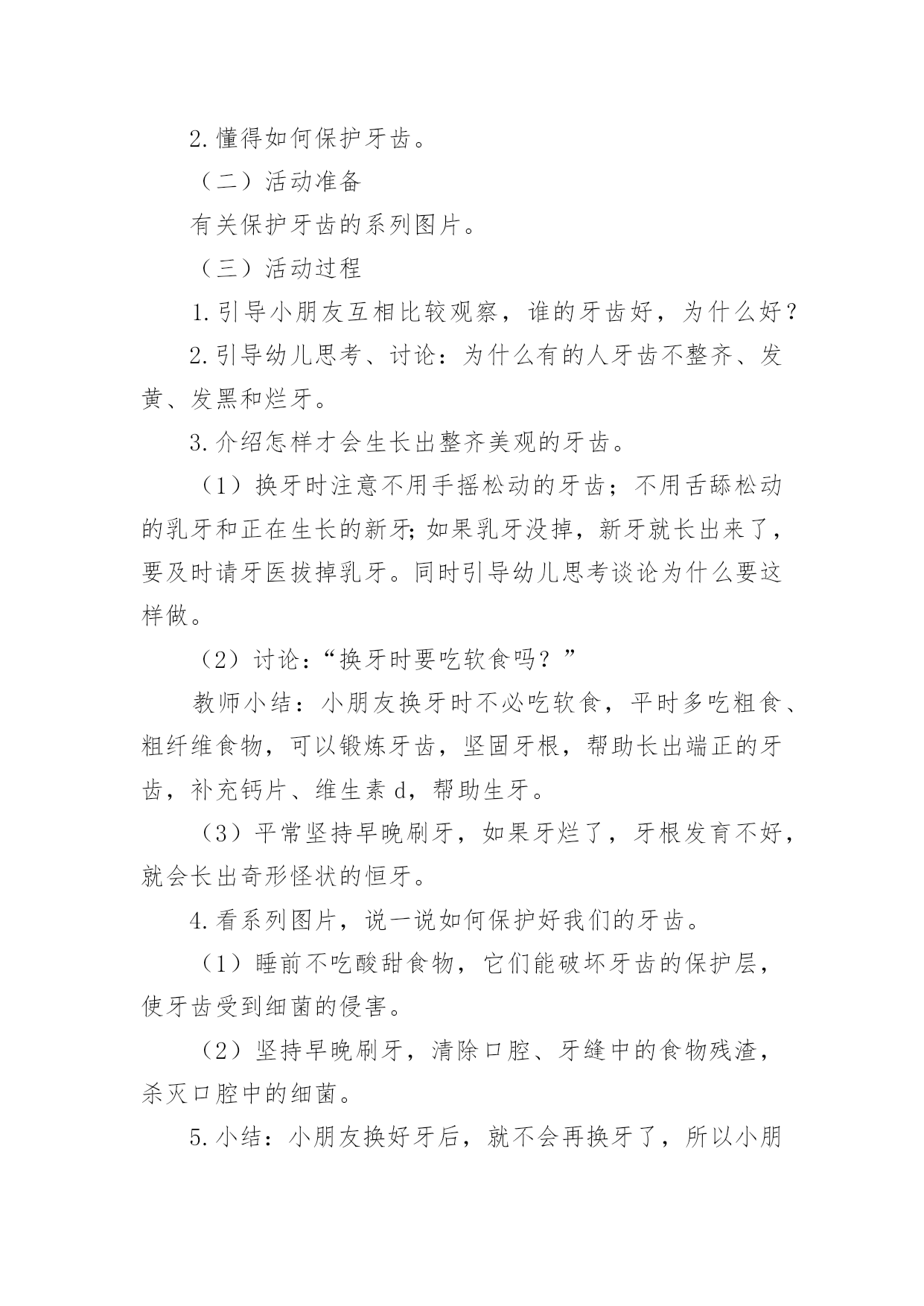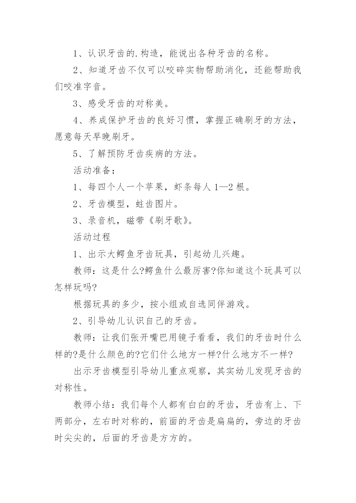 健康牙齿大班教案作为一名老师,往往需要进行教案编写工作,编写教案有利于我们科学、合理地支配课堂时间。教案要怎么写呢?下面是小编精心整理的健康牙齿大班教案,欢迎阅读,希望大家能够喜欢。健康牙齿大班教案1设计意图幼儿的健康成长是家长和老师共同关注的话题,让幼儿从小懂得有健康的心理和强壮的身体才是一个健康的宝宝,并能了解一些疾病的预防知识,会进行自我保护。现在的孩子甜食吃得太多,牙齿早早的就坏掉了,于是我设计了《白白的牙齿》活动,希望通过这次活动,让幼儿认识牙齿保护牙齿的健康。帮助幼儿了解牙齿的作用,从而掌握正确的刷牙方法,养成保护牙齿的良好习惯,并能坚持早晚刷牙。睡前不吃东西的好习惯,学会保护自己的牙齿。问题提出让我们张开嘴巴用镜子看看,我们的牙齿时什么样的?是什么颜色的?它们什么地方一样?什么地方不一样?前面扁扁的牙齿叫什么?切牙像什么?它有什么作用?旁边尖尖的牙齿叫什么?尖牙可以帮助我们干什么?后面方方的牙齿叫什么?磨牙可以帮助我们干什么?活动目标:1、认识牙齿的.构造,能说出各种牙齿的名称。2、知道牙齿不仅可以咬碎实物帮助消化,还能帮助我们咬准字音。3、感受牙齿的对称美。4、养成保护牙齿的良好习惯,掌握正确刷牙的方法,愿意每天早晚刷牙。5、了解预防牙齿疾病的方法。活动准备:1、每四个人一个苹果,虾条每人1—2根。2、牙齿模型,蛀齿图片。3、录音机,磁带《刷牙歌》。活动过程1、出示大鳄鱼牙齿玩具,引起幼儿兴趣。教师:这是什么?鳄鱼什么最厉害?你知道这个玩具可以怎样玩吗?根据玩具的多少,按小组或自选同伴游戏。2、引导幼儿认识自己的牙齿。教师:让我们张开嘴巴用镜子看看,我们的牙齿时什么样的?是什么颜色的?它们什么地方一样?什么地方不一样?出示牙齿模型引导幼儿重点观察,其实幼儿发现牙齿的对称性。教师小结:我们每个人都有白白的牙齿,牙齿有上、下两部分,左右时对称的,前面的牙齿是扁扁的,旁边的牙齿时尖尖的,后面的牙齿是方方的。3、出示教学挂图:《白白的牙齿》,引导幼儿了解牙齿的名称和功能。教师:前面扁扁的牙齿叫什么?切牙像什么?它有什么作用?教师:旁边尖尖的牙齿叫什么?尖牙可以帮助我们干什么?教师:后面方方的牙齿叫什么?磨牙可以帮助我们干什么?教师小结:扁扁的牙齿叫切牙,它像刀一样可以切碎食物;尖尖的牙齿叫尖牙,可以撕碎食物;方方的牙齿叫磨牙,力量最大,(.教案来自:幼儿园学习网教.案网)可以压碎食物。它们各有各的作用,共同帮我们把食物咬碎、嚼碎。4、使幼儿懂得保护牙齿的重要性。(1)让幼儿吃苹果,初步认识牙齿的用处,体验不同牙齿的作用。①今天请小朋友吃点苹果,请你们慢慢地吃,边吃边动脑筋想想看,你是怎么把苹果吃下去的?(引导幼儿大胆说出自己的体验,知道是用牙齿帮助咬断嚼碎苹果,吃下去的。)②让幼儿尝尝虾条,再次体验一下不同牙齿的作用。教师小结:饭后漱口,早晚刷牙,睡觉前不吃糖和其它食物,不吃过硬的东西等,牙齿才不会发黄,不发黑,不生病。让我们的牙齿一直都是白白的,天天为我们服务。(2)讨论:牙齿除了可以帮助我们吃食物,它还有什么用呢?让幼儿练习发音如:“师”、“四”、“字”,等教师着重强调发这些音时上下牙齿分开、并拢等情况。知道牙齿还可以帮助我们正确发音,使我们讲话清楚。教师小结:牙齿除了帮助我们吃东西,还可以帮助我们正确发音,使我们讲话清楚。5、引导幼儿讨论怎样保护牙齿。师:牙齿有很多用处,那么我们应该怎样保护自己的白白的牙齿呢?(1)幼儿讨论交流;(2)老师小结:坚持早晚刷牙;少吃甜食;饭后漱口;睡前不吃食物;不用牙咬硬物,牙齿就会健康。6、学习正确的刷牙方法。(1)老师:小朋友会刷牙吗?请幼儿根据自己的经验谈谈,老师与幼儿共同讨论正确的刷牙方法。(老师让幼儿各抒已见。让幼儿作为活动的主体,发表自己的意见。幼儿知道刷牙的方法,但不知如何表达。老师请幼儿用动作示范,老师以语言引导。)(2)老师示范讲解正确的刷牙方法。①刷牙是先要做什么准备?(提醒幼儿在刷牙时要做一些准备。)7、请幼儿吃苹果,念绕口令,体验和感受不同牙齿的作用。请幼儿用镜子看看自己的牙齿是怎样帮助嚼碎苹果的。请幼儿互相看看牙齿是怎样帮助嚼碎苹果的。讨论:牙齿出了帮助我们嚼食物,它还有什么作用?带领小朋友年绕口令《四和十》,引导幼儿感受牙齿分开、合拢时发音的变化。教师小结:牙齿可以帮助我们咬碎食物,帮助消化,还可以帮助我们要准字音,使我们说话清楚,它的用处真大。8、念儿歌,学刷牙。边念儿歌边做动作。9、师生讨论并小结:牙齿有很多用处,那么我们应该怎样保护自己的白白的牙齿呢?饭后漱口、早晚刷牙、睡前不吃糖和其他东西、不吃过硬的东西等等,牙齿才能不发黄,不发黑,让我们的牙齿一直是白白的,天天为我们服务。活动结束:1、结合进餐活动,让幼儿谈谈怎样用牙齿吃牛肉,芹菜等难嚼的