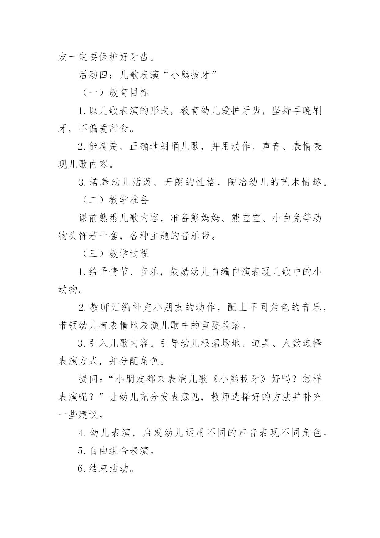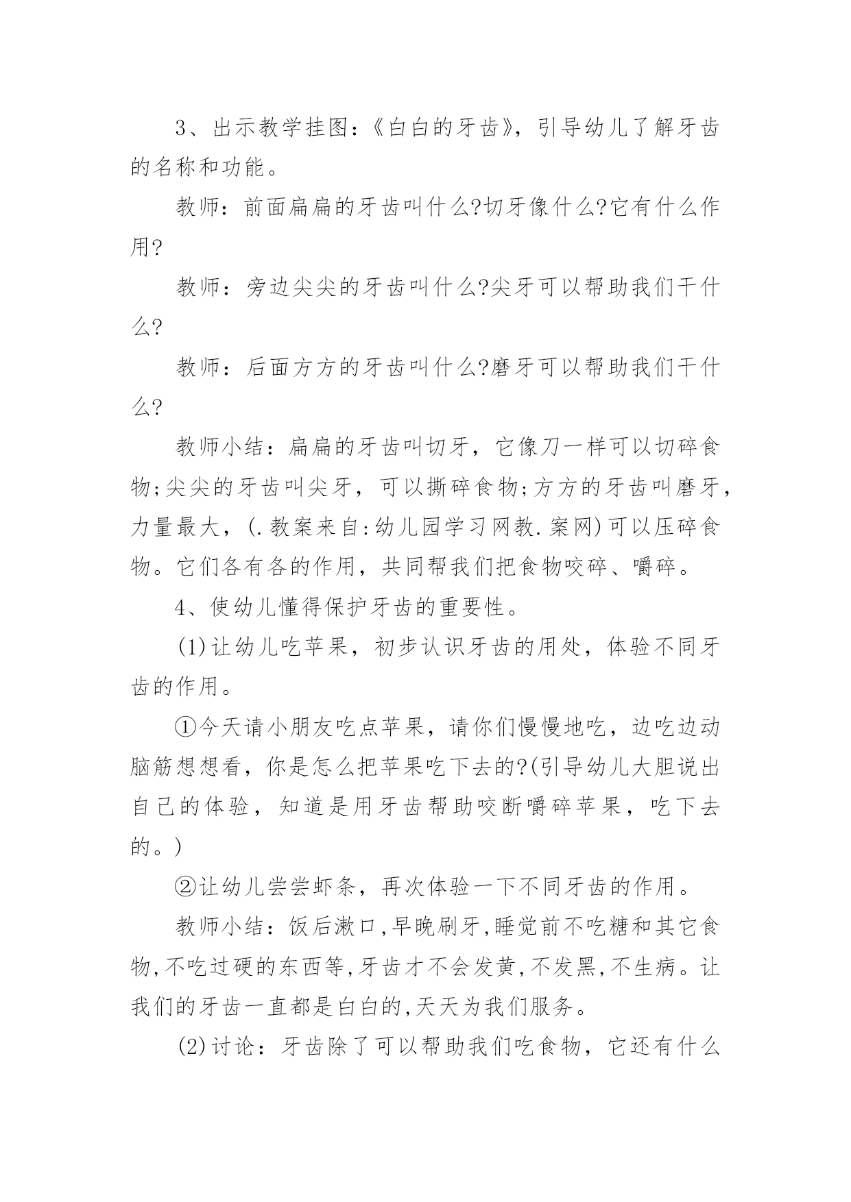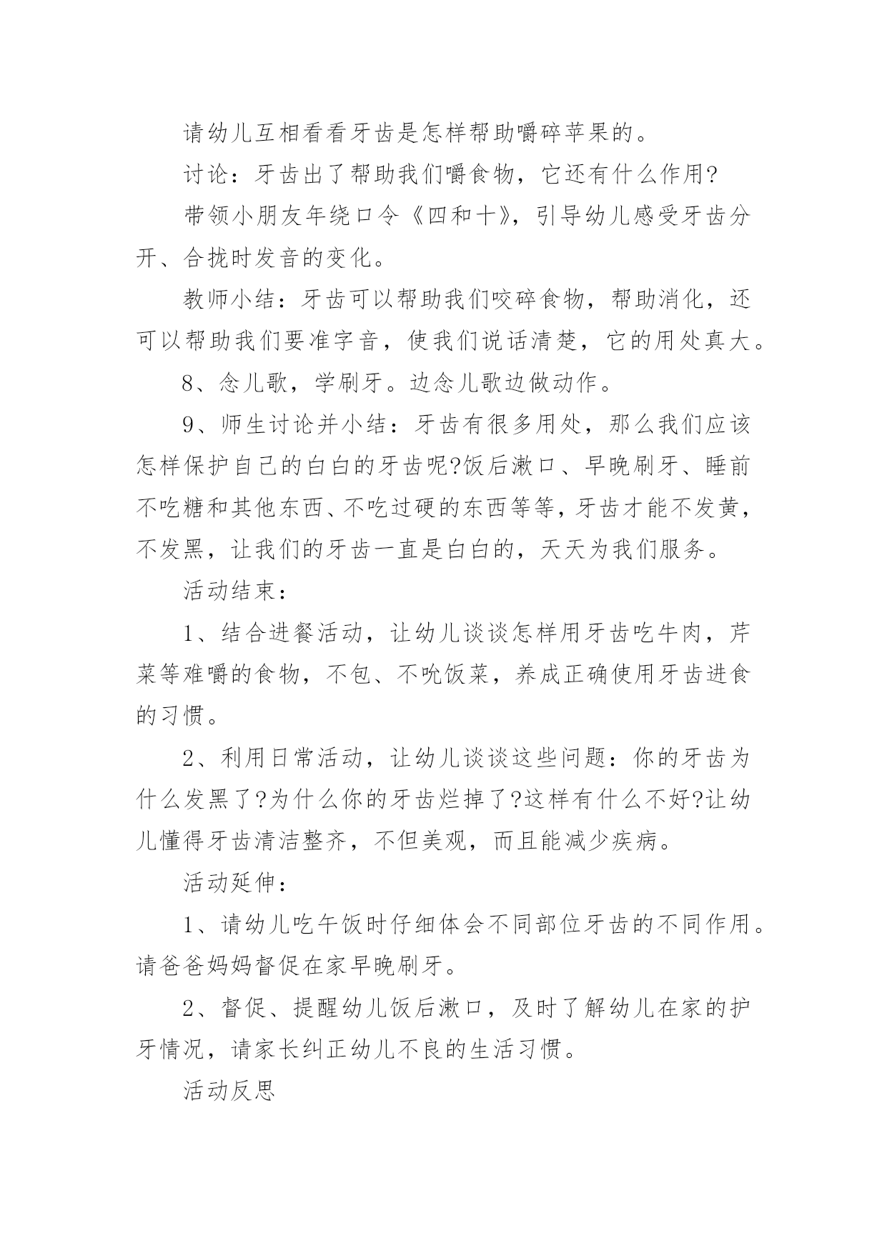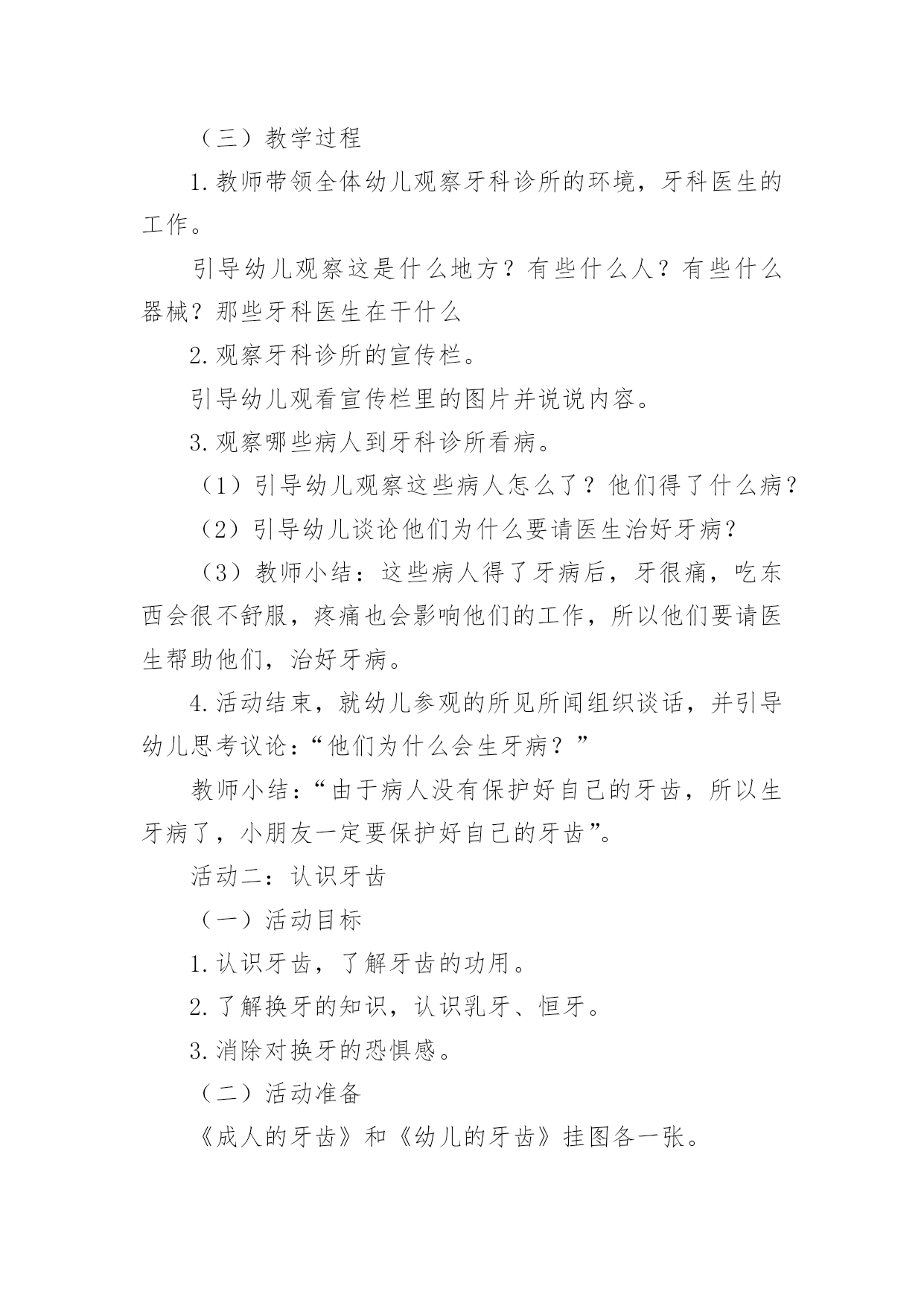 健康牙齿大班教案作为一名老师,往往需要进行教案编写工作,编写教案有利于我们科学、合理地支配课堂时间。教案要怎么写呢?下面是小编精心整理的健康牙齿大班教案,欢迎阅读,希望大家能够喜欢。健康牙齿大班教案1设计意图幼儿的健康成长是家长和老师共同关注的话题,让幼儿从小懂得有健康的心理和强壮的身体才是一个健康的宝宝,并能了解一些疾病的预防知识,会进行自我保护。现在的孩子甜食吃得太多,牙齿早早的就坏掉了,于是我设计了《白白的牙齿》活动,希望通过这次活动,让幼儿认识牙齿保护牙齿的健康。帮助幼儿了解牙齿的作用,从而掌握正确的刷牙方法,养成保护牙齿的良好习惯,并能坚持早晚刷牙。睡前不吃东西的好习惯,学会保护自己的牙齿。问题提出让我们张开嘴巴用镜子看看,我们的牙齿时什么样的?是什么颜色的?它们什么地方一样?什么地方不一样?前面扁扁的牙齿叫什么?切牙像什么?它有什么作用?旁边尖尖的牙齿叫什么?尖牙可以帮助我们干什么?后面方方的牙齿叫什么?磨牙可以帮助我们干什么?活动目标:1、认识牙齿的.构造,能说出各种牙齿的名称。2、知道牙齿不仅可以咬碎实物帮助消化,还能帮助我们咬准字音。3、感受牙齿的对称美。4、养成保护牙齿的良好习惯,掌握正确刷牙的方法,愿意每天早晚刷牙。5、了解预防牙齿疾病的方法。活动准备:1、每四个人一个苹果,虾条每人1—2根。2、牙齿模型,蛀齿图片。3、录音机,磁带《刷牙歌》。活动过程1、出示大鳄鱼牙齿玩具,引起幼儿兴趣。教师:这是什么?鳄鱼什么最厉害?你知道这个玩具可以怎样玩吗?根据玩具的多少,按小组或自选同伴游戏。2、引导幼儿认识自己的牙齿。教师:让我们张开嘴巴用镜子看看,我们的牙齿时什么样的?是什么颜色的?它们什么地方一样?什么地方不一样?出示牙齿模型引导幼儿重点观察,其实幼儿发现牙齿的对称性。教师小结:我们每个人都有白白的牙齿,牙齿有上、下两部分,左右时对称的,前面的牙齿是扁扁的,旁边的牙齿时尖尖的,后面的牙齿是方方的。3、出示教学挂图:《白白的牙齿》,引导幼儿了解牙齿的名称和功能。教师:前面扁扁的牙齿叫什么?切牙像什么?它有什么作用?教师:旁边尖尖的牙齿叫什么?尖牙可以帮助我们干什么?教师:后面方方的牙齿叫什么?磨牙可以帮助我们干什么?教师小结:扁扁的牙齿叫切牙,它像刀一样可以切碎食物;尖尖的牙齿叫尖牙,可以撕碎食物;方方的牙齿叫磨牙,力量最大,(.教案来自:幼儿园学习网教.案网)可以压碎食物。它们各有各的作用,共同帮我们把食物咬碎、嚼碎。4、使幼儿懂得保护牙齿的重要性。(1)让幼儿吃苹果,初步认识牙齿的用处,体验不同牙齿的作用。①今天请小朋友吃点苹果,请你们慢慢地吃,边吃边动脑筋想想看,你是怎么把苹果吃下去的?(引导幼儿大胆说出自己的体验,知道是用牙齿帮助咬断嚼碎苹果,吃下去的。)②让幼儿尝尝虾条,再次体验一下不同牙齿的作用。教师小结:饭后漱口,早晚刷牙,睡觉前不吃糖和其它食物,不吃过硬的东西等,牙齿才不会发黄,不发黑,不生病。让我们的牙齿一直都是白白的,天天为我们服务。(2)讨论:牙齿除了可以帮助我们吃食物,它还有什么用呢?让幼儿练习发音如:“师”、“四”、“字”,等教师着重强调发这些音时上下牙齿分开、并拢等情况。知道牙齿还可以帮助我们正确发音,使我们讲话清楚。教师小结:牙齿除了帮助我们吃东西,还可以帮助我们正确发音,使我们讲话清楚。5、引导幼儿讨论怎样保护牙齿。师:牙齿有很多用处,那么我们应该怎样保护自己的白白的牙齿呢?(1)幼儿讨论交流;(2)老师小结:坚持早晚刷牙;少吃甜食;饭后漱口;睡前不吃食物;不用牙咬硬物,牙齿就会健康。6、学习正确的刷牙方法。(1)老师:小朋友会刷牙吗?请幼儿根据自己的经验谈谈,老师与幼儿共同讨论正确的刷牙方法。(老师让幼儿各抒已见。让幼儿作为活动的主体,发表自己的意见。幼儿知道刷牙的方法,但不知如何表达。老师请幼儿用动作示范,老师以语言引导。)(2)老师示范讲解正确的刷牙方法。①刷牙是先要做什么准备?(提醒幼儿在刷牙时要做一些准备。)7、请幼儿吃苹果,念绕口令,体验和感受不同牙齿的作用。请幼儿用镜子看看自己的牙齿是怎样帮助嚼碎苹果的。请幼儿互相看看牙齿是怎样帮助嚼碎苹果的。讨论:牙齿出了帮助我们嚼食物,它还有什么作用?带领小朋友年绕口令《四和十》,引导幼儿感受牙齿分开、合拢时发音的变化。教师小结:牙齿可以帮助我们咬碎食物,帮助消化,还可以帮助我们要准字音,使我们说话清楚,它的用处真大。8、念儿歌,学刷牙。边念儿歌边做动作。9、师生讨论并小结:牙齿有很多用处,那么我们应该怎样保护自己的白白的牙齿呢?饭后漱口、早晚刷牙、睡前不吃糖和其他东西、不吃过硬的东西等等,牙齿才能不发黄,不发黑,让我们的牙齿一直是白白的,天天为我们服务。活动结束:1、结合进餐活动,让幼儿谈谈怎样用牙齿吃牛肉,芹菜等难嚼的