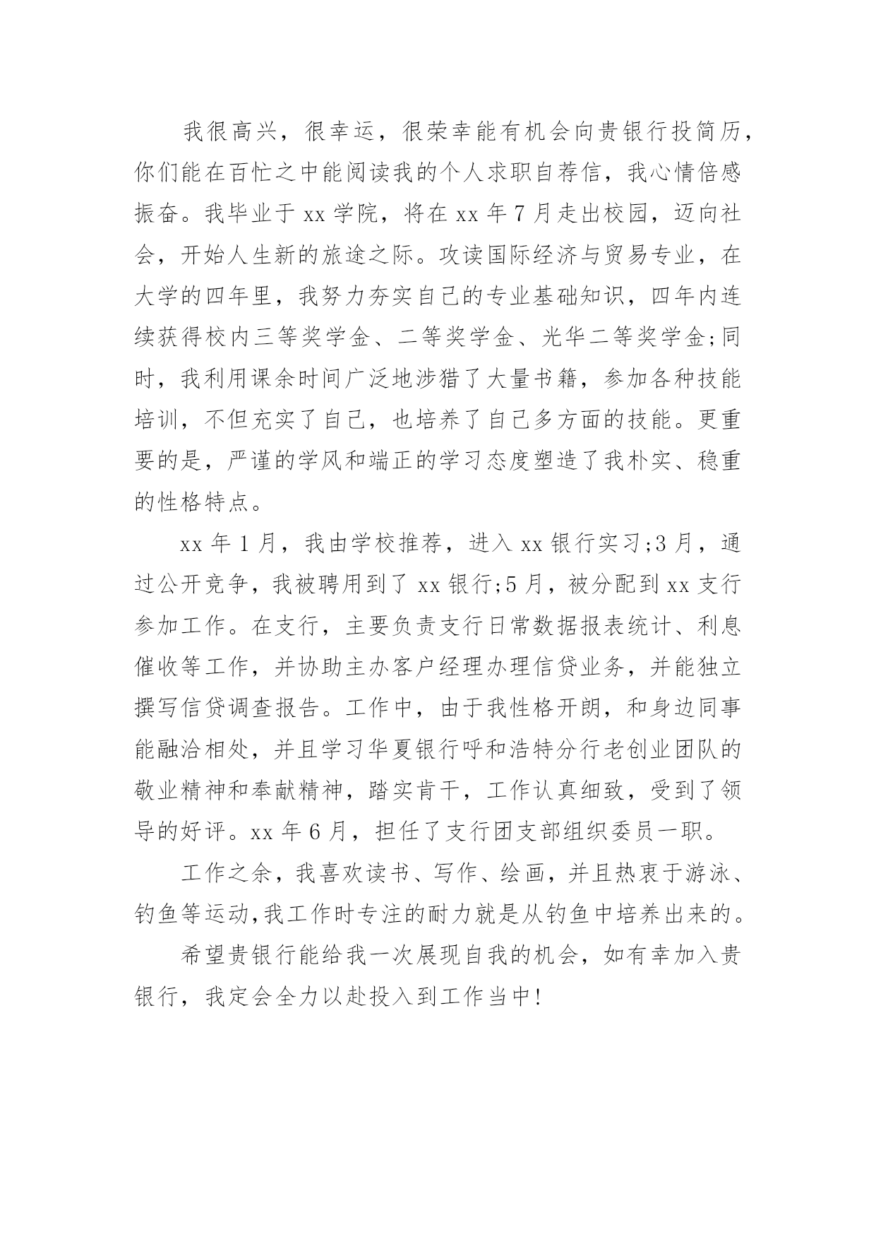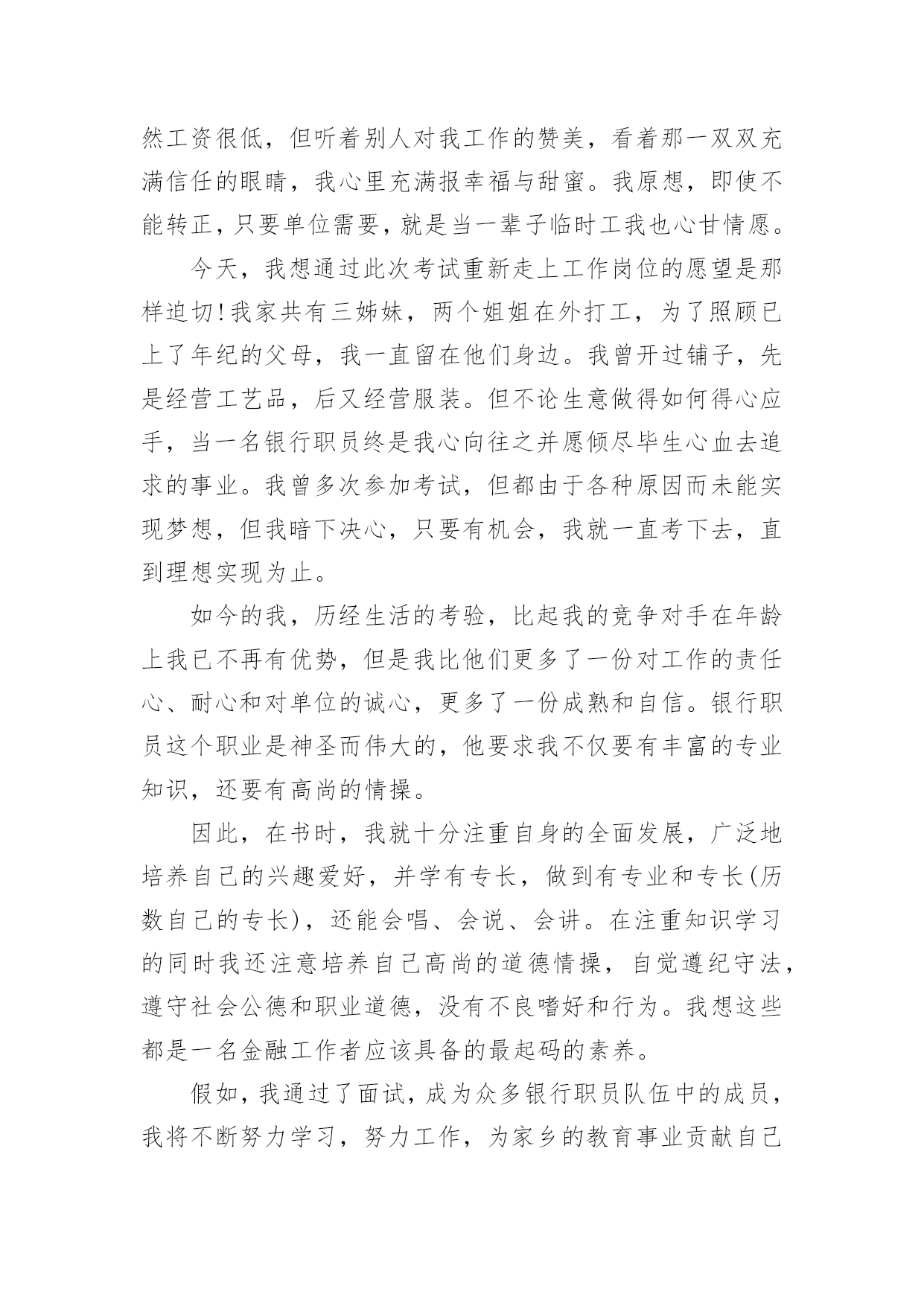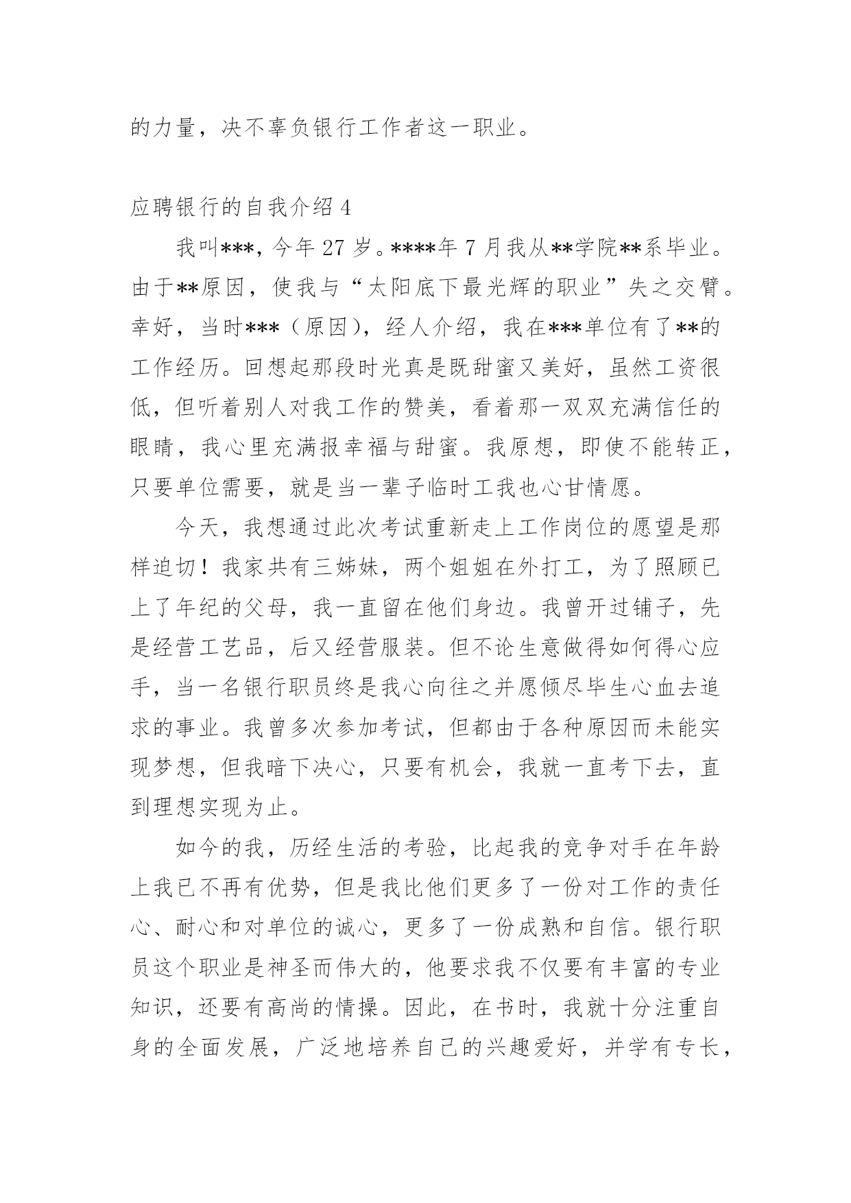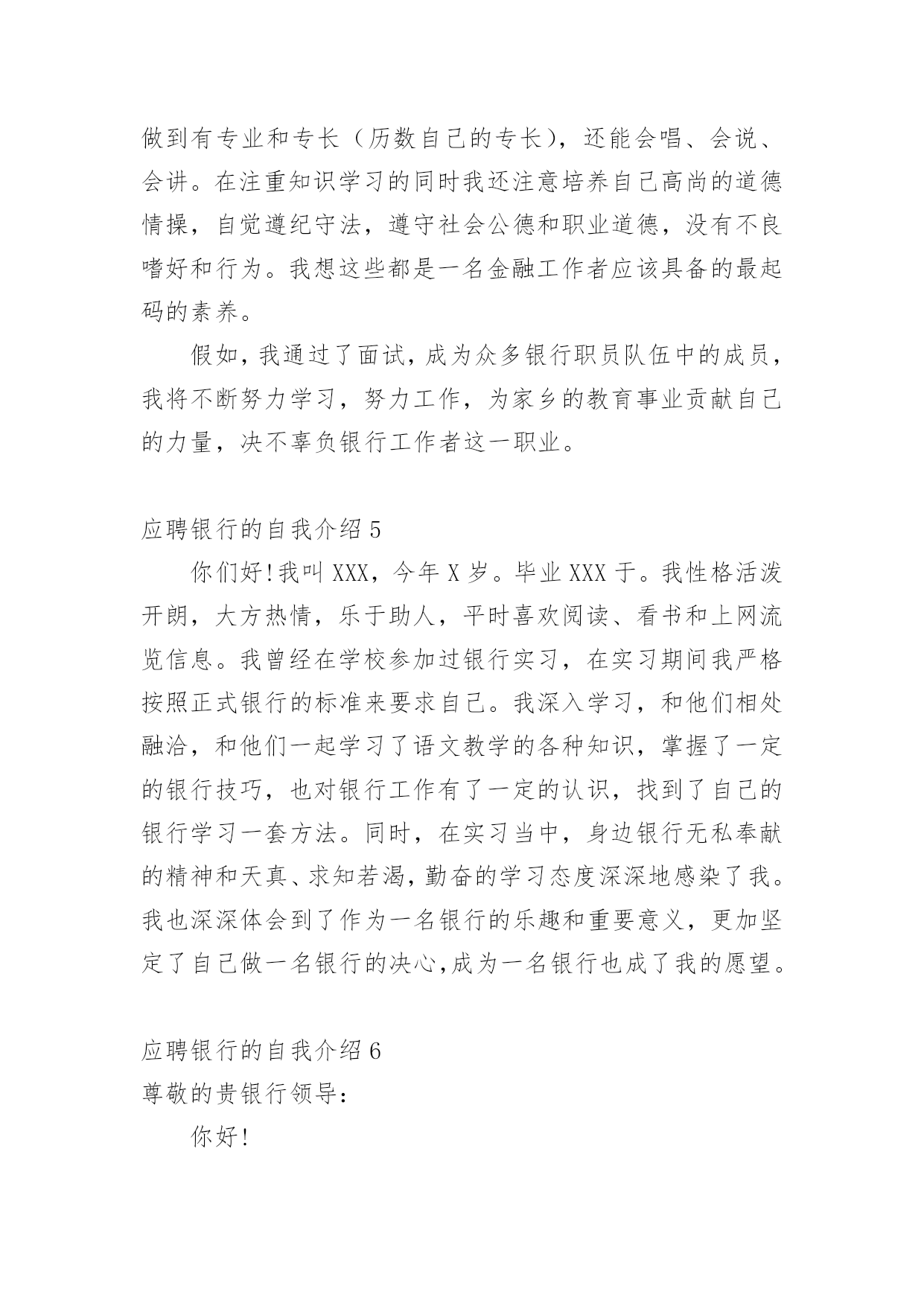 应聘银行的自我介绍应聘银行的自我介绍1尊敬的贵银行领导:今天能够在这里参加银行的面试,有机会向老师们请教和学习,我感到非常荣幸,同时通过这次面试也可以把我自己展现给大家。我是这次面试的第*号考生,***,蒙族。XX年7月,我毕业于***大学****学院****专业,在大学的四年里,我学习了经济学,管理学、金融学和法律的基础知识。大学期间表现优秀,曾获得院级优秀假期社会实践论文。XX年寒假,我曾在福利院和养老院进行假期社会实践,帮助残疾儿童补习功课,照顾孤寡老人的一些生活起居。在这个期间,我提高了与人沟通的能力,同时培养了良好的服务的意识。我性格开朗为人坦率,有责任感。同时我态度严谨、认真。银行的工作通常比较琐碎,我的优点是能够把琐碎的事情专心致志的做好。我的基本人生观是乐观奋斗,这种人生观使我通常比较重视精神生活,比如:合作无间的工作伙伴和认可我的工作环境。爱因斯坦曾经说过:“对一个人来说,所期望的不是别的,而仅仅是他能全力以赴和献身于一种事业。”我认为这份工作能够实现我的人生价值,希望老师们能够认可我,给我这个机会,谢谢。应聘银行的自我介绍2我叫____,现年____岁,____族,大专文化,平时我喜欢看书和上网流览信息,性格活泼开朗,能关心身边的人和事,和亲人朋友融洽相处,能做到理解和原谅,我对生活充满信心。我曾经在____,在公司里先后在不同的岗位工作过,开始我从事____工作,随后因公司需要到____,有一定的经验,在工作上取得一些的成绩,同时也得到公司的认可。通过几年的工作我学到了很多知识,同时还培养了我坚韧不拔的意志和顽强拼搏的精神,使我能够在工作中不断地克服困难、积极进取。加入银行行列是我多年以来的一个强烈愿望,同时我认识到人和工作的关系是建立在自我认知的基础上,而我感觉到我的工作热情一直没有被激发到最高,我热爱我的工作,但每个人都是在不断地寻求取得更好的成绩,我的自我认知让我觉得银行职员是一个正确的选择,这些就坚定了我做好银行的`信心和决心。将银行工作做好,给银行带来收益,使自身不仅在物质方面获得提高,更重要的是我的人生因我的选择而精彩。应聘银行的自我介绍3我叫xxx,今年27岁。xxxx年7月我从xx学院xx系毕业。由于xx原因,使我与“太阳底下最光辉的职业”失之交臂。幸好,当时xxx(原因),经人介绍,我在xxx单位有了xx的工作经历。回想起那段时光真是既甜蜜又美好,虽然工资很低,但听着别人对我工作的赞美,看着那一双双充满信任的眼睛,我心里充满报幸福与甜蜜。我原想,即使不能转正,只要单位需要,就是当一辈子临时工我也心甘情愿。今天,我想通过此次考试重新走上工作岗位的愿望是那样迫切!我家共有三姊妹,两个姐姐在外打工,为了照顾已上了年纪的父母,我一直留在他们身边。我曾开过铺子,先是经营工艺品,后又经营服装。但不论生意做得如何得心应手,当一名银行职员终是我心向往之并愿倾尽毕生心血去追求的事业。我曾多次参加考试,但都由于各种原因而未能实现梦想,但我暗下决心,只要有机会,我就一直考下去,直到理想实现为止。如今的我,历经生活的考验,比起我的竞争对手在年龄上我已不再有优势,但是我比他们更多了一份对工作的责任心、耐心和对单位的诚心,更多了一份成熟和自信。银行职员这个职业是神圣而伟大的,他要求我不仅要有丰富的专业知识,还要有高尚的情操。因此,在书时,我就十分注重自身的全面发展,广泛地培养自己的兴趣爱好,并学有专长,做到有专业和专长(历数自己的专长),还能会唱、会说、会讲。在注重知识学习的同时我还注意培养自己高尚的道德情操,自觉遵纪守法,遵守社会公德和职业道德,没有不良嗜好和行为。我想这些都是一名金融工作者应该具备的最起码的素养。假如,我通过了面试,成为众多银行职员队伍中的成员,我将不断努力学习,努力工作,为家乡的教育事业贡献自己的力量,决不辜负银行工作者这一职业。应聘银行的自我介绍4我叫***,今年27岁。****年7月我从**学院**系毕业。由于**原因,使我与“太阳底下最光辉的职业”失之交臂。幸好,当时***(原因),经人介绍,我在***单位有了**的工作经历。回想起那段时光真是既甜蜜又美好,虽然工资很低,但听着别人对我工作的赞美,看着那一双双充满信任的眼睛,我心里充满报幸福与甜蜜。我原想,即使不能转正,只要单位需要,就是当一辈子临时工我也心甘情愿。今天,我想通过此次考试重新走上工作岗位的愿望是那样迫切!我家共有三姊妹,两个姐姐在外打工,为了照顾已上了年纪的父母,我一直留在他们身边。我曾开过铺子,先是经营工艺品,后又经营服装。但不论生意做得如何得心应手,当一名银行职员终是我心向往之并愿倾尽毕生心血去追求的事业。我曾多次参加考试,但都由于各种原因而未能实现梦想,但我暗下决心,只要有机会,我就一直考下去,直到理想实现为止。