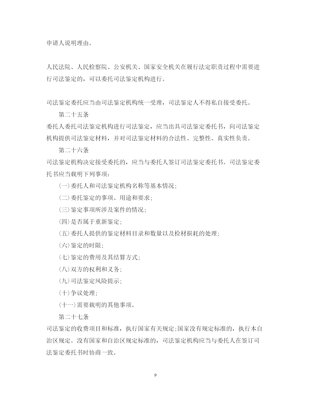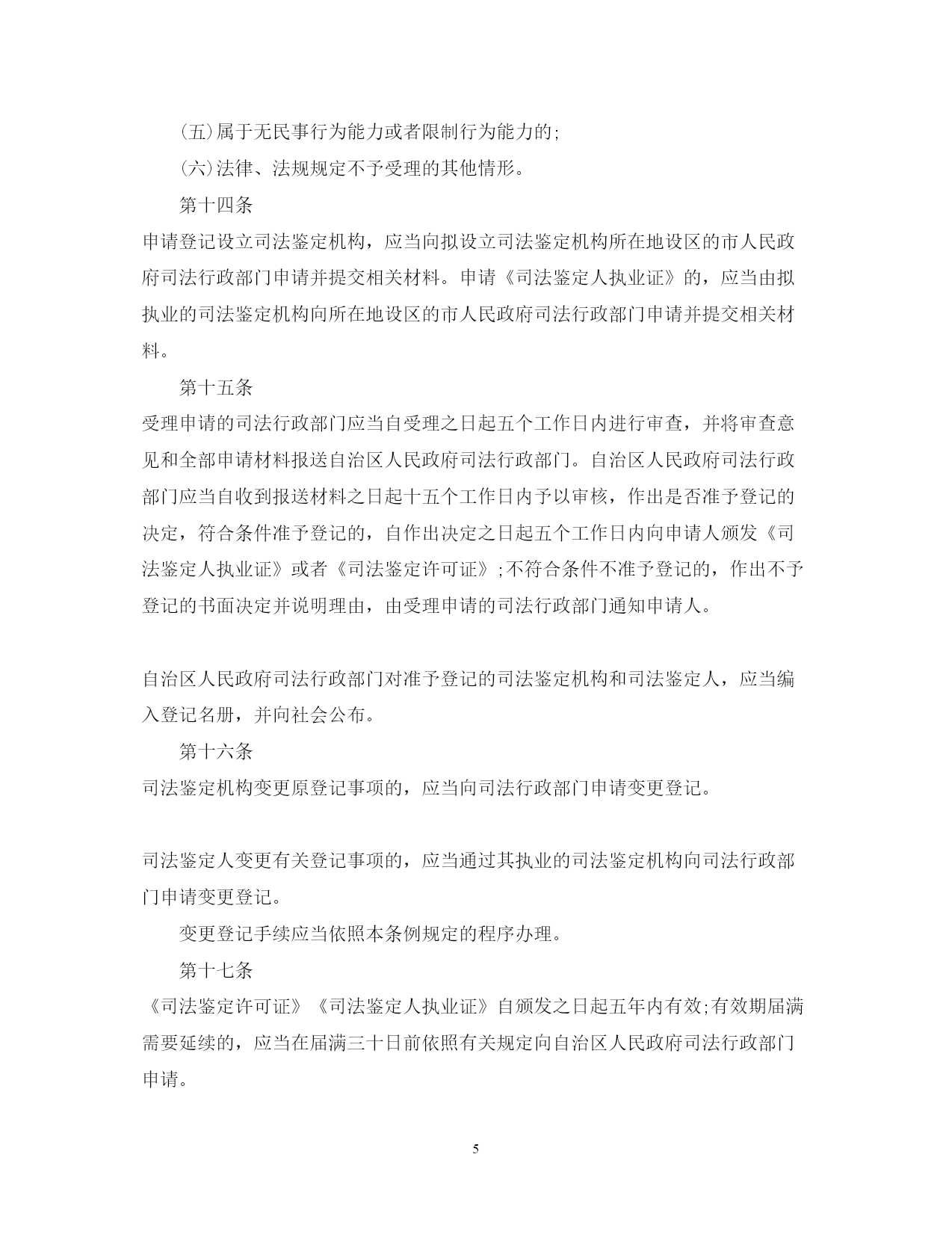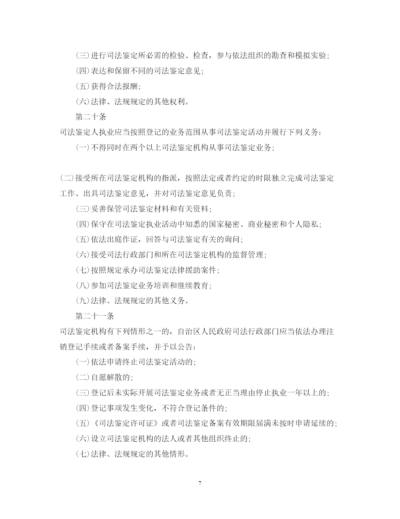 此资料由网络收集而来,如有侵权请告知上传者立即删除。资料共分享,我们负责传递知识。PAGEPAGE17广西司法鉴定管理条例司法鉴定改革一直是我国诉讼法学领域内的热点问题。司法鉴定有着悠久的历史,但做为一项法律制度建设,则是随着现代法律制度的发展逐步成长起来的。下文是广西壮族自治区司法鉴定管理条例,欢迎阅读!广西司法鉴定管理条例全文第一章总则第一条为了规范司法鉴定活动,加强对司法鉴定机构和司法鉴定人的管理,促进司法公正,保障当事人的合法权益,根据《全国人民代表大会常务委员会关于司法鉴定管理问题的决定》和有关法律、行政法规,结合本自治区实际,制定本条例。第二条本自治区行政区域内司法鉴定机构、司法鉴定人及其司法鉴定活动的监督管理,适用本条例。人民检察院、公安机关、国家安全机关设立的司法鉴定机构、司法鉴定人及其司法鉴定活动的监督管理,按照国家有关规定执行。国家对司法鉴定机构、司法鉴定人及其司法鉴定活动的监督管理另有规定的,从其规定。第三条本条例所称司法鉴定,是指司法鉴定机构和司法鉴定人运用科学技术或者专门知识对诉讼涉及的专门性问题进行鉴别和判断并提供鉴定意见的活动,包括法医类、物证类、声像资料类鉴定以及诉讼需要的其他类鉴定。本条例所称司法鉴定机构和司法鉴定人,是指经自治区人民政府司法行政部门审核登记,取得《司法鉴定许可证》《司法鉴定人执业证》,从事前款规定司法鉴定业务的机构和人员。第四条自治区和设区的市人民政府应当根据经济社会发展状况统筹规划本行政区域的司法鉴定事业,建立司法鉴定管理、司法鉴定法律援助、司法鉴定行业重大专项和民族地区司法鉴定机构专项经费保障机制,推动司法鉴定事业健康发展。第五条自治区人民政府司法行政部门负责本行政区域的司法鉴定活动的监督管理工作。设区的市和县(市、区)人民政府司法行政部门依照本条例规定负责本行政区域的司法鉴定活动的监督管理工作。第六条司法鉴定机构和司法鉴定人实行统一登记管理制度。除法律、法规另有规定外,未经自治区人民政府司法行政部门审核登记并编入名册,任何组织和个人不得从事司法鉴定业务。人民检察院、公安机关、国家安全机关根据侦查工作需要设立的司法鉴定机构及其司法鉴定人员按照国家有关规定从事司法鉴定业务,实行备案登记制度,由人民检察院、公安机关、国家安全机关直接管理,不得面向社会接受委托从事司法鉴定业务。自治区人民政府司法行政部门收到人民检察院、公安机关、国家安全机关的有关备案登记材料后,应当在一个月内予以备案登记,单独编制名册并公告。备案登记的司法鉴定机构、司法鉴定人情况发生变化的,应当及时书面告知自治区人民政府司法行政部门。第七条司法鉴定机构和司法鉴定人从事司法鉴定业务,实行司法鉴定人负责制度,应当遵守法律、法规,恪守职业道德和执业纪律,执行科学统一的司法鉴定程序、技术标准和操作规范,接受社会监督。第八条自治区人民政府司法行政部门与本级人民法院、人民检察院、公安机关、国家安全机关应当建立司法鉴定工作联动协调机制。第九条司法鉴定机构、司法鉴定人可以依法参加司法鉴定协会。司法鉴定协会应当依照本条例和司法鉴定协会章程开展活动,对会员加强职业道德、行为规范以及执业技能等行业自律管理,依法保护会员的合法权益,维护有序竞争。司法鉴定协会应当接受司法行政部门的指导和监督。第二章司法鉴定机构和司法鉴定人第十条法人或者其他组织申请登记设立司法鉴定机构的,应当具备下列条件:(一)有符合规范的名称、符合司法鉴定要求的执业场所和不少于二十万元人民币的资金;(二)有明确的司法鉴定业务范围;(三)有在业务范围内进行司法鉴定必需的仪器、设备;(四)有在业务范围内进行司法鉴定必需的依法通过计量认证或者实验室认可的检测实验室;(五)申请从事的每项司法鉴定业务有三名以上司法鉴定人。申请从事的司法鉴定业务相关行业有特殊资质要求的,除具备前款规定条件外,还应当具备相应的行业资质。司法鉴定机构在本自治区行政区域内设立分支机构的,分支机构应当符合第一款规定的条件,并经自治区人民政府司法行政部门审核登记后,方可依法开展司法鉴定活动。本自治区行政区域外司法鉴定机构在本自治区行政区域内设立分支机构的,还应当报司法鉴定机构所在行政区域的省级人民政府司法行政部门同意。第十一条法人或者其他组织申请从事司法鉴定业务,有下列情形之一的,不予登记设立司法鉴定机构:(一)法定代表人或者负责人受过刑事处罚或者开除公职处分的;(二)法律、法规规定不予登记的其他情形。第十二条公民具备下列条件之一的,可以申请《司法鉴定人执业证》:(一)具有与所申请从事的司法鉴定业务相关的高级专业技术职称;(二)具有与所申请从事的司法鉴定业务相关专业执业资格或者高等院校相关专业本科以上学历,从事相关工