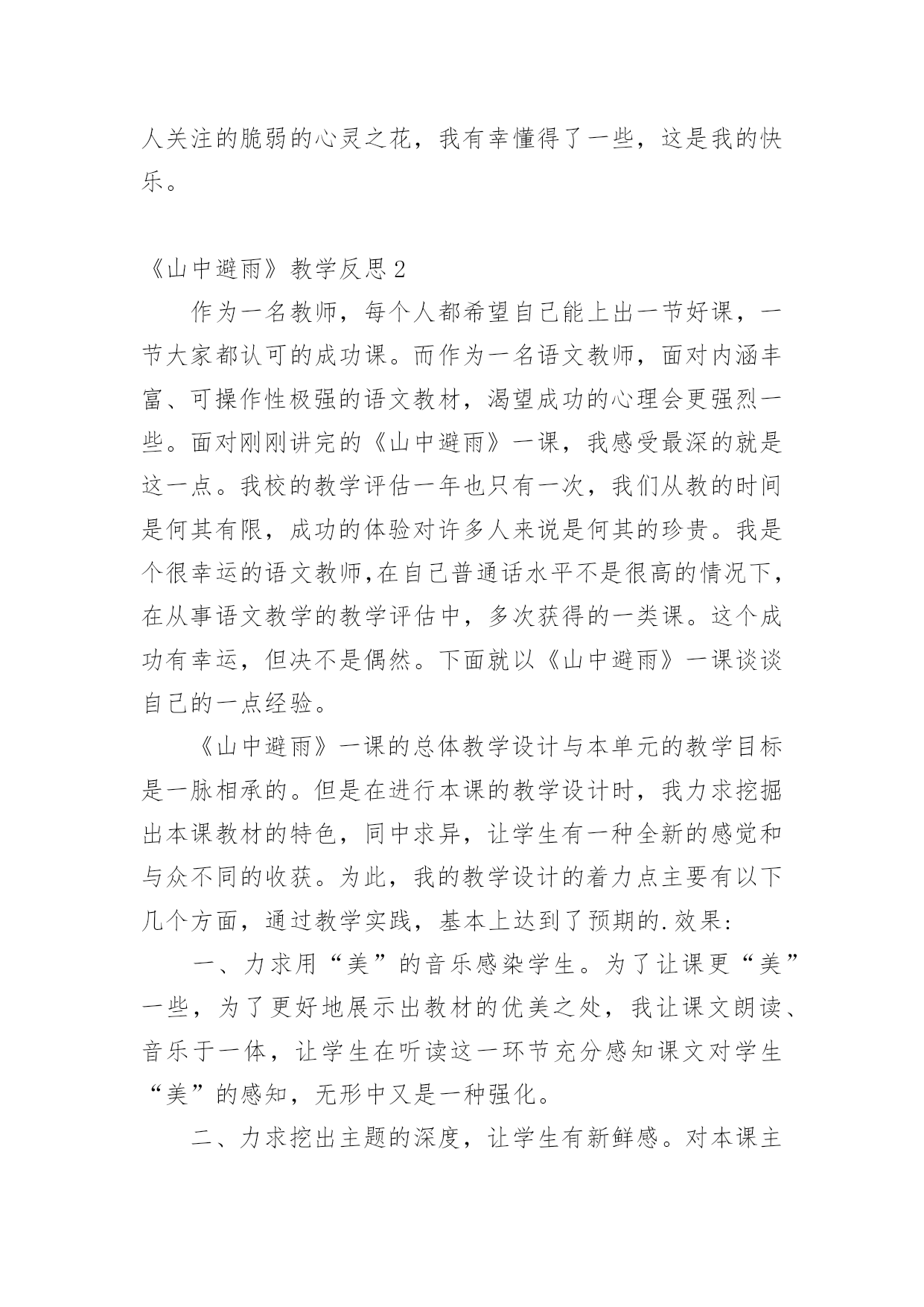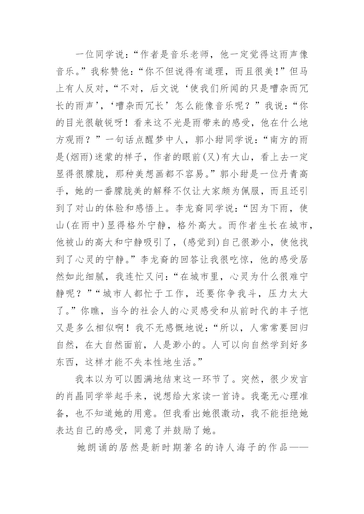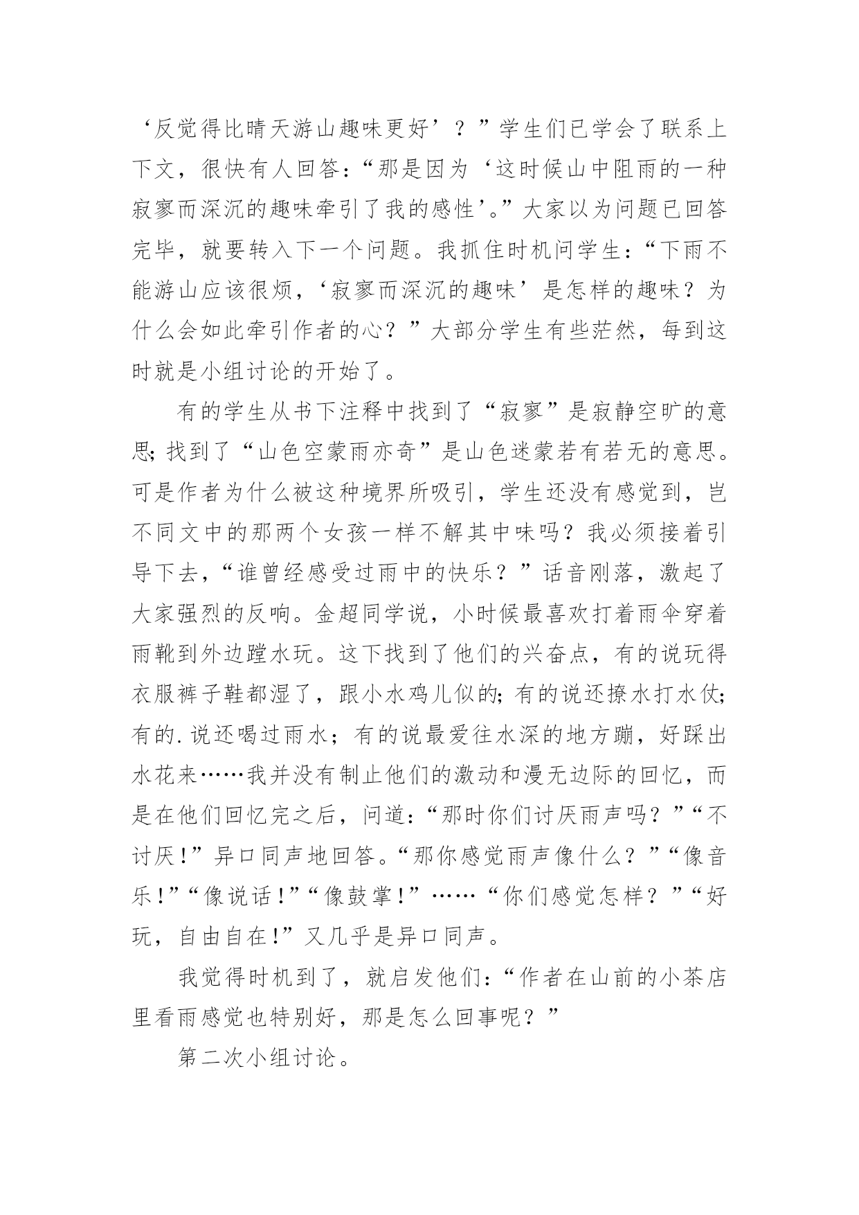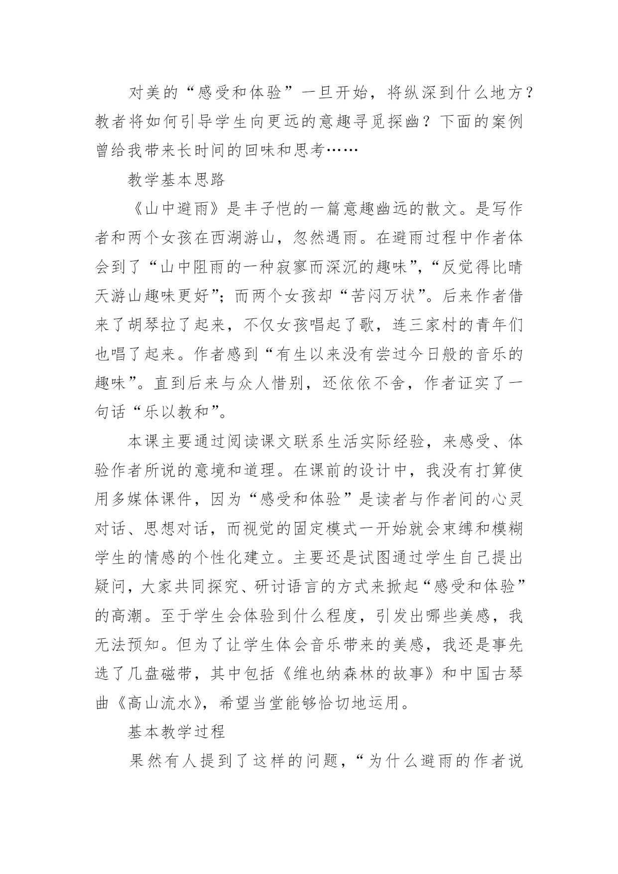 《山中避雨》教学反思作为一名人民老师,课堂教学是我们的工作之一,写教学反思能总结教学过程中的很多讲课技巧,那么教学反思应该怎么写才合适呢?下面是小编帮大家整理的《山中避雨》教学反思,希望对大家有所帮助。《山中避雨》教学反思1作为语文教师,我一直有个愿望,那就是让学生通过学习语文懂得什么是美。在我的想像中,语文并不仅仅是一门工具学科,不仅仅是内容上的综合——语文、政治、哲学、道德的综合,还有形式上的综合与思维上的综合,并从形式上的综合进而实现学科的类的大跨越。比如:概念和色彩、艺术和技术、文学和科学、语言表达思维和技术操作思维……这样,才是符合现代人多元的个性化的文化需求的人性化教育。那么,感知和把握现实和想象中的美,将成为人们学习的目标和锻炼的目的。因此,语文可以是一种雅致的文化,一块滋养心灵的沃土,一种洗尽铅华超越现实的精神享受。尽管这有乌托邦之嫌,但是新鲜的、丰富的、独特的美感会培养我们未来民族的浪漫情怀和无穷的创造力。于是新课标中提到的“感受和体验美”就成为语文教学中独特的风景线。而美感的个性、不可知性和不可控性都给语文教学中的审美过程带来了神秘色彩和特殊的质感。对美的“感受和体验”一旦开始,将纵深到什么地方?教者将如何引导学生向更远的意趣寻觅探幽?下面的案例曾给我带来长时间的回味和思考……教学基本思路《山中避雨》是丰子恺的一篇意趣幽远的散文。是写作者和两个女孩在西湖游山,忽然遇雨。在避雨过程中作者体会到了“山中阻雨的一种寂寥而深沉的趣味”,“反觉得比晴天游山趣味更好”;而两个女孩却“苦闷万状”。后来作者借来了胡琴拉了起来,不仅女孩唱起了歌,连三家村的青年们也唱了起来。作者感到“有生以来没有尝过今日般的音乐的趣味”。直到后来与众人惜别,还依依不舍,作者证实了一句话“乐以教和”。本课主要通过阅读课文联系生活实际经验,来感受、体验作者所说的意境和道理。在课前的设计中,我没有打算使用多媒体课件,因为“感受和体验”是读者与作者间的心灵对话、思想对话,而视觉的固定模式一开始就会束缚和模糊学生的情感的个性化建立。主要还是试图通过学生自己提出疑问,大家共同探究、研讨语言的方式来掀起“感受和体验”的高潮。至于学生会体验到什么程度,引发出哪些美感,我无法预知。但为了让学生体会音乐带来的美感,我还是事先选了几盘磁带,其中包括《维也纳森林的故事》和中国古琴曲《高山流水》,希望当堂能够恰切地运用。基本教学过程果然有人提到了这样的问题,“为什么避雨的作者说‘反觉得比晴天游山趣味更好’?”学生们已学会了联系上下文,很快有人回答:“那是因为‘这时候山中阻雨的一种寂寥而深沉的趣味牵引了我的感性’。”大家以为问题已回答完毕,就要转入下一个问题。我抓住时机问学生:“下雨不能游山应该很烦,‘寂寥而深沉的趣味’是怎样的趣味?为什么会如此牵引作者的心?”大部分学生有些茫然,每到这时就是小组讨论的开始了。有的学生从书下注释中找到了“寂寥”是寂静空旷的意思;找到了“山色空蒙雨亦奇”是山色迷蒙若有若无的意思。可是作者为什么被这种境界所吸引,学生还没有感觉到,岂不同文中的那两个女孩一样不解其中味吗?我必须接着引导下去,“谁曾经感受过雨中的快乐?”话音刚落,激起了大家强烈的反响。金超同学说,小时候最喜欢打着雨伞穿着雨靴到外边蹚水玩。这下找到了他们的兴奋点,有的说玩得衣服裤子鞋都湿了,跟小水鸡儿似的;有的说还撩水打水仗;有的.说还喝过雨水;有的说最爱往水深的地方蹦,好踩出水花来……我并没有制止他们的激动和漫无边际的回忆,而是在他们回忆完之后,问道:“那时你们讨厌雨声吗?”“不讨厌!”异口同声地回答。“那你感觉雨声像什么?”“像音乐!”“像说话!”“像鼓掌!”……“你们感觉怎样?”“好玩,自由自在!”又几乎是异口同声。我觉得时机到了,就启发他们:“作者在山前的小茶店里看雨感觉也特别好,那是怎么回事呢?”第二次小组讨论。一位同学说:“作者是音乐老师,他一定觉得这雨声像音乐。”我称赞他:“你不但说得有道理,而且很美!”但马上有人反对,“不对,后文说‘使我们所闻的只是嘈杂而冗长的雨声’,‘嘈杂而冗长’怎么能像音乐呢?”我说:“你的目光很敏锐呀!看来这不光是雨带来的感受,他在什么地方观雨?”一句话点醒梦中人,郭小甜同学说:“南方的雨是(烟雨)迷蒙的样子,作者的眼前(又)有大山,看上去一定显得很朦胧,那种美想画都不容易。”郭小甜是一位丹青高手,她的一番朦胧美的解释不仅让大家颇为佩服,而且还引到了对山的体验和感悟上。李龙裔同学说:“因为下雨,使山(在雨中)显得格外宁静,格外高大。而作者生长在城市,他被山的高大和宁静吸引了,(感觉到)自己很渺小,使他找到了心灵的宁静。”李龙裔的回答让我很吃惊,他的感受居然如此细腻,我连忙又问:“在城市里,心灵为什么很难宁静呢?”“城市人都忙于工作,还要