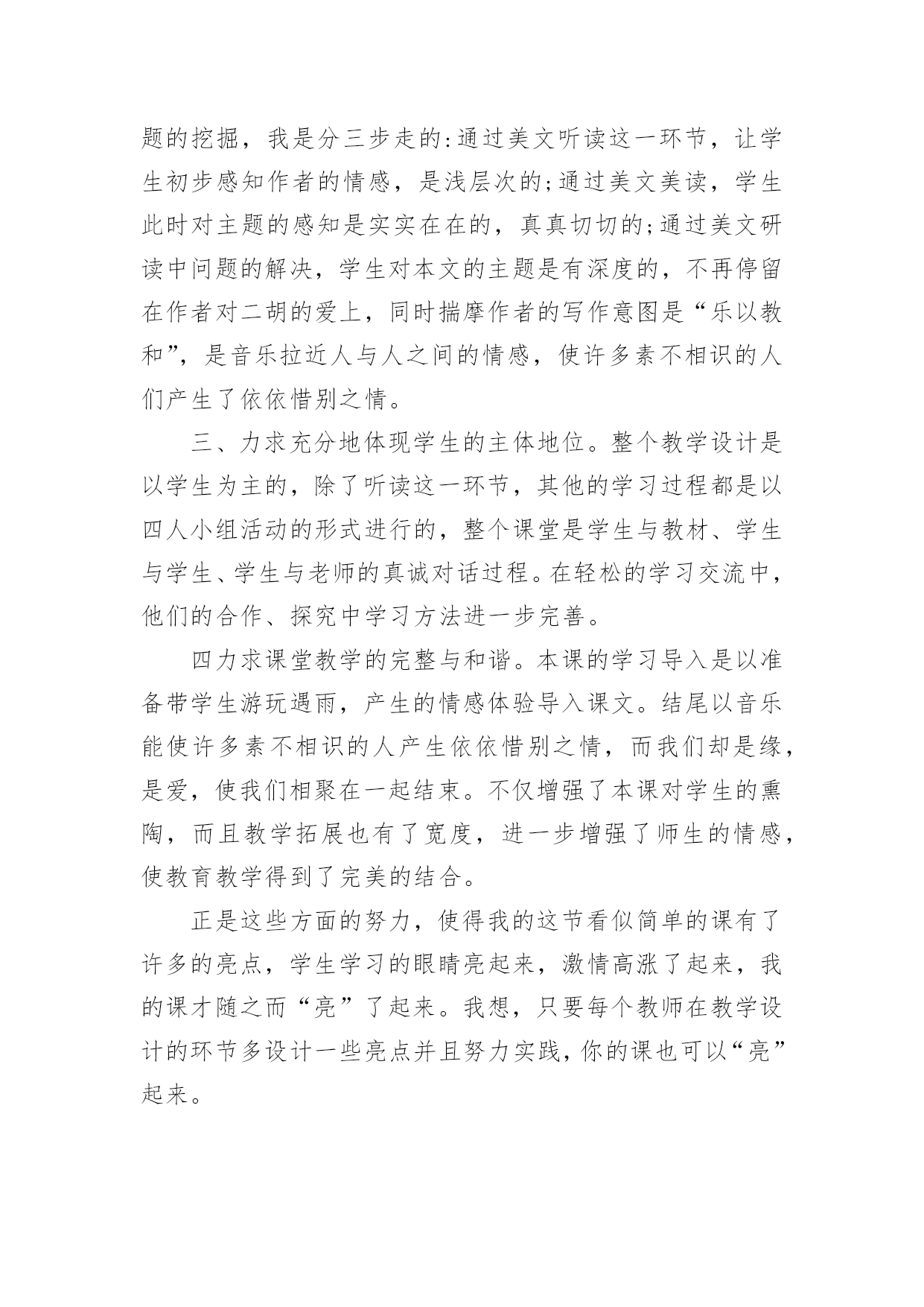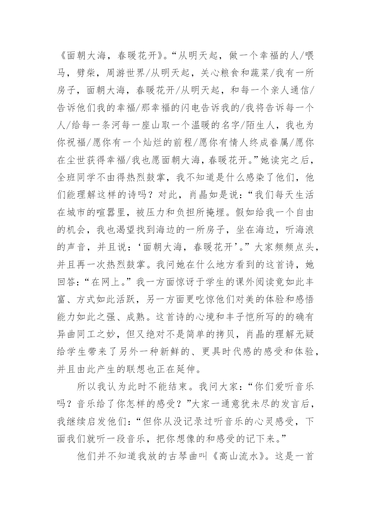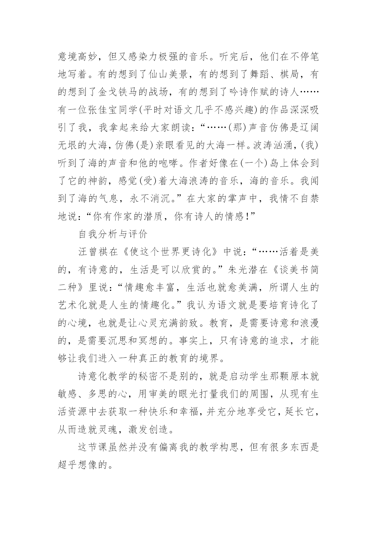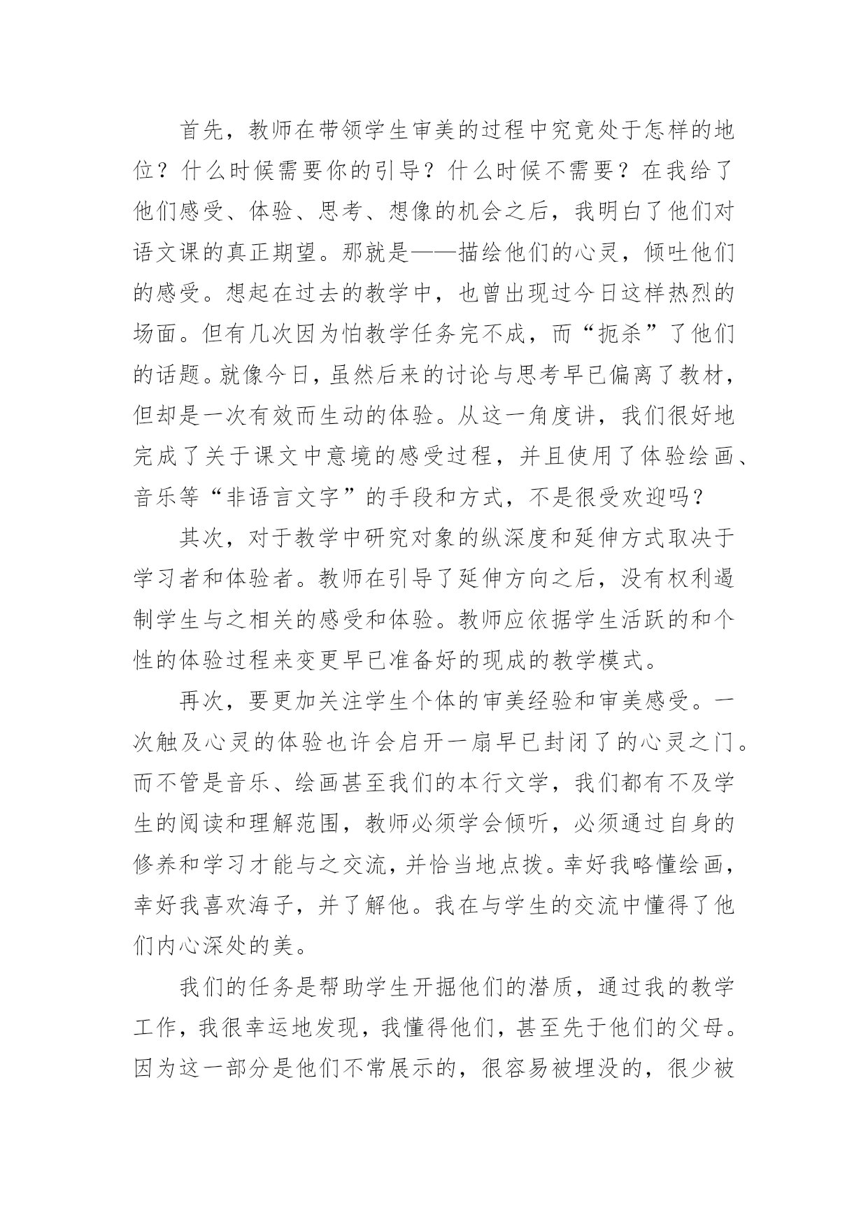 《山中避雨》教学反思作为一名人民老师,课堂教学是我们的工作之一,写教学反思能总结教学过程中的很多讲课技巧,那么教学反思应该怎么写才合适呢?下面是小编帮大家整理的《山中避雨》教学反思,希望对大家有所帮助。《山中避雨》教学反思1作为语文教师,我一直有个愿望,那就是让学生通过学习语文懂得什么是美。在我的想像中,语文并不仅仅是一门工具学科,不仅仅是内容上的综合——语文、政治、哲学、道德的综合,还有形式上的综合与思维上的综合,并从形式上的综合进而实现学科的类的大跨越。比如:概念和色彩、艺术和技术、文学和科学、语言表达思维和技术操作思维……这样,才是符合现代人多元的个性化的文化需求的人性化教育。那么,感知和把握现实和想象中的美,将成为人们学习的目标和锻炼的目的。因此,语文可以是一种雅致的文化,一块滋养心灵的沃土,一种洗尽铅华超越现实的精神享受。尽管这有乌托邦之嫌,但是新鲜的、丰富的、独特的美感会培养我们未来民族的浪漫情怀和无穷的创造力。于是新课标中提到的“感受和体验美”就成为语文教学中独特的风景线。而美感的个性、不可知性和不可控性都给语文教学中的审美过程带来了神秘色彩和特殊的质感。对美的“感受和体验”一旦开始,将纵深到什么地方?教者将如何引导学生向更远的意趣寻觅探幽?下面的案例曾给我带来长时间的回味和思考……教学基本思路《山中避雨》是丰子恺的一篇意趣幽远的散文。是写作者和两个女孩在西湖游山,忽然遇雨。在避雨过程中作者体会到了“山中阻雨的一种寂寥而深沉的趣味”,“反觉得比晴天游山趣味更好”;而两个女孩却“苦闷万状”。后来作者借来了胡琴拉了起来,不仅女孩唱起了歌,连三家村的青年们也唱了起来。作者感到“有生以来没有尝过今日般的音乐的趣味”。直到后来与众人惜别,还依依不舍,作者证实了一句话“乐以教和”。本课主要通过阅读课文联系生活实际经验,来感受、体验作者所说的意境和道理。在课前的设计中,我没有打算使用多媒体课件,因为“感受和体验”是读者与作者间的心灵对话、思想对话,而视觉的固定模式一开始就会束缚和模糊学生的情感的个性化建立。主要还是试图通过学生自己提出疑问,大家共同探究、研讨语言的方式来掀起“感受和体验”的高潮。至于学生会体验到什么程度,引发出哪些美感,我无法预知。但为了让学生体会音乐带来的美感,我还是事先选了几盘磁带,其中包括《维也纳森林的故事》和中国古琴曲《高山流水》,希望当堂能够恰切地运用。基本教学过程果然有人提到了这样的问题,“为什么避雨的作者说‘反觉得比晴天游山趣味更好’?”学生们已学会了联系上下文,很快有人回答:“那是因为‘这时候山中阻雨的一种寂寥而深沉的趣味牵引了我的感性’。”大家以为问题已回答完毕,就要转入下一个问题。我抓住时机问学生:“下雨不能游山应该很烦,‘寂寥而深沉的趣味’是怎样的趣味?为什么会如此牵引作者的心?”大部分学生有些茫然,每到这时就是小组讨论的开始了。有的学生从书下注释中找到了“寂寥”是寂静空旷的意思;找到了“山色空蒙雨亦奇”是山色迷蒙若有若无的意思。可是作者为什么被这种境界所吸引,学生还没有感觉到,岂不同文中的那两个女孩一样不解其中味吗?我必须接着引导下去,“谁曾经感受过雨中的快乐?”话音刚落,激起了大家强烈的反响。金超同学说,小时候最喜欢打着雨伞穿着雨靴到外边蹚水玩。这下找到了他们的兴奋点,有的说玩得衣服裤子鞋都湿了,跟小水鸡儿似的;有的说还撩水打水仗;有的.说还喝过雨水;有的说最爱往水深的地方蹦,好踩出水花来……我并没有制止他们的激动和漫无边际的回忆,而是在他们回忆完之后,问道:“那时你们讨厌雨声吗?”“不讨厌!”异口同声地回答。“那你感觉雨声像什么?”“像音乐!”“像说话!”“像鼓掌!”……“你们感觉怎样?”“好玩,自由自在!”又几乎是异口同声。我觉得时机到了,就启发他们:“作者在山前的小茶店里看雨感觉也特别好,那是怎么回事呢?”第二次小组讨论。一位同学说:“作者是音乐老师,他一定觉得这雨声像音乐。”我称赞他:“你不但说得有道理,而且很美!”但马上有人反对,“不对,后文说‘使我们所闻的只是嘈杂而冗长的雨声’,‘嘈杂而冗长’怎么能像音乐呢?”我说:“你的目光很敏锐呀!看来这不光是雨带来的感受,他在什么地方观雨?”一句话点醒梦中人,郭小甜同学说:“南方的雨是(烟雨)迷蒙的样子,作者的眼前(又)有大山,看上去一定显得很朦胧,那种美想画都不容易。”郭小甜是一位丹青高手,她的一番朦胧美的解释不仅让大家颇为佩服,而且还引到了对山的体验和感悟上。李龙裔同学说:“因为下雨,使山(在雨中)显得格外宁静,格外高大。而作者生长在城市,他被山的高大和宁静吸引了,(感觉到)自己很渺小,使他找到了心灵的宁静。”李龙裔的回答让我很吃惊,他的感受居然如此细腻,我连忙又问:“在城市里,心灵为什么很难宁静呢?”“城市人都忙于工作,还要