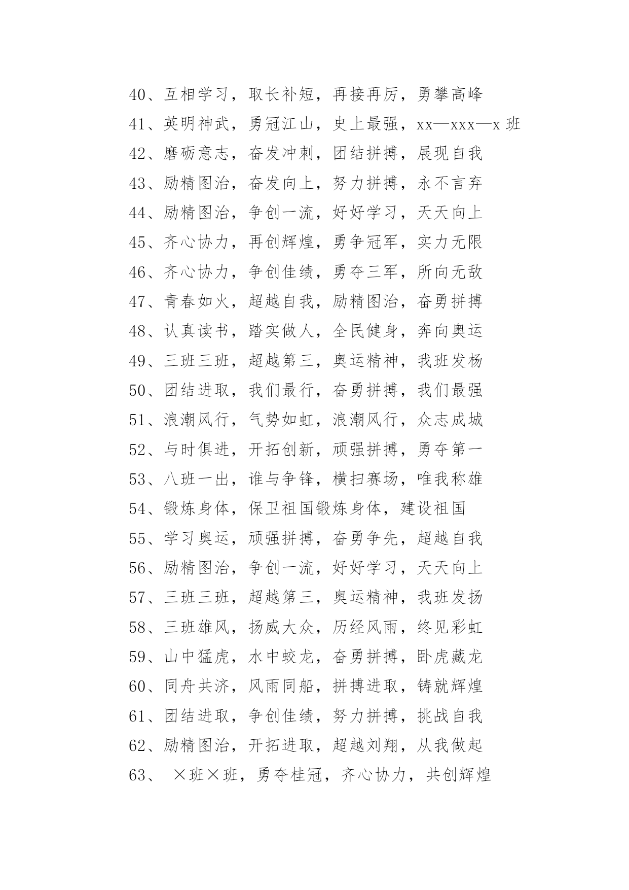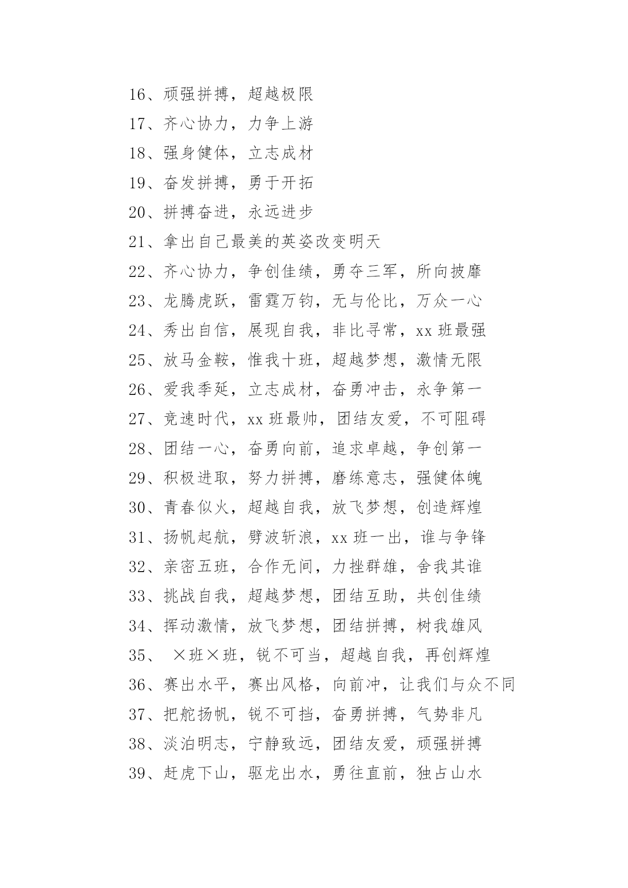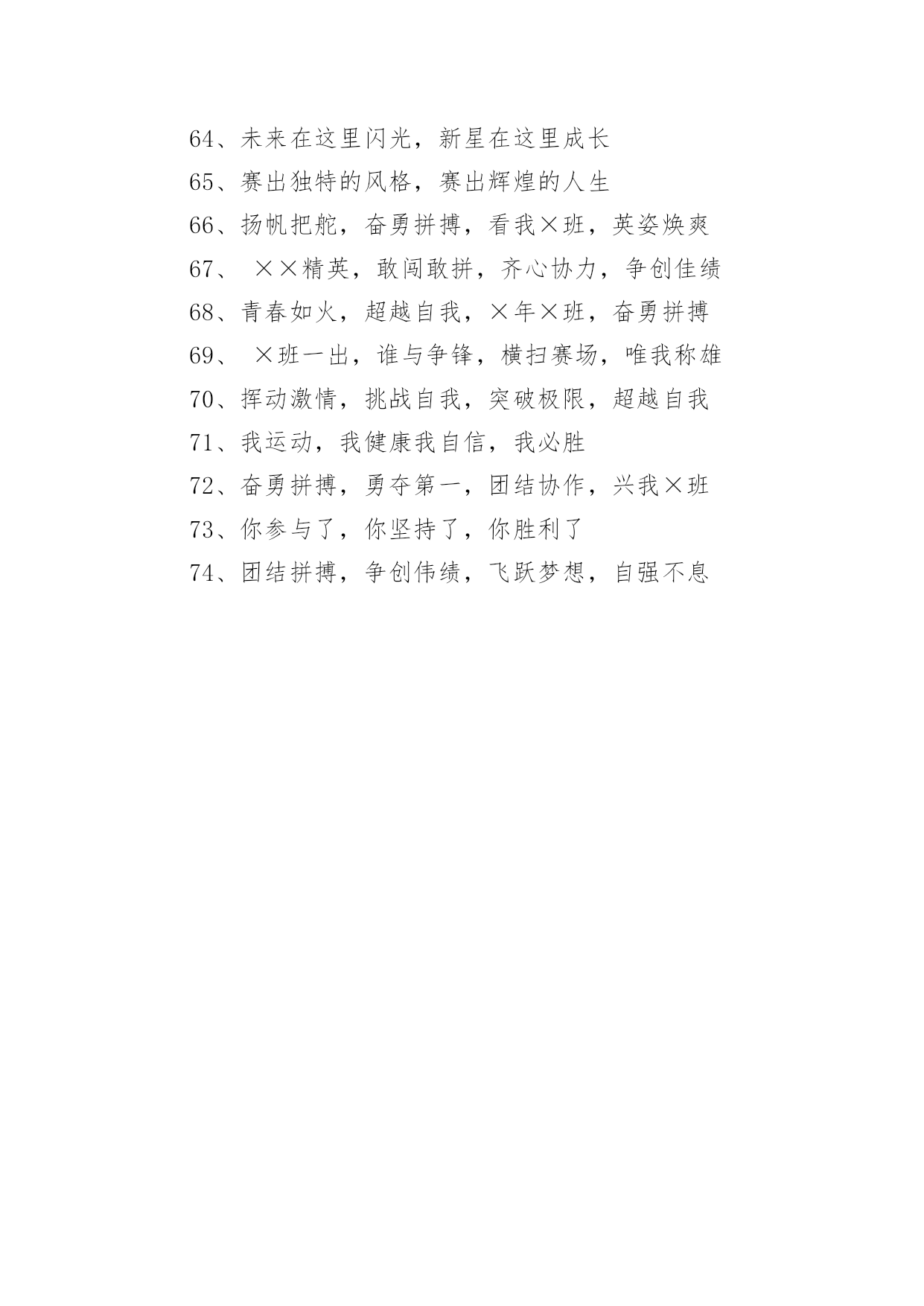 大学春季运动会口号大学春季运动会口号大全在学习、工作乃至生活中,大家都知道一些经典的口号吧,高效的口号具有针对性,时效性,鼓动性和简洁性的特点。还苦于找不到好的口号?下面是小编帮大家整理的大学春季运动会口号大全,欢迎阅读与收藏。1、参与就是胜利2、笑声响亮,十班最棒3、奥运精神永驻我心4、遵规守纪团结互敬5、顽强拼搏勇夺第一6、利剑出鞘,倒海翻江7、赛出风格赛出水平8、展现自我争创新高9、挥动激情放飞梦想10、凌云赛场,斗志昂扬11、飞跃梦想,热情奔放12、奋勇拼搏,展现自我13、团结拼搏,争创佳绩14、友谊第一,比赛第二15、青春无悔,激情无限16、顽强拼搏,超越极限17、齐心协力,力争上游18、强身健体,立志成材19、奋发拼搏,勇于开拓20、拼搏奋进,永远进步21、拿出自己最美的英姿改变明天22、齐心协力,争创佳绩,勇夺三军,所向披靡23、龙腾虎跃,雷霆万钧,无与伦比,万众一心24、秀出自信,展现自我,非比寻常,xx班最强25、放马金鞍,惟我十班,超越梦想,激情无限26、爱我季延,立志成材,奋勇冲击,永争第一27、竞速时代,xx班最帅,团结友爱,不可阻碍28、团结一心,奋勇向前,追求卓越,争创第一29、积极进取,努力拼搏,磨练意志,强健体魄30、青春似火,超越自我,放飞梦想,创造辉煌31、扬帆起航,劈波斩浪,xx班一出,谁与争锋32、亲密五班,合作无间,力挫群雄,舍我其谁33、挑战自我,超越梦想,团结互助,共创佳绩34、挥动激情,放飞梦想,团结拼搏,树我雄风35、×班×班,锐不可当,超越自我,再创辉煌36、赛出水平,赛出风格,向前冲,让我们与众不同37、把舵扬帆,锐不可挡,奋勇拼搏,气势非凡38、淡泊明志,宁静致远,团结友爱,顽强拼搏39、赶虎下山,驱龙出水,勇往直前,独占山水40、互相学习,取长补短,再接再厉,勇攀高峰41、英明神武,勇冠江山,史上最强,xx—xxx—x班42、磨砺意志,奋发冲刺,团结拼搏,展现自我43、励精图治,奋发向上,努力拼搏,永不言弃44、励精图治,争创一流,好好学习,天天向上45、齐心协力,再创辉煌,勇争冠军,实力无限46、齐心协力,争创佳绩,勇夺三军,所向无敌47、青春如火,超越自我,励精图治,奋勇拼搏48、认真读书,踏实做人,全民健身,奔向奥运49、三班三班,超越第三,奥运精神,我班发杨50、团结进取,我们最行,奋勇拼搏,我们最强51、浪潮风行,气势如虹,浪潮风行,众志成城52、与时俱进,开拓创新,顽强拼搏,勇夺第一53、八班一出,谁与争锋,横扫赛场,唯我称雄54、锻炼身体,保卫祖国锻炼身体,建设祖国55、学习奥运,顽强拼搏,奋勇争先,超越自我56、励精图治,争创一流,好好学习,天天向上57、三班三班,超越第三,奥运精神,我班发扬58、三班雄风,扬威大众,历经风雨,终见彩虹59、山中猛虎,水中蛟龙,奋勇拼搏,卧虎藏龙60、同舟共济,风雨同船,拼搏进取,铸就辉煌61、团结进取,争创佳绩,努力拼搏,挑战自我62、励精图治,开拓进取,超越刘翔,从我做起63、×班×班,勇夺桂冠,齐心协力,共创辉煌64、未来在这里闪光,新星在这里成长65、赛出独特的风格,赛出辉煌的人生66、扬帆把舵,奋勇拼搏,看我×班,英姿焕爽67、××精英,敢闯敢拼,齐心协力,争创佳绩68、青春如火,超越自我,×年×班,奋勇拼搏69、×班一出,谁与争锋,横扫赛场,唯我称雄70、挥动激情,挑战自我,突破极限,超越自我71、我运动,我健康我自信,我必胜72、奋勇拼搏,勇夺第一,团结协作,兴我×班73、你参与了,你坚持了,你胜利了74、团结拼搏,争创伟绩,飞跃梦想,自强不息