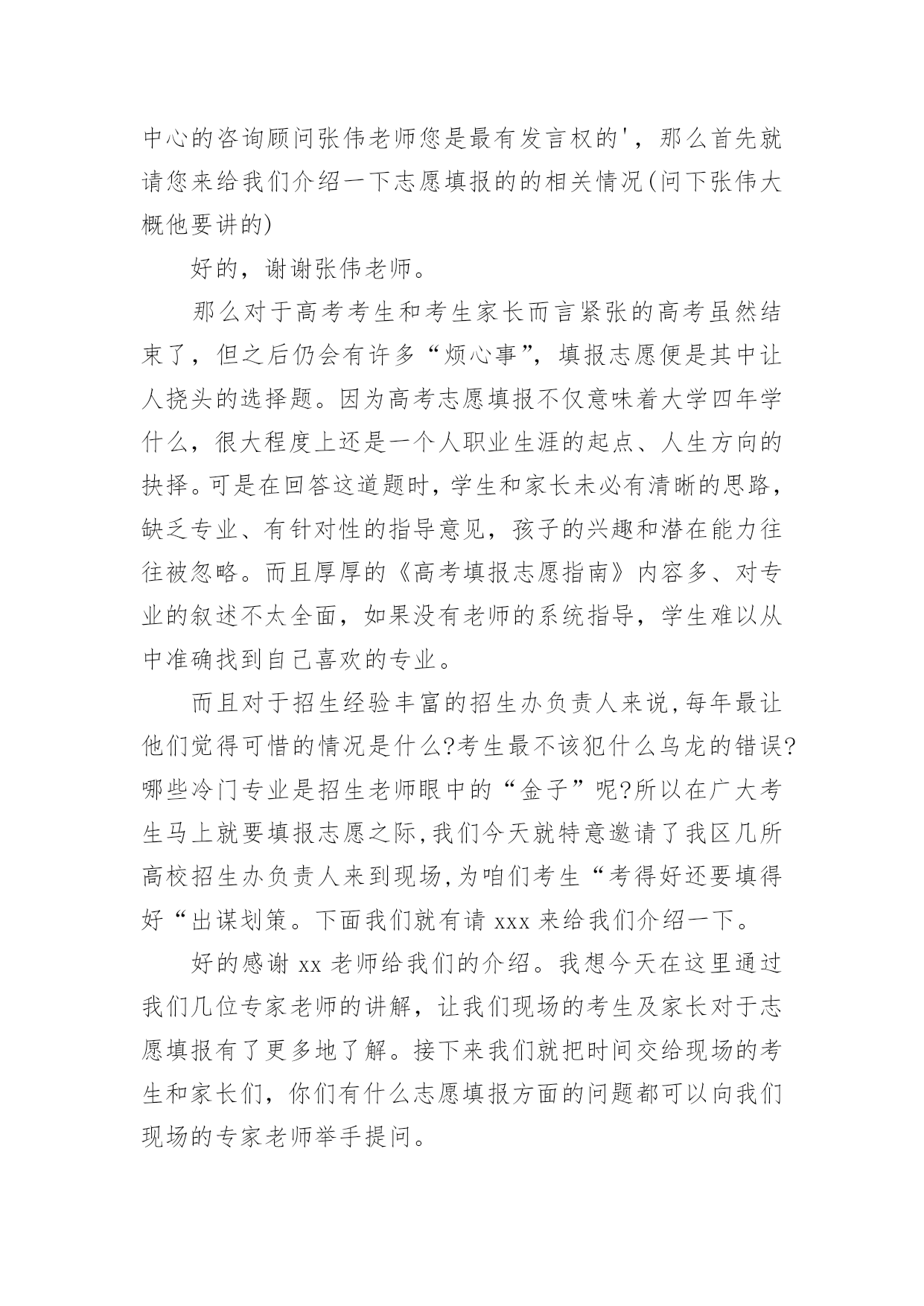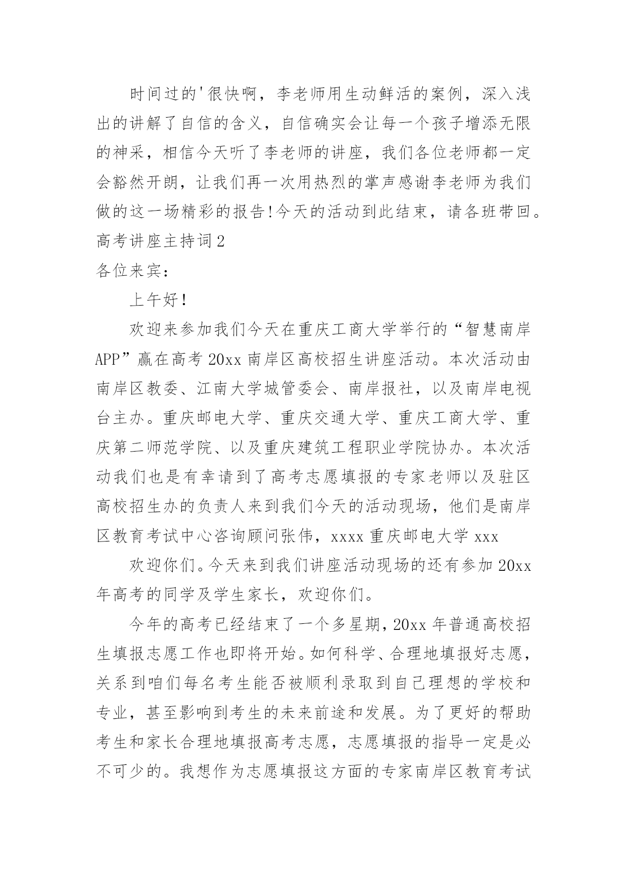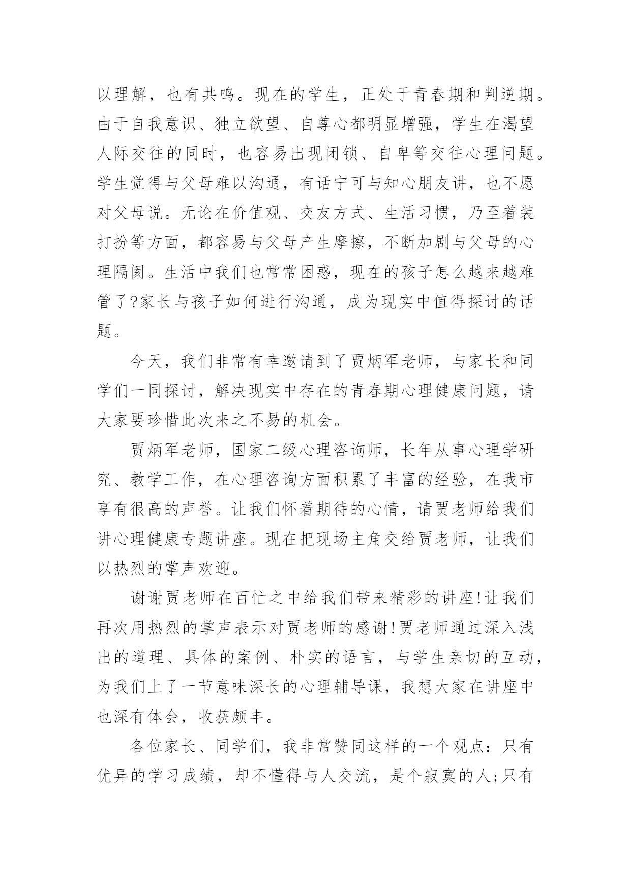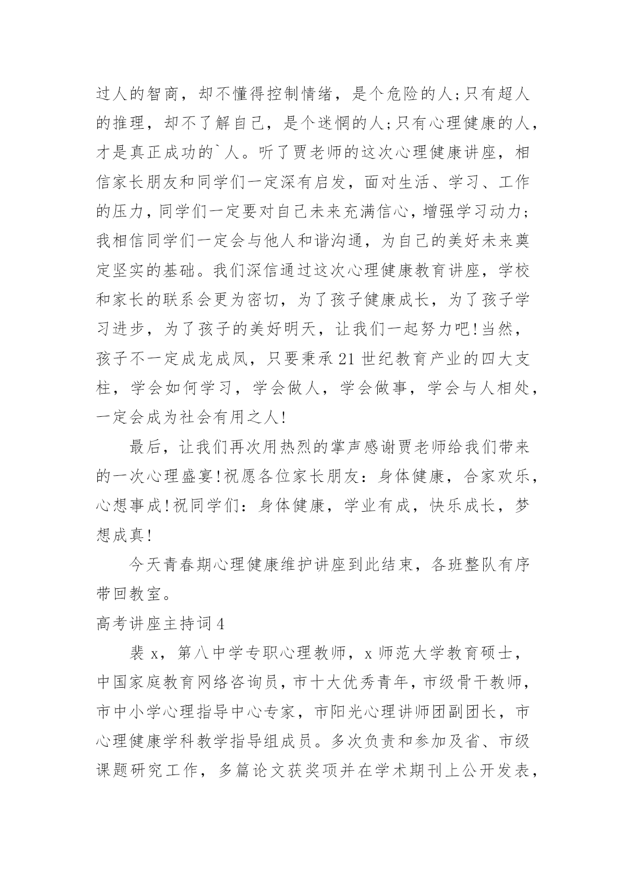 高考讲座主持词高考讲座主持词契合现场环境的主持词能给集会带来双倍的效果。在当今不断发展的世界,主持词是活动、集会等的必需品,你所见过的主持词应该是什么样的?下面是小编整理的高考讲座主持词,欢迎大家分享。高考讲座主持词1各位老师,同学们:上午好!我们胶西镇大村小学是一所农村小学,我们老师们面临着家长外出打工造成的留守儿童以及因为家庭变故而导致的一系列的儿童教育问题,当我们满怀困惑的时候,今天非常幸运的邀请到了李桂娟老师为我们指点迷津,让我们以热烈的掌声欢迎李老师的到来!李老师先后获得心理咨询师,国家中级心理辅导员、沙盘治疗师,以及胶州心语热线成员,相信今天李老师做的“自信—”一定会让老师和同学们受益匪浅,今天我们议程有两项,第一项是聆听李老师做的报告,第二项是我们老师在班级管理中遇到的各种儿童心理问题与李老师做一个研讨交流。下面就让我们以热烈的掌声欢迎李老师为我们做精彩报告。时间过的'很快啊,李老师用生动鲜活的案例,深入浅出的讲解了自信的含义,自信确实会让每一个孩子增添无限的神采,相信今天听了李老师的讲座,我们各位老师都一定会豁然开朗,让我们再一次用热烈的掌声感谢李老师为我们做的这一场精彩的报告!今天的活动到此结束,请各班带回。高考讲座主持词2各位来宾:上午好!欢迎来参加我们今天在重庆工商大学举行的“智慧南岸APP”赢在高考20xx南岸区高校招生讲座活动。本次活动由南岸区教委、江南大学城管委会、南岸报社,以及南岸电视台主办。重庆邮电大学、重庆交通大学、重庆工商大学、重庆第二师范学院、以及重庆建筑工程职业学院协办。本次活动我们也是有幸请到了高考志愿填报的专家老师以及驻区高校招生办的负责人来到我们今天的活动现场,他们是南岸区教育考试中心咨询顾问张伟,xxxx重庆邮电大学xxx欢迎你们。今天来到我们讲座活动现场的还有参加20xx年高考的同学及学生家长,欢迎你们。今年的高考已经结束了一个多星期,20xx年普通高校招生填报志愿工作也即将开始。如何科学、合理地填报好志愿,关系到咱们每名考生能否被顺利录取到自己理想的学校和专业,甚至影响到考生的未来前途和发展。为了更好的帮助考生和家长合理地填报高考志愿,志愿填报的指导一定是必不可少的。我想作为志愿填报这方面的专家南岸区教育考试中心的咨询顾问张伟老师您是最有发言权的',那么首先就请您来给我们介绍一下志愿填报的的相关情况(问下张伟大概他要讲的)好的,谢谢张伟老师。那么对于高考考生和考生家长而言紧张的高考虽然结束了,但之后仍会有许多“烦心事”,填报志愿便是其中让人挠头的选择题。因为高考志愿填报不仅意味着大学四年学什么,很大程度上还是一个人职业生涯的起点、人生方向的抉择。可是在回答这道题时,学生和家长未必有清晰的思路,缺乏专业、有针对性的指导意见,孩子的兴趣和潜在能力往往被忽略。而且厚厚的《高考填报志愿指南》内容多、对专业的叙述不太全面,如果没有老师的系统指导,学生难以从中准确找到自己喜欢的专业。而且对于招生经验丰富的招生办负责人来说,每年最让他们觉得可惜的情况是什么?考生最不该犯什么乌龙的错误?哪些冷门专业是招生老师眼中的“金子”呢?所以在广大考生马上就要填报志愿之际,我们今天就特意邀请了我区几所高校招生办负责人来到现场,为咱们考生“考得好还要填得好“出谋划策。下面我们就有请xxx来给我们介绍一下。好的感谢xx老师给我们的介绍。我想今天在这里通过我们几位专家老师的讲解,让我们现场的考生及家长对于志愿填报有了更多地了解。接下来我们就把时间交给现场的考生和家长们,你们有什么志愿填报方面的问题都可以向我们现场的专家老师举手提问。作为高考招生非常重要而且必不可少的志愿填报,有些人从重要性上将其称之为第二次高考,正确填报高考志愿,将会如鱼得水,从而上个理想的大学;而高考志愿填报不当将会事与愿违,就有可能名落孙山。刚才听了老师的讲解,以及现场的提问交流,相信已经让我们的考生和家长对志愿填报有了一定的了解。那么最后我们的考生和家长可以在讲座活动结束后和我们的几位嘉宾老师交换联系方式,进行交流探讨。最后在这里为同学们送上了诚挚的鼓励和祝福,希望大家在日后的大学生活中能积极开拓自身潜能,开启自己丰富多彩的人生。好的,今天的“智慧南岸APP”赢在高考20xx南岸区高校招生讲座活动就进行到这里,感谢各位的参与。高考讲座主持词3尊敬的领导、家长、老师、亲爱的同学们:大家好!金色九月,秋高气爽。在这收获的季节、美好的日子,我校召开青春期心理维护讲座,我们相信,通过开展本次讲座,一定会使大家受益匪浅。教育,是社会关心的话题;学生是我们关注的焦点。今天,学校把各位家长召集在这里,目的是架起学校教育、家庭教育、社会教育的桥梁,构建起学校、家庭、社会三位一体的教育网络,实现共育新人的最终目标。“望子成龙,盼女成凤”是每个家长普遍