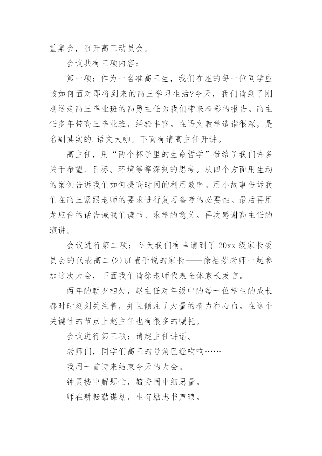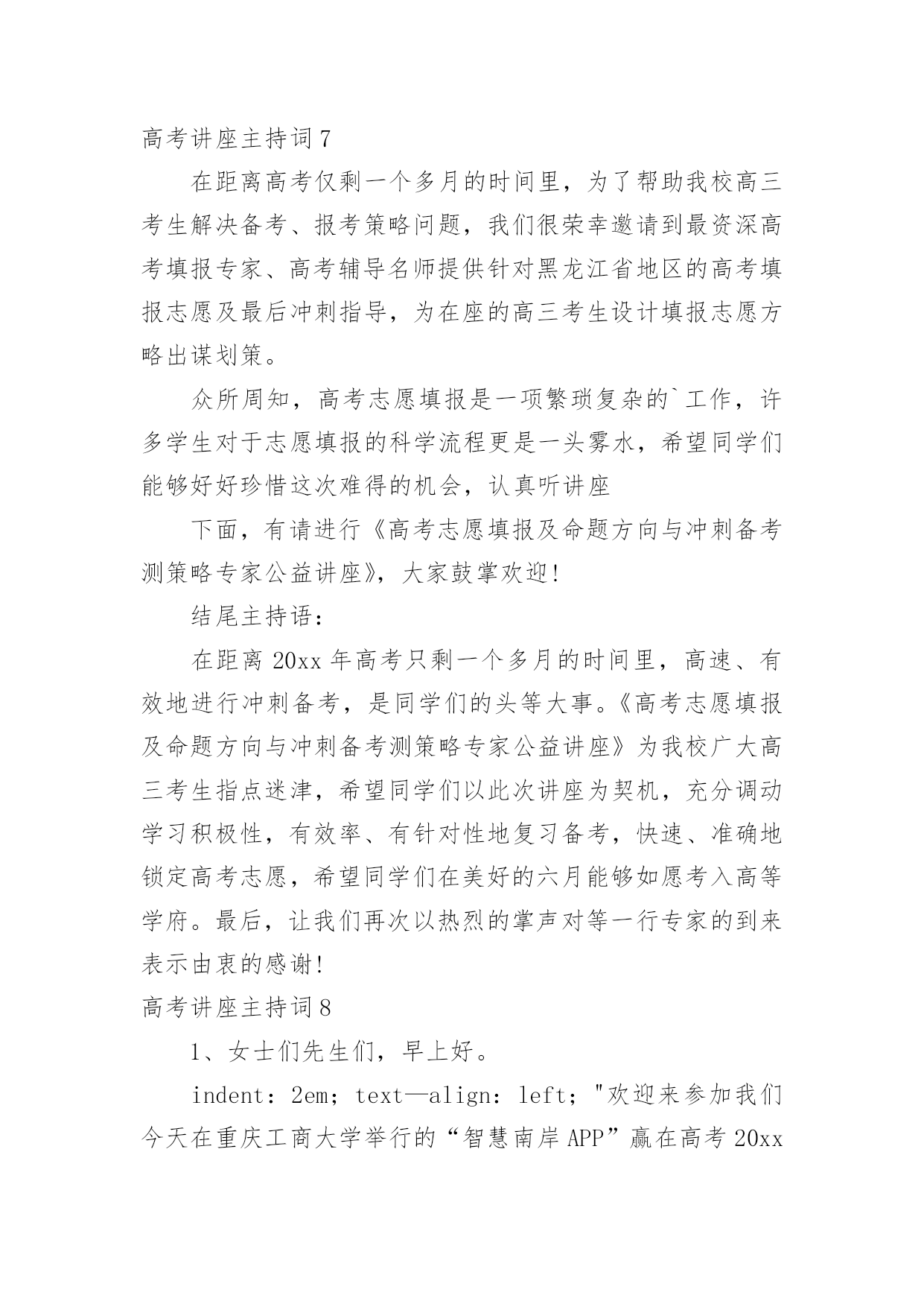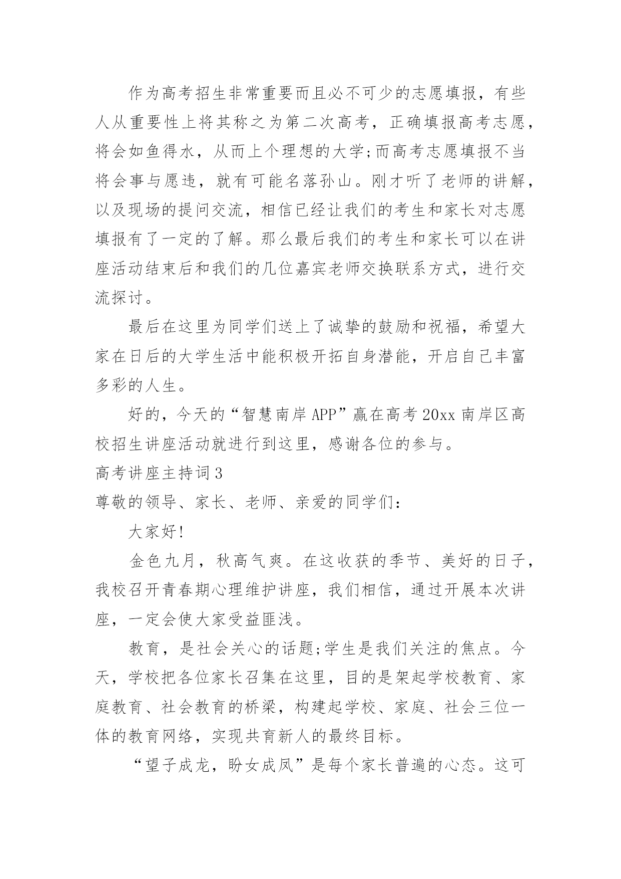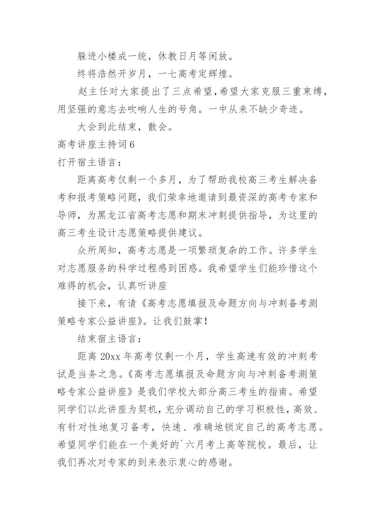 高考讲座主持词高考讲座主持词契合现场环境的主持词能给集会带来双倍的效果。在当今不断发展的世界,主持词是活动、集会等的必需品,你所见过的主持词应该是什么样的?下面是小编整理的高考讲座主持词,欢迎大家分享。高考讲座主持词1各位老师,同学们:上午好!我们胶西镇大村小学是一所农村小学,我们老师们面临着家长外出打工造成的留守儿童以及因为家庭变故而导致的一系列的儿童教育问题,当我们满怀困惑的时候,今天非常幸运的邀请到了李桂娟老师为我们指点迷津,让我们以热烈的掌声欢迎李老师的到来!李老师先后获得心理咨询师,国家中级心理辅导员、沙盘治疗师,以及胶州心语热线成员,相信今天李老师做的“自信—”一定会让老师和同学们受益匪浅,今天我们议程有两项,第一项是聆听李老师做的报告,第二项是我们老师在班级管理中遇到的各种儿童心理问题与李老师做一个研讨交流。下面就让我们以热烈的掌声欢迎李老师为我们做精彩报告。时间过的'很快啊,李老师用生动鲜活的案例,深入浅出的讲解了自信的含义,自信确实会让每一个孩子增添无限的神采,相信今天听了李老师的讲座,我们各位老师都一定会豁然开朗,让我们再一次用热烈的掌声感谢李老师为我们做的这一场精彩的报告!今天的活动到此结束,请各班带回。高考讲座主持词2各位来宾:上午好!欢迎来参加我们今天在重庆工商大学举行的“智慧南岸APP”赢在高考20xx南岸区高校招生讲座活动。本次活动由南岸区教委、江南大学城管委会、南岸报社,以及南岸电视台主办。重庆邮电大学、重庆交通大学、重庆工商大学、重庆第二师范学院、以及重庆建筑工程职业学院协办。本次活动我们也是有幸请到了高考志愿填报的专家老师以及驻区高校招生办的负责人来到我们今天的活动现场,他们是南岸区教育考试中心咨询顾问张伟,xxxx重庆邮电大学xxx欢迎你们。今天来到我们讲座活动现场的还有参加20xx年高考的同学及学生家长,欢迎你们。今年的高考已经结束了一个多星期,20xx年普通高校招生填报志愿工作也即将开始。如何科学、合理地填报好志愿,关系到咱们每名考生能否被顺利录取到自己理想的学校和专业,甚至影响到考生的未来前途和发展。为了更好的帮助考生和家长合理地填报高考志愿,志愿填报的指导一定是必不可少的。我想作为志愿填报这方面的专家南岸区教育考试中心的咨询顾问张伟老师您是最有发言权的',那么首先就请您来给我们介绍一下志愿填报的的相关情况(问下张伟大概他要讲的)好的,谢谢张伟老师。那么对于高考考生和考生家长而言紧张的高考虽然结束了,但之后仍会有许多“烦心事”,填报志愿便是其中让人挠头的选择题。因为高考志愿填报不仅意味着大学四年学什么,很大程度上还是一个人职业生涯的起点、人生方向的抉择。可是在回答这道题时,学生和家长未必有清晰的思路,缺乏专业、有针对性的指导意见,孩子的兴趣和潜在能力往往被忽略。而且厚厚的《高考填报志愿指南》内容多、对专业的叙述不太全面,如果没有老师的系统指导,学生难以从中准确找到自己喜欢的专业。而且对于招生经验丰富的招生办负责人来说,每年最让他们觉得可惜的情况是什么?考生最不该犯什么乌龙的错误?哪些冷门专业是招生老师眼中的“金子”呢?所以在广大考生马上就要填报志愿之际,我们今天就特意邀请了我区几所高校招生办负责人来到现场,为咱们考生“考得好还要填得好“出谋划策。下面我们就有请xxx来给我们介绍一下。好的感谢xx老师给我们的介绍。我想今天在这里通过我们几位专家老师的讲解,让我们现场的考生及家长对于志愿填报有了更多地了解。接下来我们就把时间交给现场的考生和家长们,你们有什么志愿填报方面的问题都可以向我们现场的专家老师举手提问。作为高考招生非常重要而且必不可少的志愿填报,有些人从重要性上将其称之为第二次高考,正确填报高考志愿,将会如鱼得水,从而上个理想的大学;而高考志愿填报不当将会事与愿违,就有可能名落孙山。刚才听了老师的讲解,以及现场的提问交流,相信已经让我们的考生和家长对志愿填报有了一定的了解。那么最后我们的考生和家长可以在讲座活动结束后和我们的几位嘉宾老师交换联系方式,进行交流探讨。最后在这里为同学们送上了诚挚的鼓励和祝福,希望大家在日后的大学生活中能积极开拓自身潜能,开启自己丰富多彩的人生。好的,今天的“智慧南岸APP”赢在高考20xx南岸区高校招生讲座活动就进行到这里,感谢各位的参与。高考讲座主持词3尊敬的领导、家长、老师、亲爱的同学们:大家好!金色九月,秋高气爽。在这收获的季节、美好的日子,我校召开青春期心理维护讲座,我们相信,通过开展本次讲座,一定会使大家受益匪浅。教育,是社会关心的话题;学生是我们关注的焦点。今天,学校把各位家长召集在这里,目的是架起学校教育、家庭教育、社会教育的桥梁,构建起学校、家庭、社会三位一体的教育网络,实现共育新人的最终目标。“望子成龙,盼女成凤”是每个家长普遍