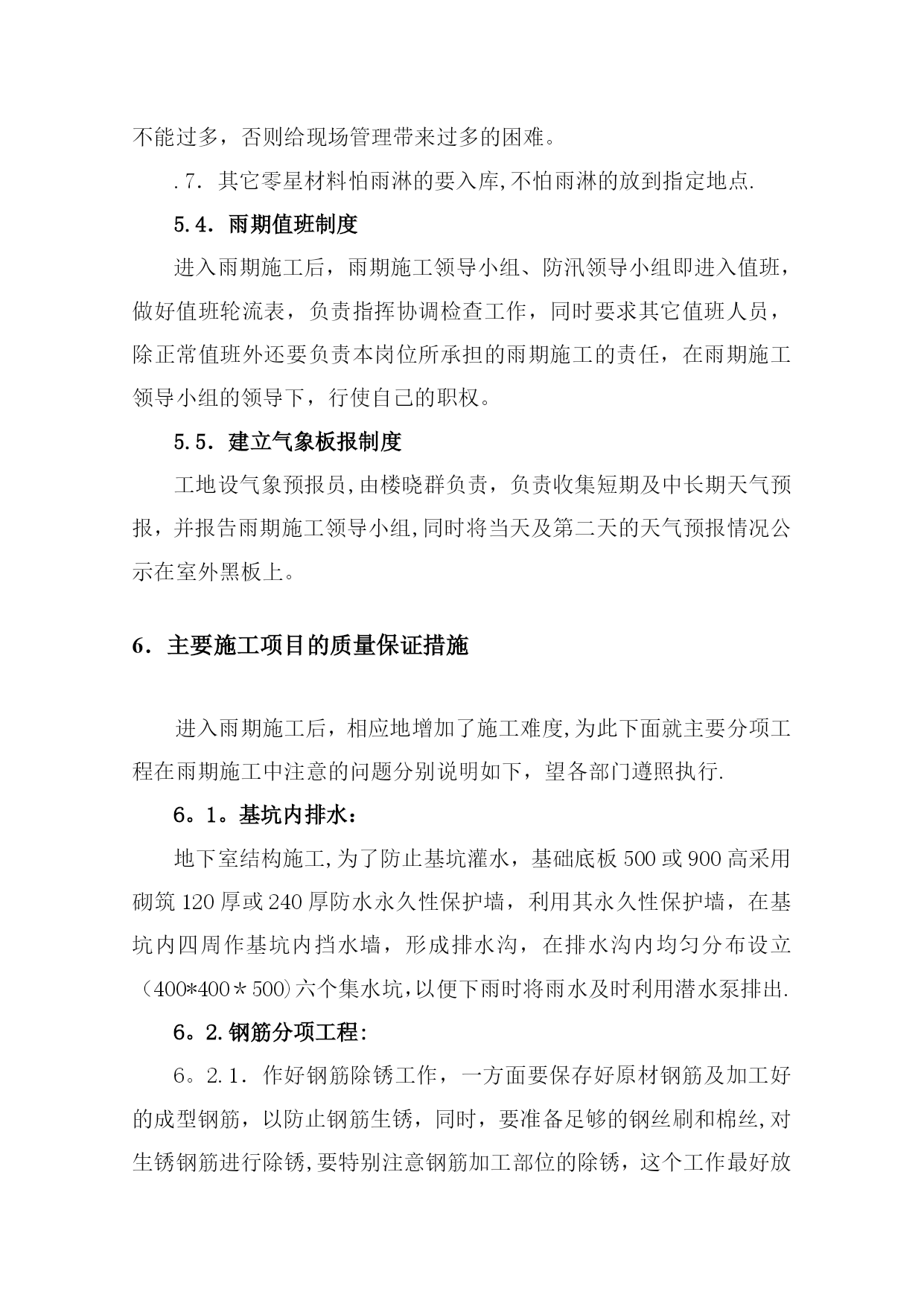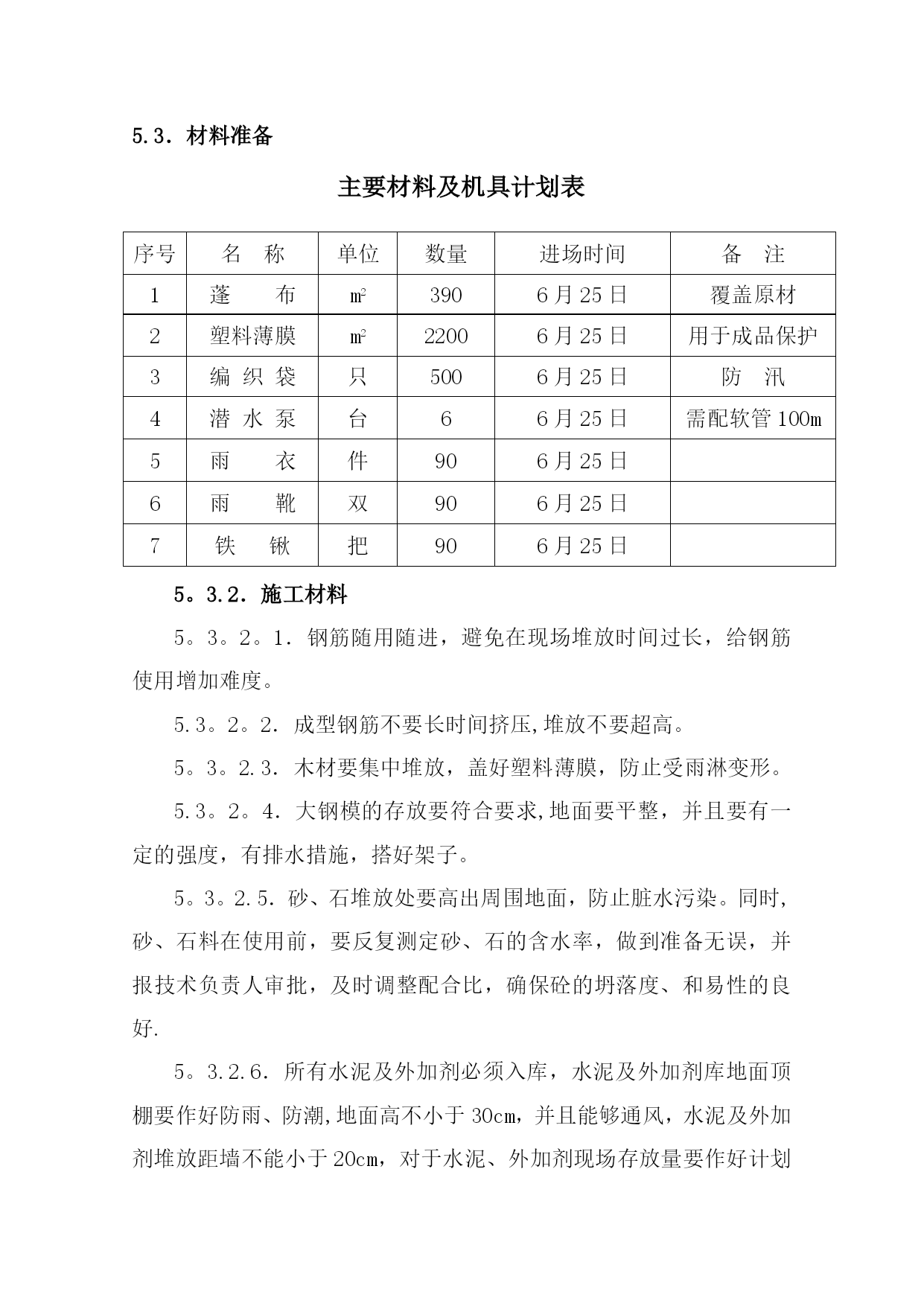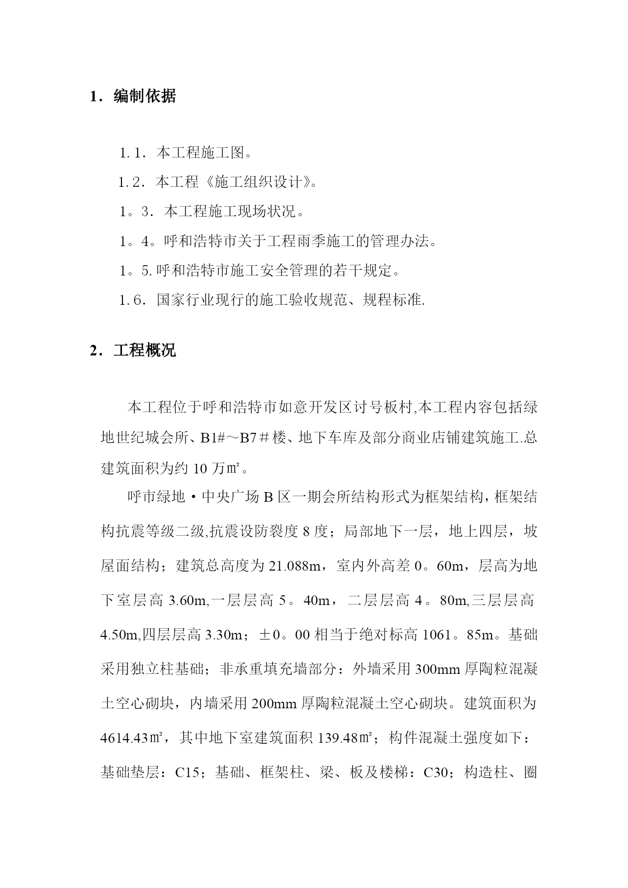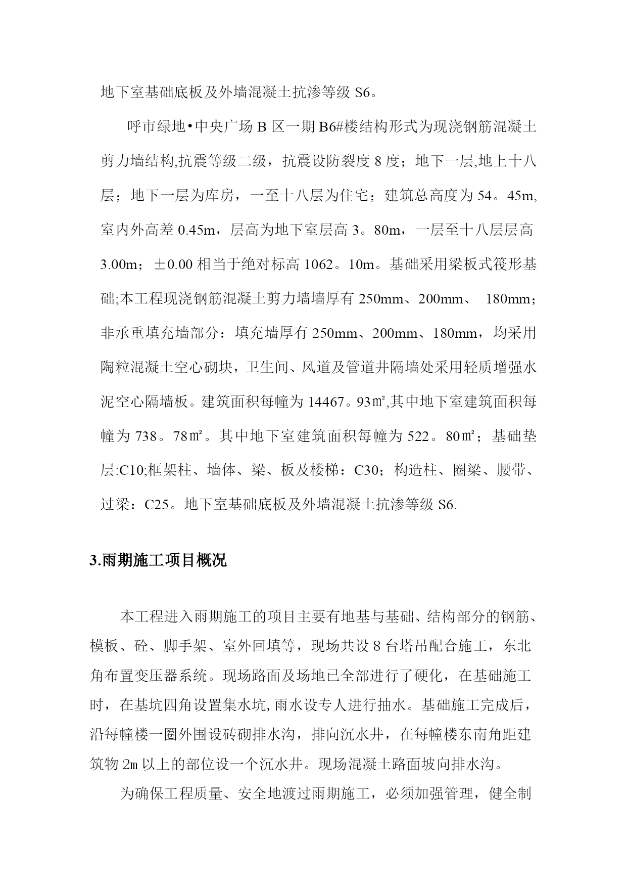 雨季施工方案42942实用文档(实用文档,可以直接使用,可编辑优秀版资料,欢迎下载)目录TOC\o"1—2"\h\z\uHYPERLINK\l”_Toc168023926”1.编制依据PAGEREF_Toc168023926\h2HYPERLINK\l”_Toc168023927”2.工程概况PAGEREF_Toc168023927\h2HYPERLINK\l”_Toc168023928"3.雨期施工项目概况PAGEREF_Toc168023928\h2HYPERLINK\l"_Toc168023929”4.雨期施工及防汛领导小组PAGEREF_Toc168023929\h6HYPERLINK\l"_Toc168023930”5.雨期施工准备工作PAGEREF_Toc168023930\h7HYPERLINK\l”_Toc168023931”5.1.现场及临时设施的处理PAGEREF_Toc168023931\h7HYPERLINK\l”_Toc168023932"5.2.机电设施的防护PAGEREF_Toc168023932\h7HYPERLINK\l”_Toc168023933"5。3.材料准备PAGEREF_Toc168023933\h8HYPERLINK\l”_Toc168023934"5。4.雨期值班制度PAGEREF_Toc168023934\h9HYPERLINK\l”_Toc168023935"5。5.建立气象板报制度PAGEREF_Toc168023935\h9HYPERLINK\l”_Toc168023936”6.主要施工项目的质量保证措施PAGEREF_Toc168023936\h9HYPERLINK\l”_Toc168023937"6.1。基坑内排水PAGEREF_Toc168023937\h9HYPERLINK\l"_Toc168023938"6.2。钢筋分项工程PAGEREF_Toc168023938\h9HYPERLINK\l"_Toc168023939”6.3.砼分项工程PAGEREF_Toc168023939\h10HYPERLINK\l”_Toc168023940”6.4.土方分项工程PAGEREF_Toc168023940\h10HYPERLINK\l”_Toc168023941"6.5.其它分项工程在雨期施工中应注意的问题PAGEREF_Toc168023941\h11HYPERLINK\l"_Toc168023942"7.雨期施工安全措施PAGEREF_Toc168023942\h111.编制依据1.1.本工程施工图。1.2.本工程《施工组织设计》。1。3.本工程施工现场状况。1。4。呼和浩特市关于工程雨季施工的管理办法。1。5.呼和浩特市施工安全管理的若干规定。1.6.国家行业现行的施工验收规范、规程标准.2.工程概况本工程位于呼和浩特市如意开发区讨号板村,本工程内容包括绿地世纪城会所、B1#~B7#楼、地下车库及部分商业店铺建筑施工.总建筑面积为约10万㎡。呼市绿地·中央广场B区一期会所结构形式为框架结构,框架结构抗震等级二级,抗震设防裂度8度;局部地下一层,地上四层,坡屋面结构;建筑总高度为21.088m,室内外高差0。60m,层高为地下室层高3.60m,一层层高5。40m,二层层高4。80m,三层层高4.50m,四层层高3.30m;±0。00相当于绝对标高1061。85m。基础采用独立柱基础;非承重填充墙部分:外墙采用300mm厚陶粒混凝土空心砌块,内墙采用200mm厚陶粒混凝土空心砌块。建筑面积为4614.43㎡,其中地下室建筑面积139.48㎡;构件混凝土强度如下:基础垫层:C15;基础、框架柱、梁、板及楼梯:C30;构造柱、圈梁、腰带、过梁:C25。地下室基础底板及外墙混凝土抗渗等级S6。呼市绿地•中央广场B区一期B1#、B4#楼结构形式为现浇钢筋混凝土剪力墙结构,抗震等级二级,抗震设防裂度8度;地下一层,地上二十五层;地下一层为库房,地上一、二层为商铺,三至二十五层为住宅;建筑总高度为83。35m,室内外高差0.45m,层高为地下室层高3.70m,一层层高3。90m,二层层高3。20m,三层至二十五层层高3。00m;±0.00相当于绝对标高1061。90m。地基采用CFG复合地基处理,基础采用梁板式筏形基础;本工程现浇钢筋混凝土剪力墙墙厚有300mm、250mm、200mm、180mm;非承重填