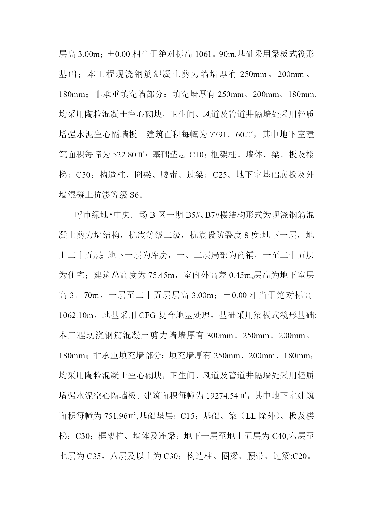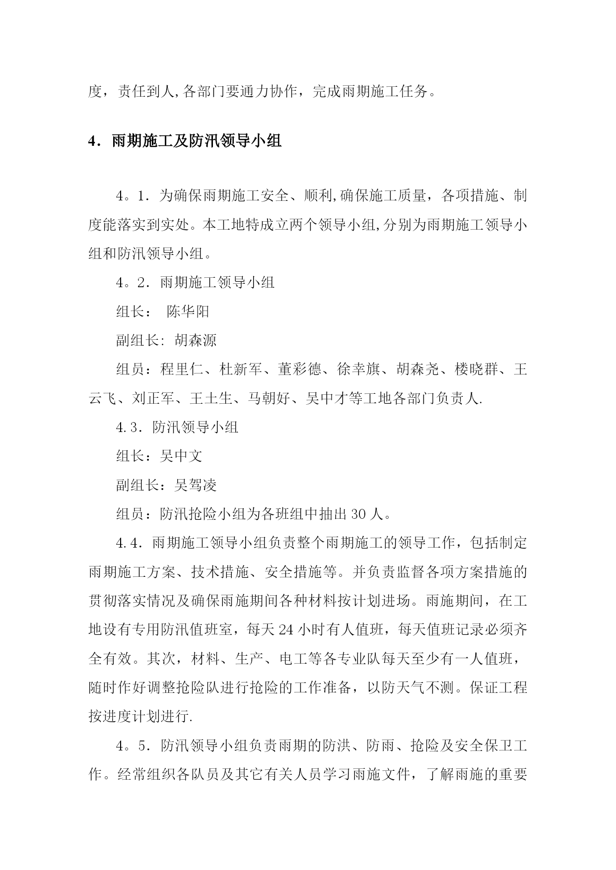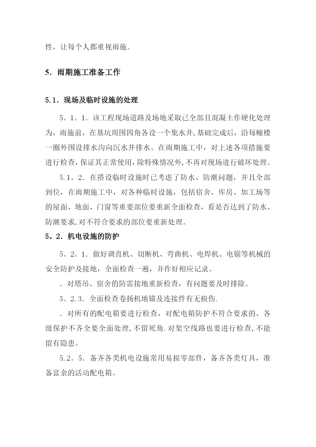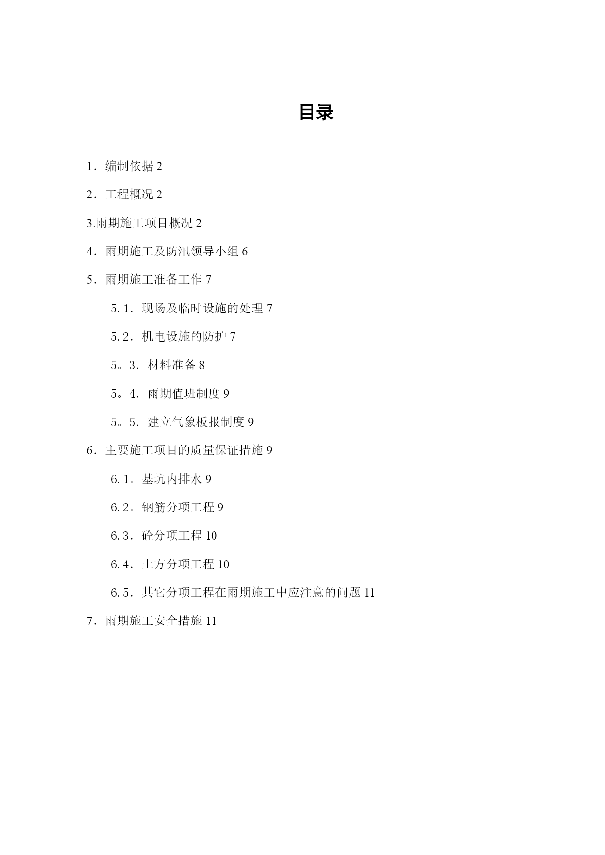 雨季施工方案42942实用文档(实用文档,可以直接使用,可编辑优秀版资料,欢迎下载)目录TOC\o"1—2"\h\z\uHYPERLINK\l”_Toc168023926”1.编制依据PAGEREF_Toc168023926\h2HYPERLINK\l”_Toc168023927”2.工程概况PAGEREF_Toc168023927\h2HYPERLINK\l”_Toc168023928"3.雨期施工项目概况PAGEREF_Toc168023928\h2HYPERLINK\l"_Toc168023929”4.雨期施工及防汛领导小组PAGEREF_Toc168023929\h6HYPERLINK\l"_Toc168023930”5.雨期施工准备工作PAGEREF_Toc168023930\h7HYPERLINK\l”_Toc168023931”5.1.现场及临时设施的处理PAGEREF_Toc168023931\h7HYPERLINK\l”_Toc168023932"5.2.机电设施的防护PAGEREF_Toc168023932\h7HYPERLINK\l”_Toc168023933"5。3.材料准备PAGEREF_Toc168023933\h8HYPERLINK\l”_Toc168023934"5。4.雨期值班制度PAGEREF_Toc168023934\h9HYPERLINK\l”_Toc168023935"5。5.建立气象板报制度PAGEREF_Toc168023935\h9HYPERLINK\l”_Toc168023936”6.主要施工项目的质量保证措施PAGEREF_Toc168023936\h9HYPERLINK\l”_Toc168023937"6.1。基坑内排水PAGEREF_Toc168023937\h9HYPERLINK\l"_Toc168023938"6.2。钢筋分项工程PAGEREF_Toc168023938\h9HYPERLINK\l"_Toc168023939”6.3.砼分项工程PAGEREF_Toc168023939\h10HYPERLINK\l”_Toc168023940”6.4.土方分项工程PAGEREF_Toc168023940\h10HYPERLINK\l”_Toc168023941"6.5.其它分项工程在雨期施工中应注意的问题PAGEREF_Toc168023941\h11HYPERLINK\l"_Toc168023942"7.雨期施工安全措施PAGEREF_Toc168023942\h111.编制依据1.1.本工程施工图。1.2.本工程《施工组织设计》。1。3.本工程施工现场状况。1。4。呼和浩特市关于工程雨季施工的管理办法。1。5.呼和浩特市施工安全管理的若干规定。1.6.国家行业现行的施工验收规范、规程标准.2.工程概况本工程位于呼和浩特市如意开发区讨号板村,本工程内容包括绿地世纪城会所、B1#~B7#楼、地下车库及部分商业店铺建筑施工.总建筑面积为约10万㎡。呼市绿地·中央广场B区一期会所结构形式为框架结构,框架结构抗震等级二级,抗震设防裂度8度;局部地下一层,地上四层,坡屋面结构;建筑总高度为21.088m,室内外高差0。60m,层高为地下室层高3.60m,一层层高5。40m,二层层高4。80m,三层层高4.50m,四层层高3.30m;±0。00相当于绝对标高1061。85m。基础采用独立柱基础;非承重填充墙部分:外墙采用300mm厚陶粒混凝土空心砌块,内墙采用200mm厚陶粒混凝土空心砌块。建筑面积为4614.43㎡,其中地下室建筑面积139.48㎡;构件混凝土强度如下:基础垫层:C15;基础、框架柱、梁、板及楼梯:C30;构造柱、圈梁、腰带、过梁:C25。地下室基础底板及外墙混凝土抗渗等级S6。呼市绿地•中央广场B区一期B1#、B4#楼结构形式为现浇钢筋混凝土剪力墙结构,抗震等级二级,抗震设防裂度8度;地下一层,地上二十五层;地下一层为库房,地上一、二层为商铺,三至二十五层为住宅;建筑总高度为83。35m,室内外高差0.45m,层高为地下室层高3.70m,一层层高3。90m,二层层高3。20m,三层至二十五层层高3。00m;±0.00相当于绝对标高1061。90m。地基采用CFG复合地基处理,基础采用梁板式筏形基础;本工程现浇钢筋混凝土剪力墙墙厚有300mm、250mm、200mm、180mm;非承重填