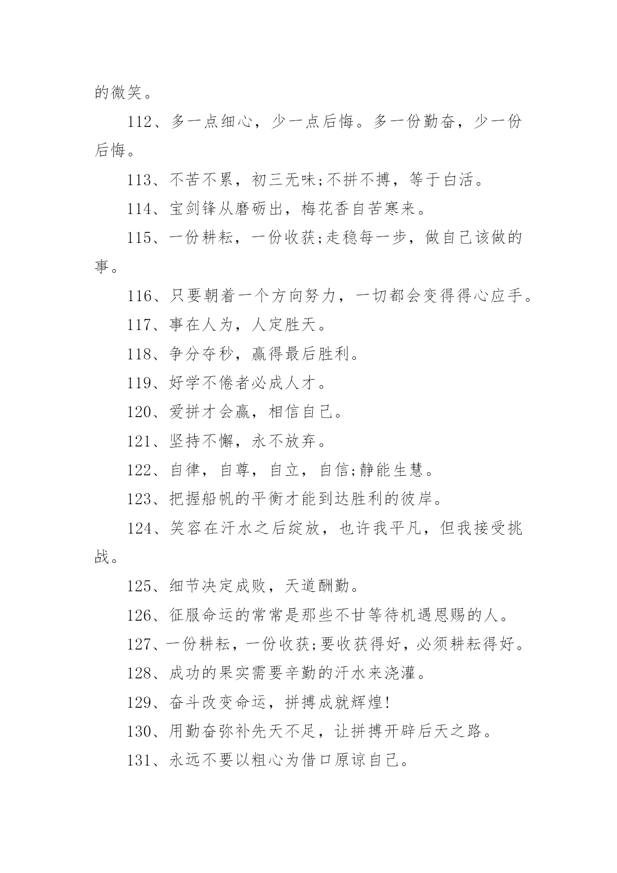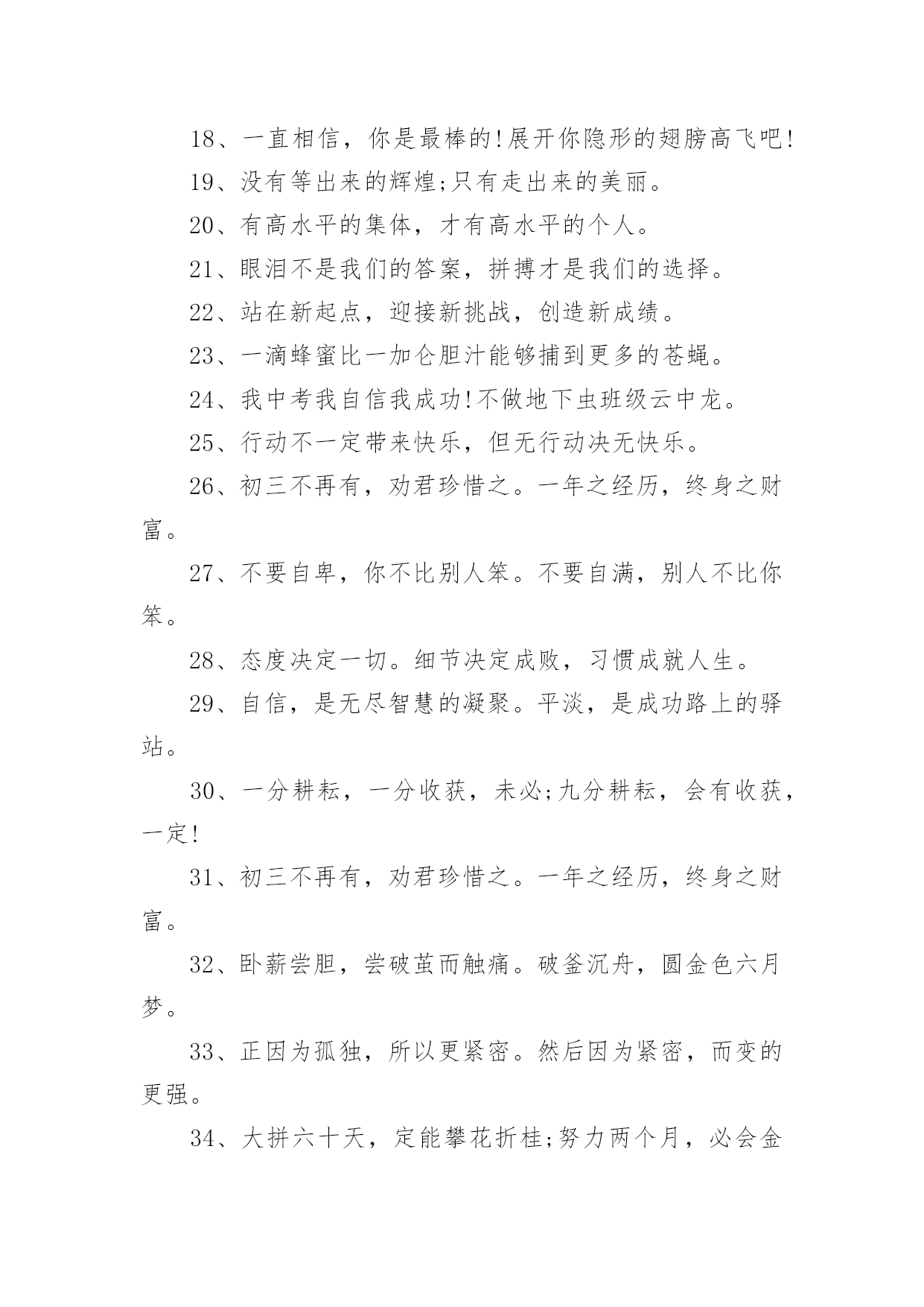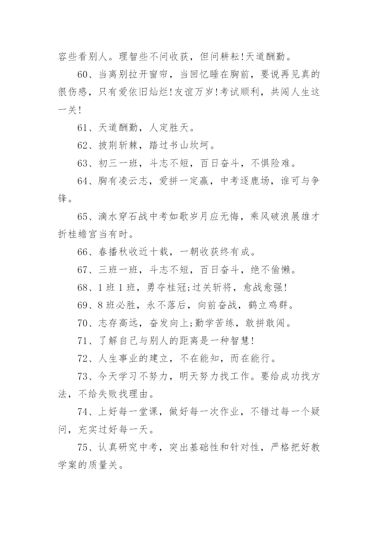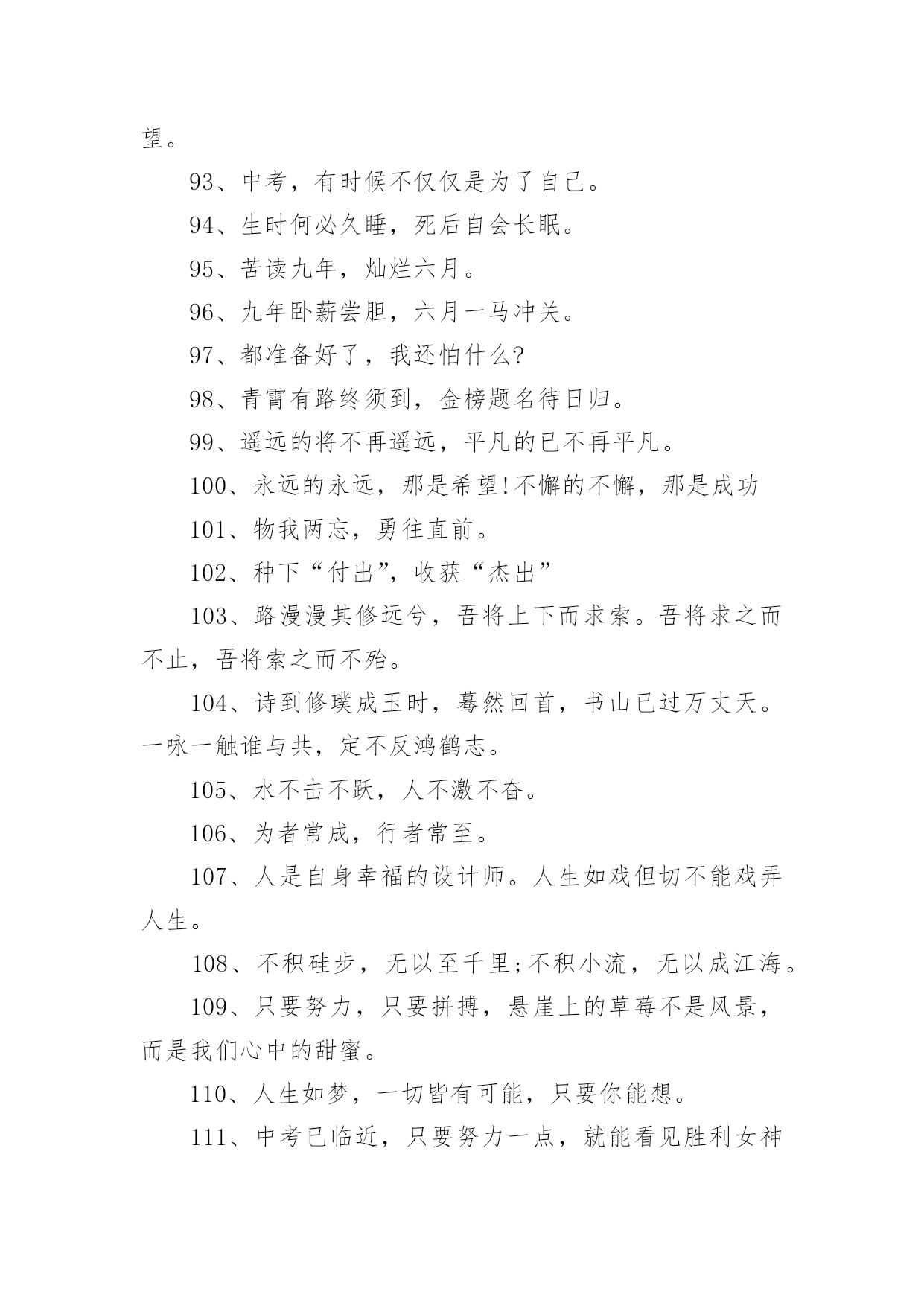 初三冲刺中考句子初三冲刺中考句子380句在现实生活或工作学习中,大家总少不了接触一些耳熟能详的句子吧,从句法角度说,句子是使最大的语法单位。那么什么样的句子才是好的句子呢?以下是小编帮大家整理的初三冲刺中考句子,欢迎阅读与收藏。1、拼一分高一分,一分成就终生。2、不要放弃,放弃了今天就是放弃了一辈子。3、成功者决不抛却,抛却者决不成功!4、不苦不累,高三无味;不拼不搏,等于白活。5、只要路是对的,就不怕路远。6、未曾失败的人恐怕也未曾成功过。7、勇于开始,才能找到成功的路。8、提高自己中考,决胜中考,改变人生。9、不为失败找借口,要为成功找方法。10、拼一个春夏秋冬,换一生无怨无悔。11、入班即静,入座即学;决战中考志在必赢。12、试试就能行,争争就能赢。13、不为失败找理由,要为成功找方法。14、努力造就实力,态度决定高度。15、海到银光中国尽头,天作岸山登绝顶我为峰。16、今朝勤学苦,明朝跃龙门。17、自己要先看得起自己,别人才会看得起你。18、一直相信,你是最棒的!展开你隐形的翅膀高飞吧!19、没有等出来的辉煌;只有走出来的美丽。20、有高水平的集体,才有高水平的个人。21、眼泪不是我们的答案,拼搏才是我们的选择。22、站在新起点,迎接新挑战,创造新成绩。23、一滴蜂蜜比一加仑胆汁能够捕到更多的苍蝇。24、我中考我自信我成功!不做地下虫班级云中龙。25、行动不一定带来快乐,但无行动决无快乐。26、初三不再有,劝君珍惜之。一年之经历,终身之财富。27、不要自卑,你不比别人笨。不要自满,别人不比你笨。28、态度决定一切。细节决定成败,习惯成就人生。29、自信,是无尽智慧的凝聚。平淡,是成功路上的驿站。30、一分耕耘,一分收获,未必;九分耕耘,会有收获,一定!31、初三不再有,劝君珍惜之。一年之经历,终身之财富。32、卧薪尝胆,尝破茧而触痛。破釜沉舟,圆金色六月梦。33、正因为孤独,所以更紧密。然后因为紧密,而变的更强。34、大拼六十天,定能攀花折桂;努力两个月,必会金榜题名。35、挑战极限,无悔人生奋力拼搏进取,谱写风华篇章。36、风雨夏秋冬,十年磨一剑。用我们自己的智慧成就梦想。37、放下包袱开动脑筋,勤于思考好好复习,祝你取得好成绩!38、遇到困难时不要抱怨,既然改变不了过去,那么就努力改变未来。39、如果我们都去做我们能力做得到的事,我们真会叫自己大吃一惊。40、大家一起努力吧。等待我们的将是一个美好的明天!加油!加油!41、二十一世纪什么最珍贵,人才,而人才仗的是什么,好的学历文凭。42、敢于面对困境的人,生命因此坚强;敢于挑战逆境的人,生命因此茁壮。43、你一定能行的!你要相信自己!对自己要有信心!我等你的好消息!44、中考是比知识、比能力、比心理、比信心、比体力的一场综合考试。45、老天不负有心人嘛!通知书一定会飞到你的手上的!46、用最少的悔恨面对过去;用最少的浪费面对现在;用最多的梦面对未来。47、没有平日的失败,就没有最终的成功。重要的是分析失败原因并吸取教训。48、让我们共同摒弃对幸福的一味幻想,把希望寄托在对事业的执著追求上!49、春天是碧绿是天地,秋天是黄金的世界。愿你用青春的绿色去酿造未来的金秋。50、中考的日子,是金色的日子,是成功的开始,因为我问心无愧,胸有成竹。51、你笔下拥有一个色彩绚丽的世界:愿你,也相信你,拥有另一个笔下灿烂的图景。52、要冒一险!整个生命就是一场冒险,走得最远的人往往是愿意去做,愿意去冒险的人。53、努力了,就无怨无悔。有道是:天道筹勤!相信自己,你是最棒的!愿和你分享每一份的喜悦!54、给我最好的朋友最衷心最美好的祝福!祝我亲爱的朋友高会常如愿以偿!友人真心话:祝考试顺利!55、不论在何时开始,重要的是开始之后就不要停止;不论在何时结束,重要的是结束之后就不要悔恨。56、愿全国所有的考生都能以平常的心态参加中考,发挥自己的水平,考上理想的学校。我真心地祝福你们。57、热衷于某一样事物的人,就是有了能够努力的资质。这样的学生一旦集中精力的话,就能发挥很大的力量。58、真心地祝福你考试取得好成绩!发挥出最好的水平。你是个聪明和头脑灵活的人,我相信你一定成功!59、悲观些看成功,乐观些看失败。轻松些看自己,宽容些看别人。理智些不问收获,但问耕耘!天道酬勤。60、当离别拉开窗帘,当回忆睡在胸前,要说再见真的很伤感,只有爱依旧灿烂!友谊万岁!考试顺利,共闯人生这一关!61、天道酬勤,人定胜天。62、披荆斩棘,踏过书山坎坷。63、初三一班,斗志不短,百日奋斗,不惧险难。64、胸有凌云志,爱拼一定赢,中考逐鹿场,谁可与争锋。65、滴水穿石战中考如歌岁月应无悔,乘风破浪展雄才折桂蟾宫当有时。66、春播秋收近十载,一朝收获终有成。67、三班一班,斗志不短,百日奋斗,绝不偷懒。68、