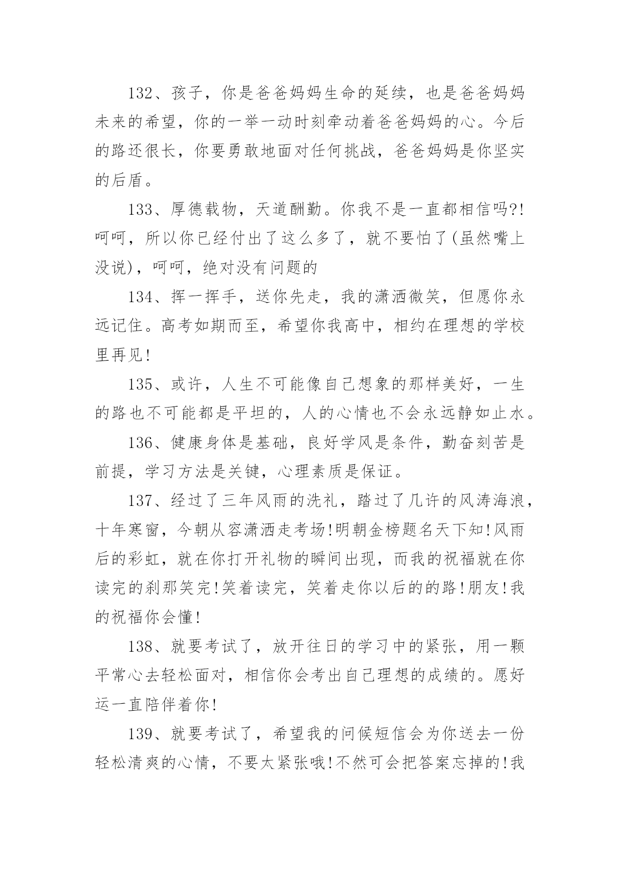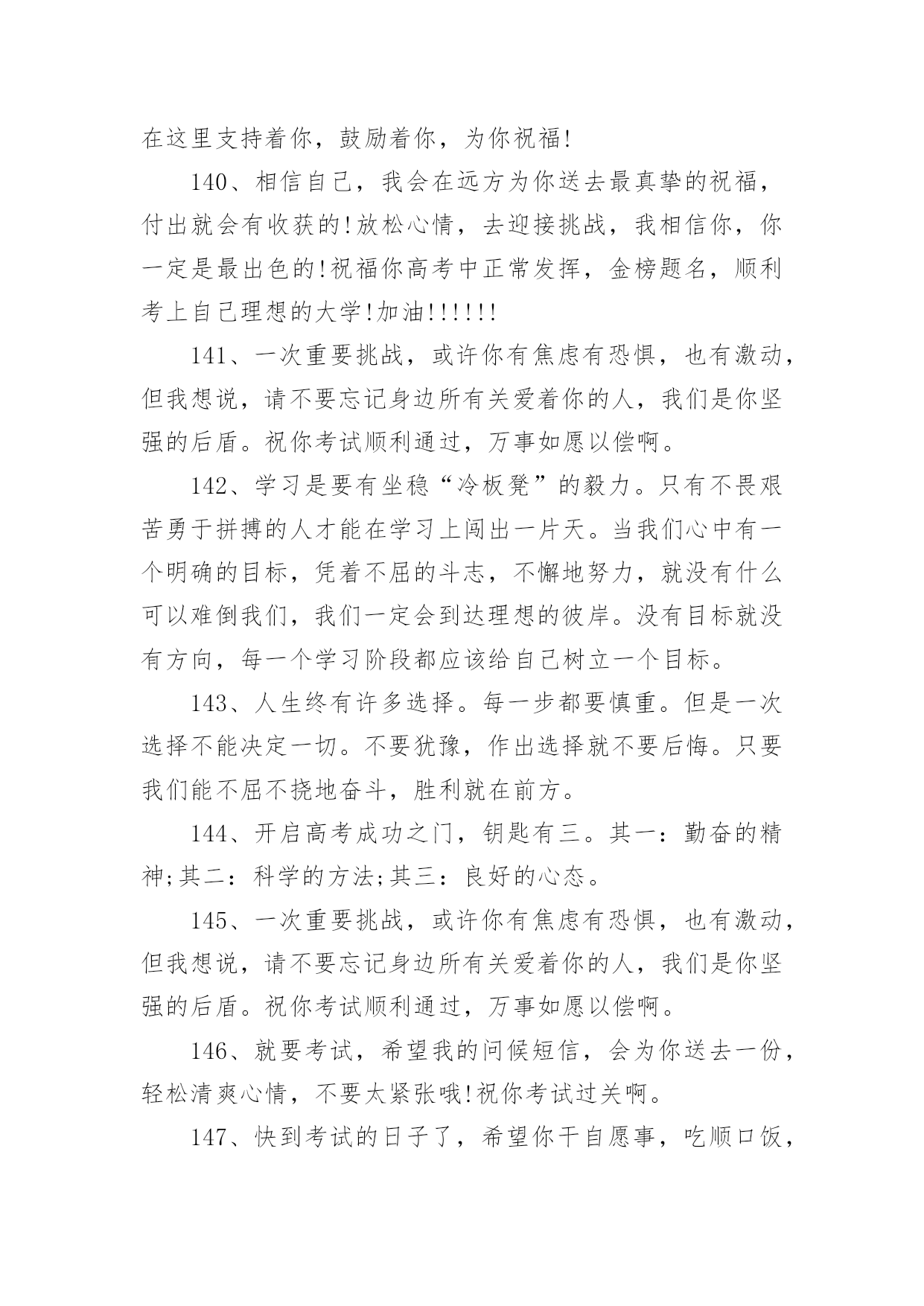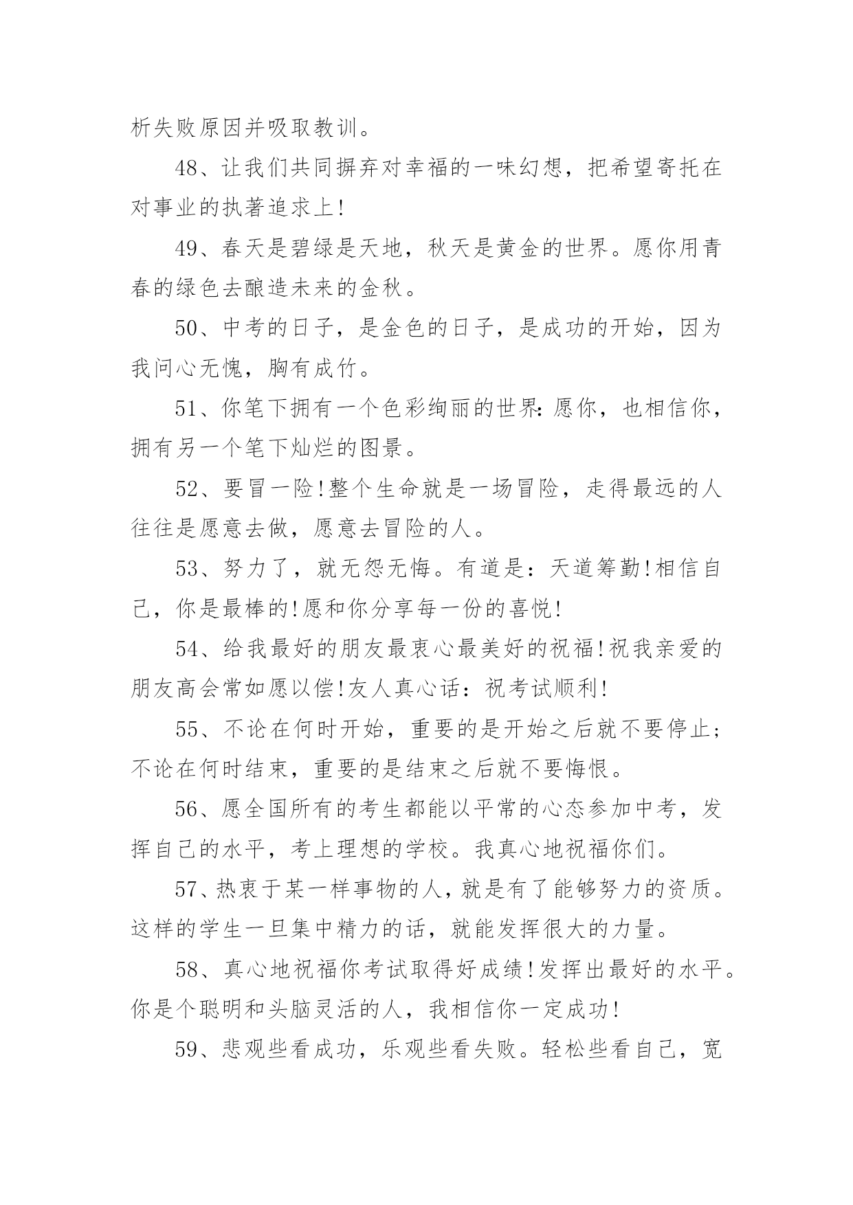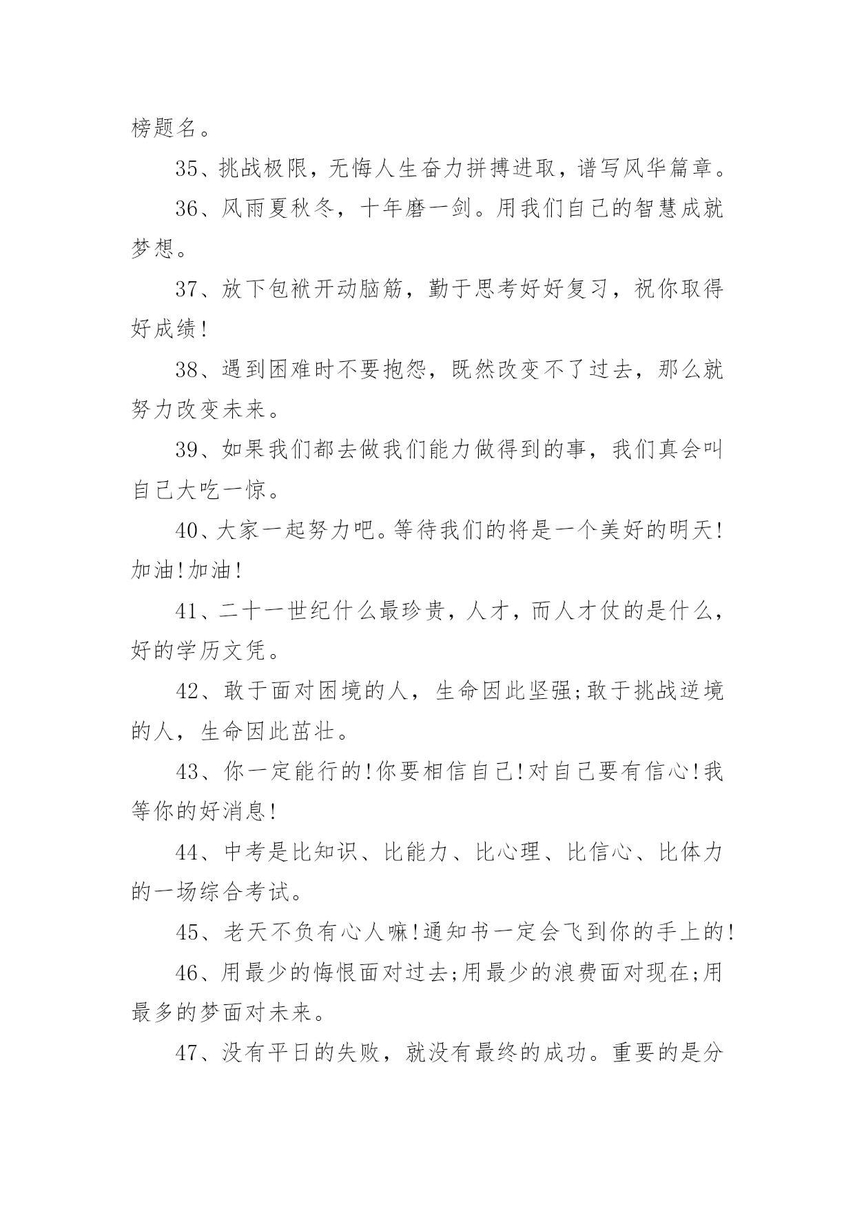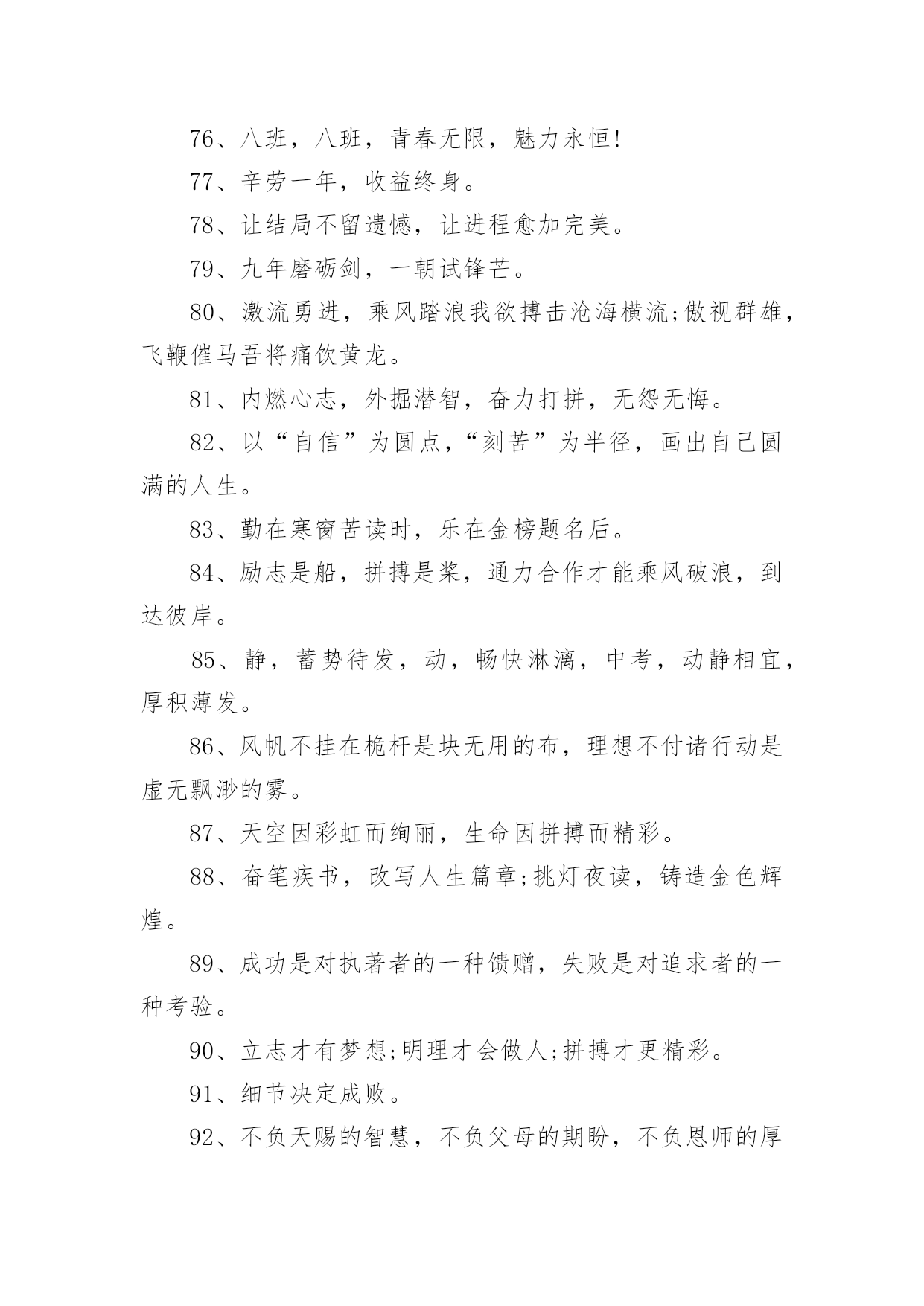 初三冲刺中考句子初三冲刺中考句子380句在现实生活或工作学习中,大家总少不了接触一些耳熟能详的句子吧,从句法角度说,句子是使最大的语法单位。那么什么样的句子才是好的句子呢?以下是小编帮大家整理的初三冲刺中考句子,欢迎阅读与收藏。1、拼一分高一分,一分成就终生。2、不要放弃,放弃了今天就是放弃了一辈子。3、成功者决不抛却,抛却者决不成功!4、不苦不累,高三无味;不拼不搏,等于白活。5、只要路是对的,就不怕路远。6、未曾失败的人恐怕也未曾成功过。7、勇于开始,才能找到成功的路。8、提高自己中考,决胜中考,改变人生。9、不为失败找借口,要为成功找方法。10、拼一个春夏秋冬,换一生无怨无悔。11、入班即静,入座即学;决战中考志在必赢。12、试试就能行,争争就能赢。13、不为失败找理由,要为成功找方法。14、努力造就实力,态度决定高度。15、海到银光中国尽头,天作岸山登绝顶我为峰。16、今朝勤学苦,明朝跃龙门。17、自己要先看得起自己,别人才会看得起你。18、一直相信,你是最棒的!展开你隐形的翅膀高飞吧!19、没有等出来的辉煌;只有走出来的美丽。20、有高水平的集体,才有高水平的个人。21、眼泪不是我们的答案,拼搏才是我们的选择。22、站在新起点,迎接新挑战,创造新成绩。23、一滴蜂蜜比一加仑胆汁能够捕到更多的苍蝇。24、我中考我自信我成功!不做地下虫班级云中龙。25、行动不一定带来快乐,但无行动决无快乐。26、初三不再有,劝君珍惜之。一年之经历,终身之财富。27、不要自卑,你不比别人笨。不要自满,别人不比你笨。28、态度决定一切。细节决定成败,习惯成就人生。29、自信,是无尽智慧的凝聚。平淡,是成功路上的驿站。30、一分耕耘,一分收获,未必;九分耕耘,会有收获,一定!31、初三不再有,劝君珍惜之。一年之经历,终身之财富。32、卧薪尝胆,尝破茧而触痛。破釜沉舟,圆金色六月梦。33、正因为孤独,所以更紧密。然后因为紧密,而变的更强。34、大拼六十天,定能攀花折桂;努力两个月,必会金榜题名。35、挑战极限,无悔人生奋力拼搏进取,谱写风华篇章。36、风雨夏秋冬,十年磨一剑。用我们自己的智慧成就梦想。37、放下包袱开动脑筋,勤于思考好好复习,祝你取得好成绩!38、遇到困难时不要抱怨,既然改变不了过去,那么就努力改变未来。39、如果我们都去做我们能力做得到的事,我们真会叫自己大吃一惊。40、大家一起努力吧。等待我们的将是一个美好的明天!加油!加油!41、二十一世纪什么最珍贵,人才,而人才仗的是什么,好的学历文凭。42、敢于面对困境的人,生命因此坚强;敢于挑战逆境的人,生命因此茁壮。43、你一定能行的!你要相信自己!对自己要有信心!我等你的好消息!44、中考是比知识、比能力、比心理、比信心、比体力的一场综合考试。45、老天不负有心人嘛!通知书一定会飞到你的手上的!46、用最少的悔恨面对过去;用最少的浪费面对现在;用最多的梦面对未来。47、没有平日的失败,就没有最终的成功。重要的是分析失败原因并吸取教训。48、让我们共同摒弃对幸福的一味幻想,把希望寄托在对事业的执著追求上!49、春天是碧绿是天地,秋天是黄金的世界。愿你用青春的绿色去酿造未来的金秋。50、中考的日子,是金色的日子,是成功的开始,因为我问心无愧,胸有成竹。51、你笔下拥有一个色彩绚丽的世界:愿你,也相信你,拥有另一个笔下灿烂的图景。52、要冒一险!整个生命就是一场冒险,走得最远的人往往是愿意去做,愿意去冒险的人。53、努力了,就无怨无悔。有道是:天道筹勤!相信自己,你是最棒的!愿和你分享每一份的喜悦!54、给我最好的朋友最衷心最美好的祝福!祝我亲爱的朋友高会常如愿以偿!友人真心话:祝考试顺利!55、不论在何时开始,重要的是开始之后就不要停止;不论在何时结束,重要的是结束之后就不要悔恨。56、愿全国所有的考生都能以平常的心态参加中考,发挥自己的水平,考上理想的学校。我真心地祝福你们。57、热衷于某一样事物的人,就是有了能够努力的资质。这样的学生一旦集中精力的话,就能发挥很大的力量。58、真心地祝福你考试取得好成绩!发挥出最好的水平。你是个聪明和头脑灵活的人,我相信你一定成功!59、悲观些看成功,乐观些看失败。轻松些看自己,宽容些看别人。理智些不问收获,但问耕耘!天道酬勤。60、当离别拉开窗帘,当回忆睡在胸前,要说再见真的很伤感,只有爱依旧灿烂!友谊万岁!考试顺利,共闯人生这一关!61、天道酬勤,人定胜天。62、披荆斩棘,踏过书山坎坷。63、初三一班,斗志不短,百日奋斗,不惧险难。64、胸有凌云志,爱拼一定赢,中考逐鹿场,谁可与争锋。65、滴水穿石战中考如歌岁月应无悔,乘风破浪展雄才折桂蟾宫当有时。66、春播秋收近十载,一朝收获终有成。67、三班一班,斗志不短,百日奋斗,绝不偷懒。68、